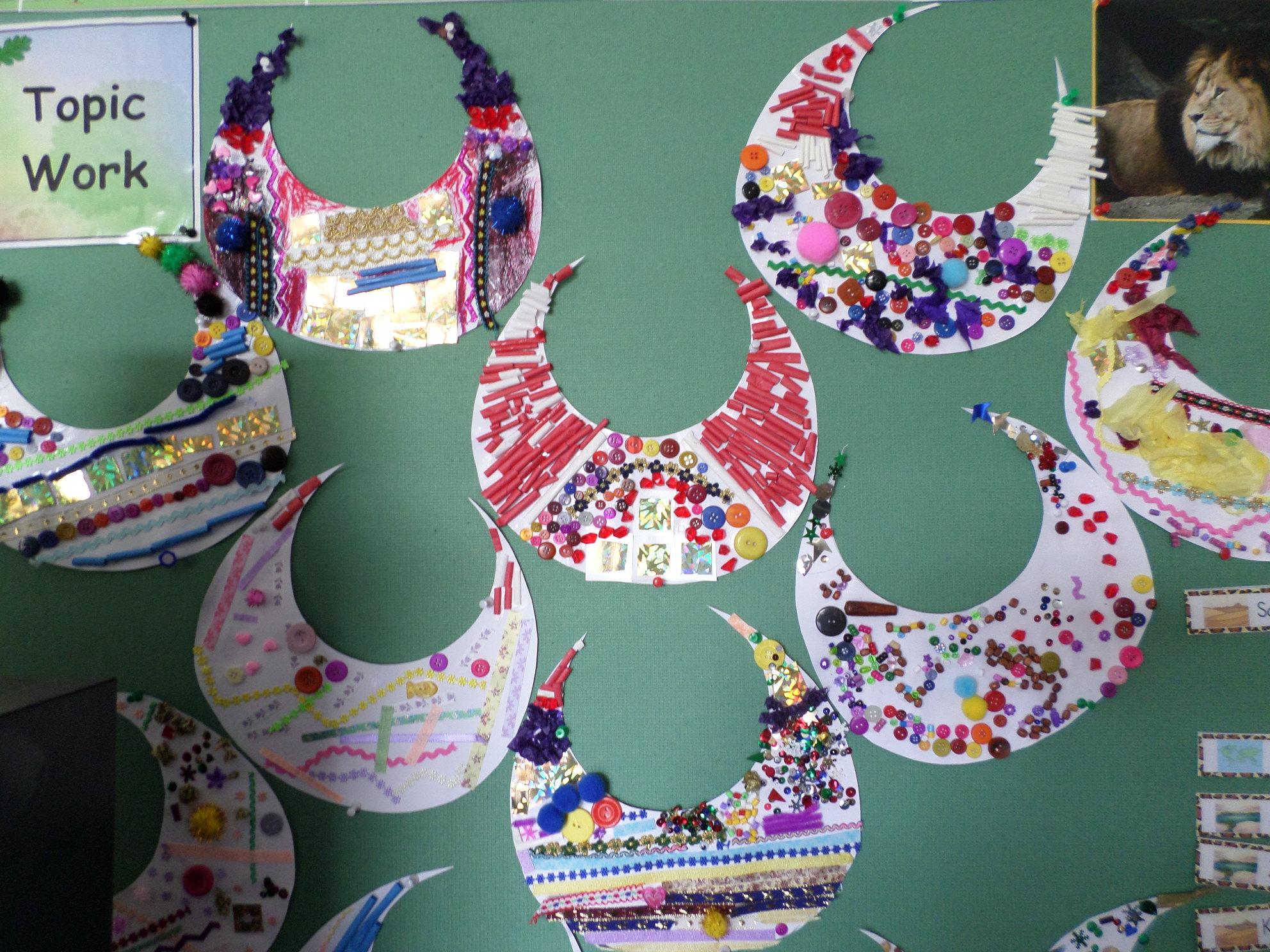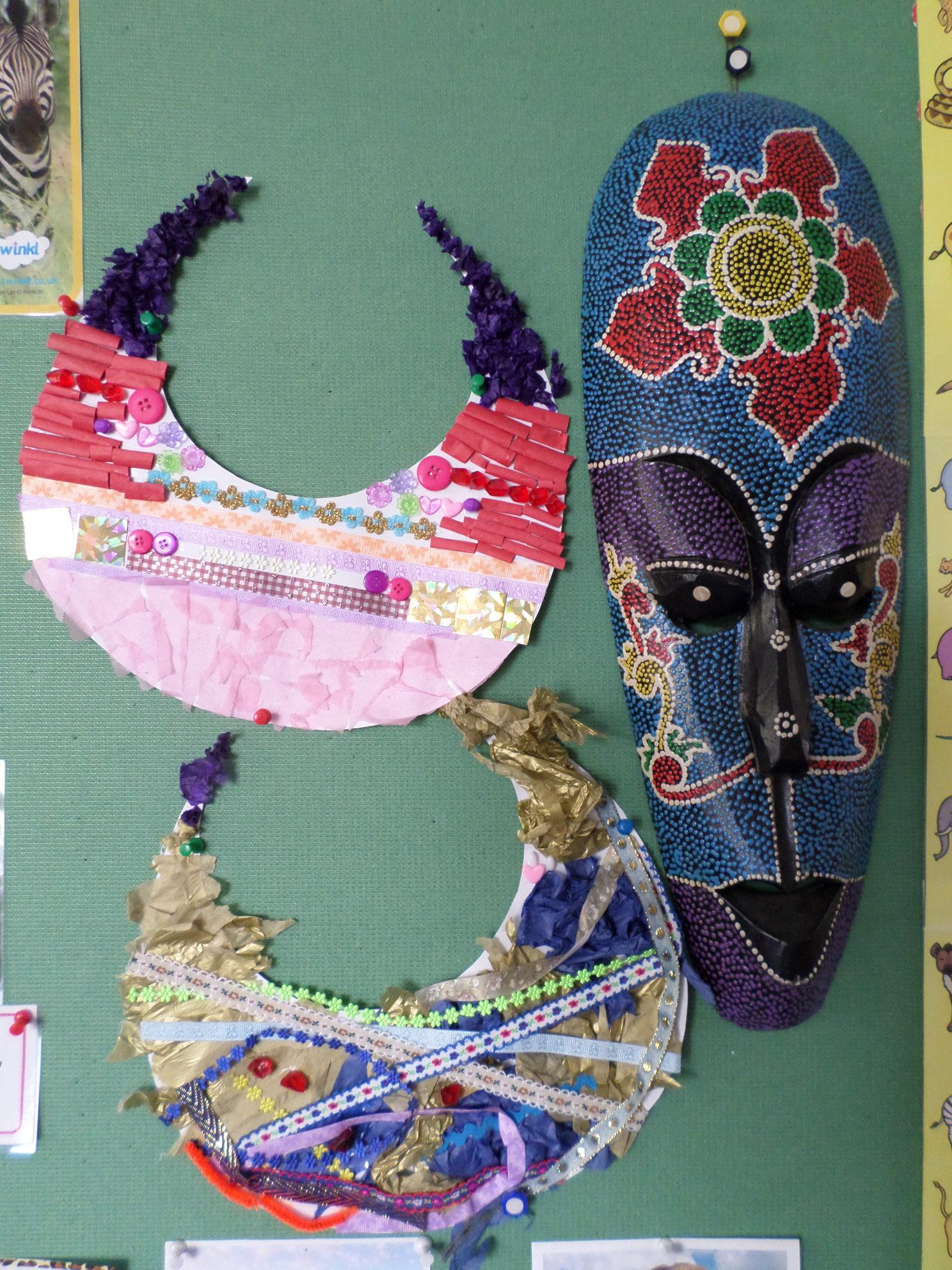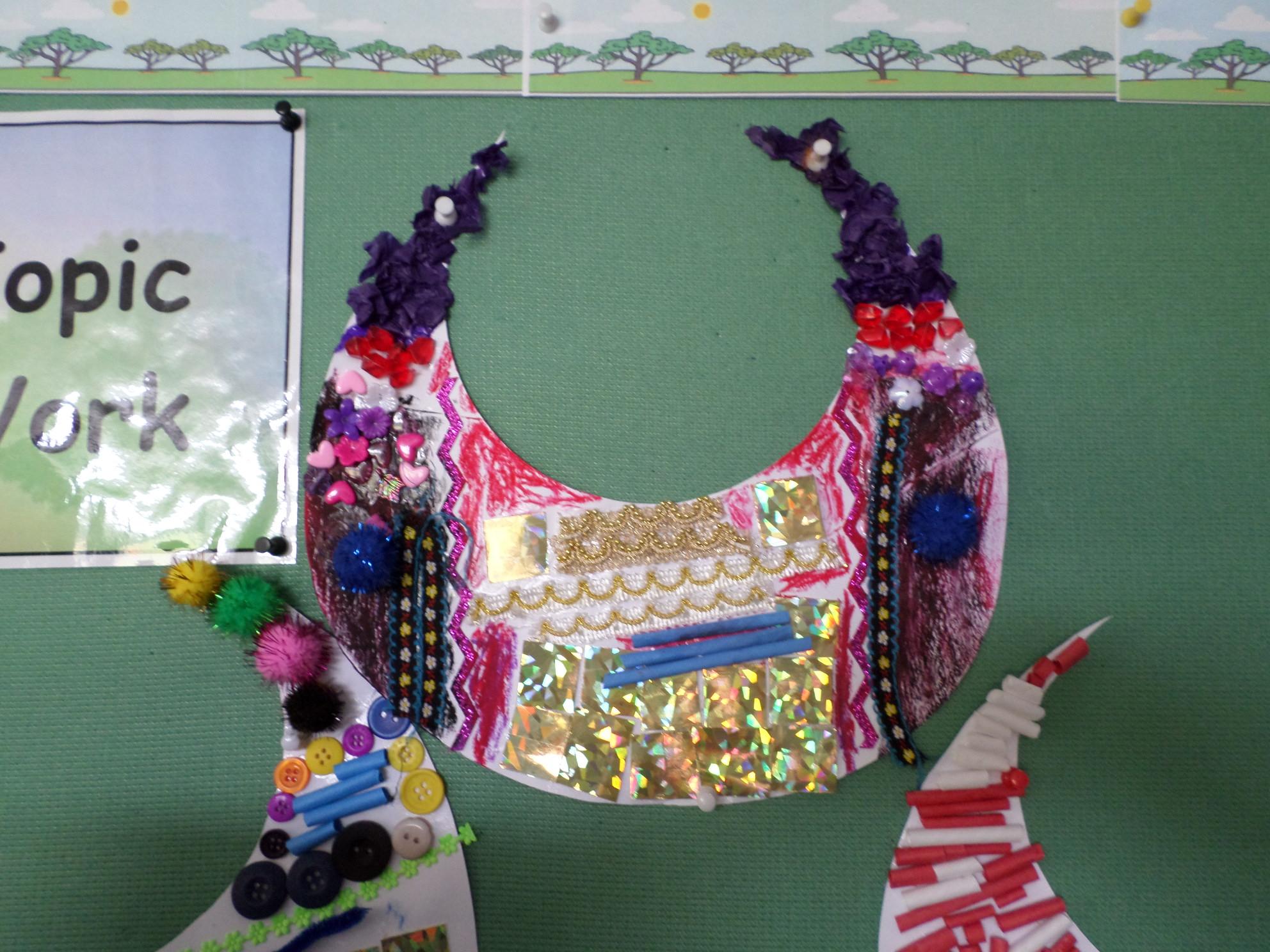 As part of our African topic we have been researching the colourful necklaces and collars the different tribes wear.  We recreated our own first by sketching and colouring, then by using a variety of materials as a collage.