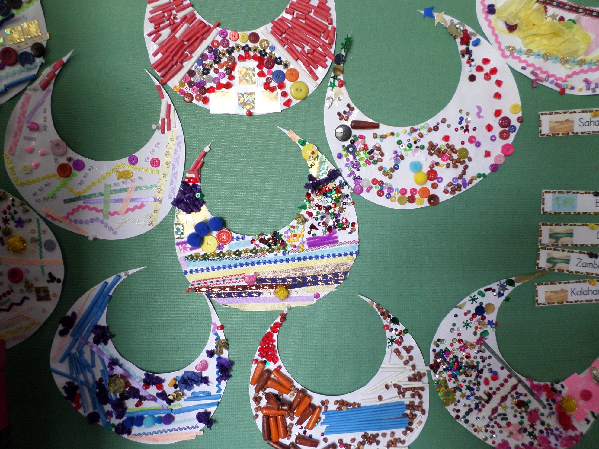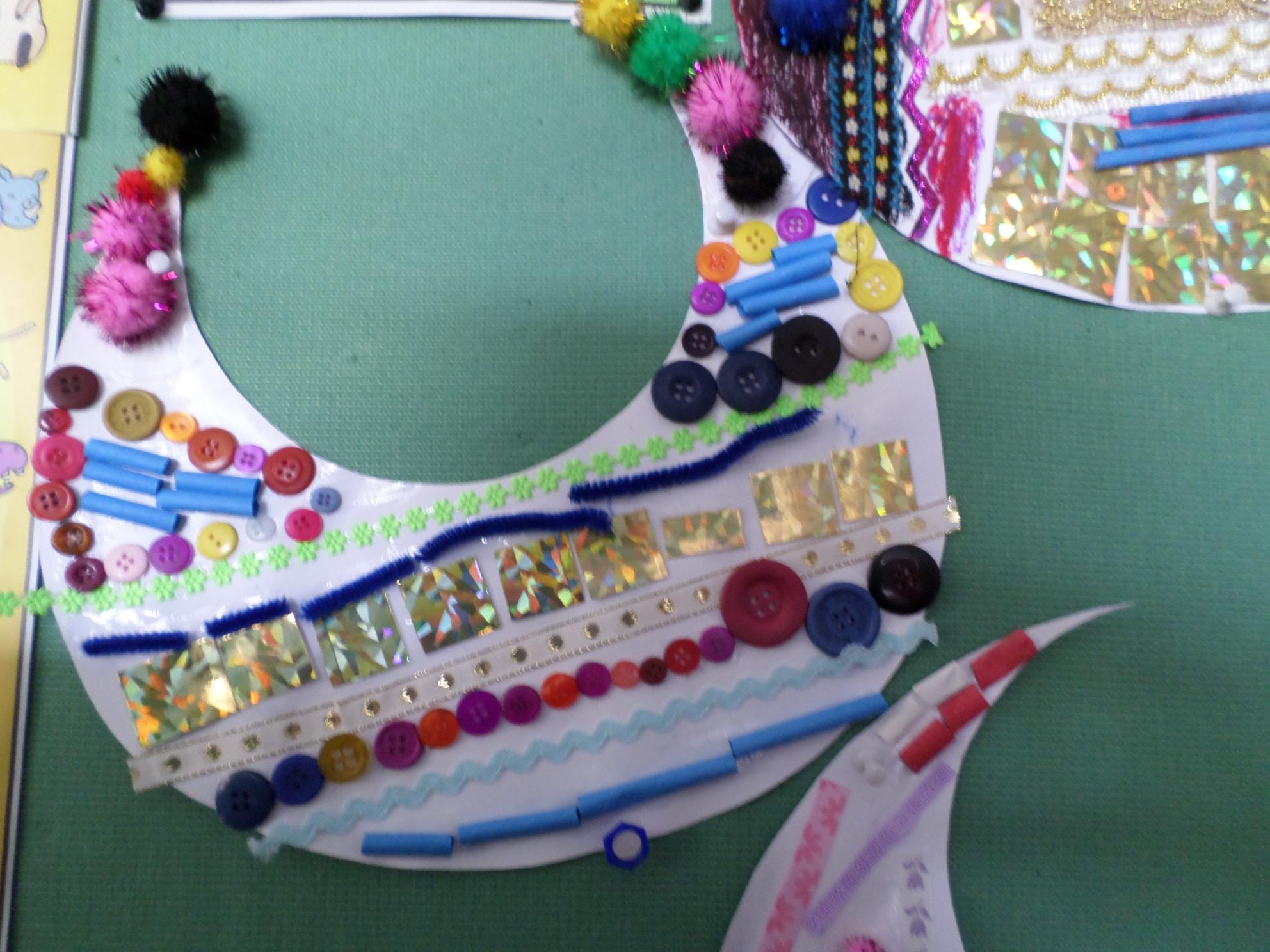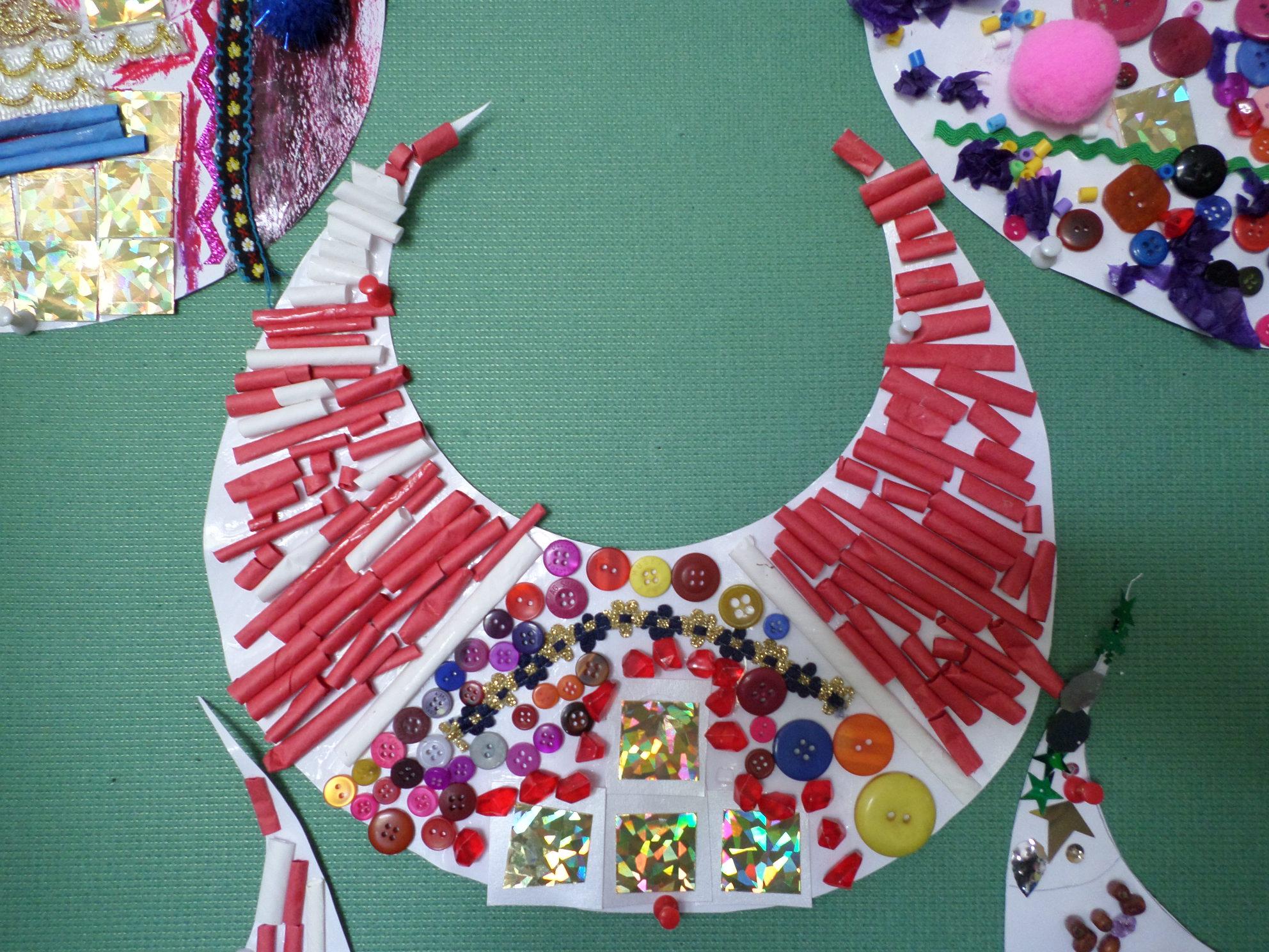 As part of our African topic we have been researching the colourful necklaces and collars the different tribes wear.  We recreated our own first by sketching and colouring, then by using a variety of materials as a collage.