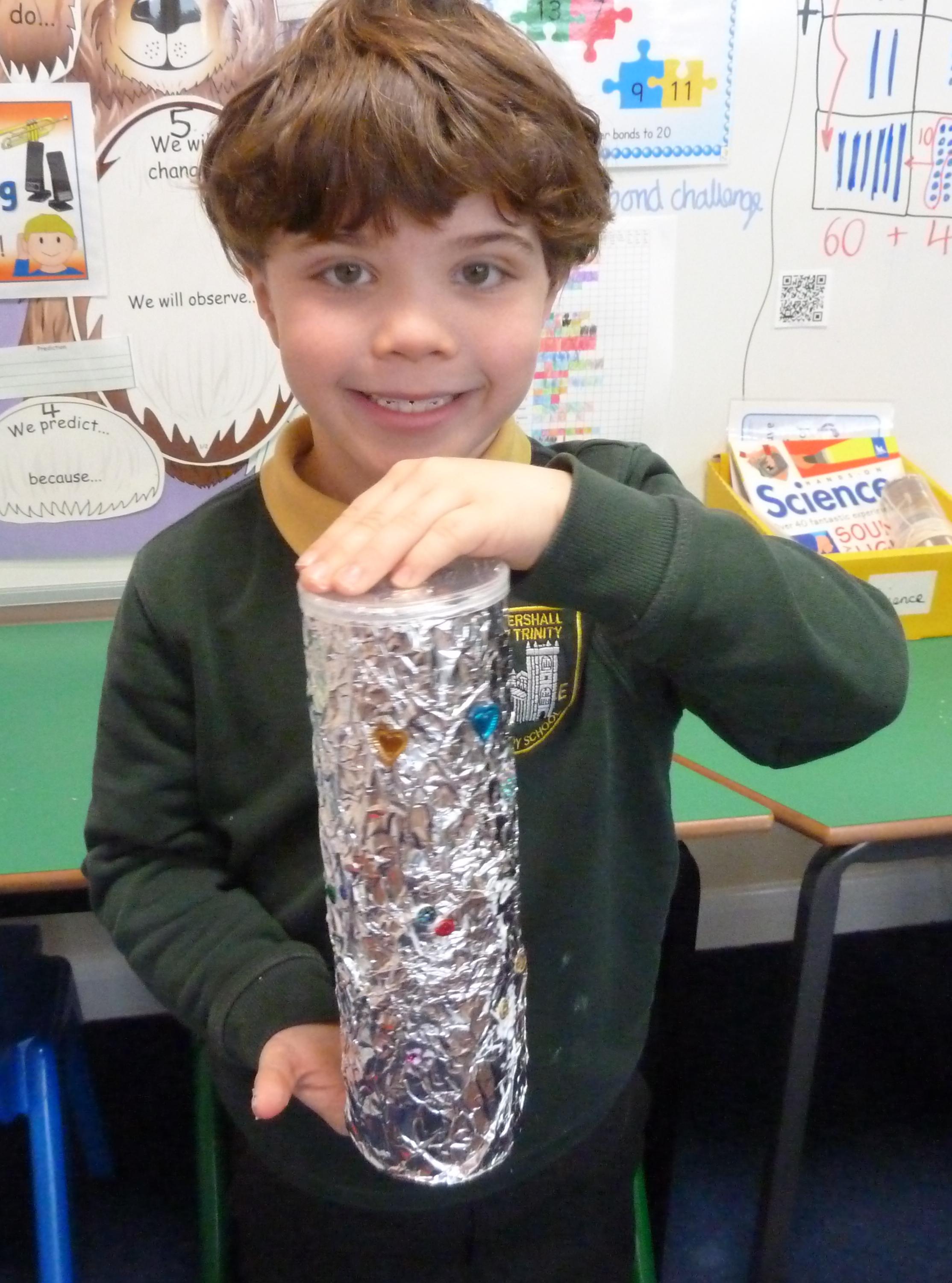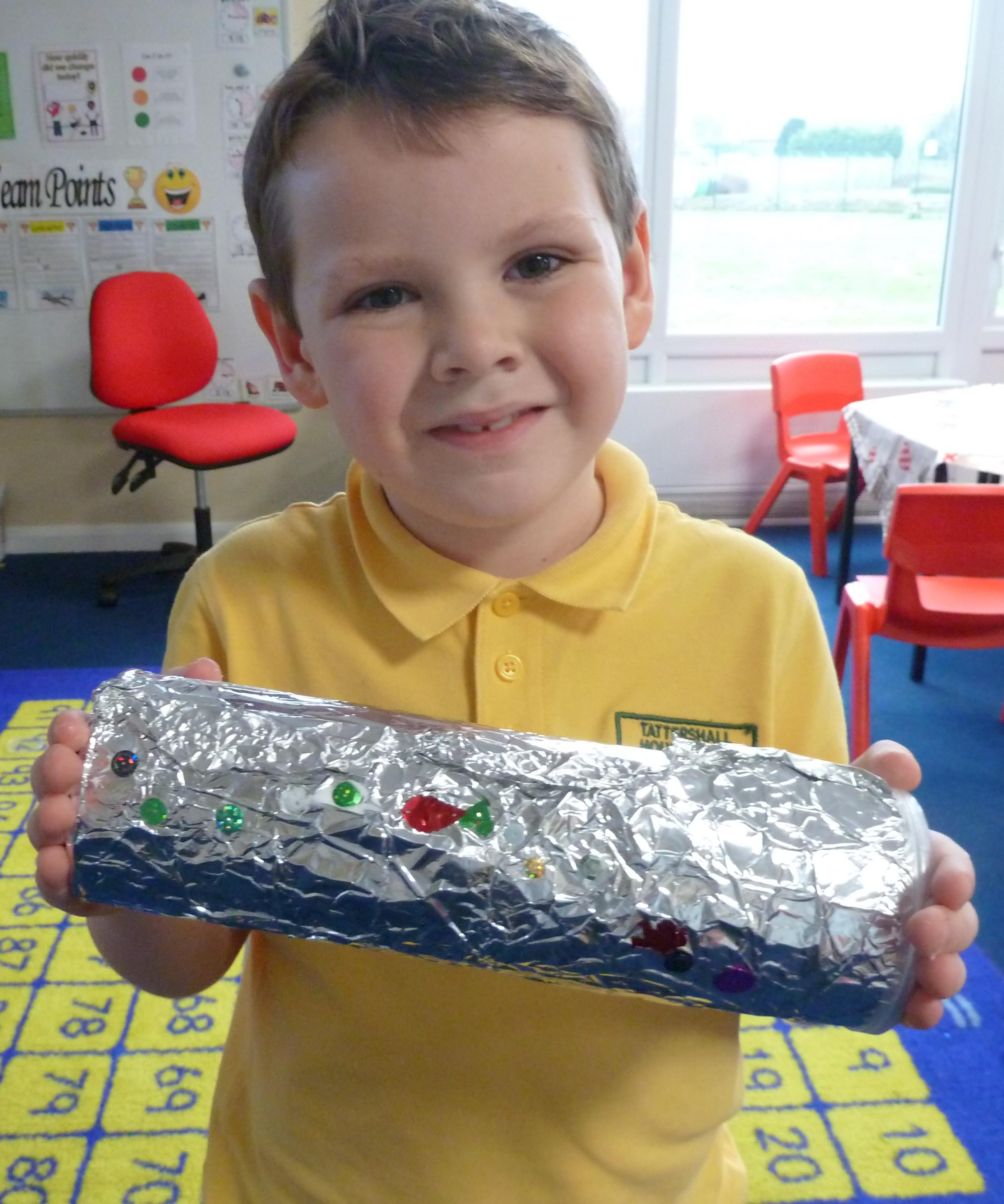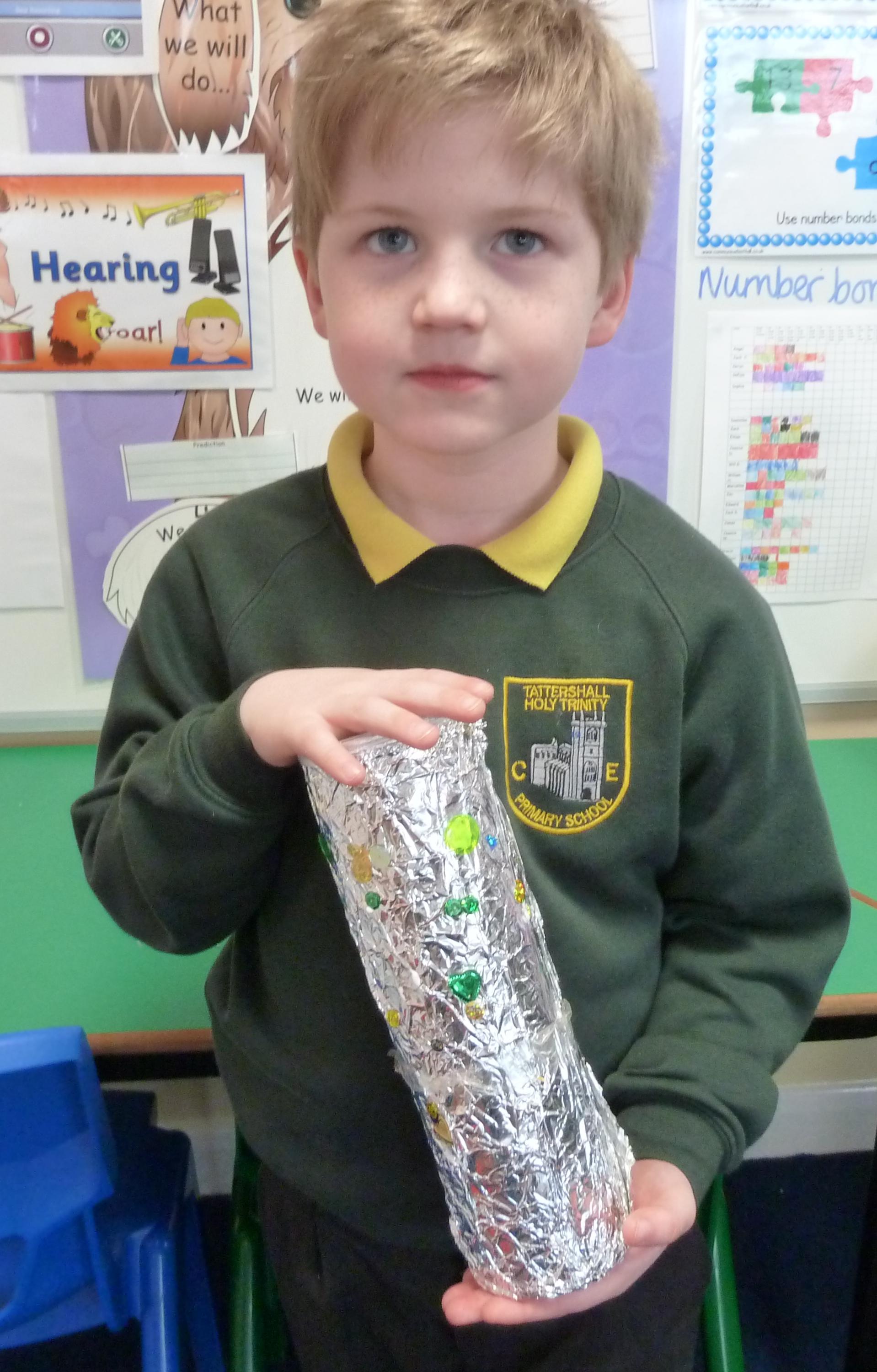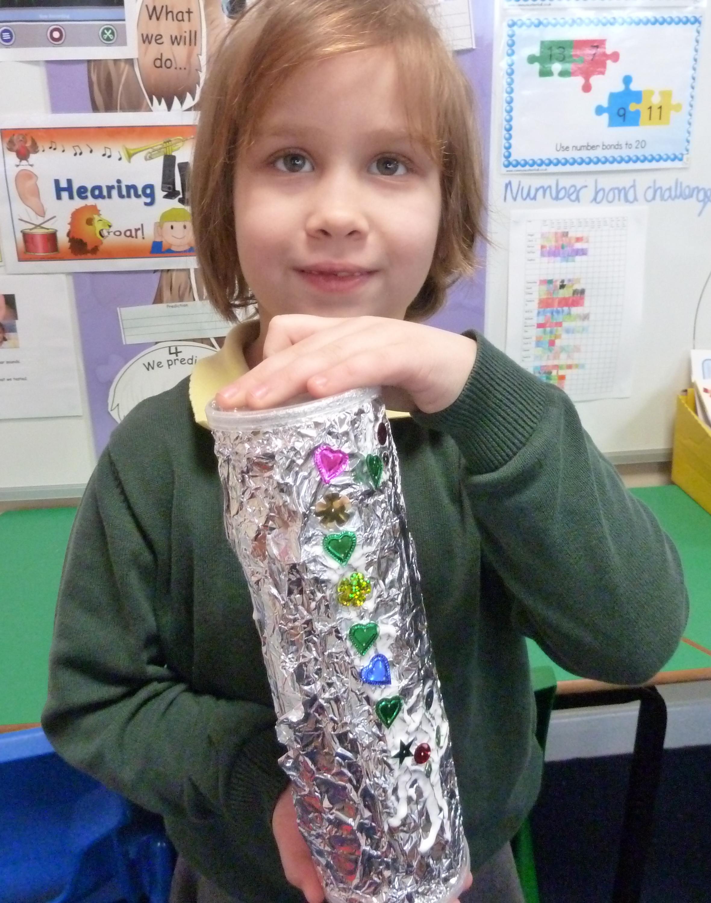 As part of our weather topic we designed and made rainmakers.  We had to adapt the contents of our rainmakers to reflect the sound of the type of rain we wanted.  We used rice for a light shower sound, split lentils for a slightly heavier rain and wooden beads or pasta to create a storm like heavy downpour.  We decorated them with sequins and had great fun playing them.  Very loud!