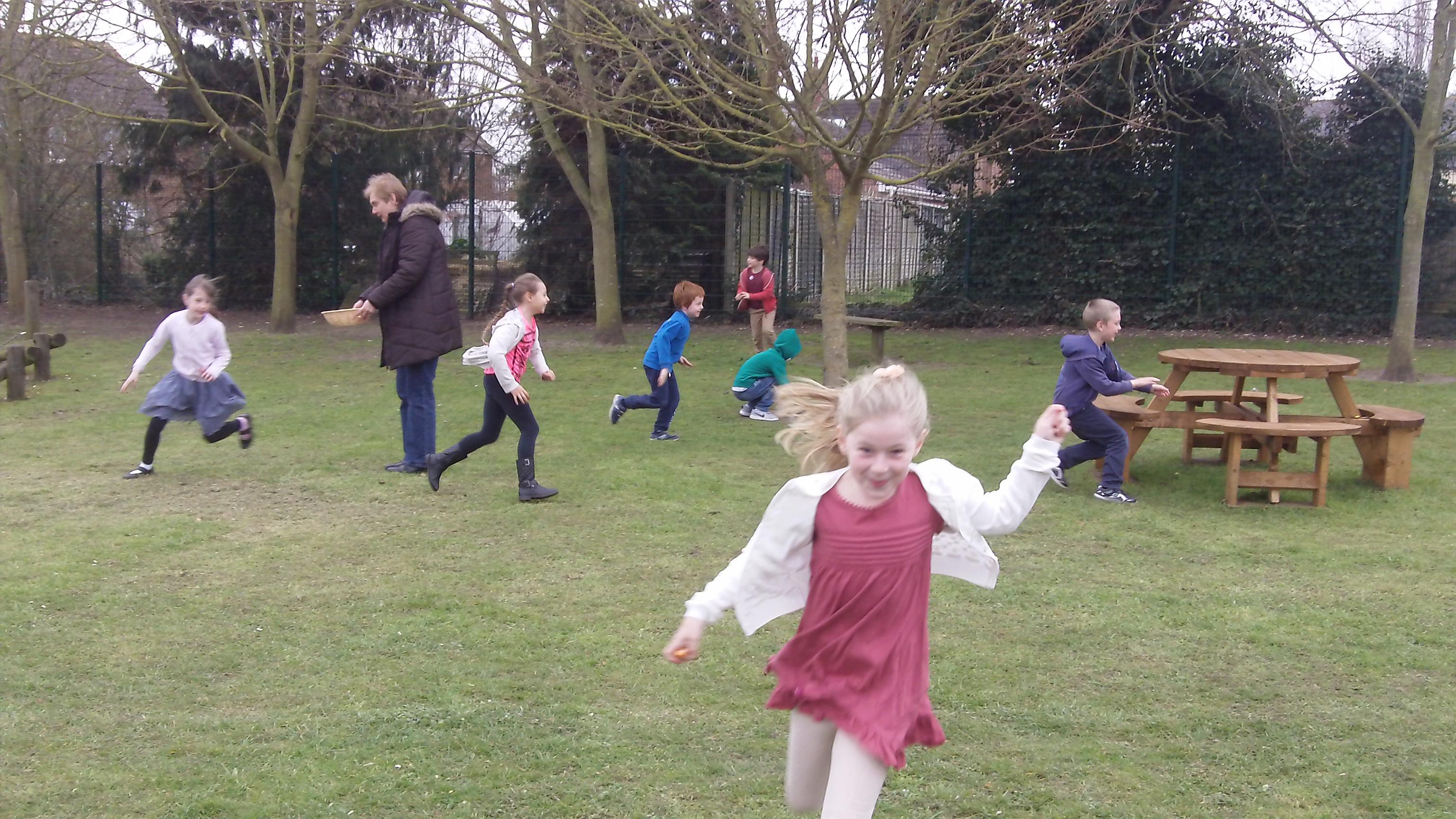 Outside, we lined up then, on the count of three, we dashed about looking for as many eggs as we could find. All the eggs were put in the baskets. When we thought we had found them all, we went back in to count them and check. We had to go out twice to find them all!