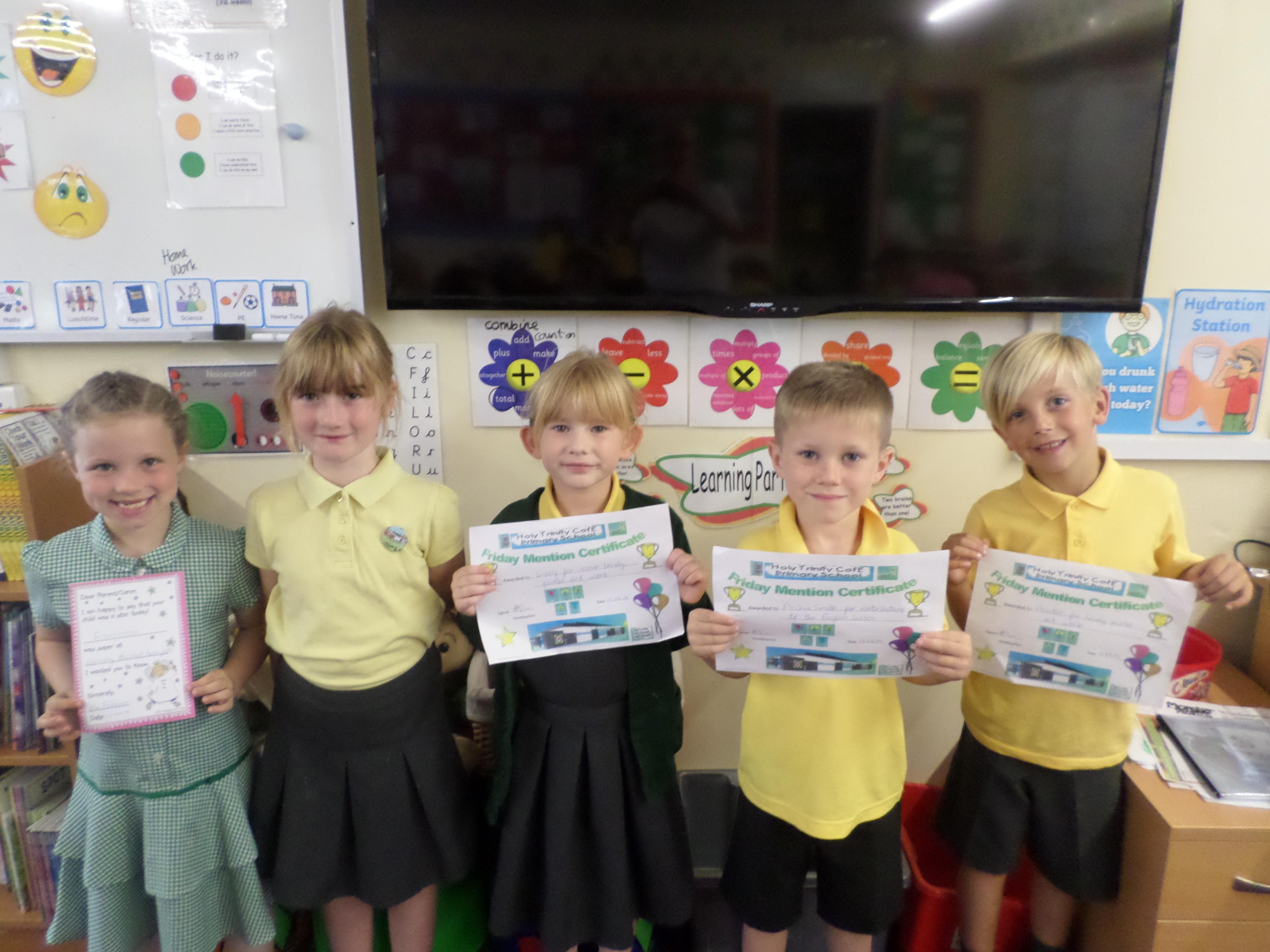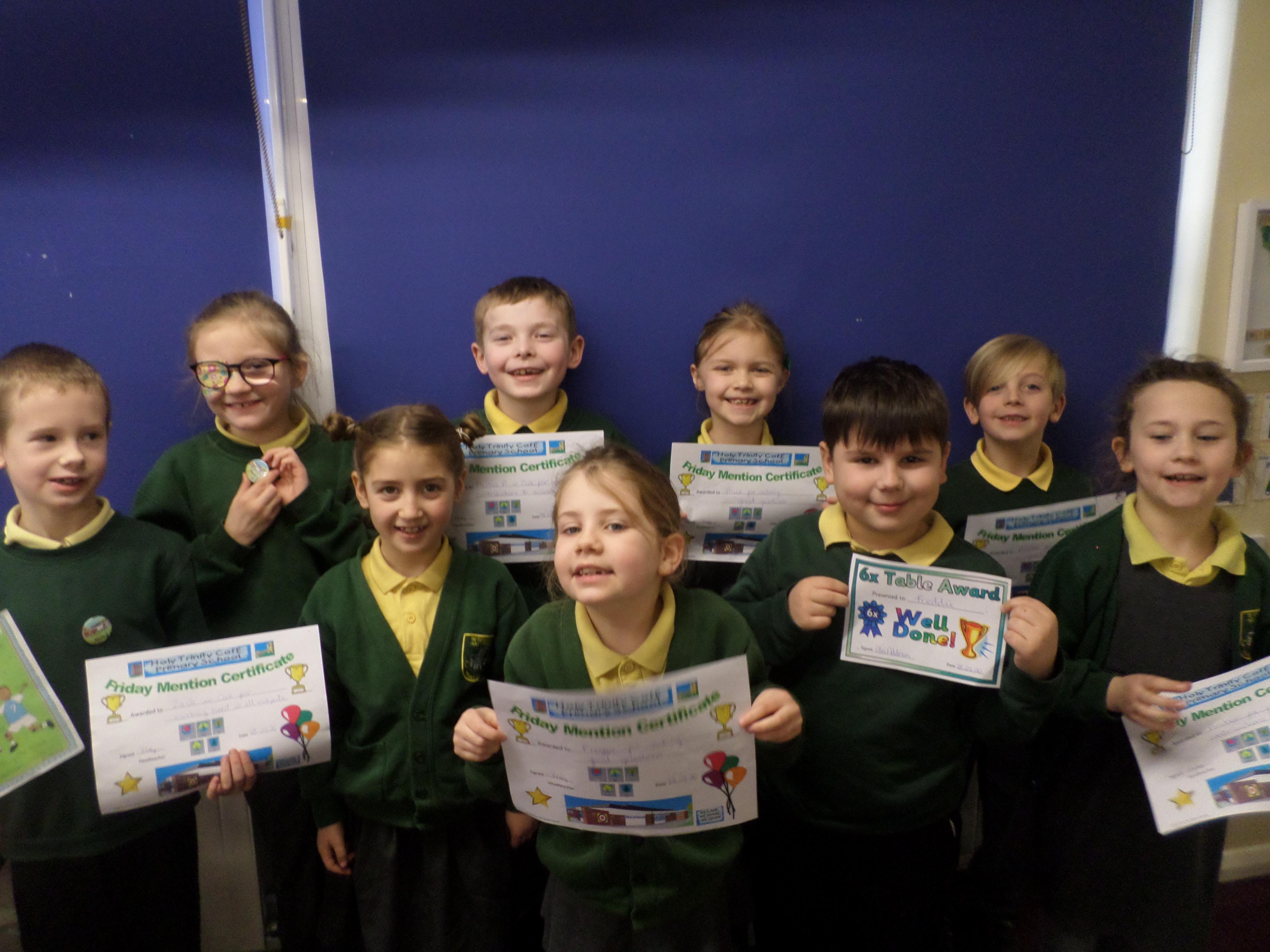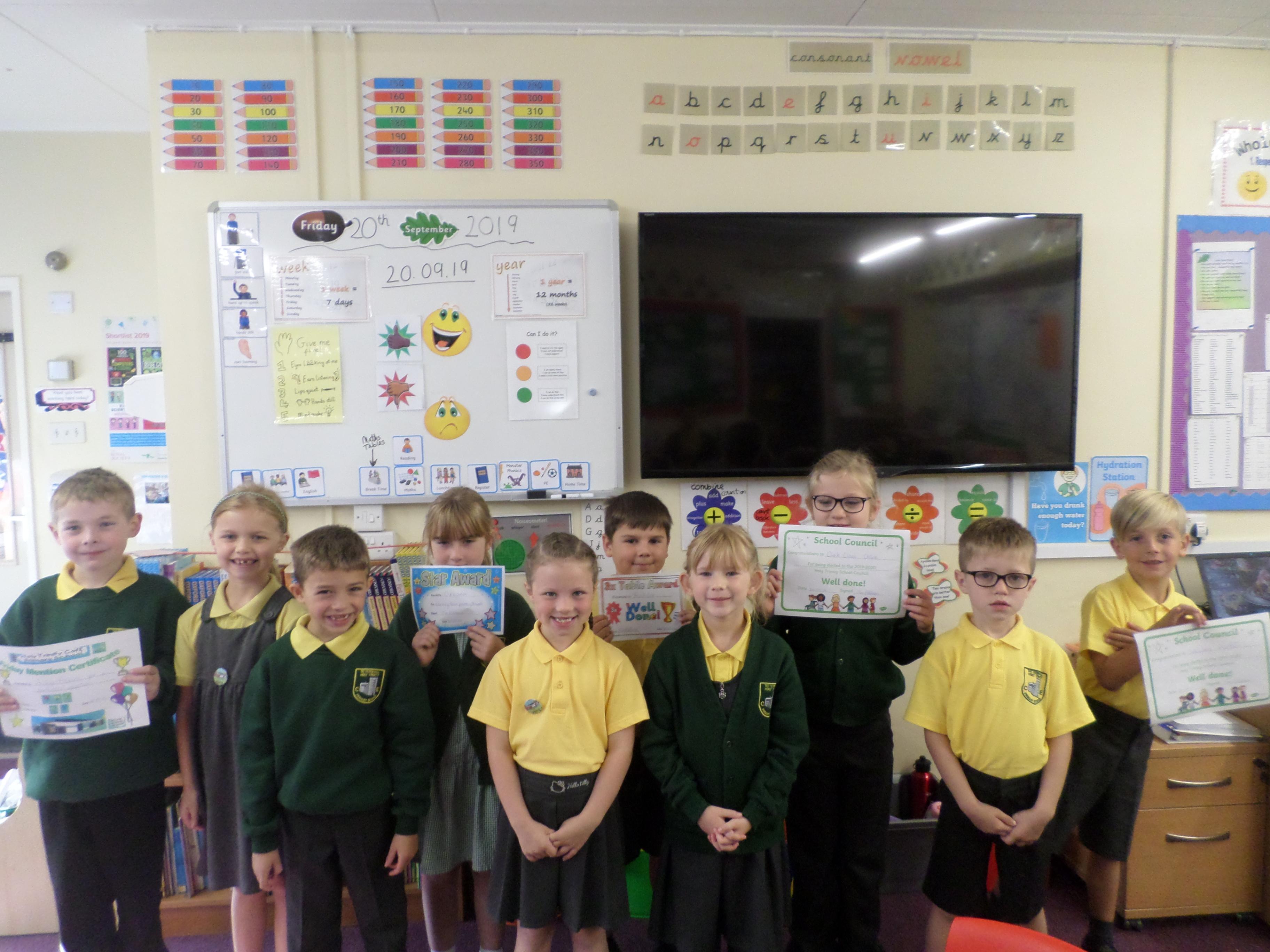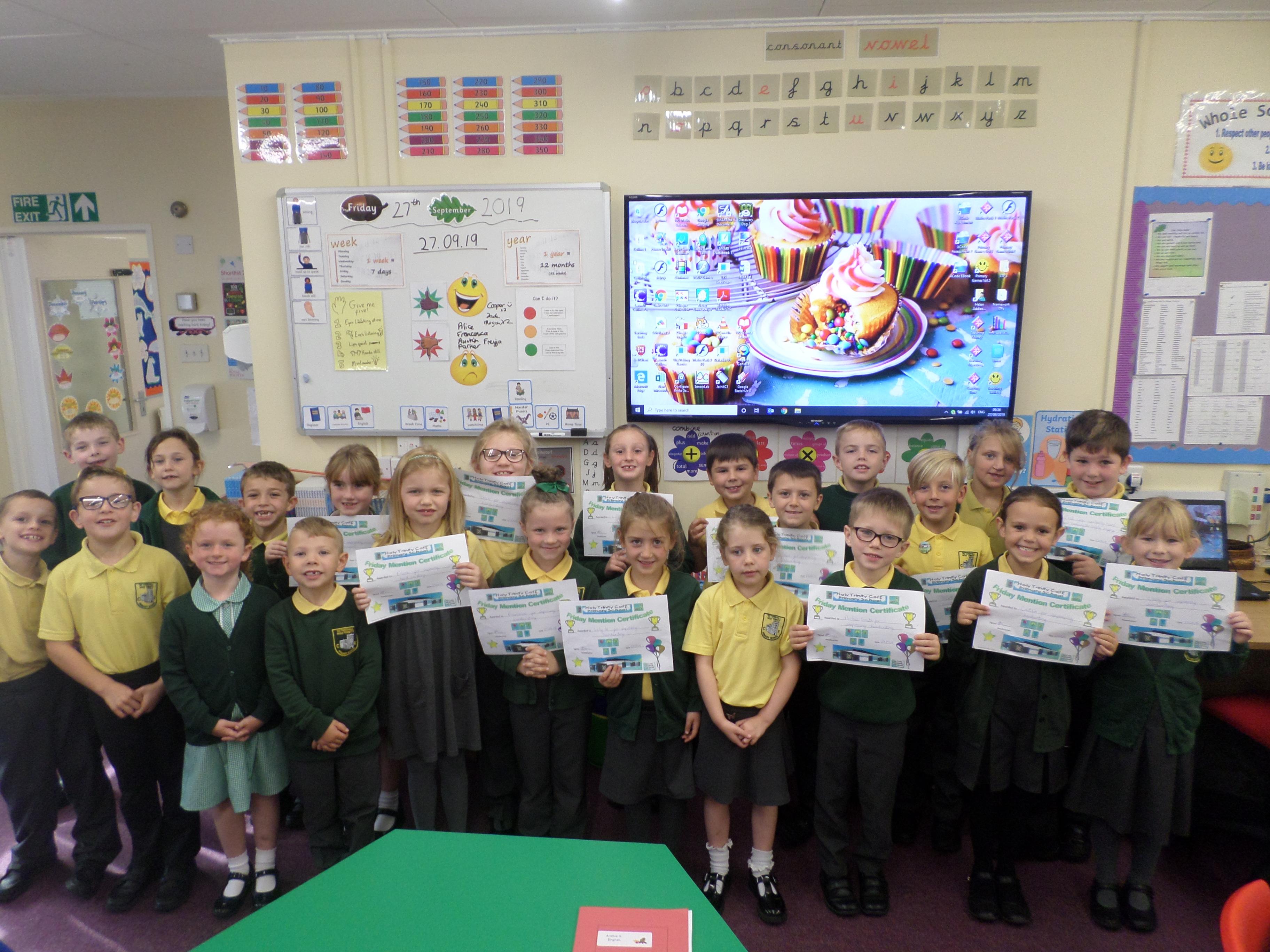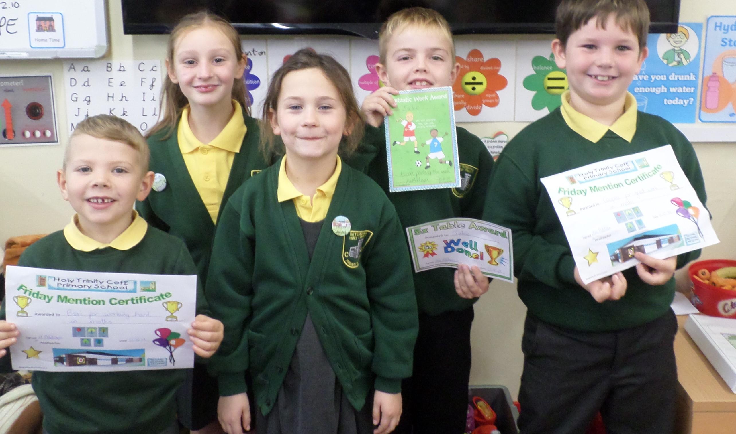 On this page are photographs of the children who receive awards including Friday Mentions, the Citizen Badge, Team Points of the Week and work on the Hall displays.