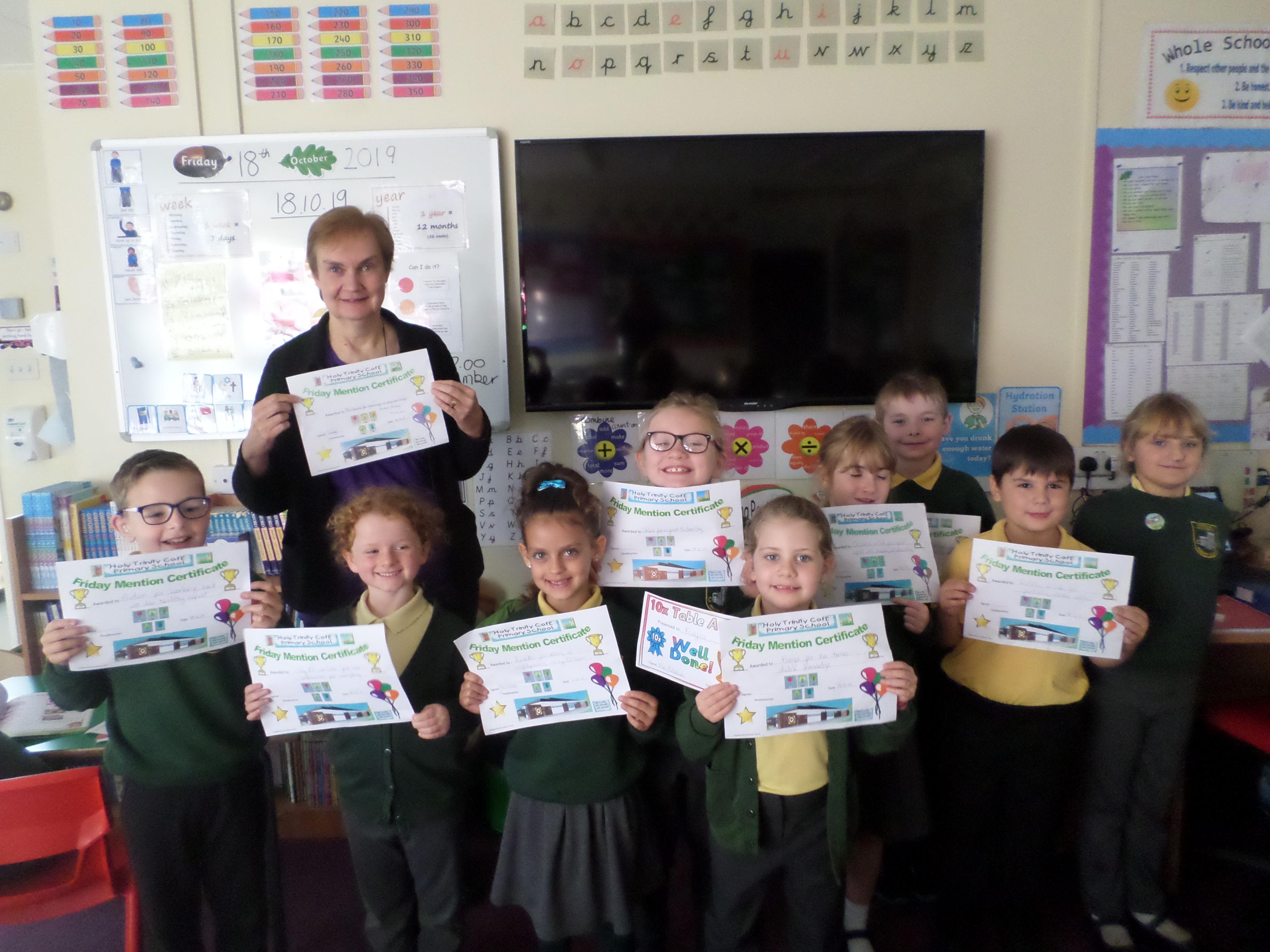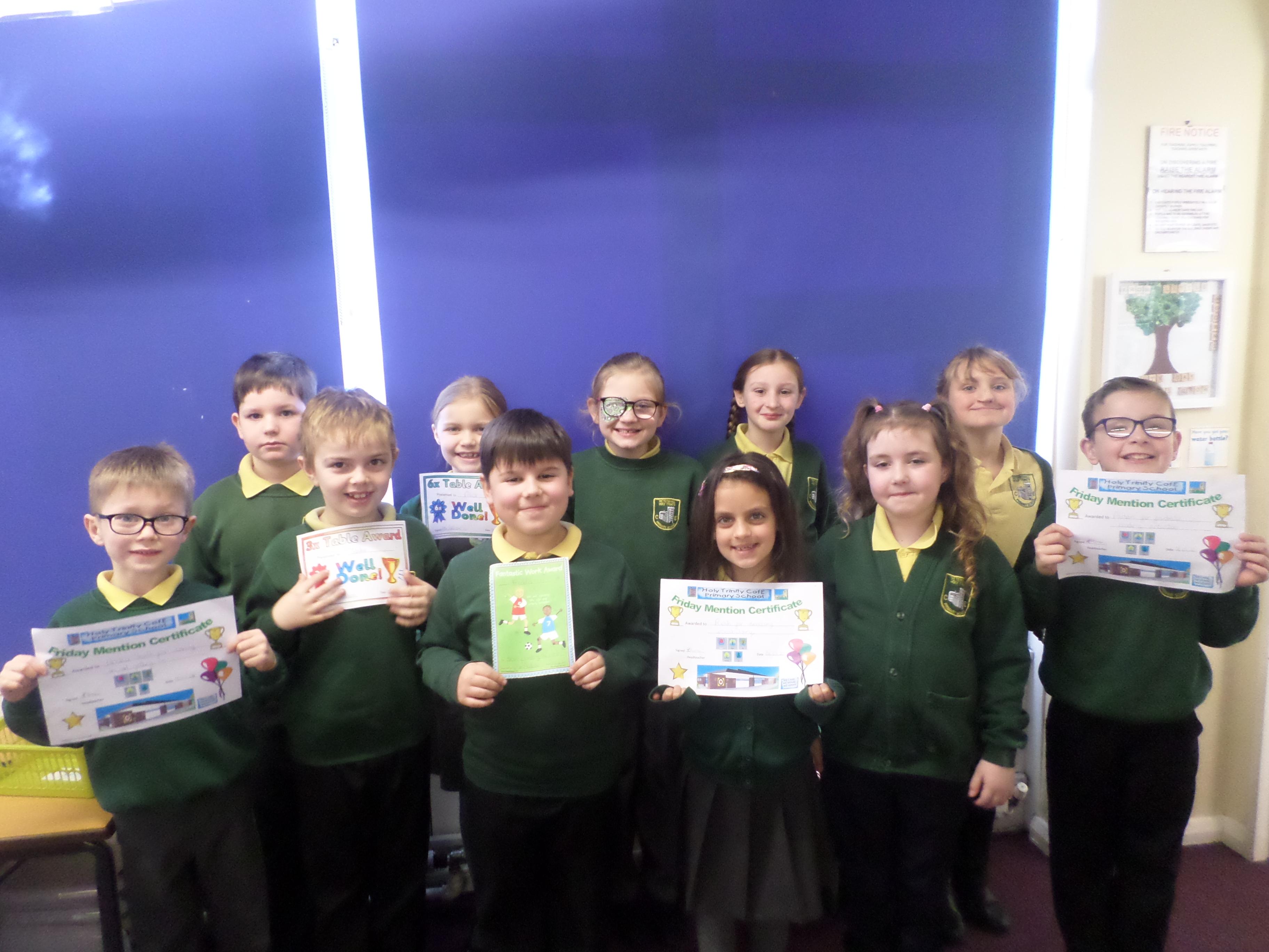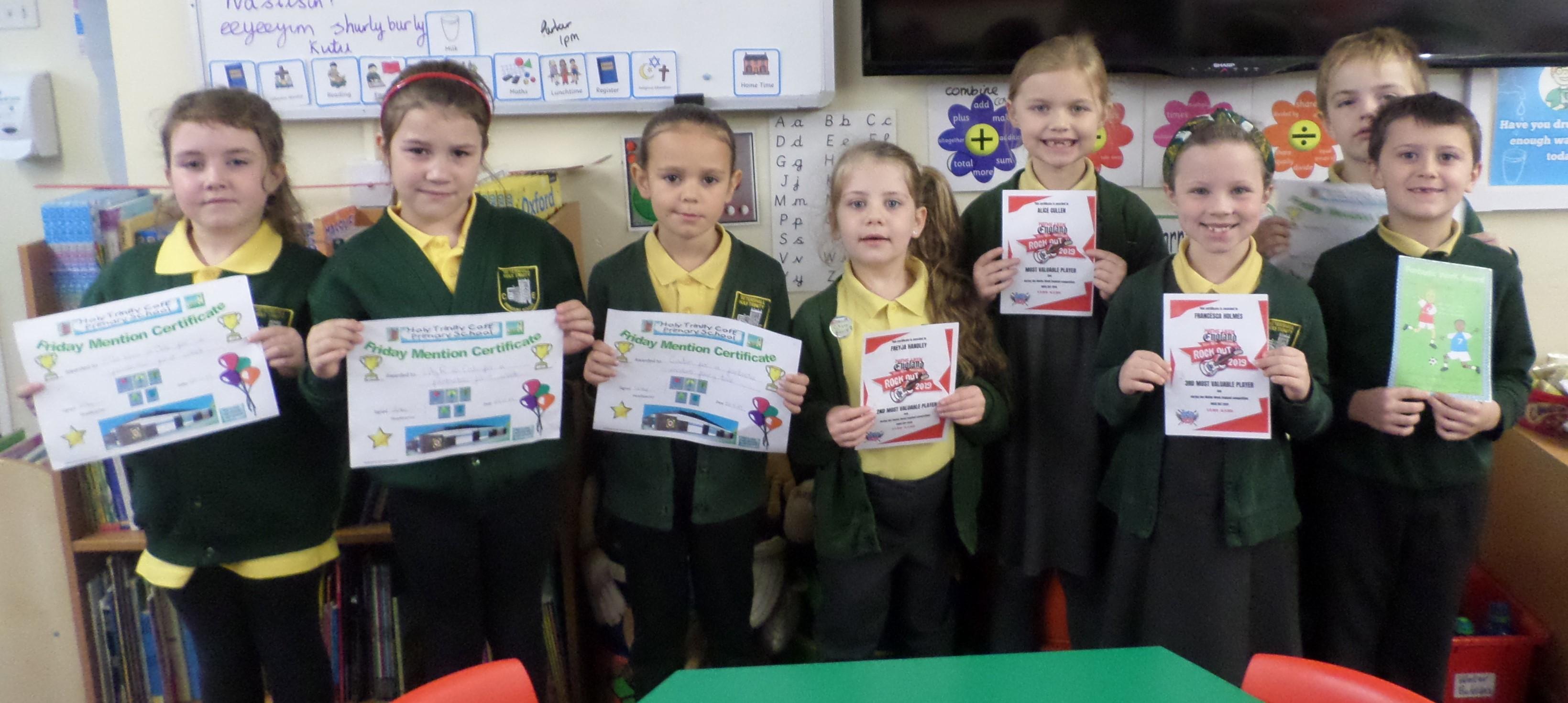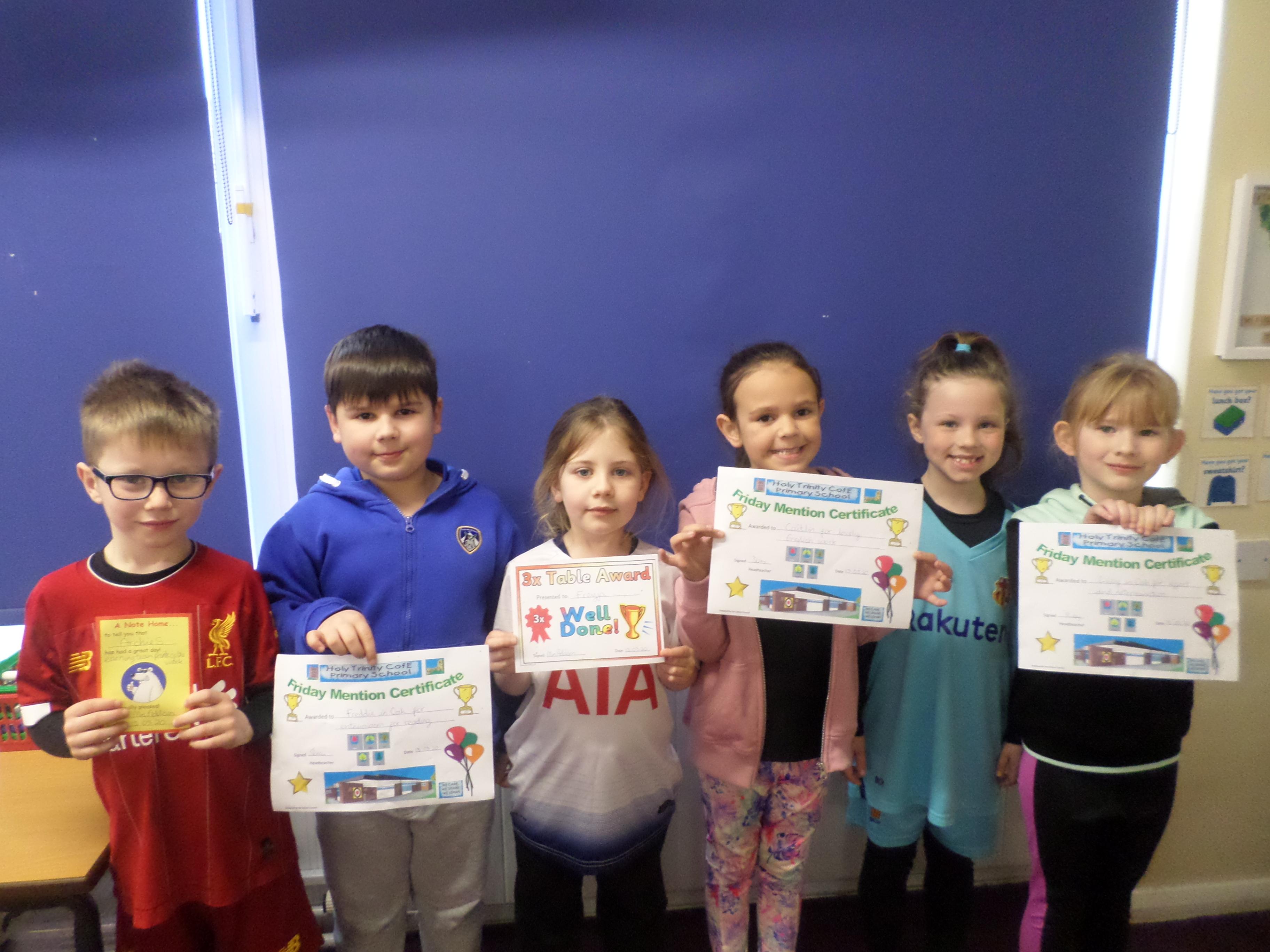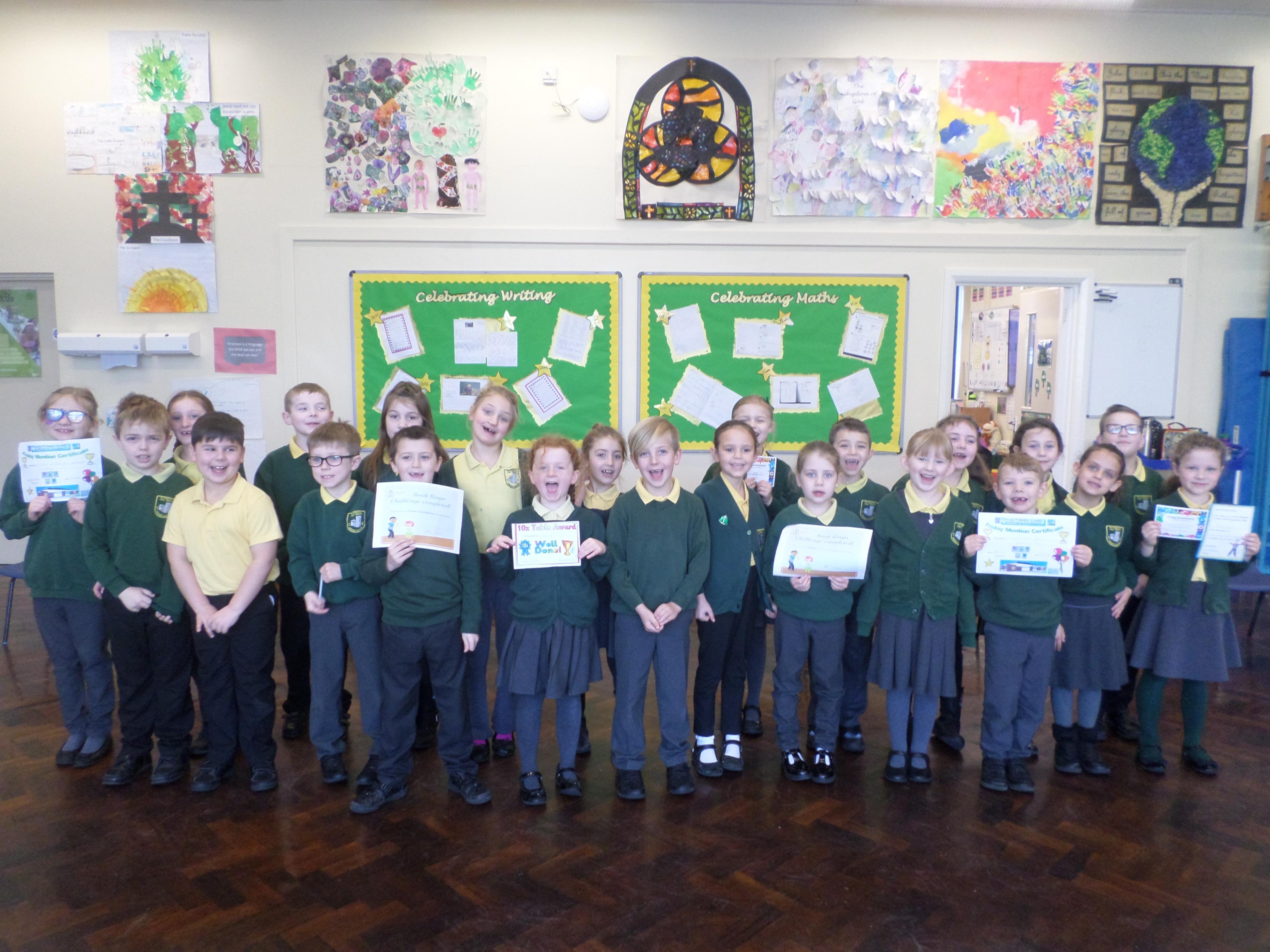 On this page are photographs of the children who receive awards including Friday Mentions, the Citizen Badge, Team Points of the Week and work on the Hall displays.