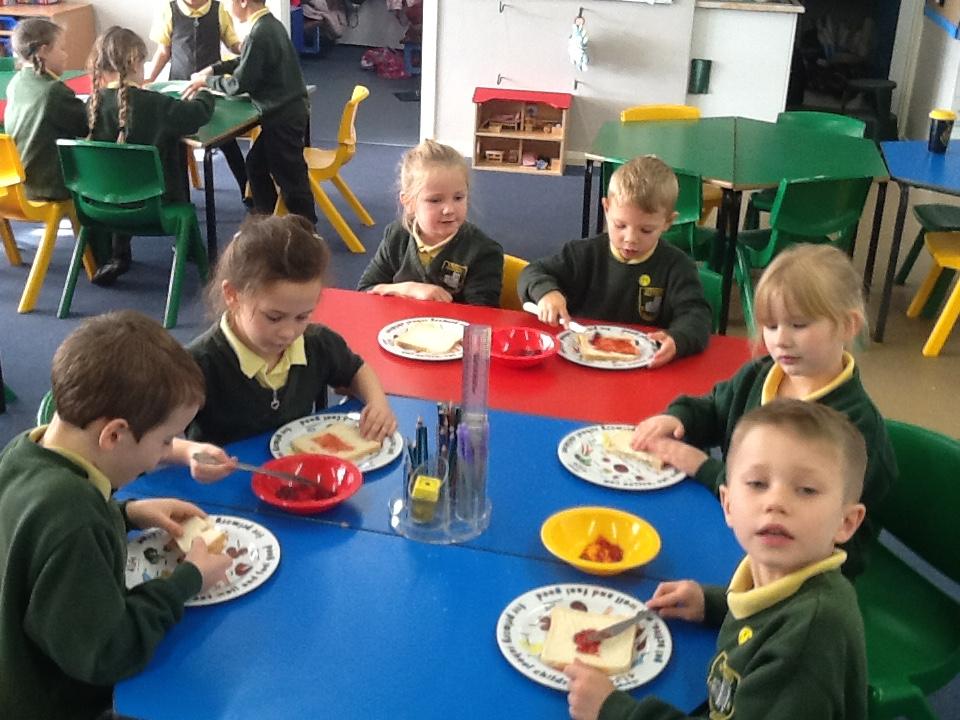 We made jam sandwiches to help us write instructions this week. Now if a greedy tiger ever shows up for tea we will have a recipe ready to make a whole plate full he can gobble up.