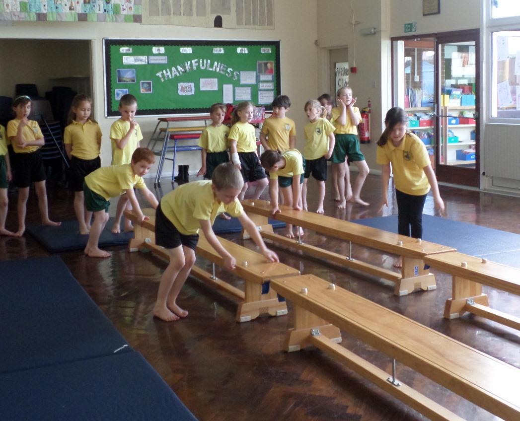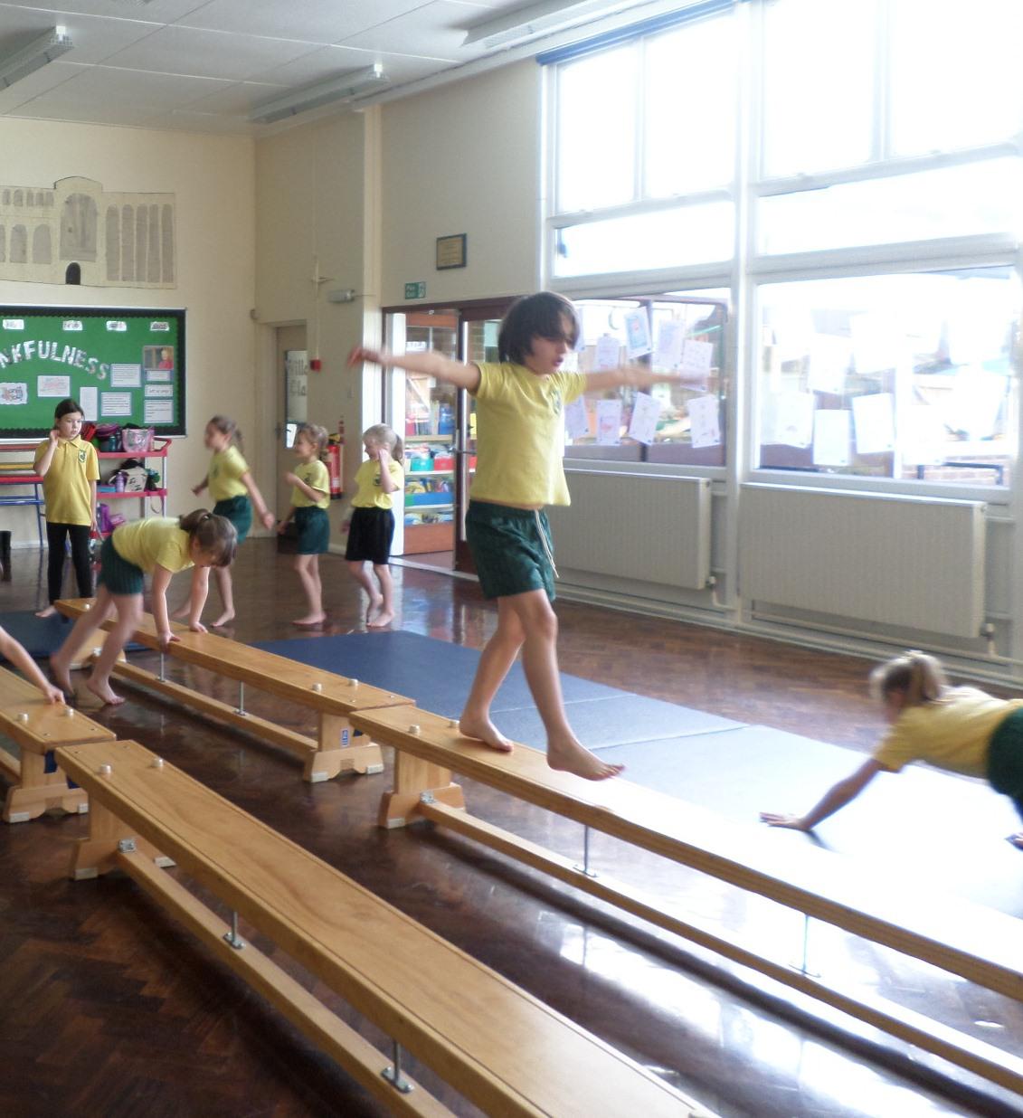 In gymnastics we have been learning about different ways to travel. We have learned different words to describe travelling and have been applying them to our movements. This include: straight, forwards, backwards, zig zag, diagonal, leap, jump, hop, skip, run, tip toes, and specific ways to travel including: crab, crocodile, bear and caterpillar. This week we applied these to travelling across the benches and also learned how to bunny hop over the benches.