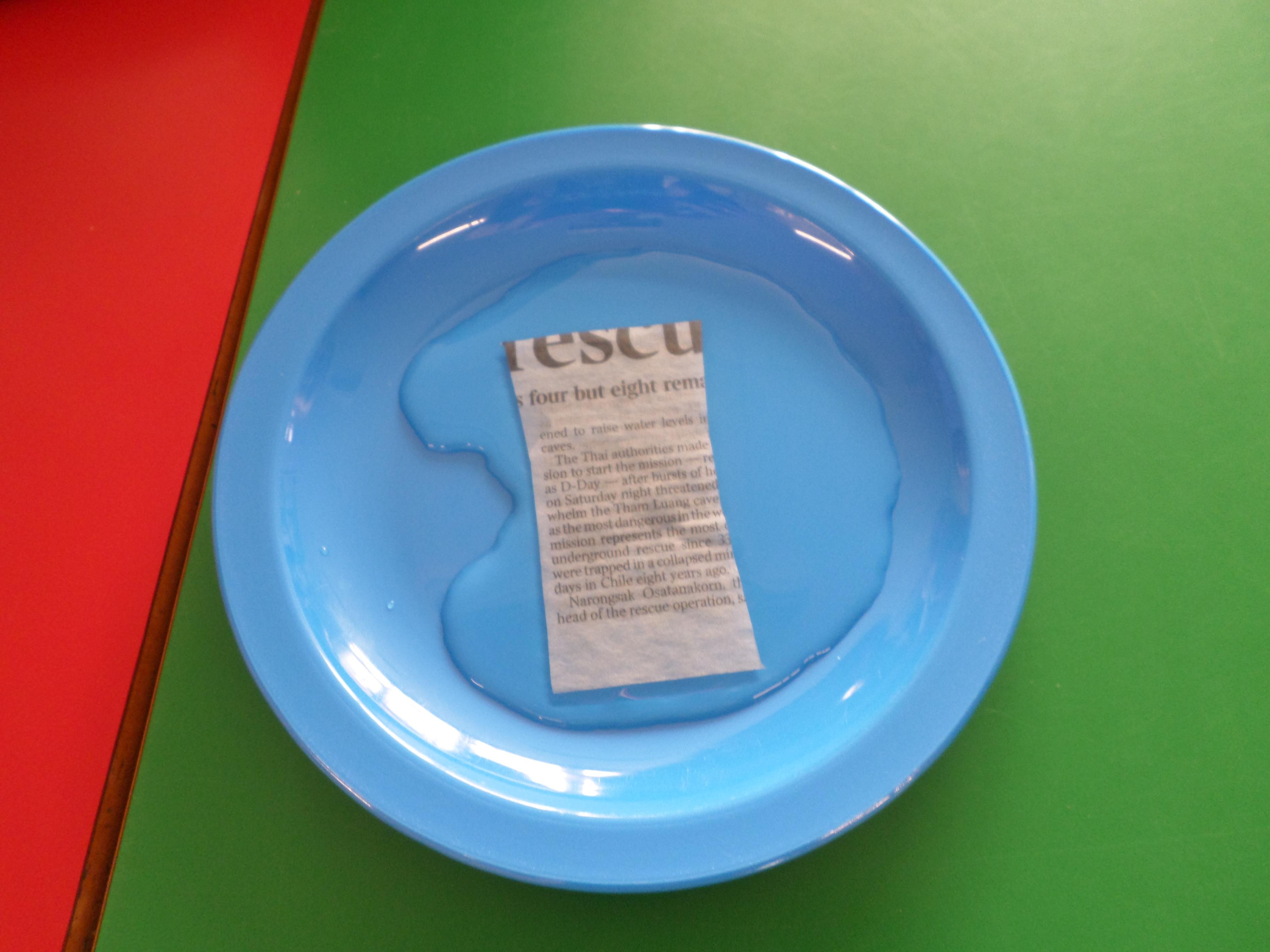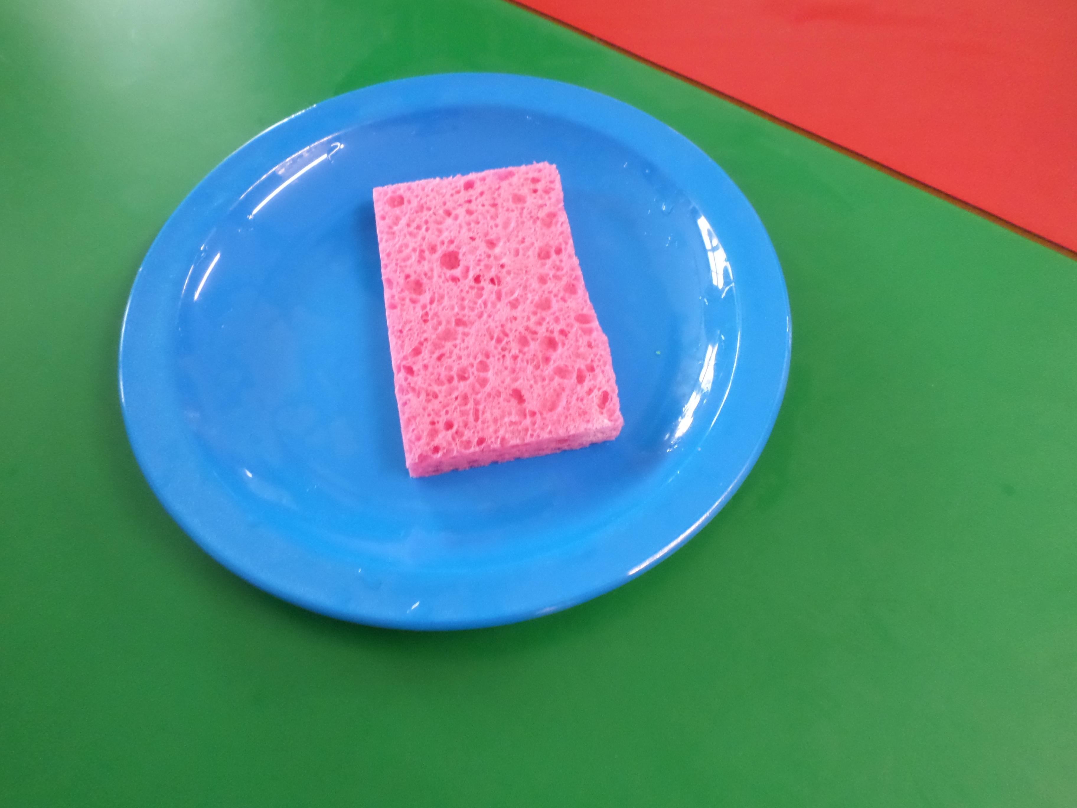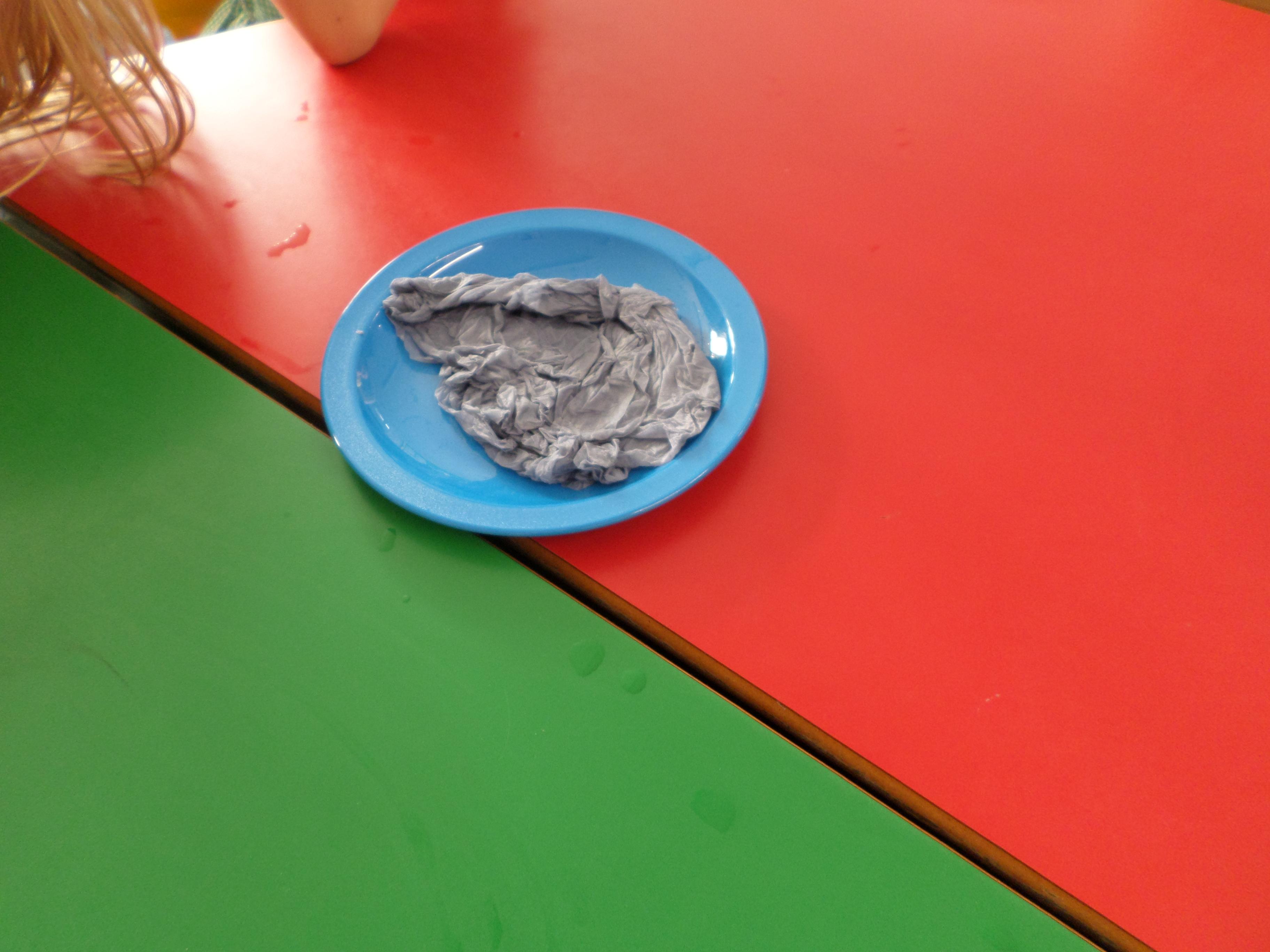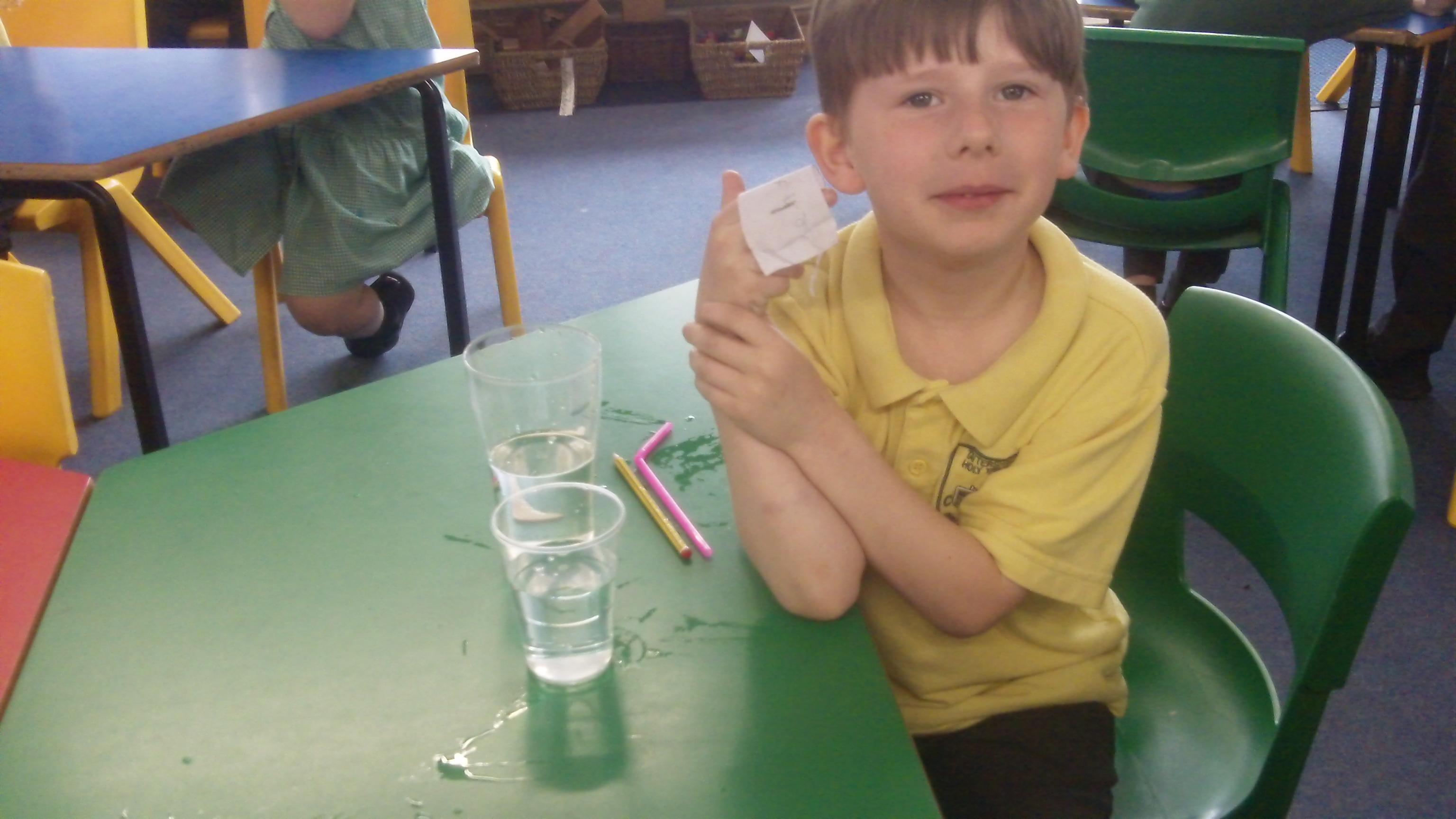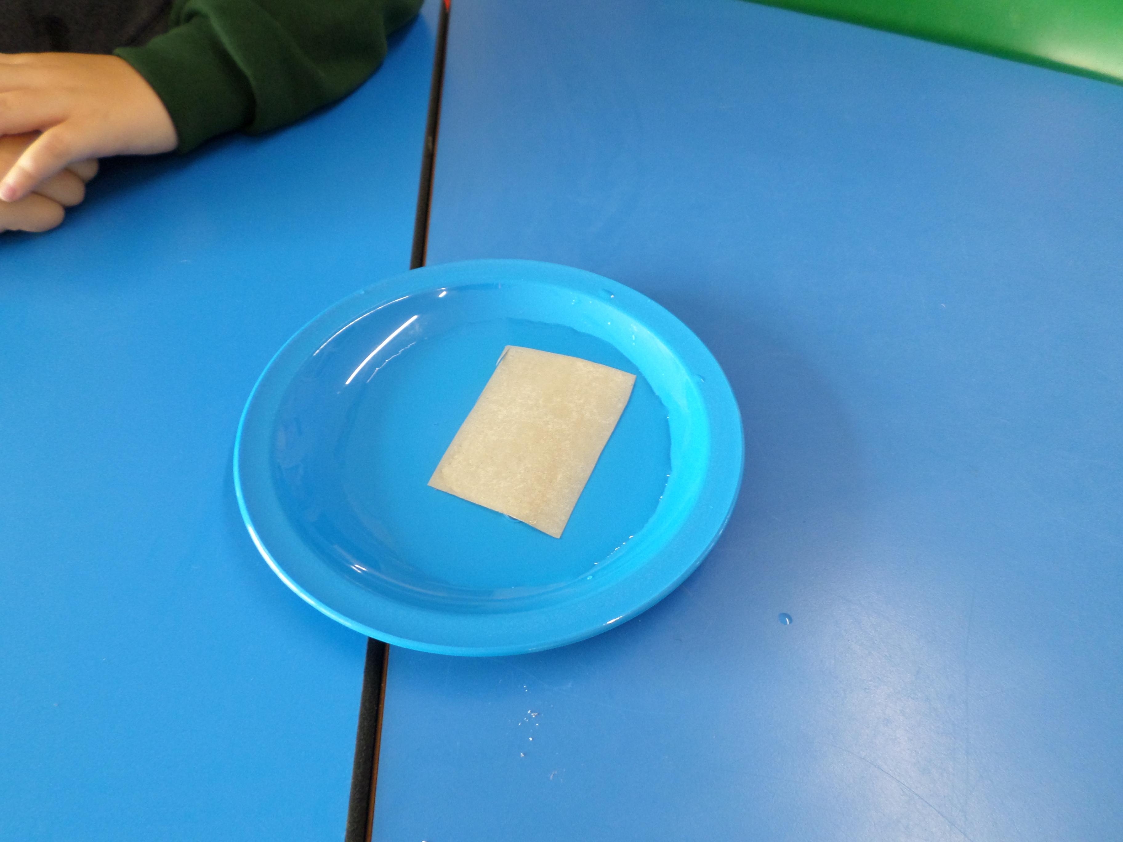Willow Class helped Discovery Dog find the best material to absorb a puddle left by Naughty Nora after she had an accident. To test fairly we cut the same size pieces of each material and used the same amount of water. We correctly predicted that the sponge would absorb the most liquid, although the cloth and hand towel did a good job too! The plastic did not absorb any water and the paper towel fell apart, although it did the job when we used lots of it to see if that would work. Mrs Addison put the plate upside down over her head after the sponge to show that there was no water left!