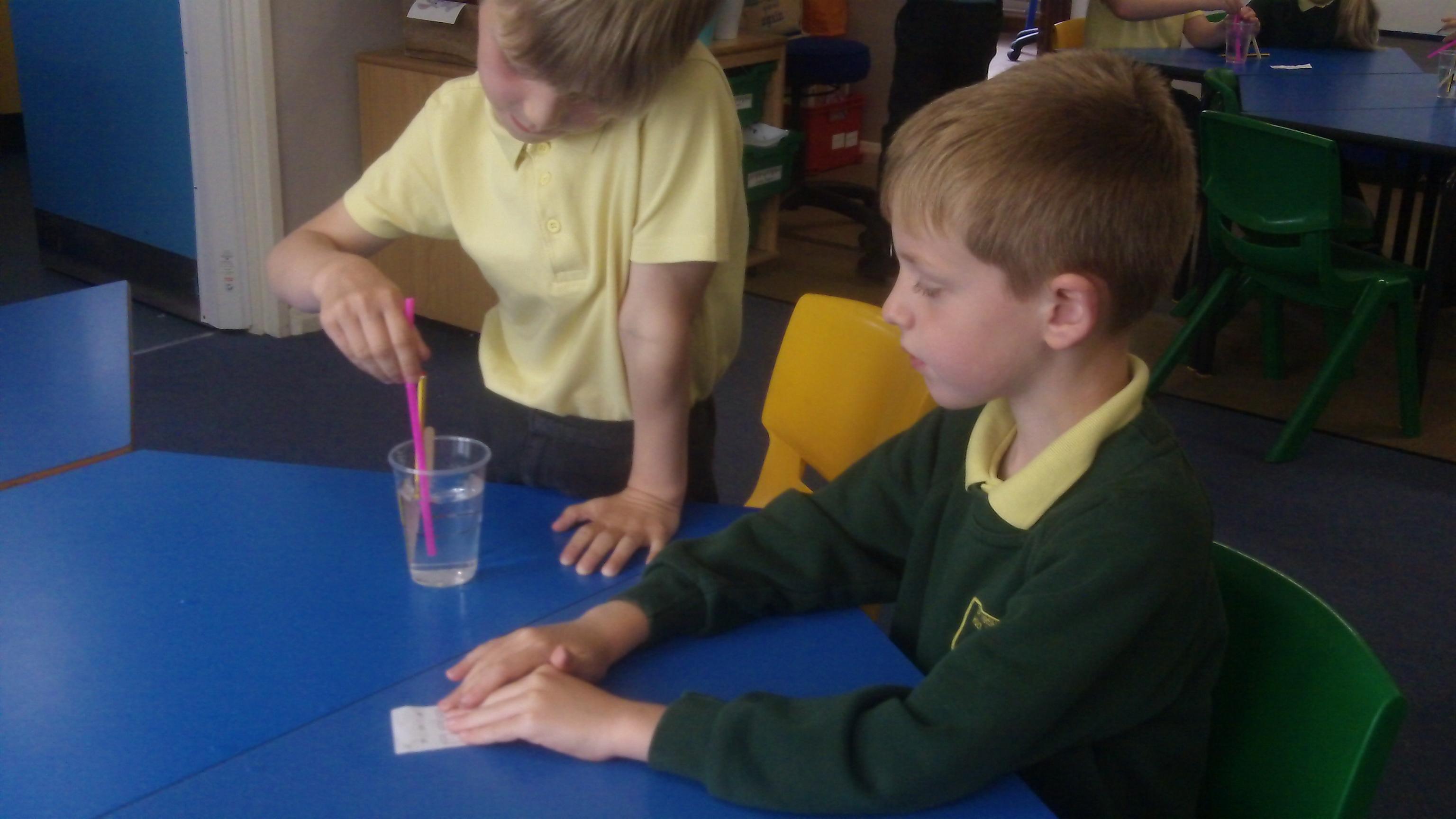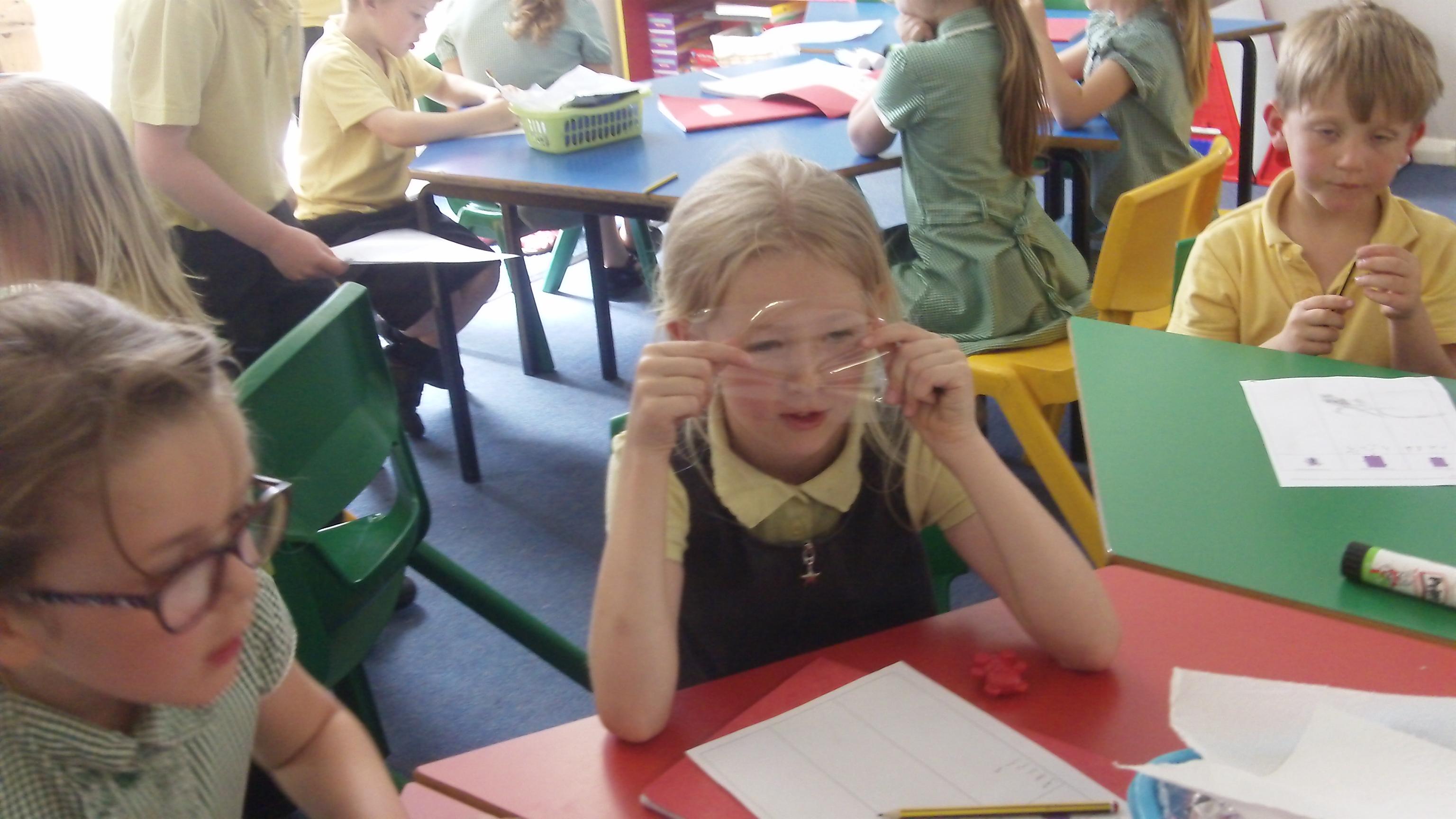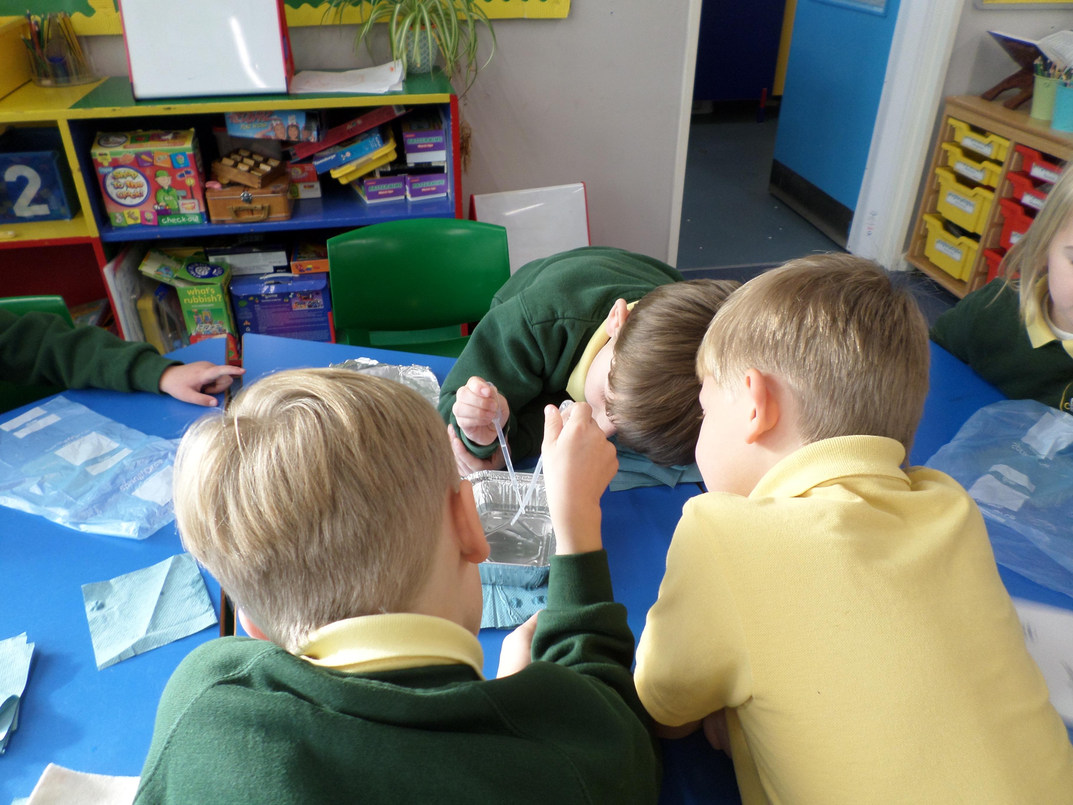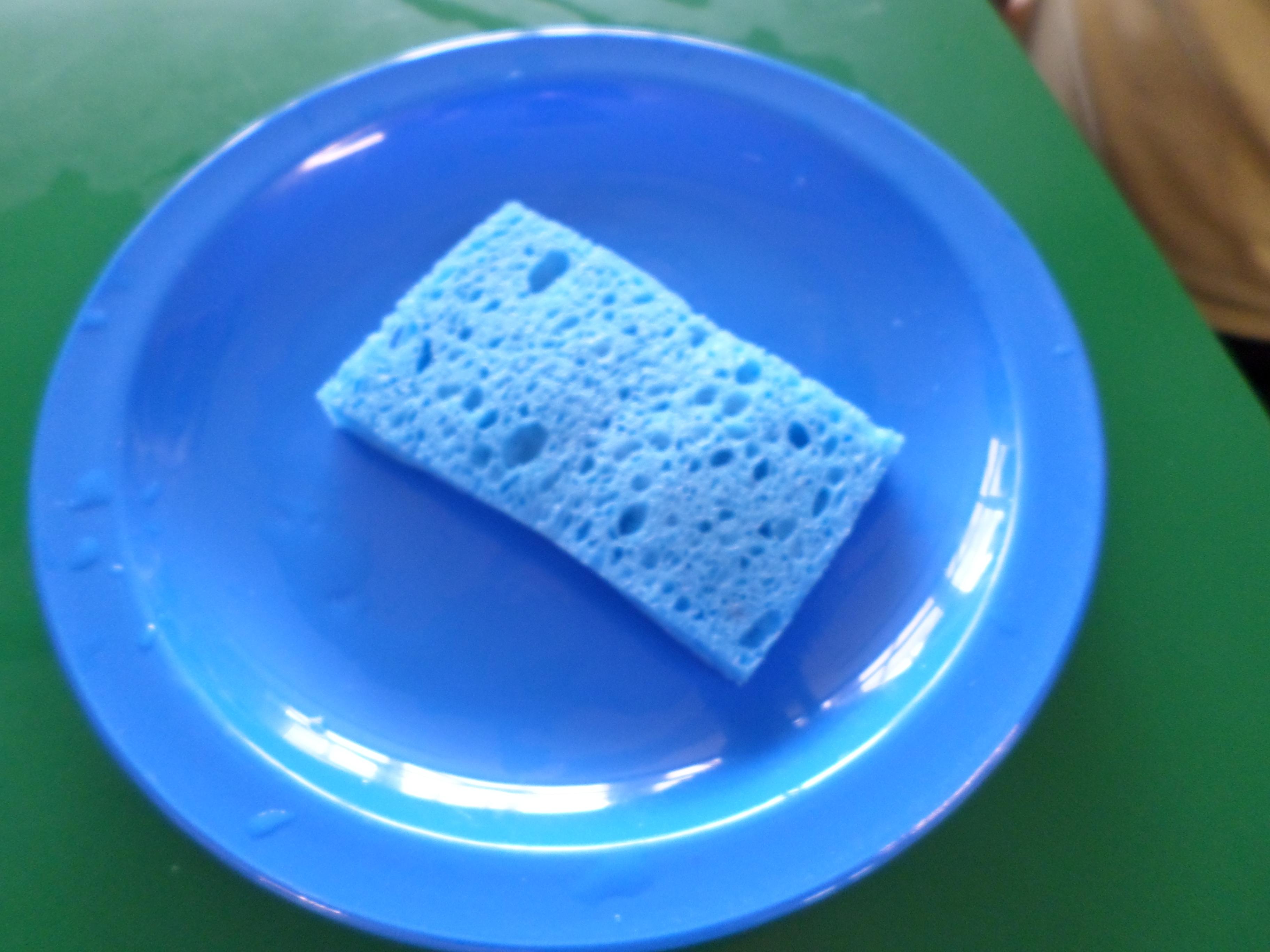 Willow Class helped Discovery Dog find the best material to absorb a puddle left by Naughty Nora after she had an accident. To test fairly we cut the same size pieces of each material and used the same amount of water. We correctly predicted that the sponge would absorb the most liquid, although the cloth and hand towel did a good job too! The plastic did not absorb any water and the paper towel fell apart, although it did the job when we used lots of it to see if that would work. Mrs Addison put the plate upside down over her head after the sponge to show that there was no water left!