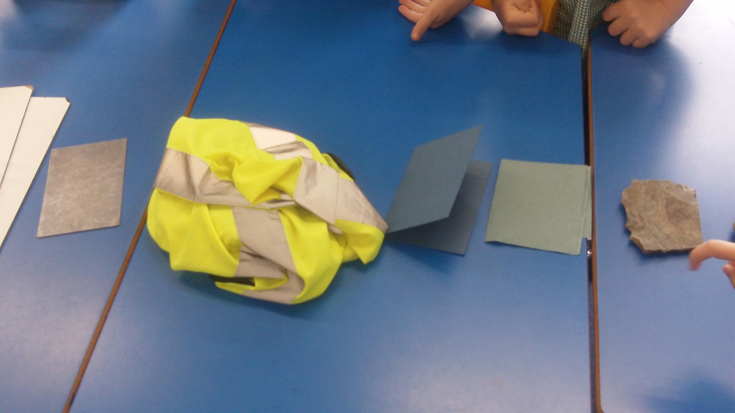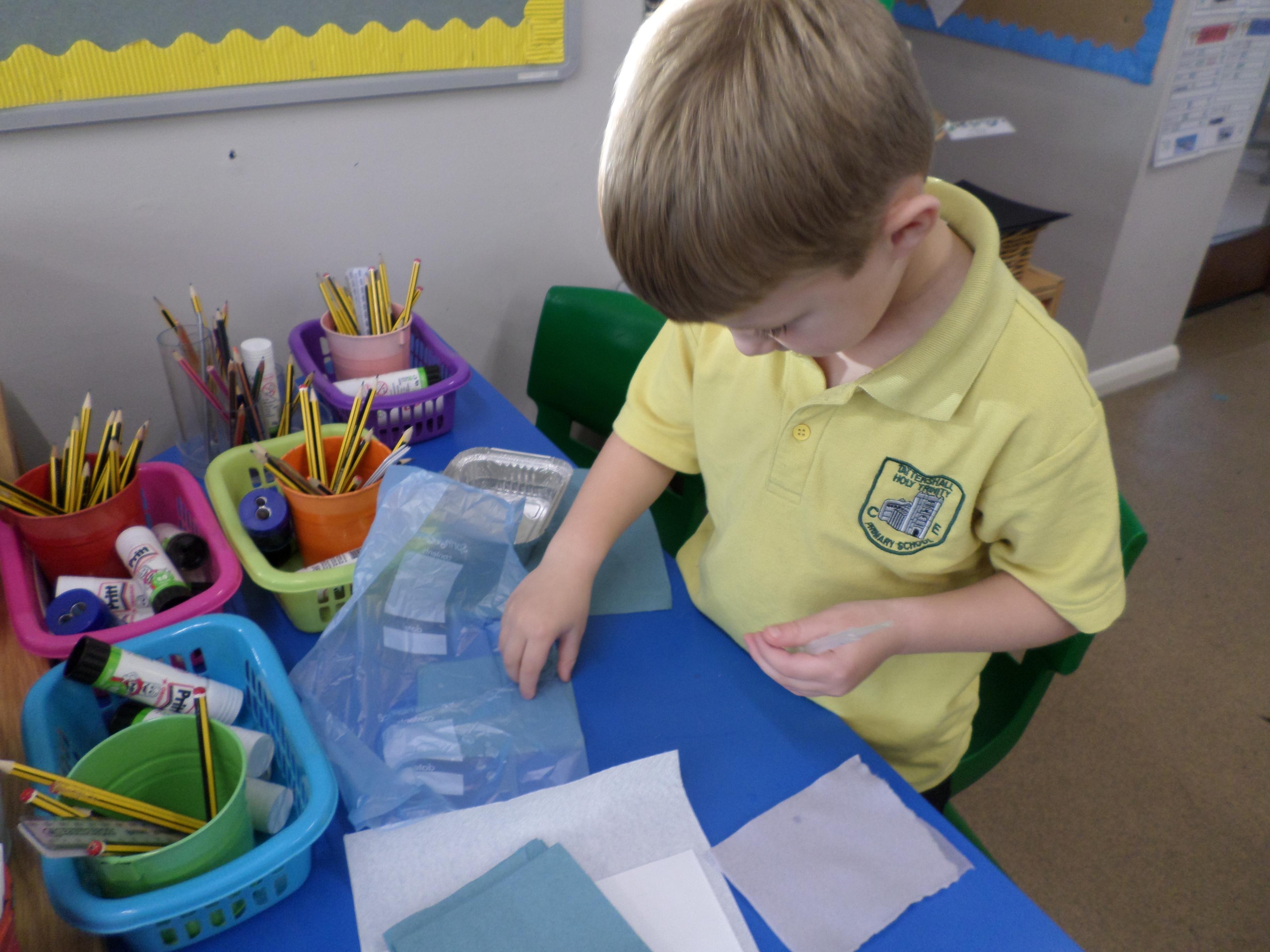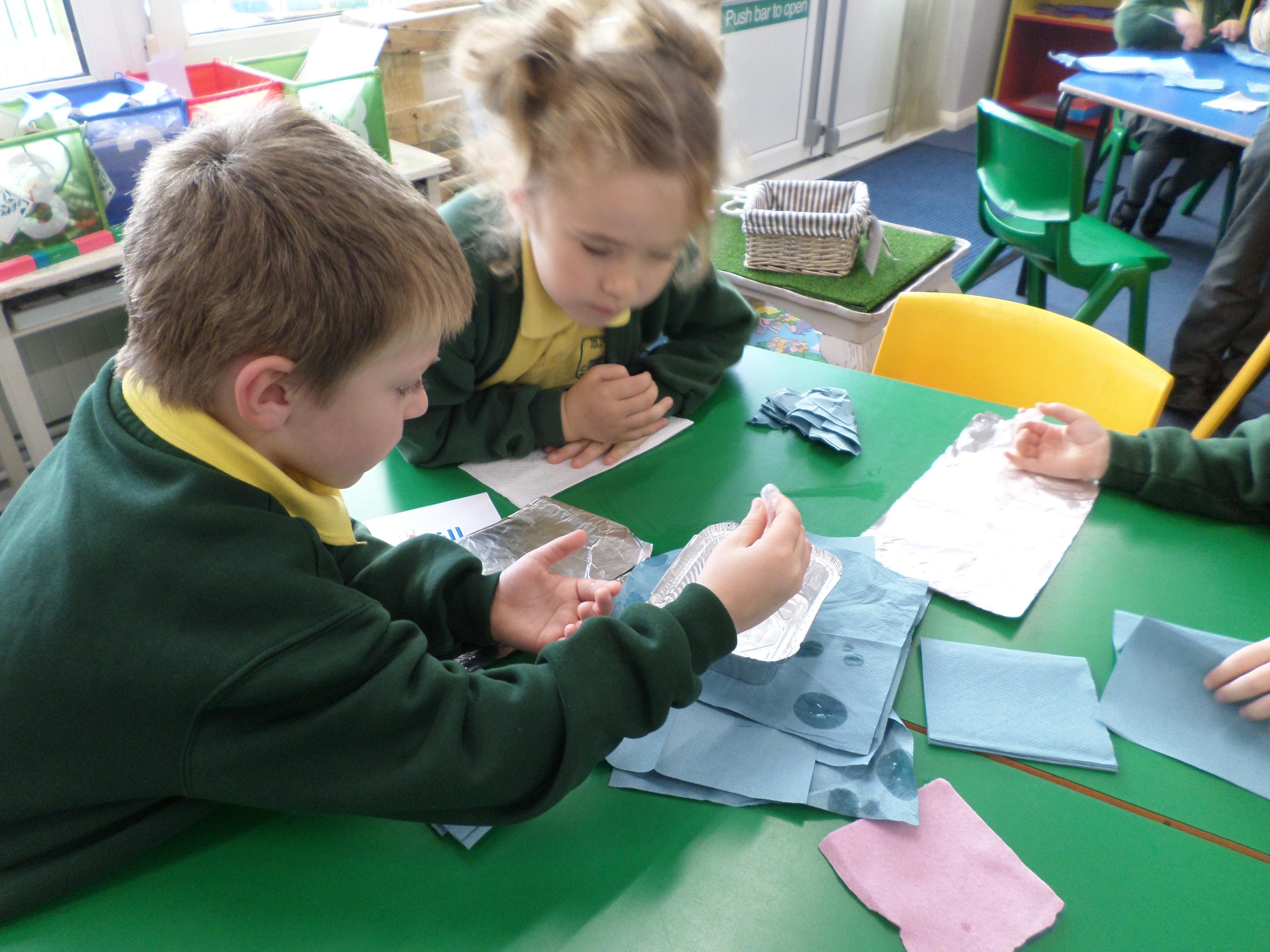 Our Class Puppet Billy had been out in the rain with his woolly hat on thinking his hair would stay dry. Instead it got very wet indeed! He asked Willow Class to investigate which material would make a better, more waterproof hat. He suggested a list of different materials for different reasons: paper (because it's easy to fold), paper towel (he thought the towel part might keep him dry), plastic (as it didn't work for Discovery Dog to mop up Naughty Nora's puddles), silver foil (because it's flexible and shiny) or felt fabric (because it's soft and comfy to wear).
