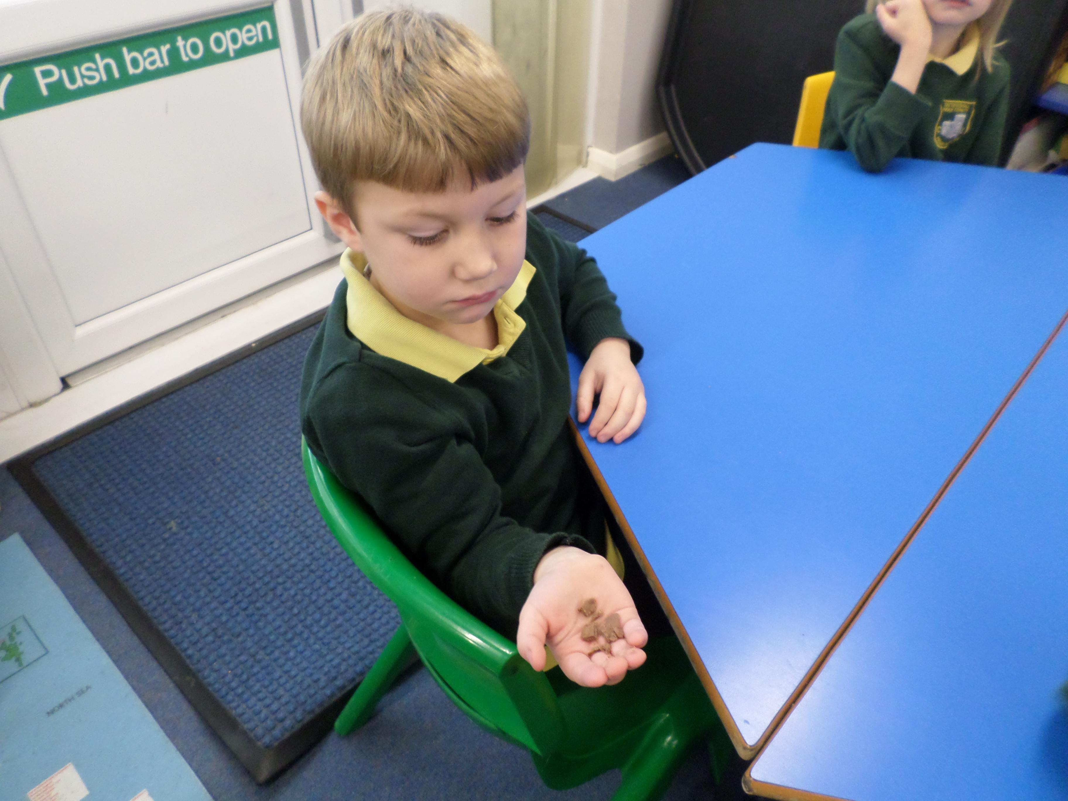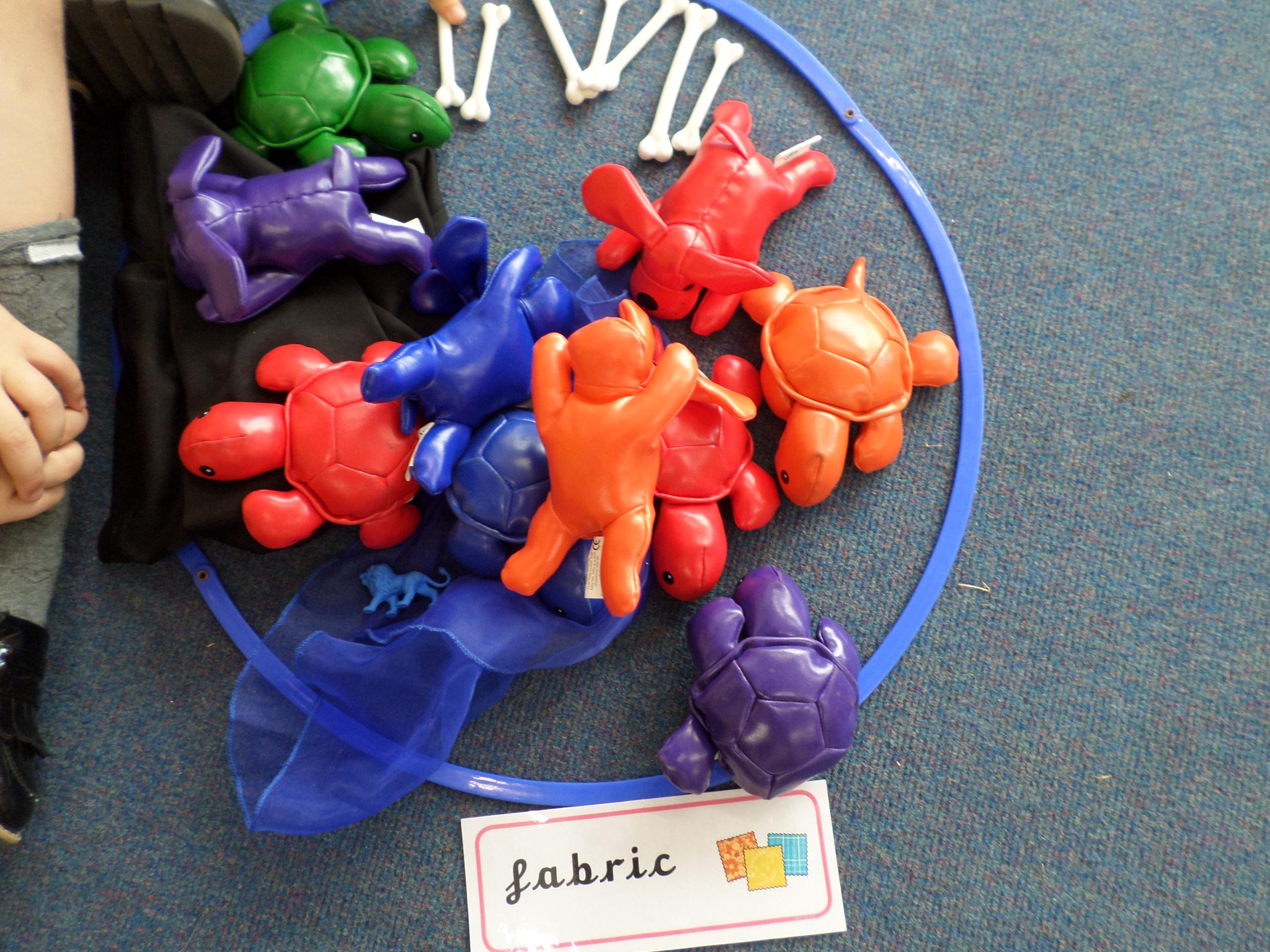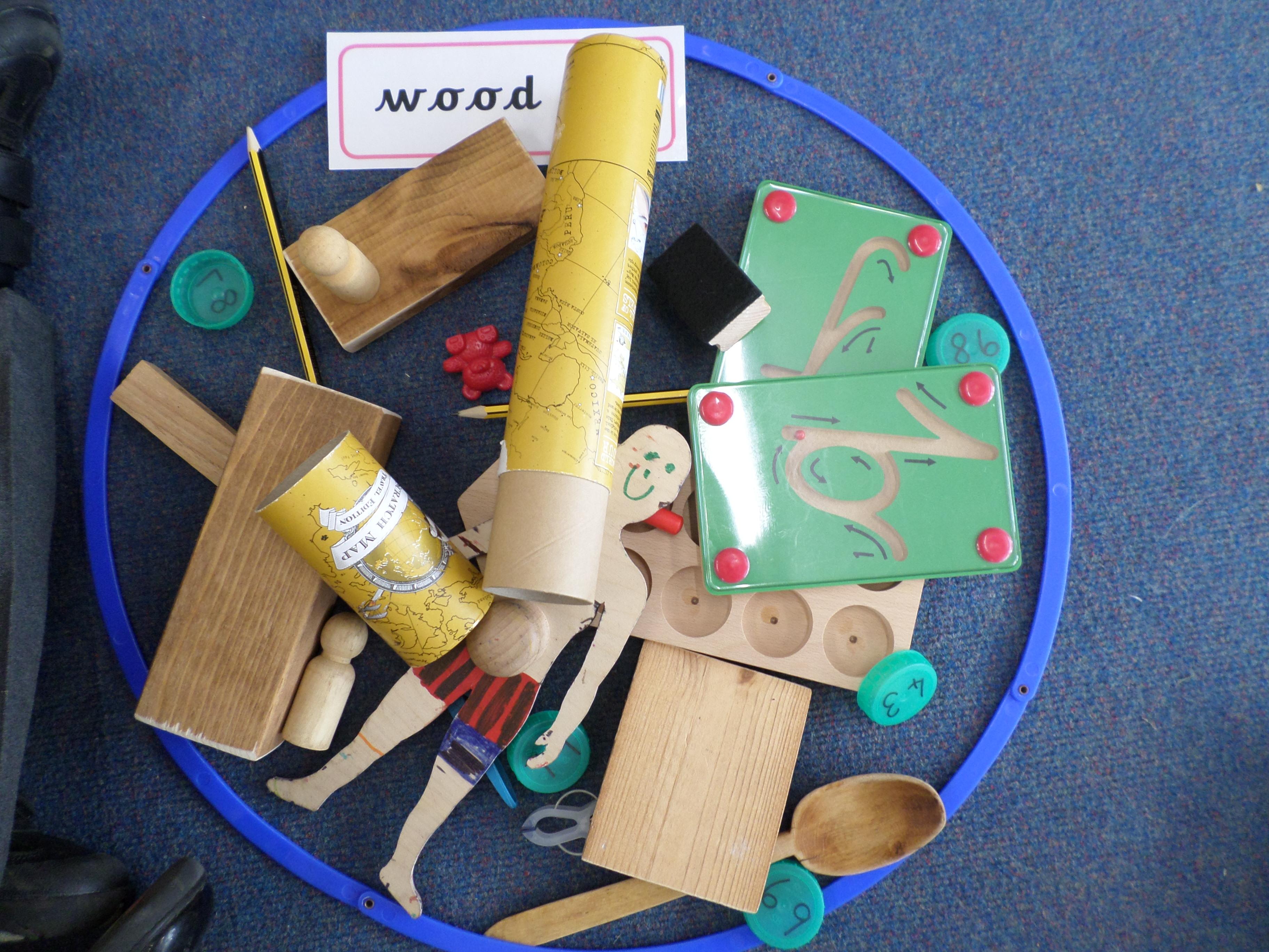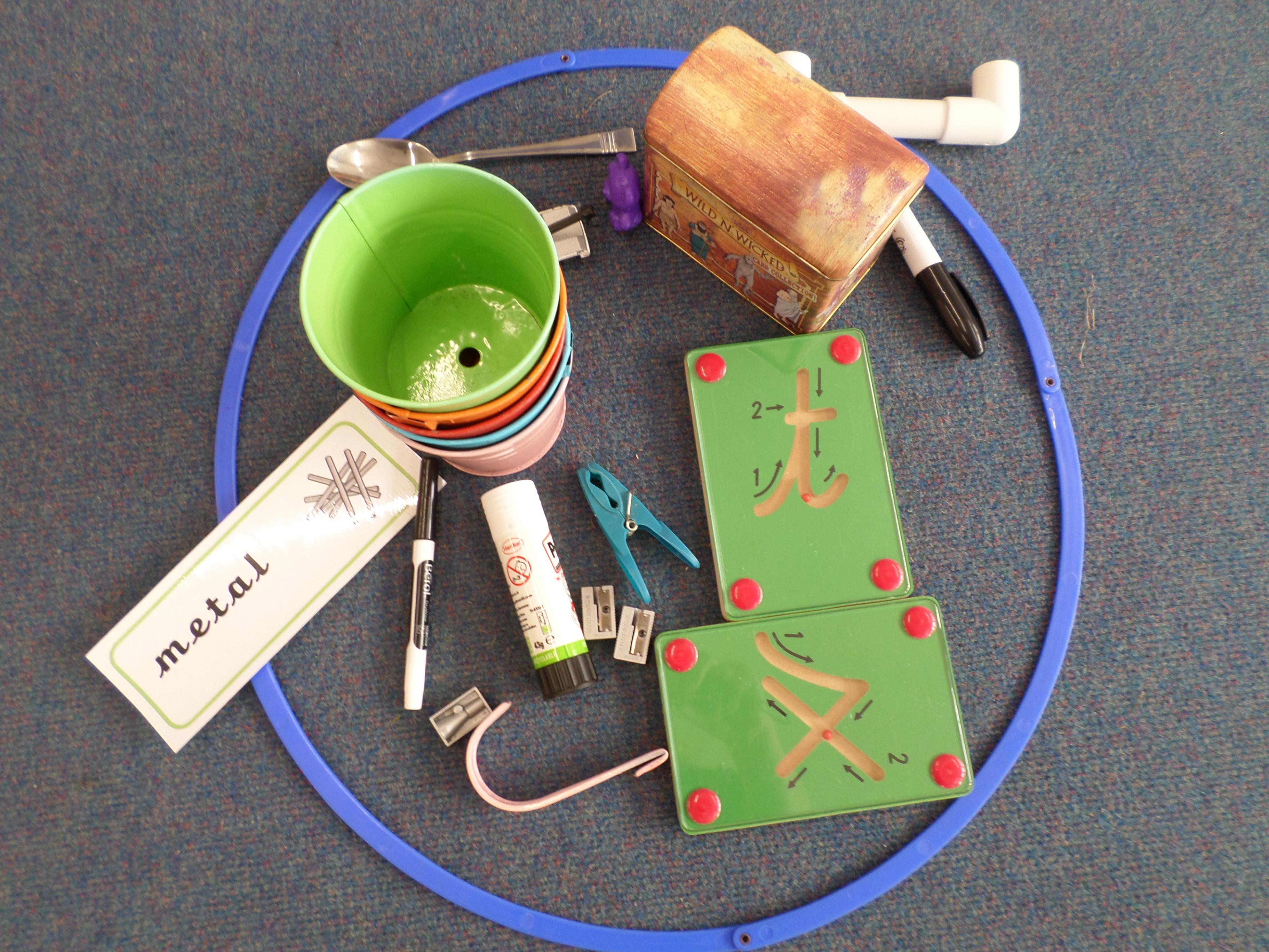 Willow class collected different objects and sorted them into hoops depending on what material they were made out of. At first we got some wrong, then we realised that some objects were made of more than one material so the hoops needed overlapping. The headings were: Metal, Wood, Plastic, Fabric and Other.