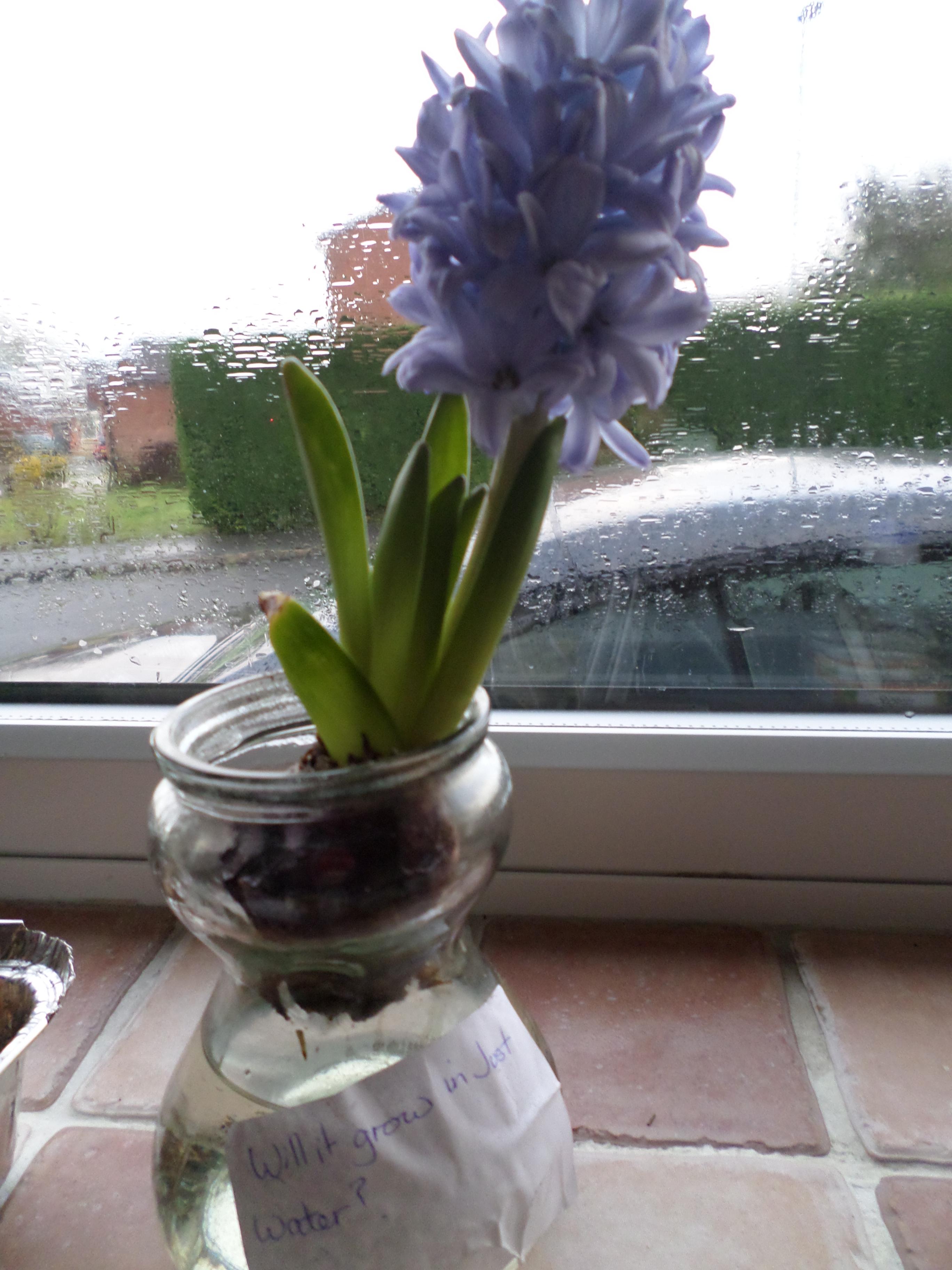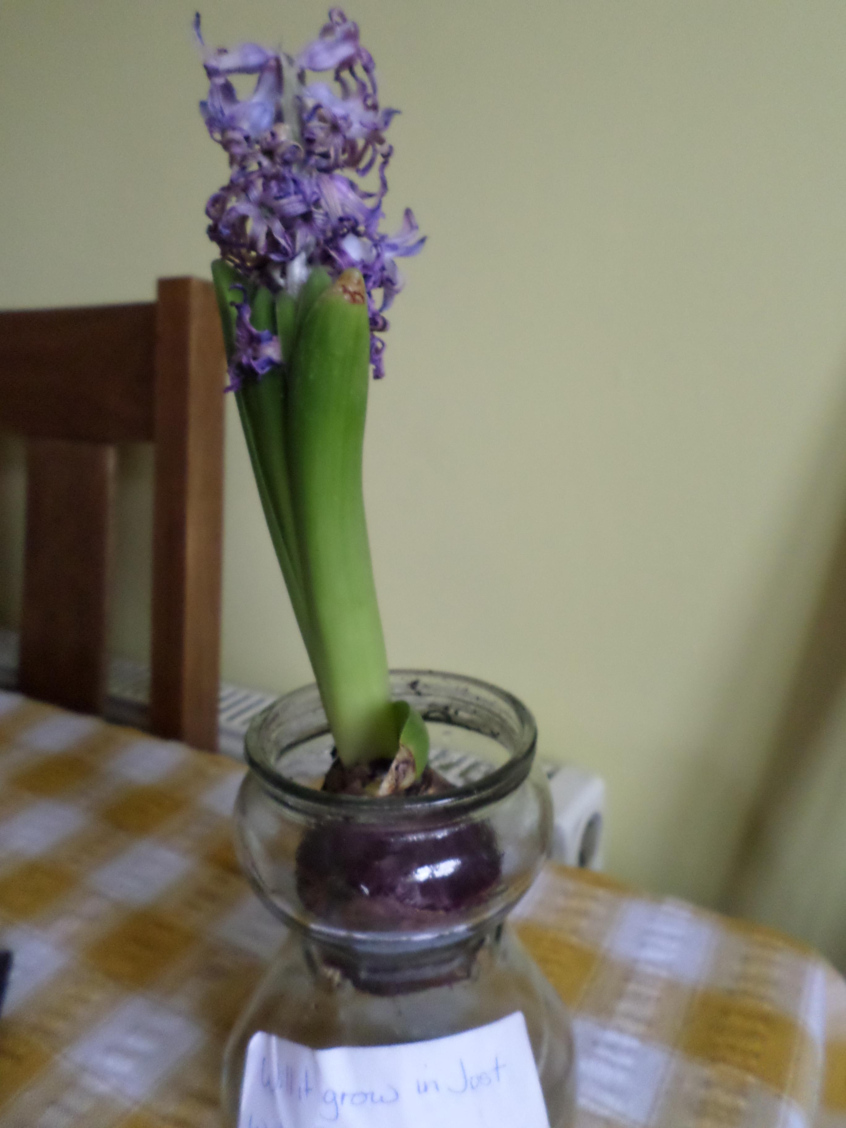 The bulb in just water grew a lovely purple flower but only to a height of 16cm.