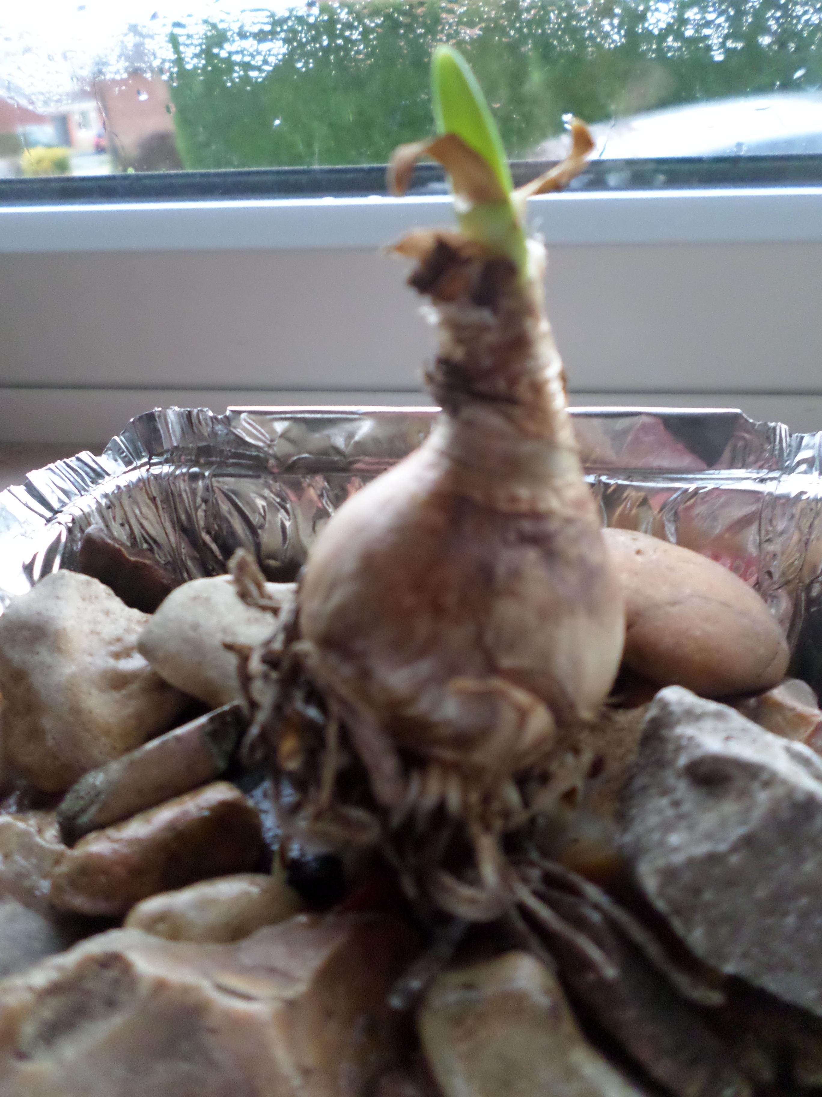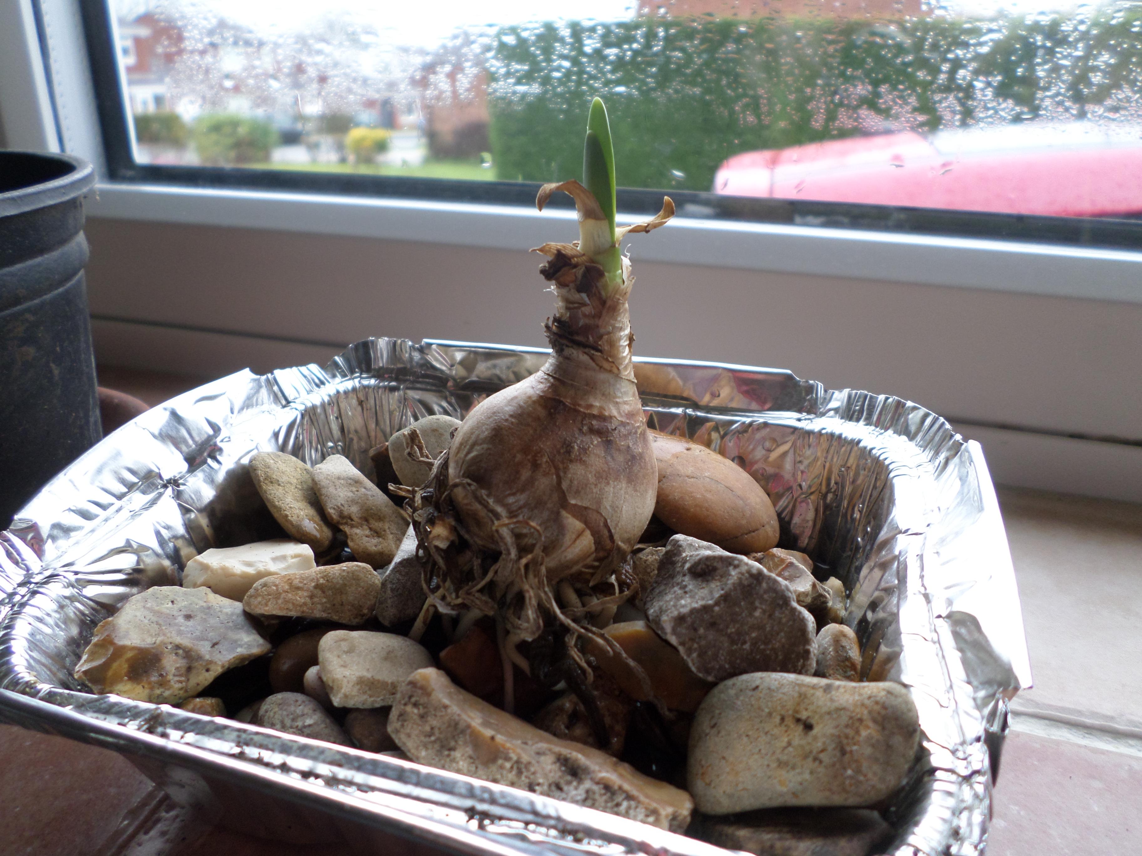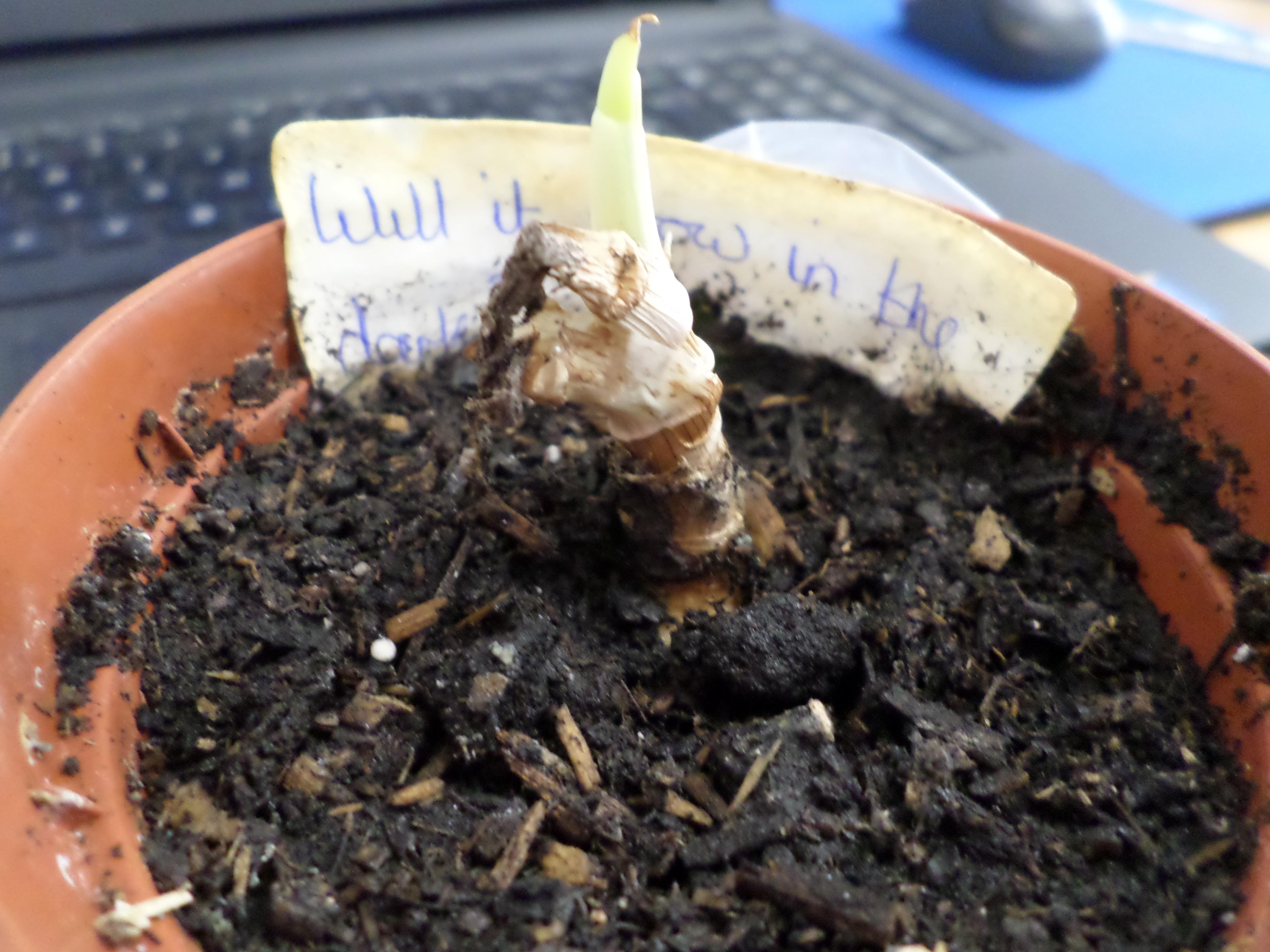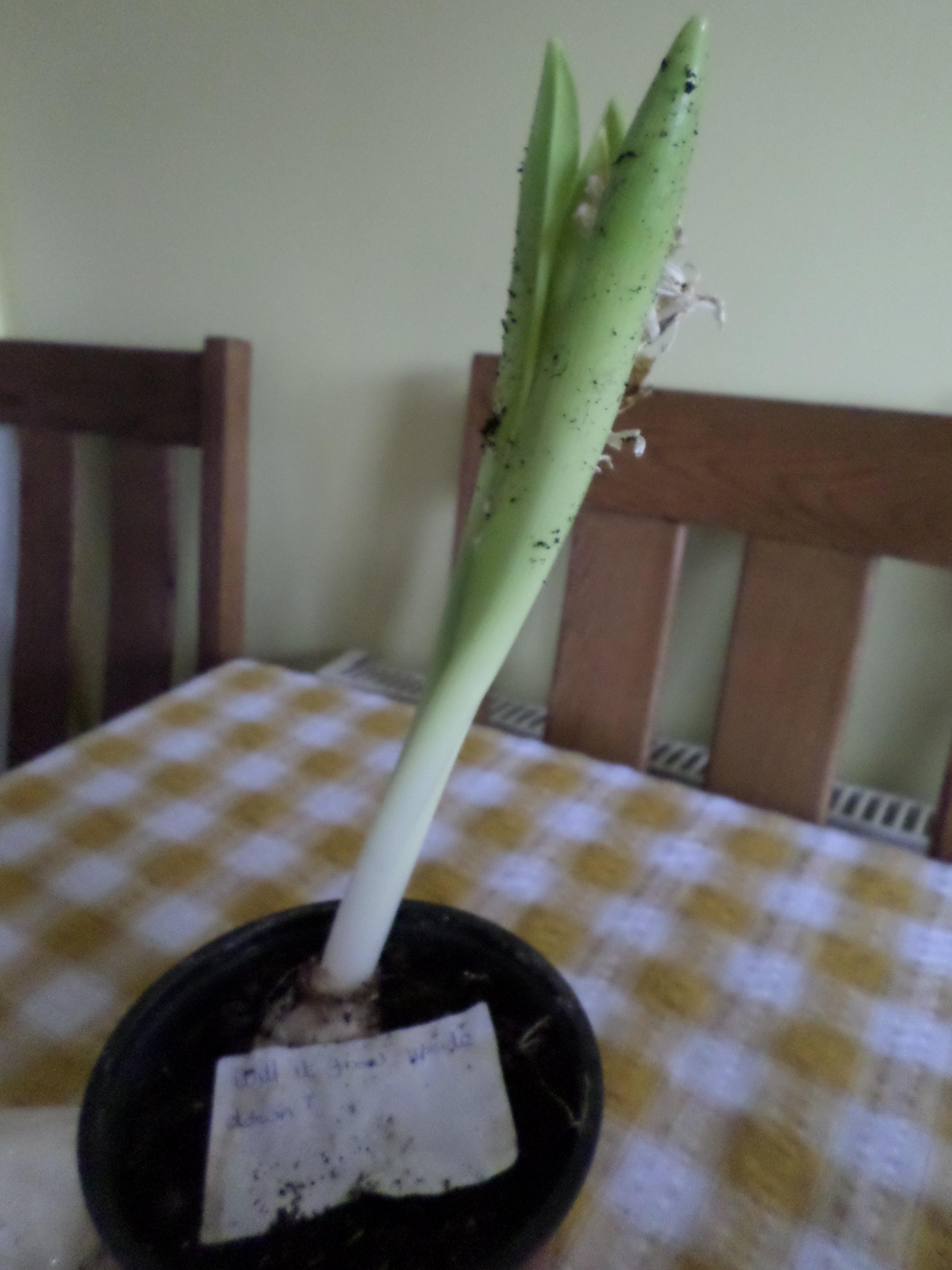 We dug up the bulb that we planted outside and found that is was beginning to grow, so we replanted it a bit nearer the surface to see if that changes anything.