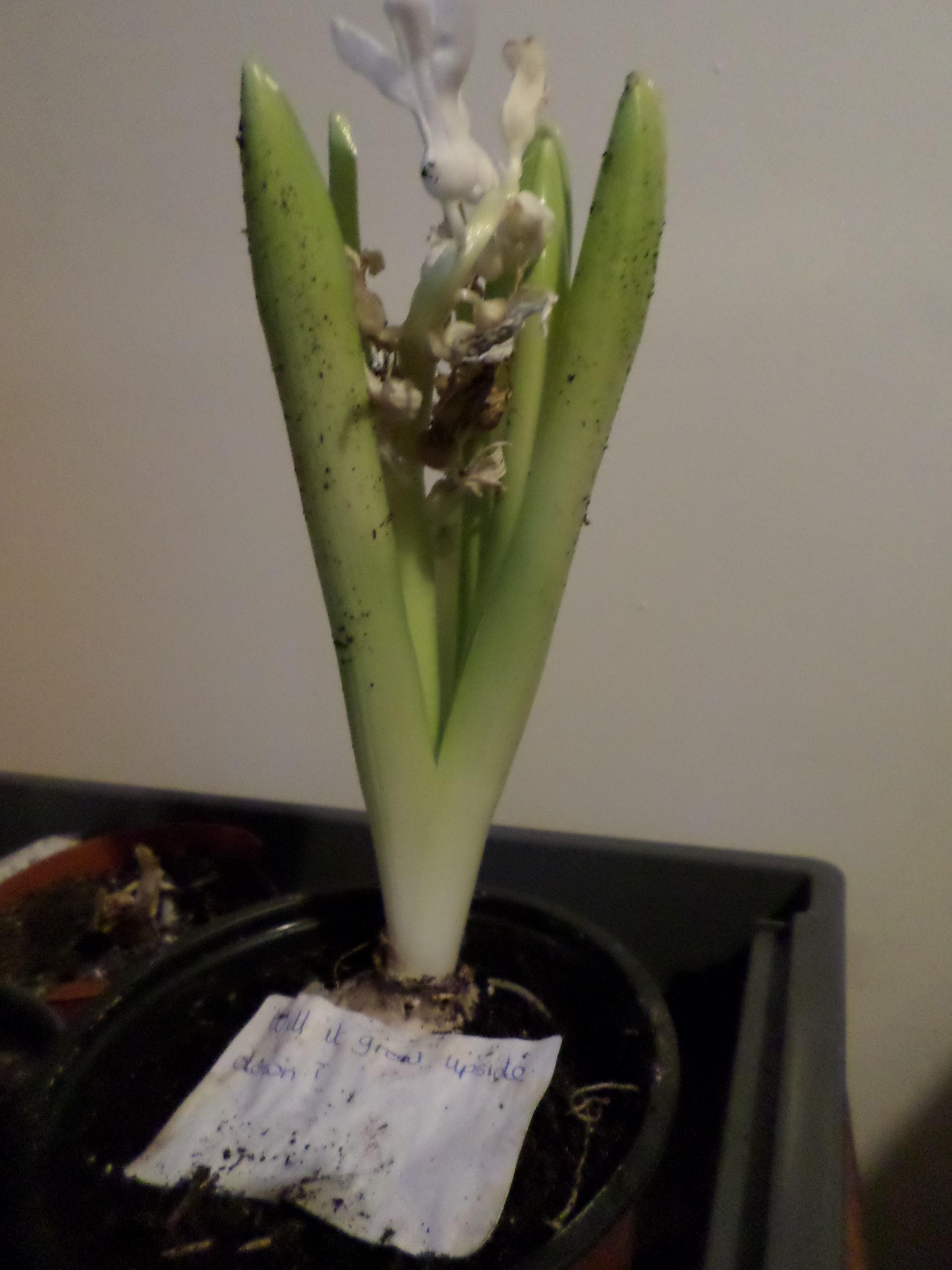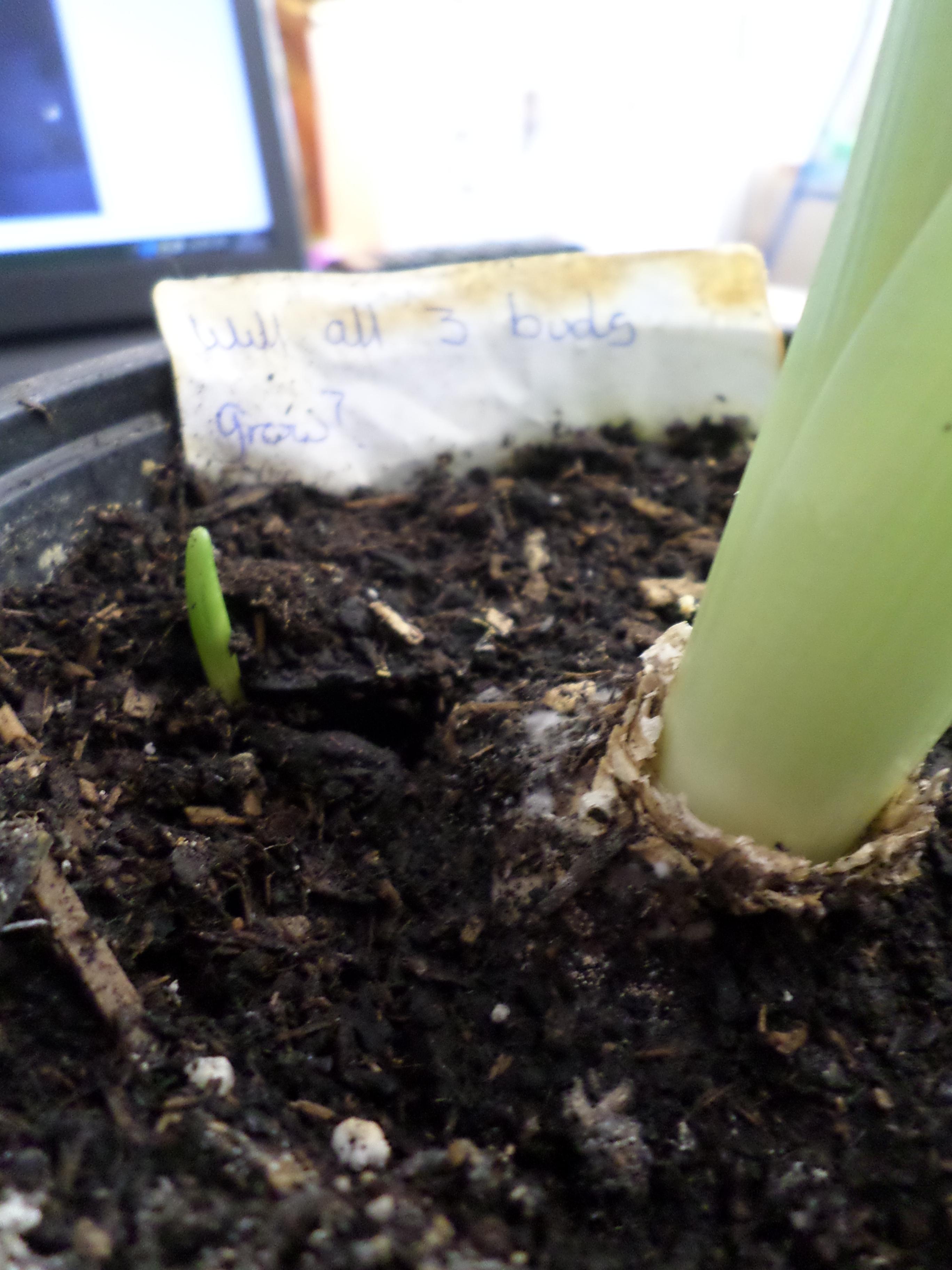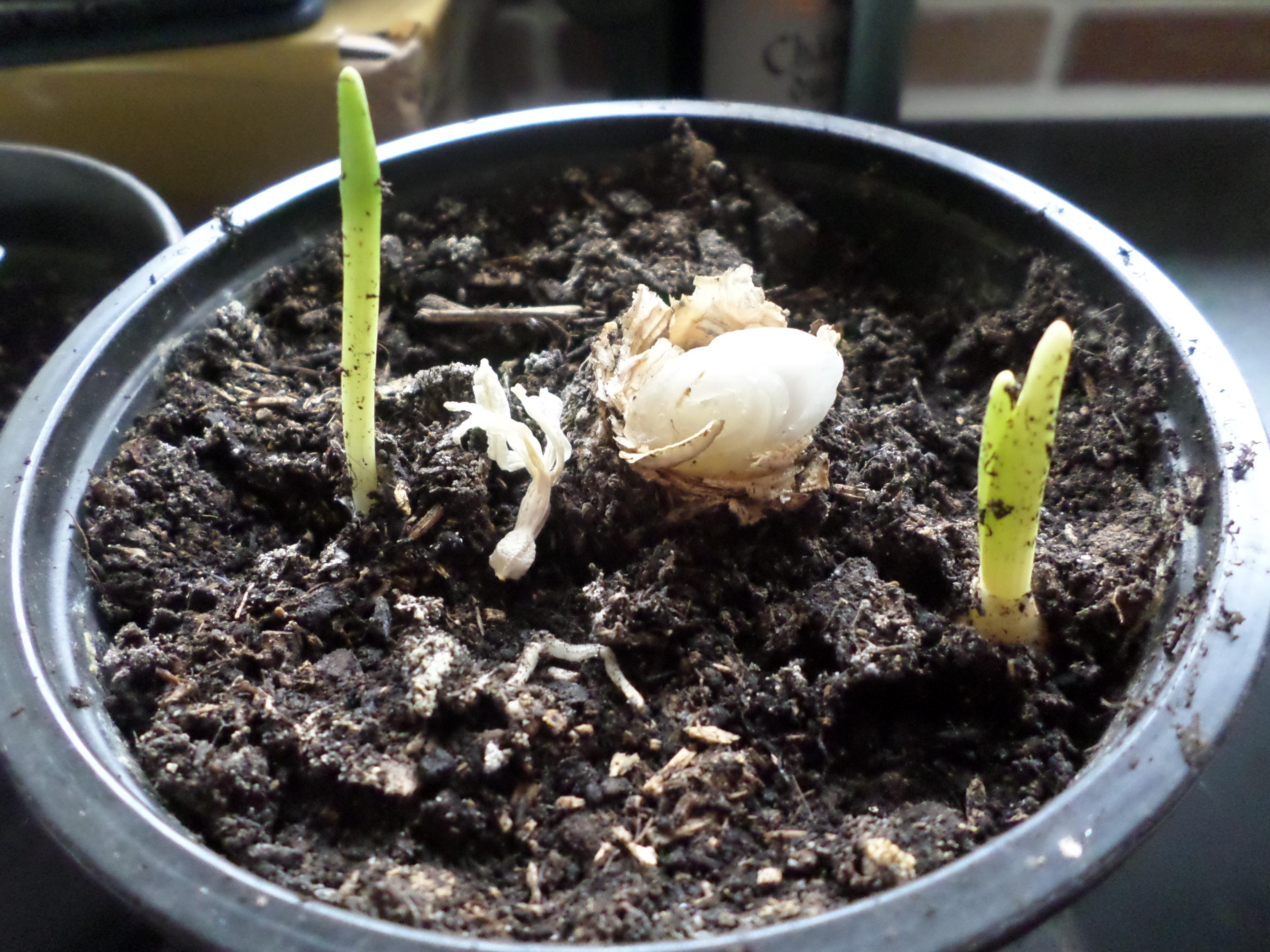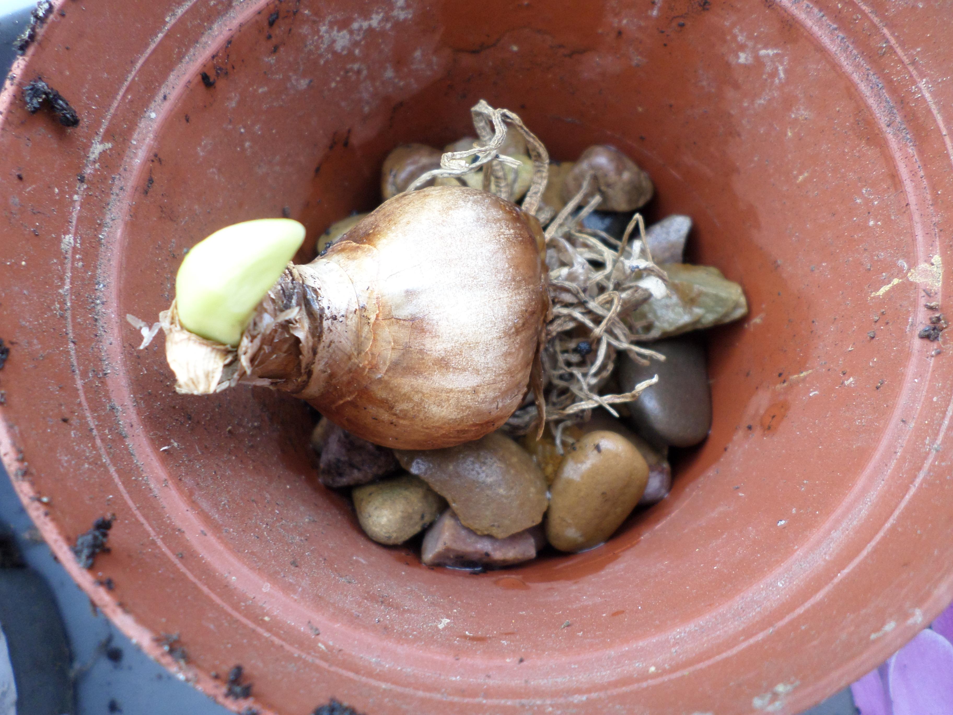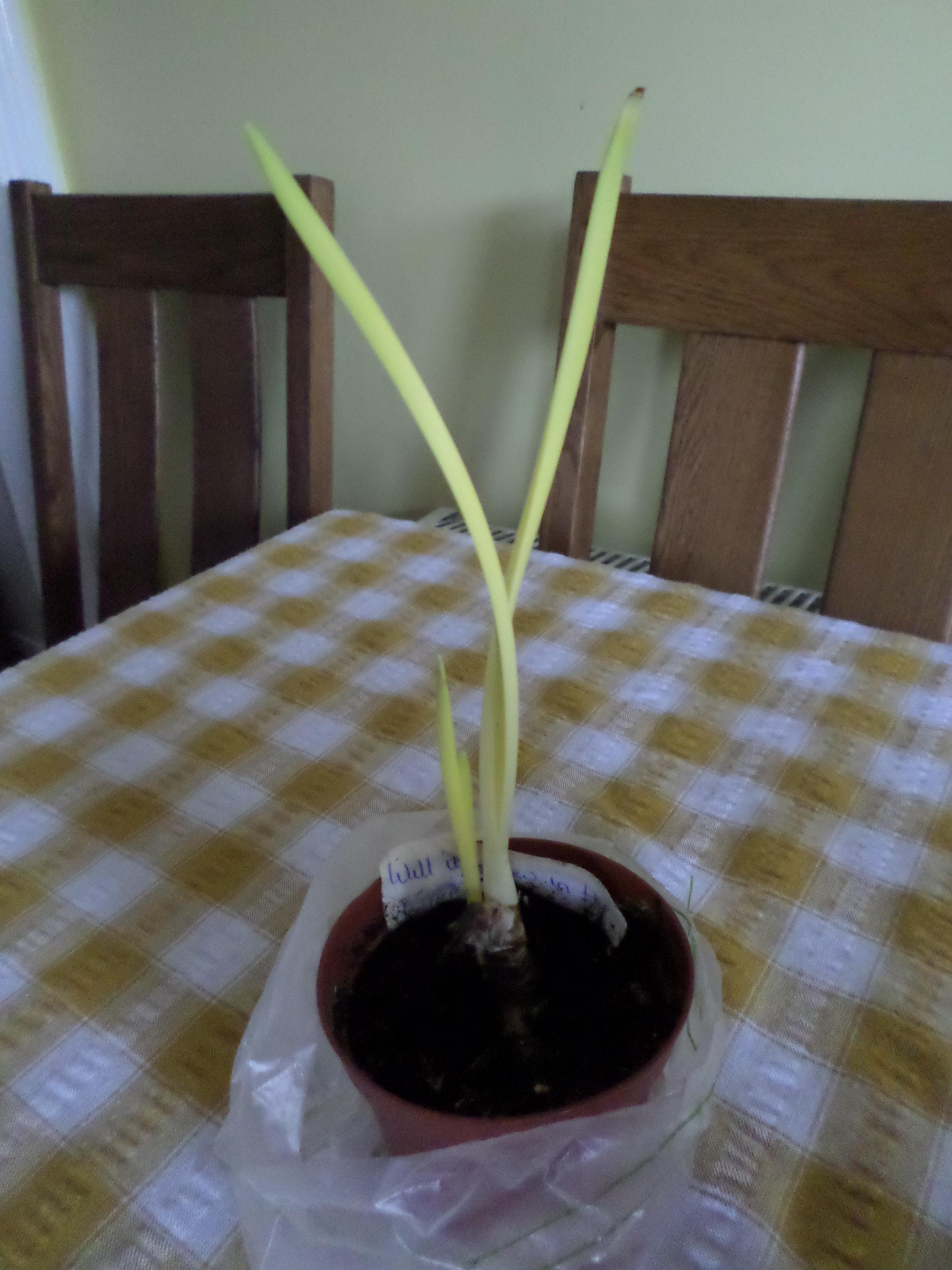We dug up the bulb that we planted outside and found that is was beginning to grow, so we replanted it a bit nearer the surface to see if that changes anything.