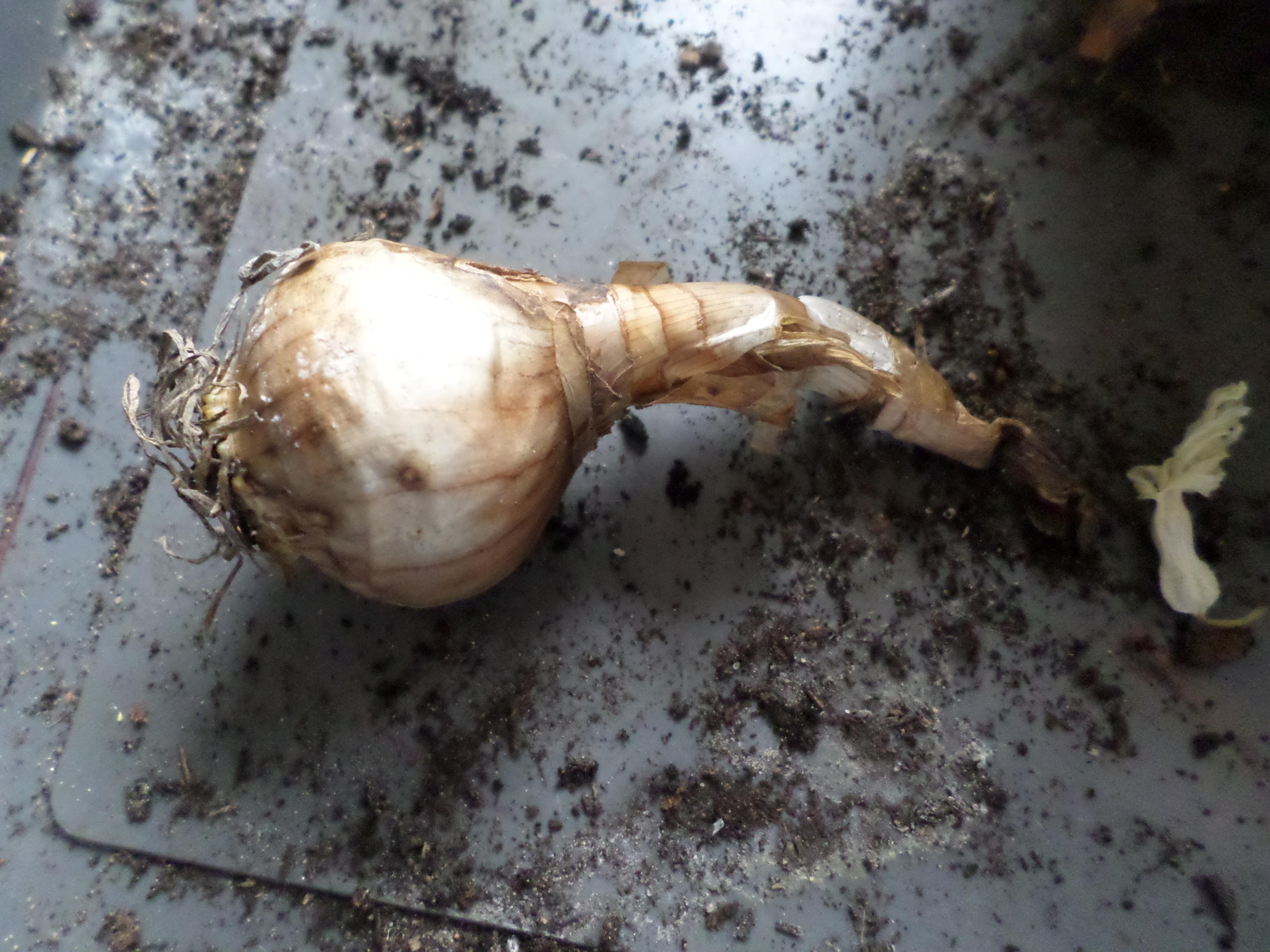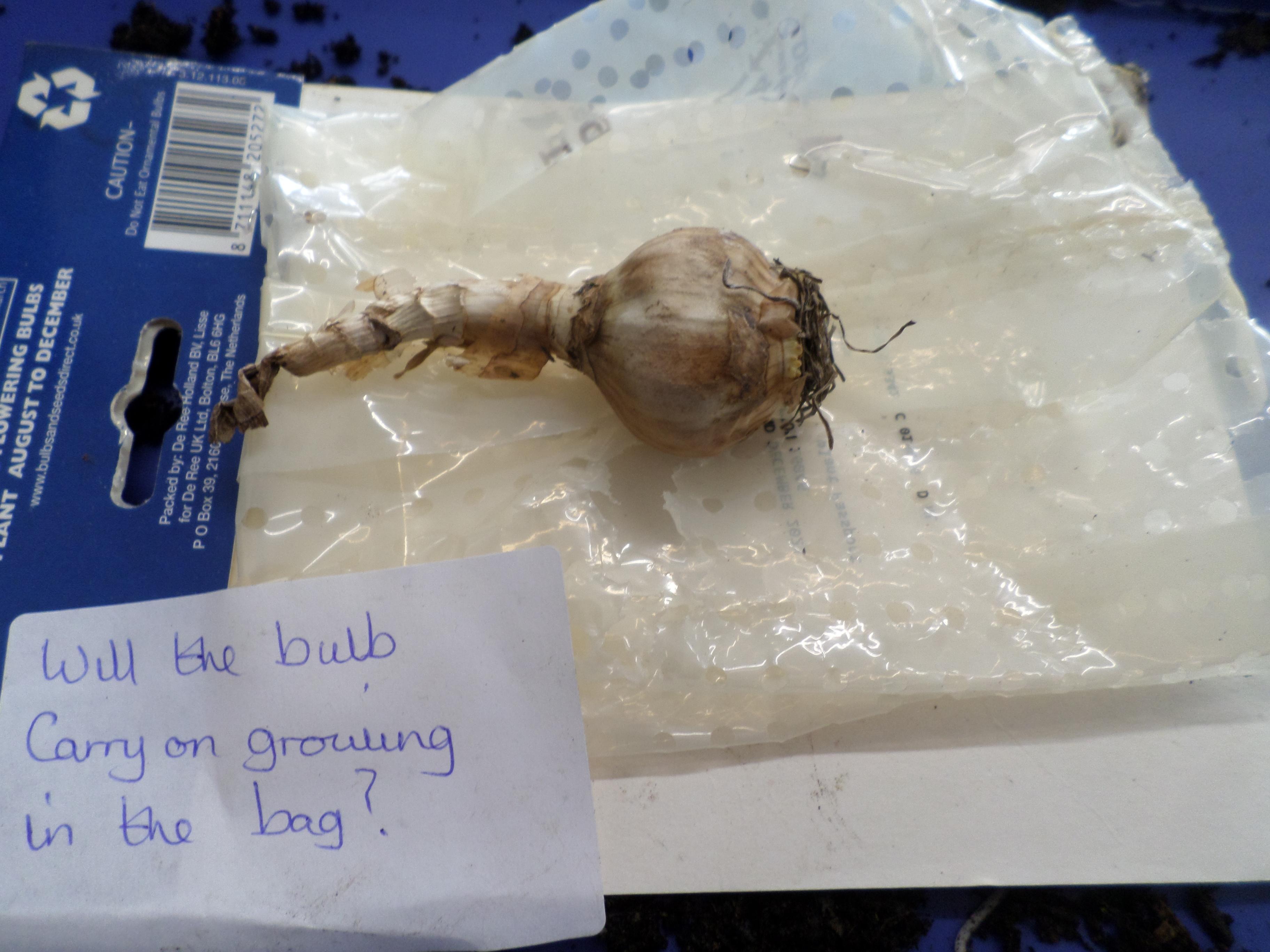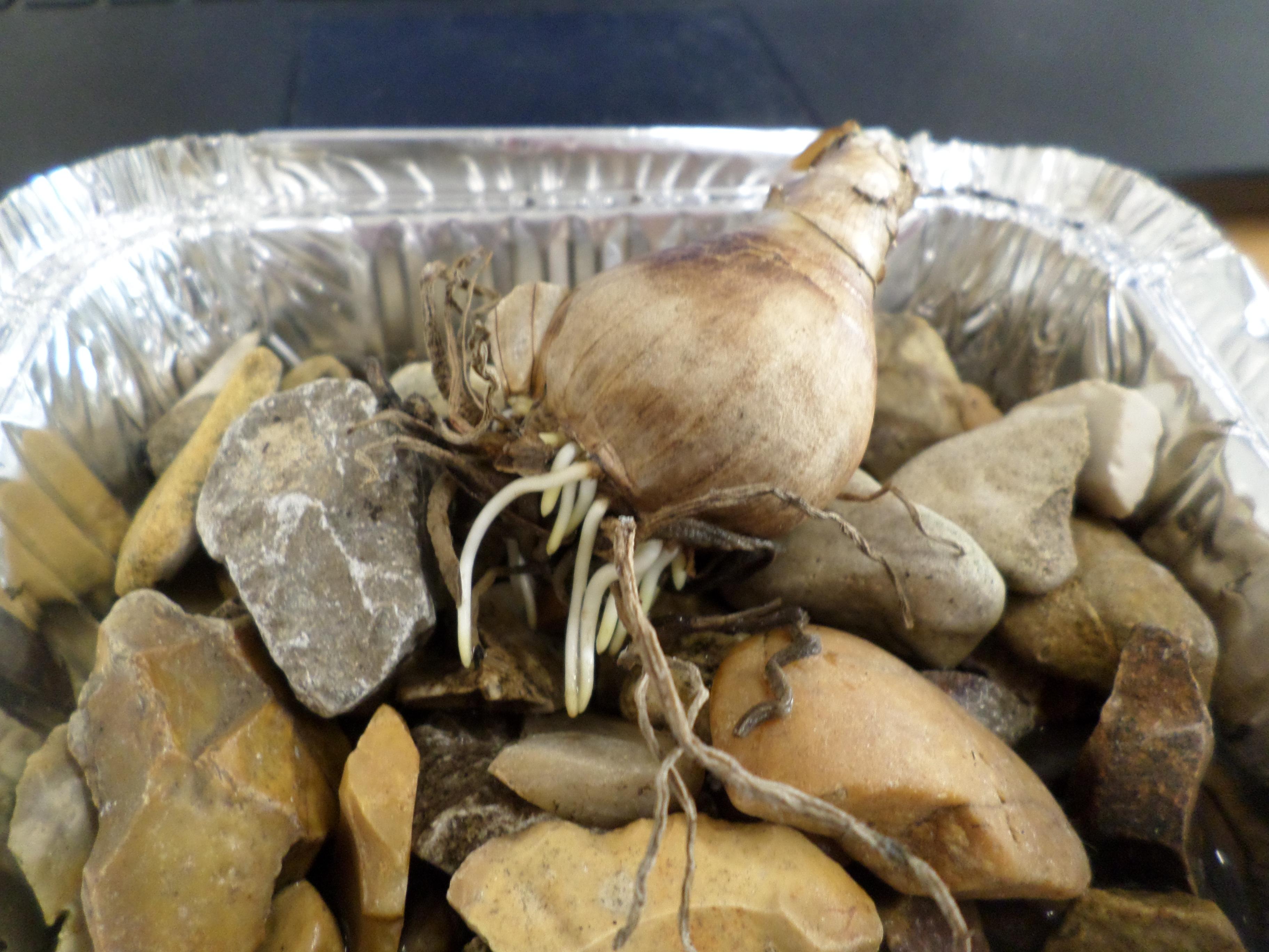 The bulb in the gravel has grown such long roots they have wrapped around the stones and it cannot be moved. It has a green shoot showing too.