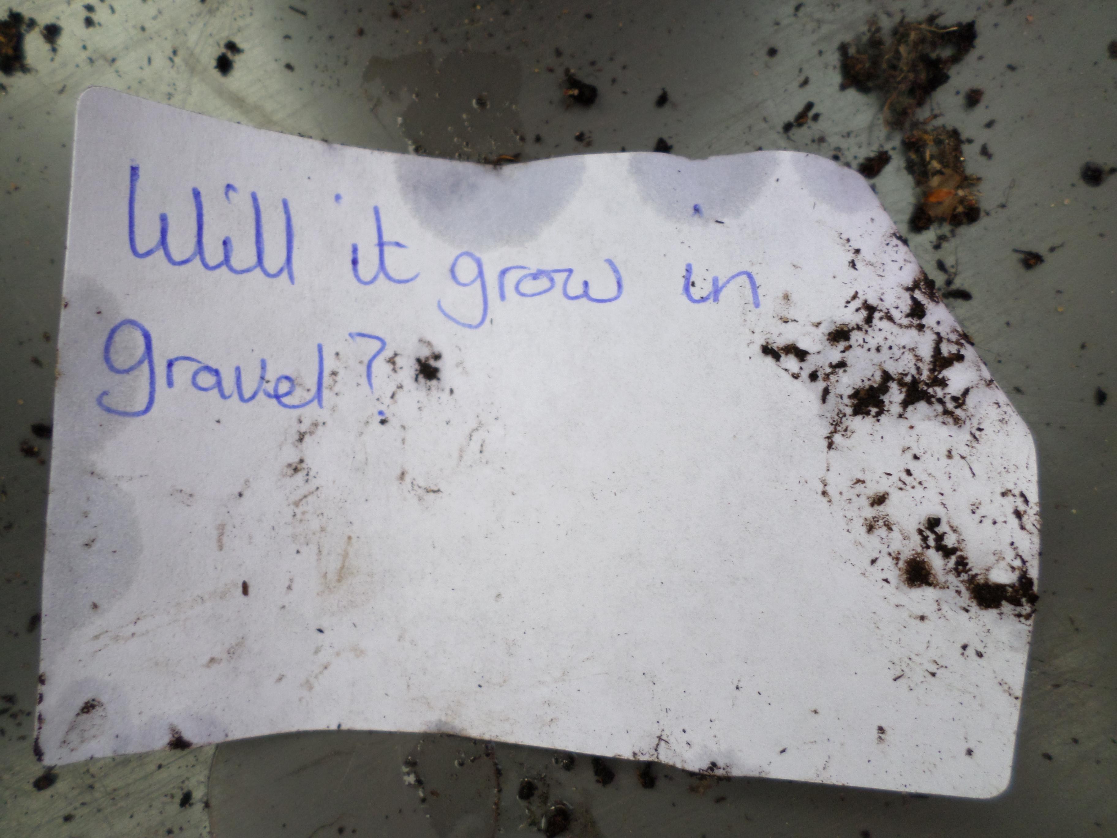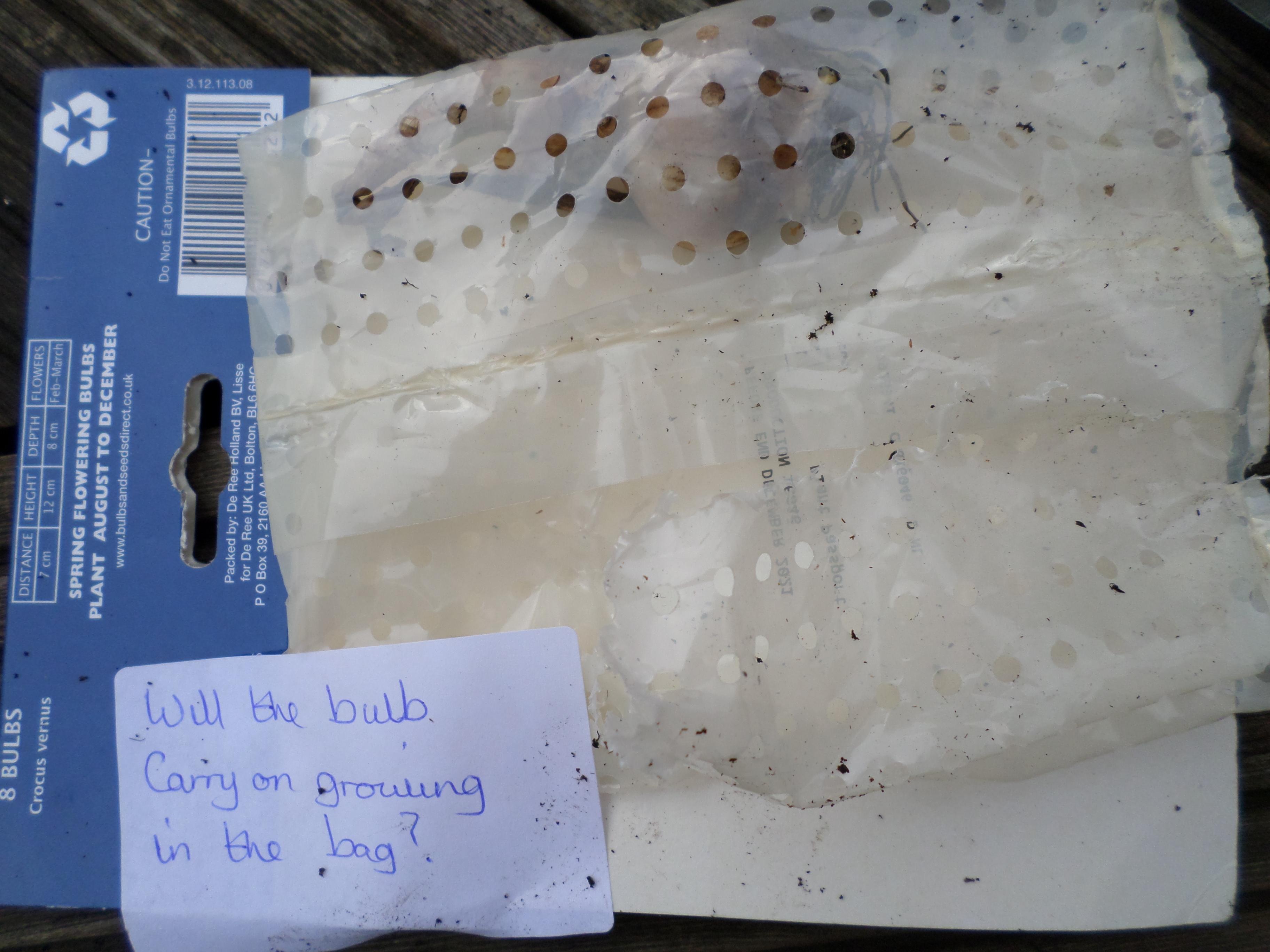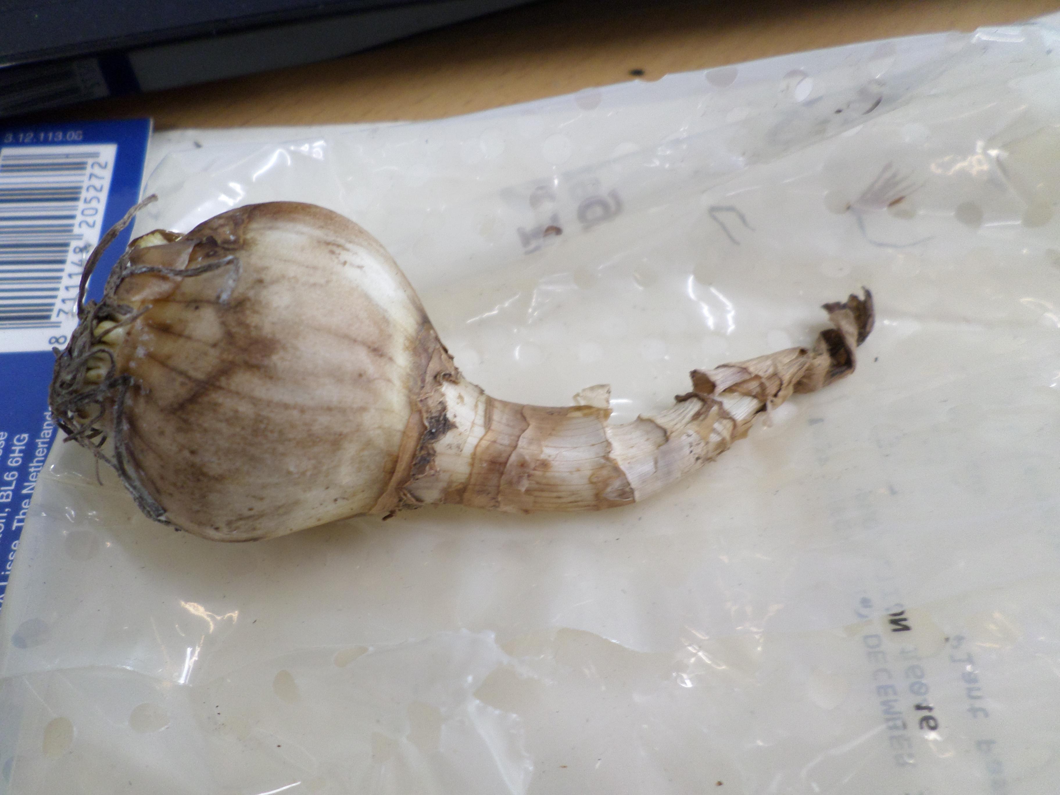 The bulb in the gravel has grown such long roots they have wrapped around the stones and it cannot be moved. It has a green shoot showing too.