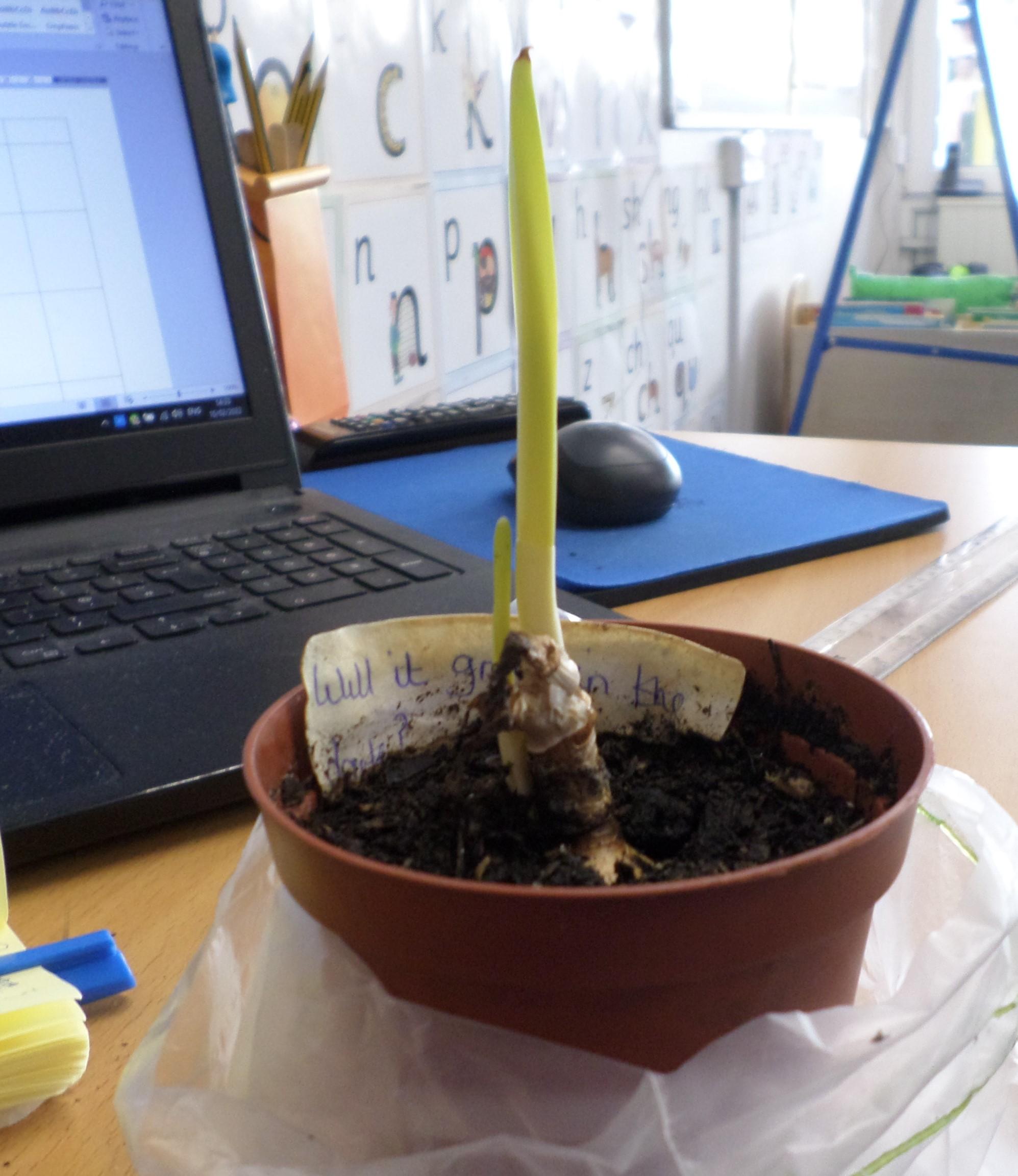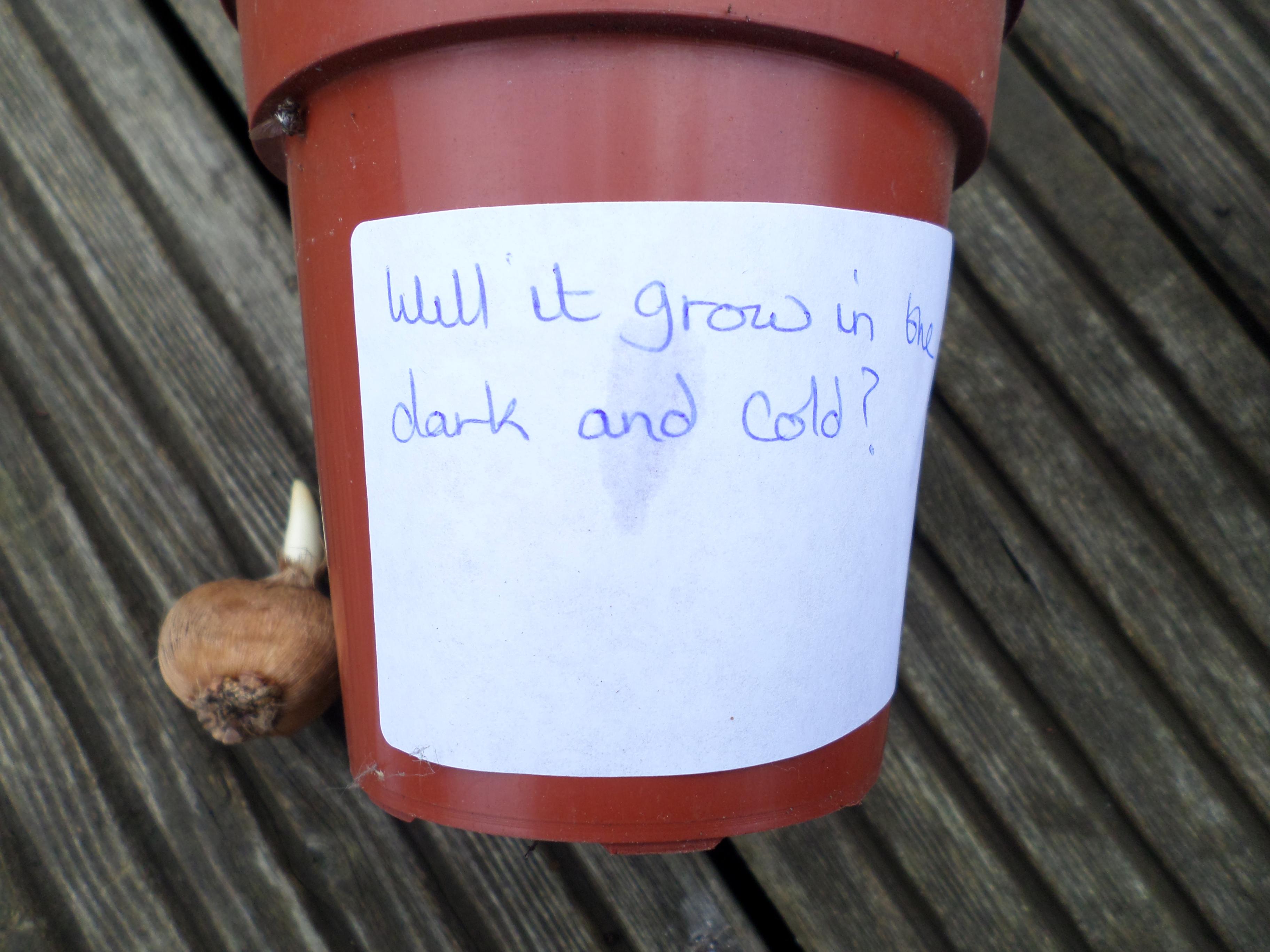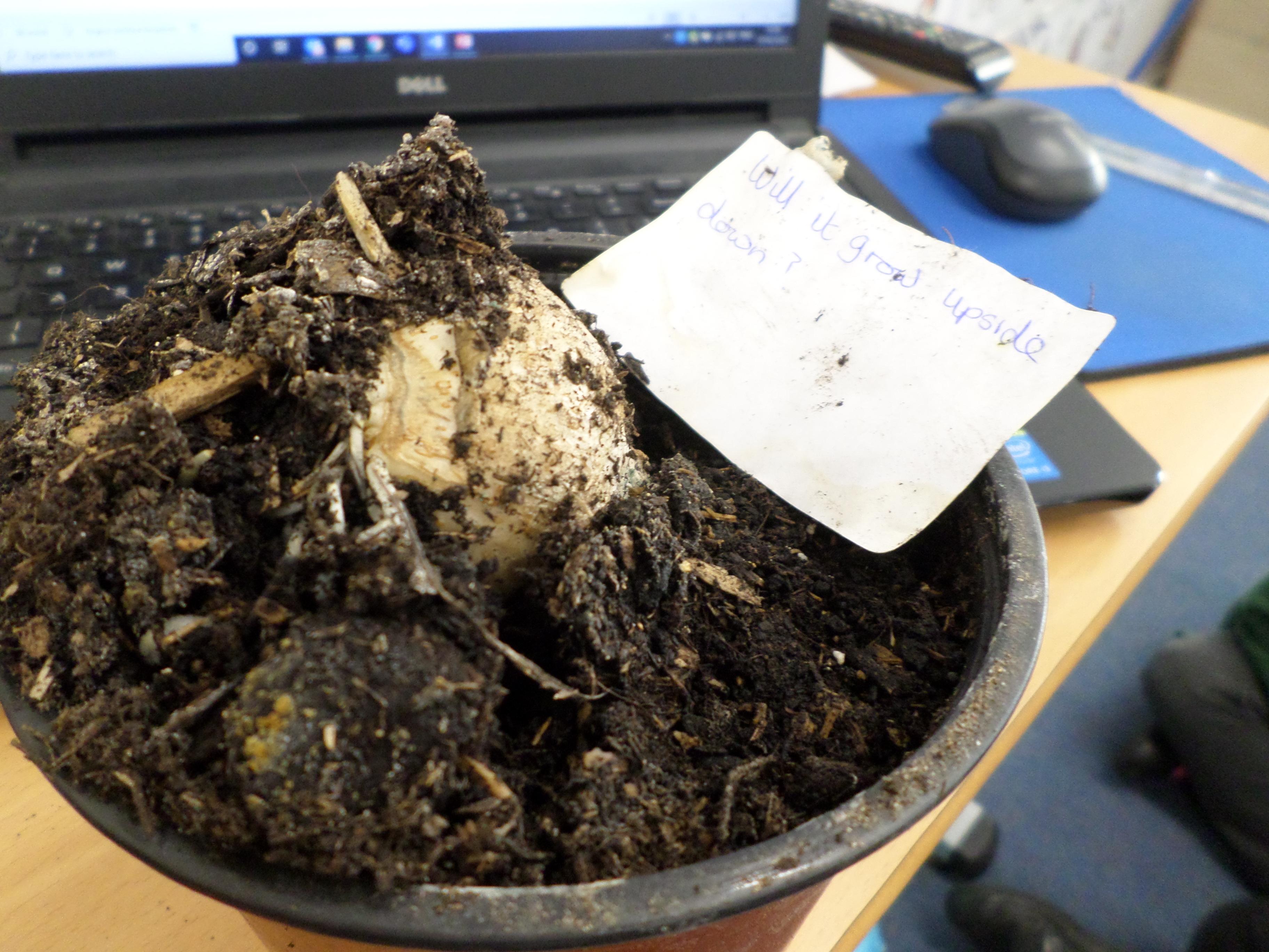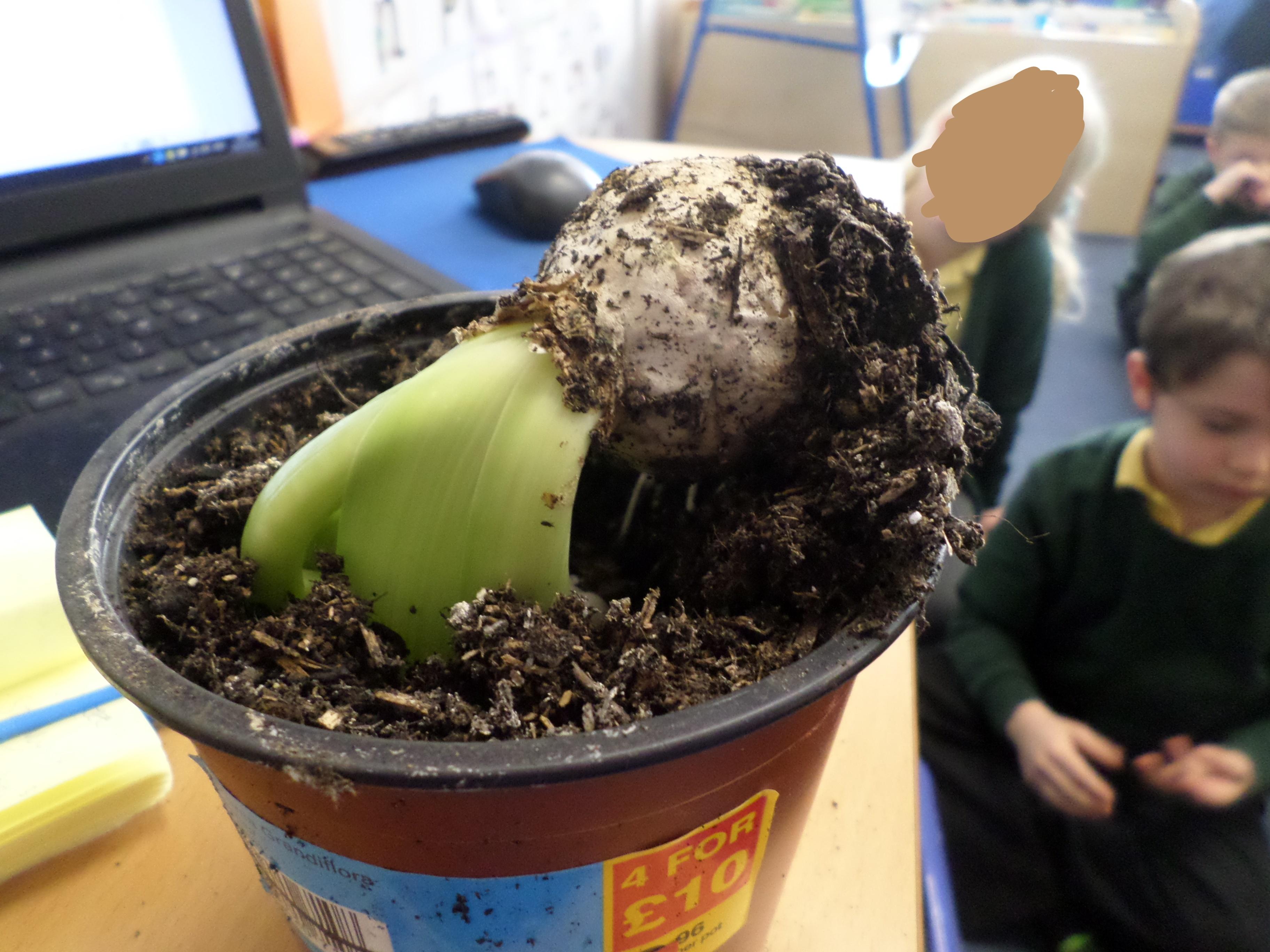 Take a look at our week 3 photos. Some are almost in flower! We are very excited about the upside down bulb which is showing signs of disturbing the soil quite dramatically. We are disappointed that there is no sign from the bulb outside yet.