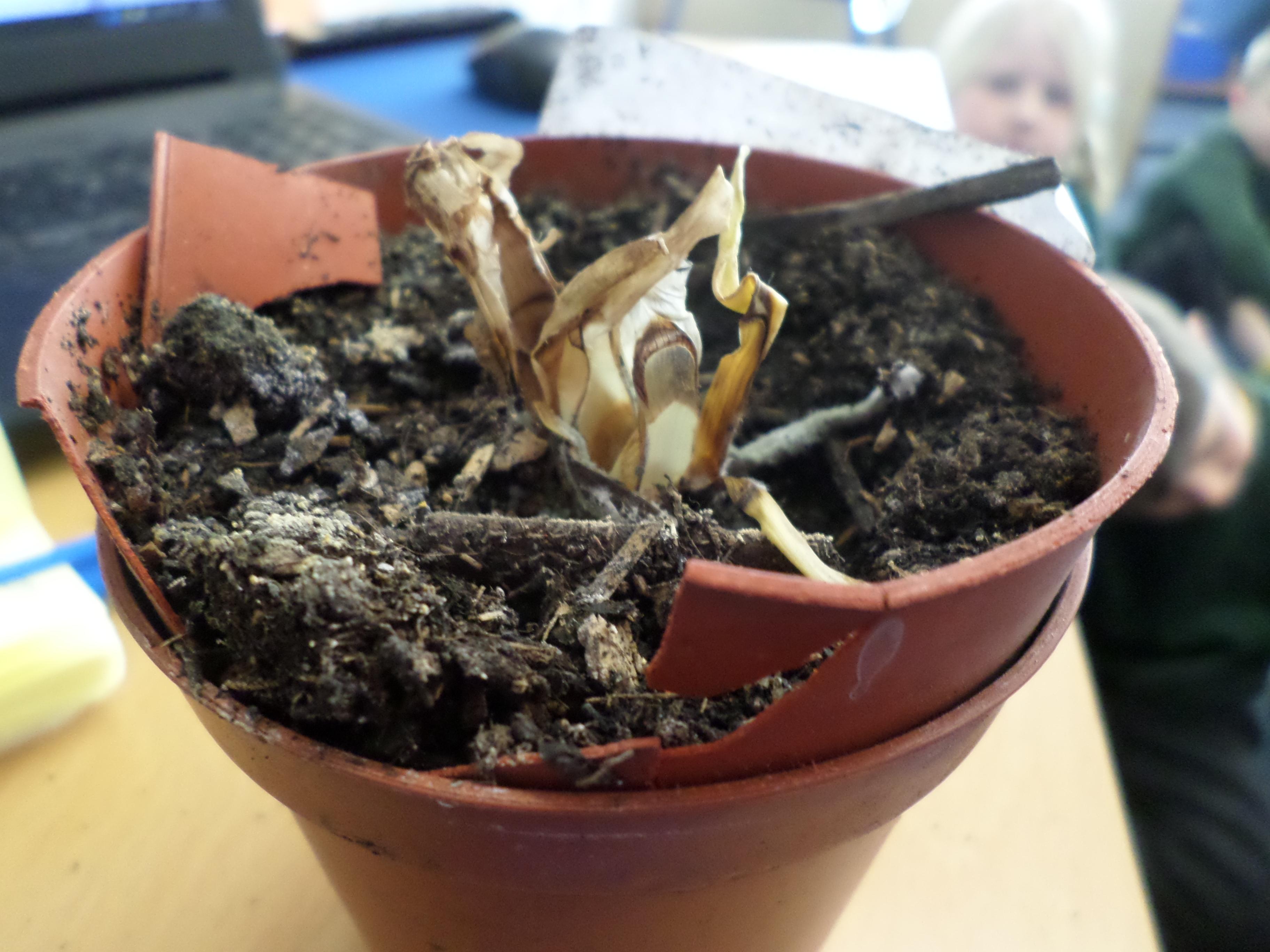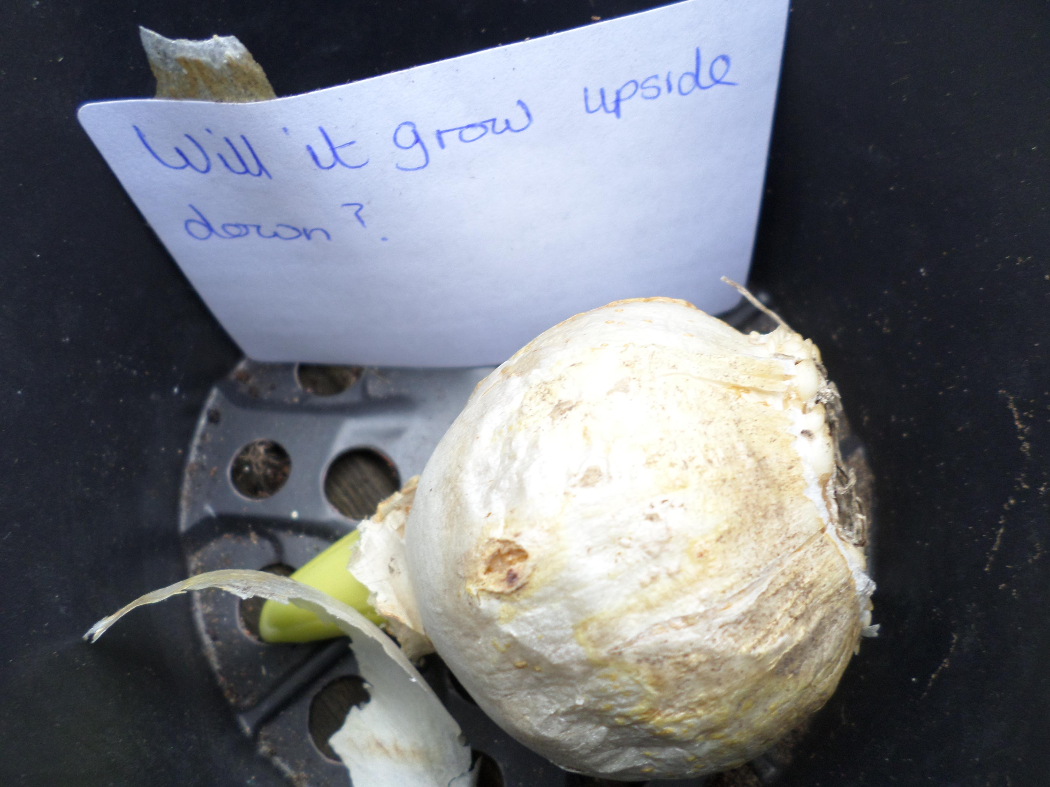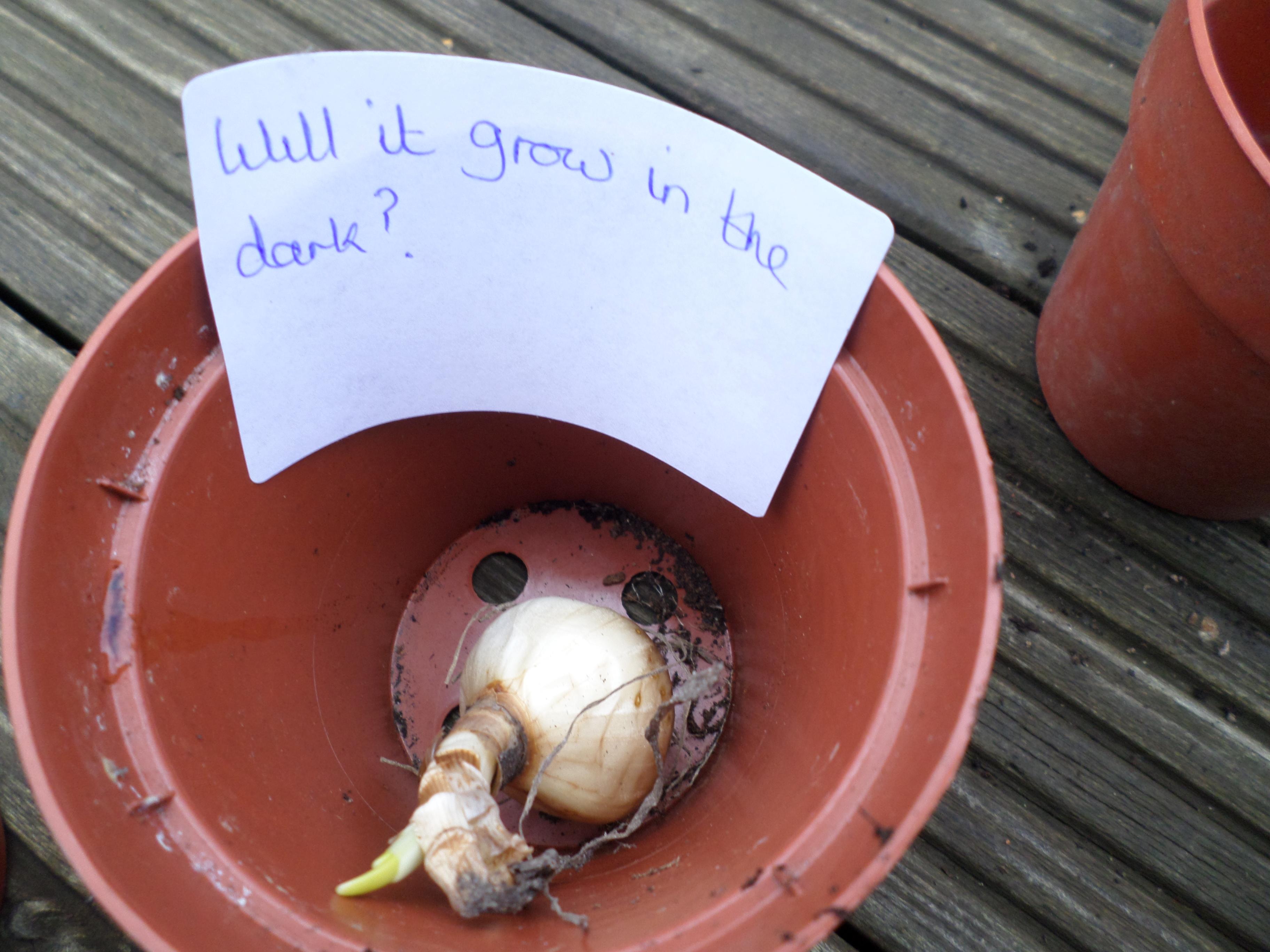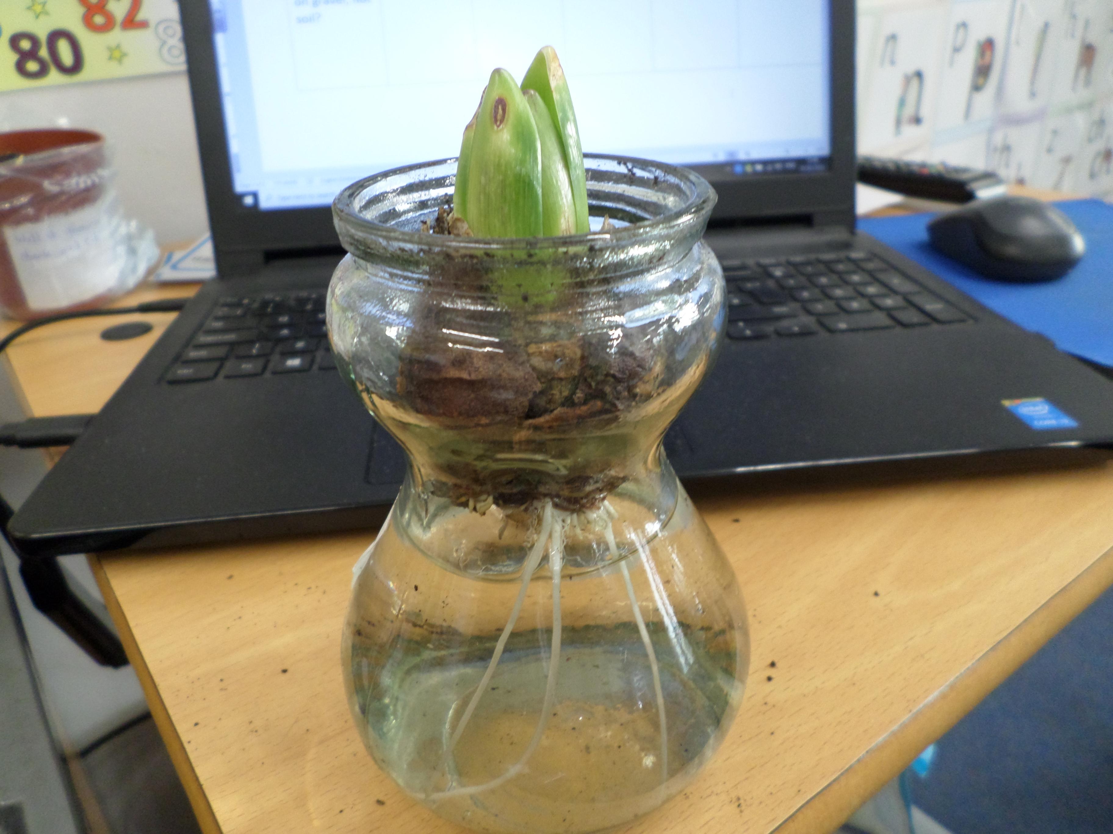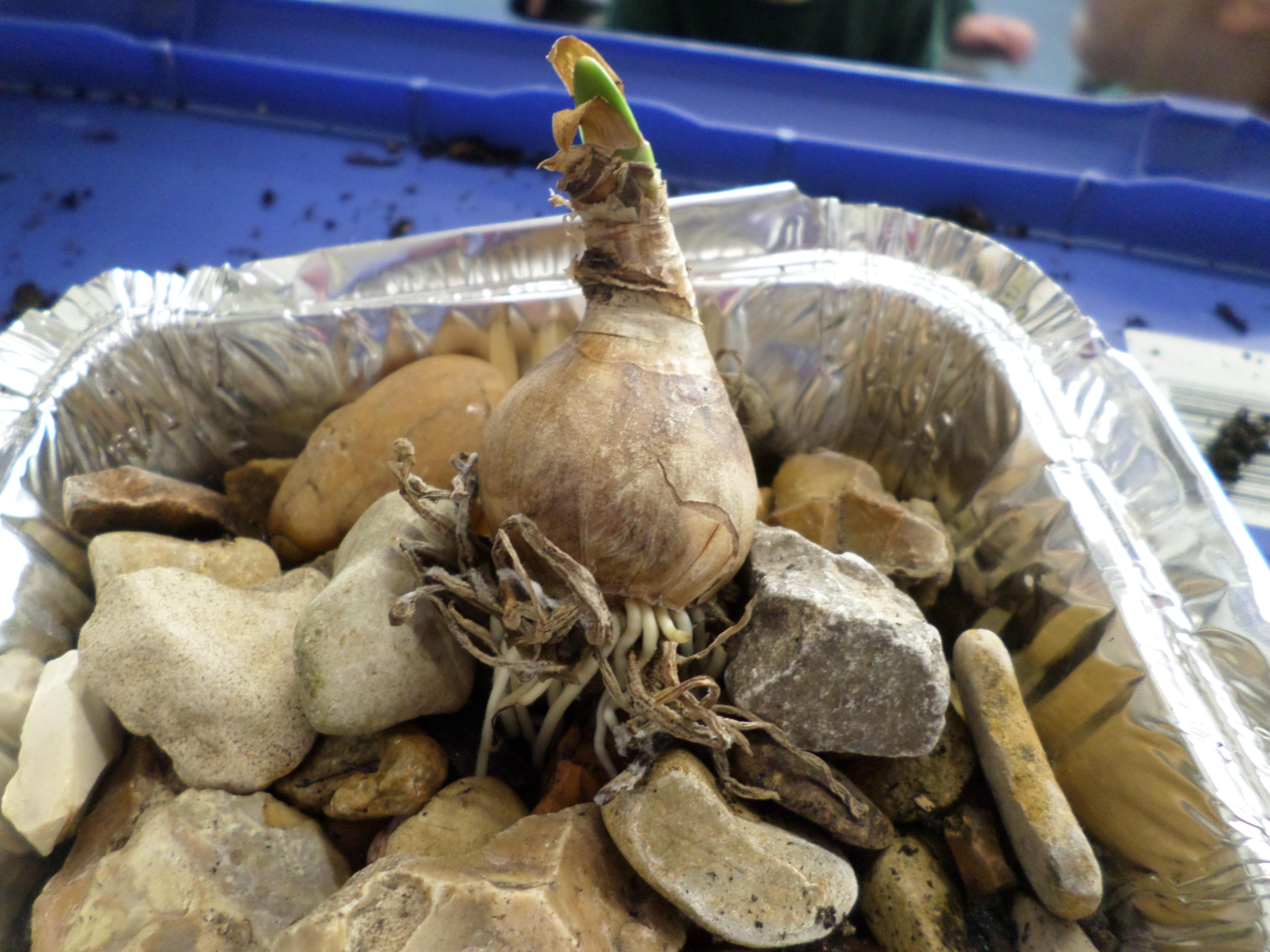 Take a look at our week 3 photos. Some are almost in flower! We are very excited about the upside down bulb which is showing signs of disturbing the soil quite dramatically. We are disappointed that there is no sign from the bulb outside yet.