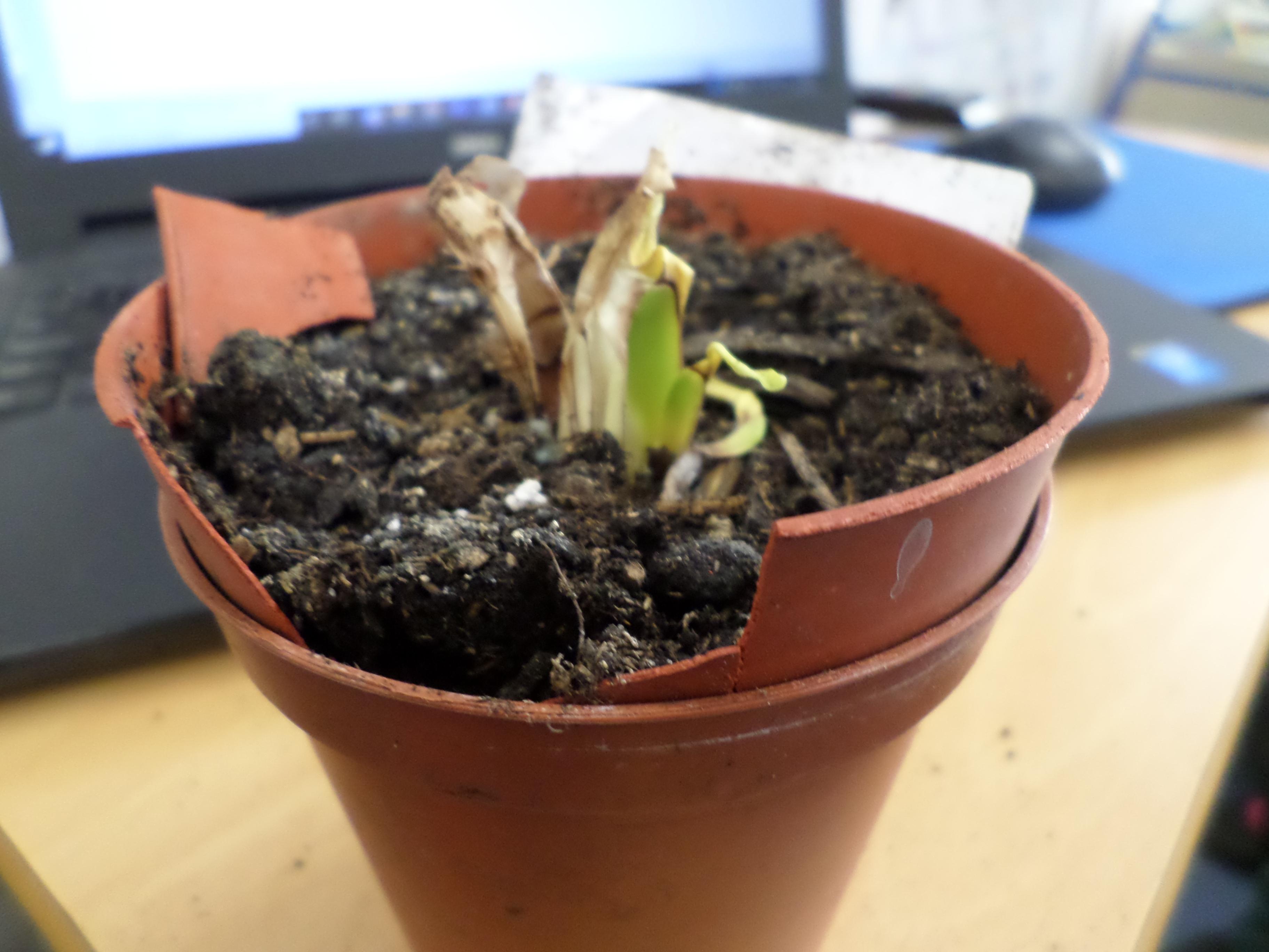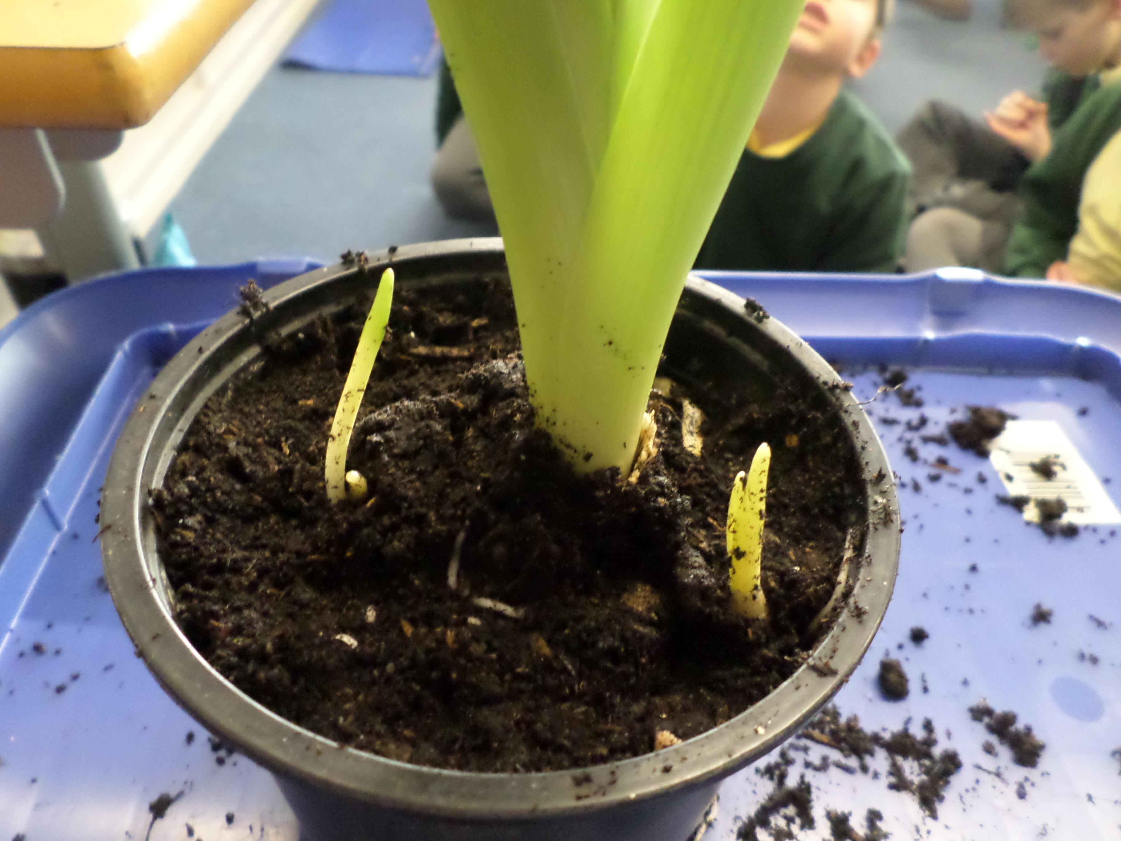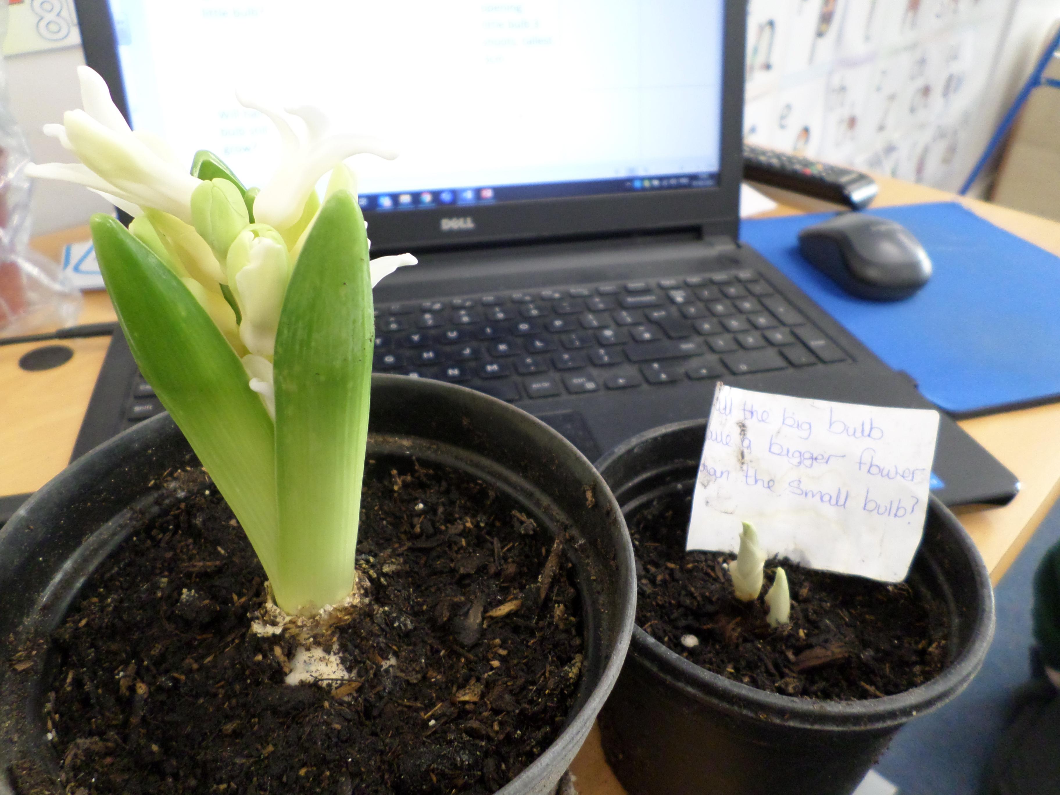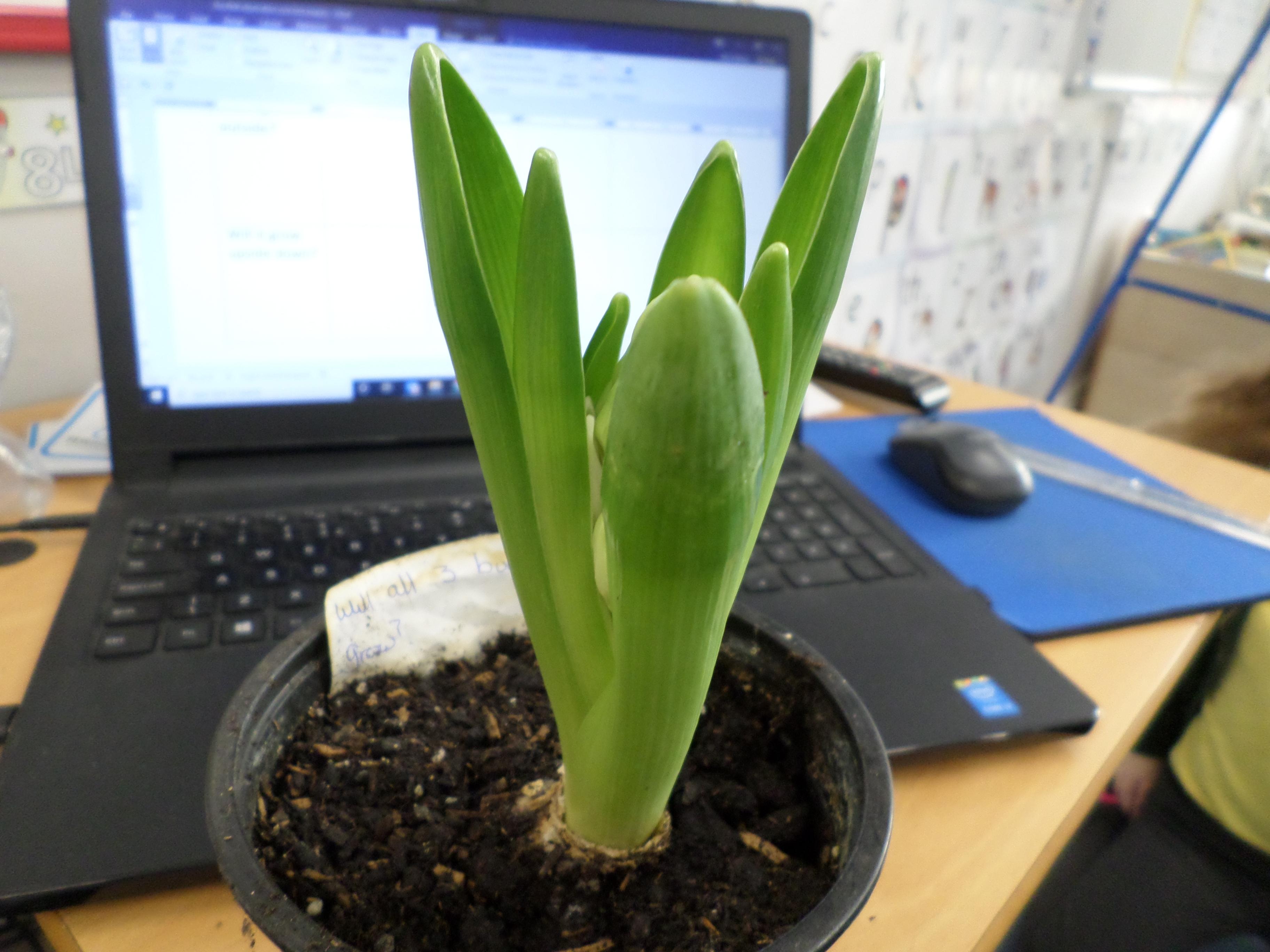 Take a look at our week 3 photos. Some are almost in flower! We are very excited about the upside down bulb which is showing signs of disturbing the soil quite dramatically. We are disappointed that there is no sign from the bulb outside yet.