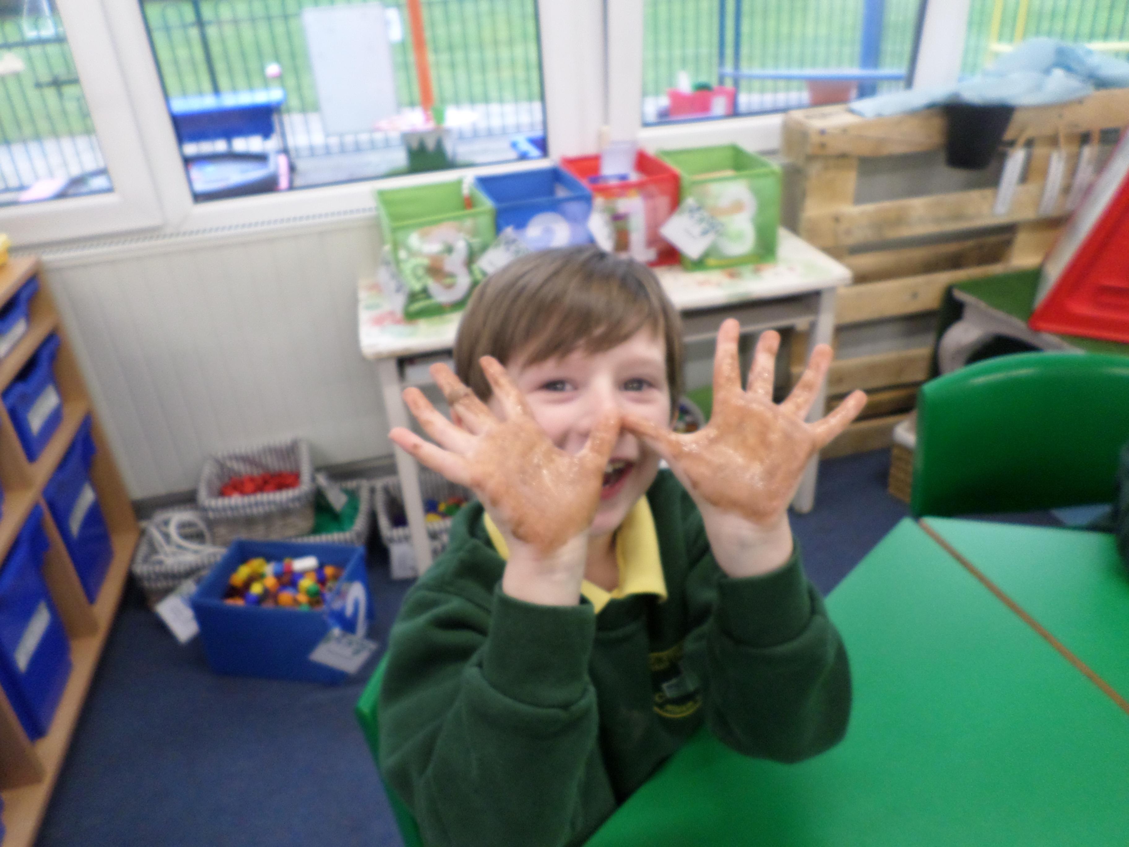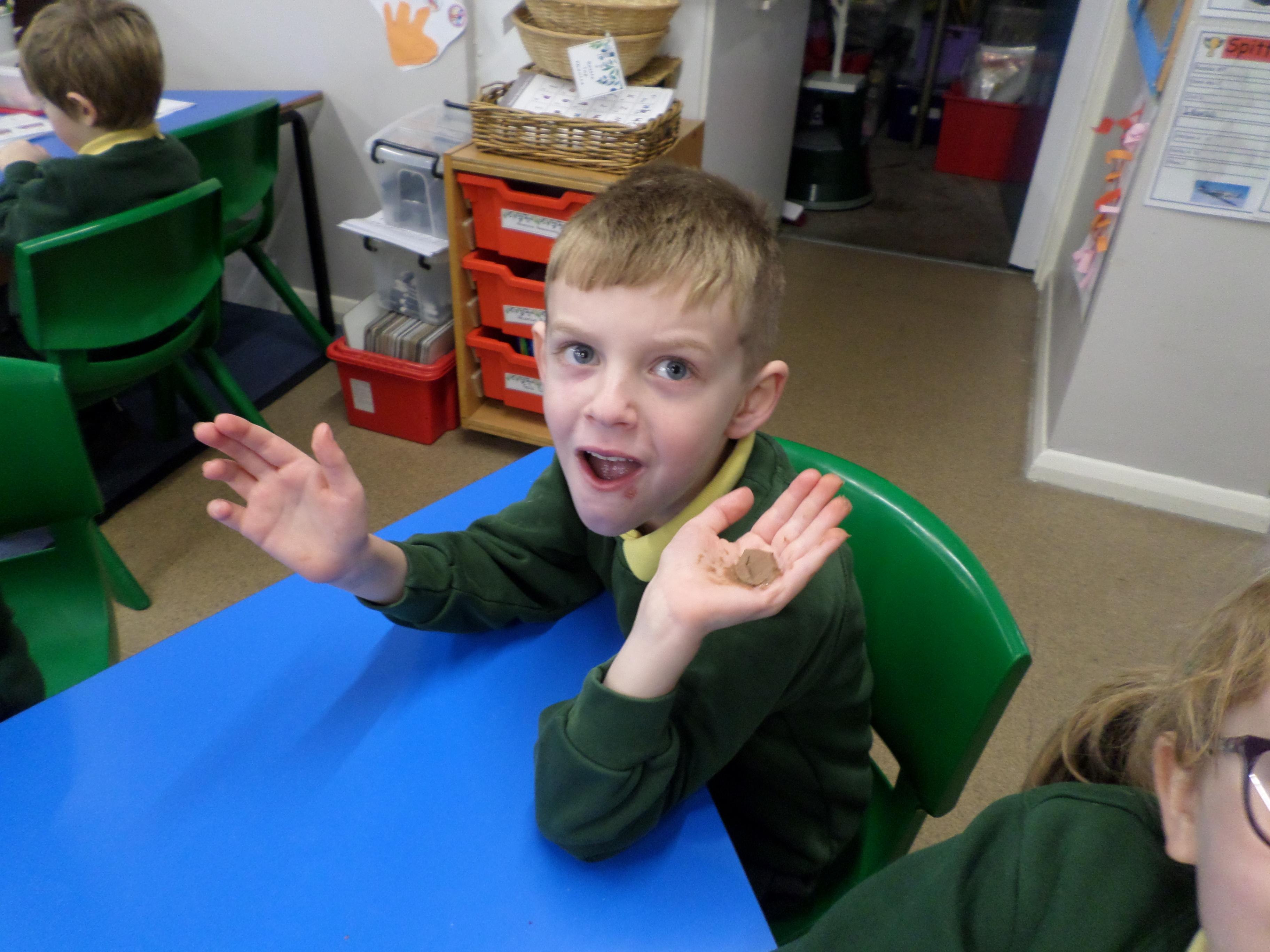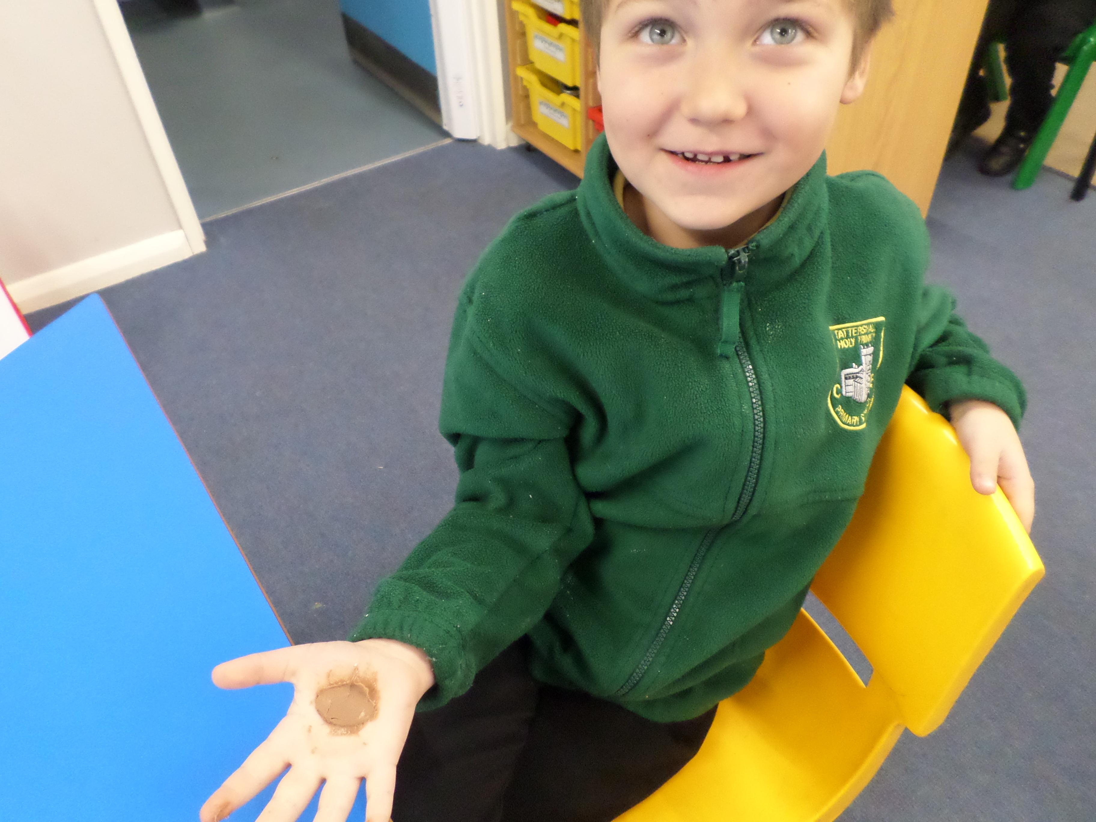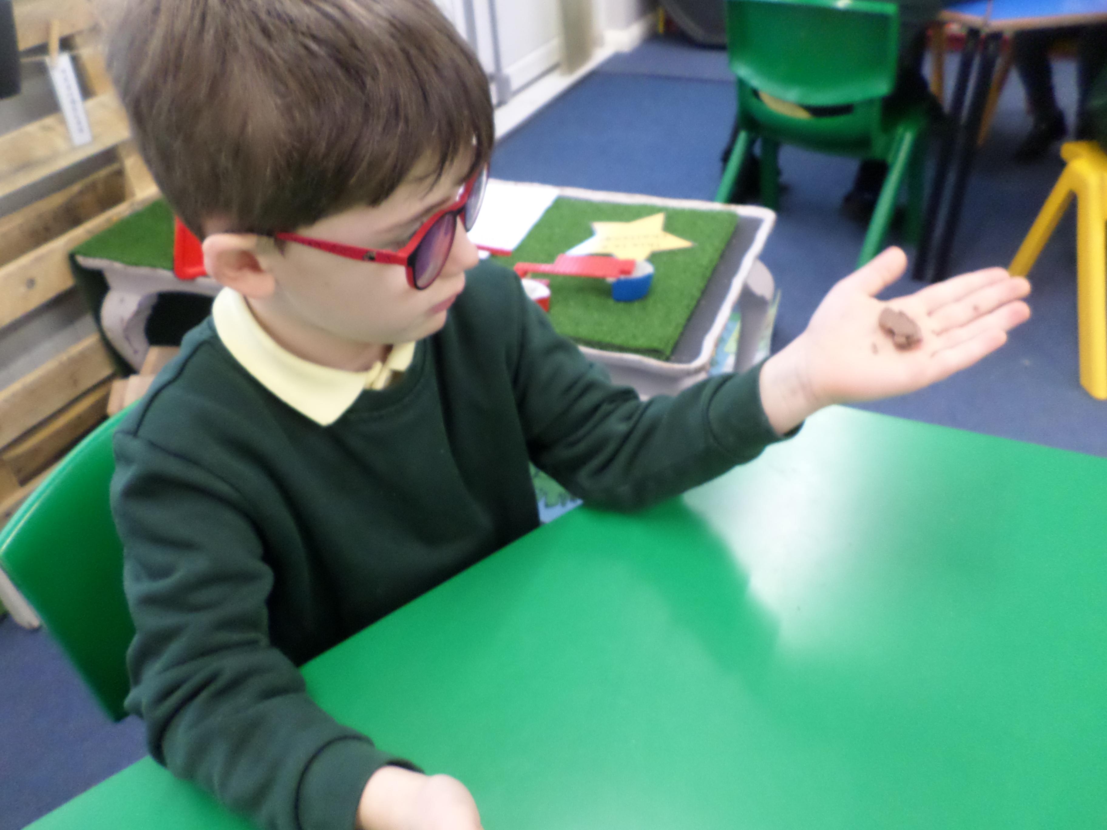 We discussed how a material can change when it is heated. They gave examples such as ice melts, snow melts, candles melt but cookie mixture becomes harder. Each child held a chocolate button in their hand tightly to help us experience what happened to Naughty Nora. We thought of different words to describe what happens when chocolate is heated and the children said that the chocolate had become: runny, soft, a liquid, sticky, squidgy, to name but a few.