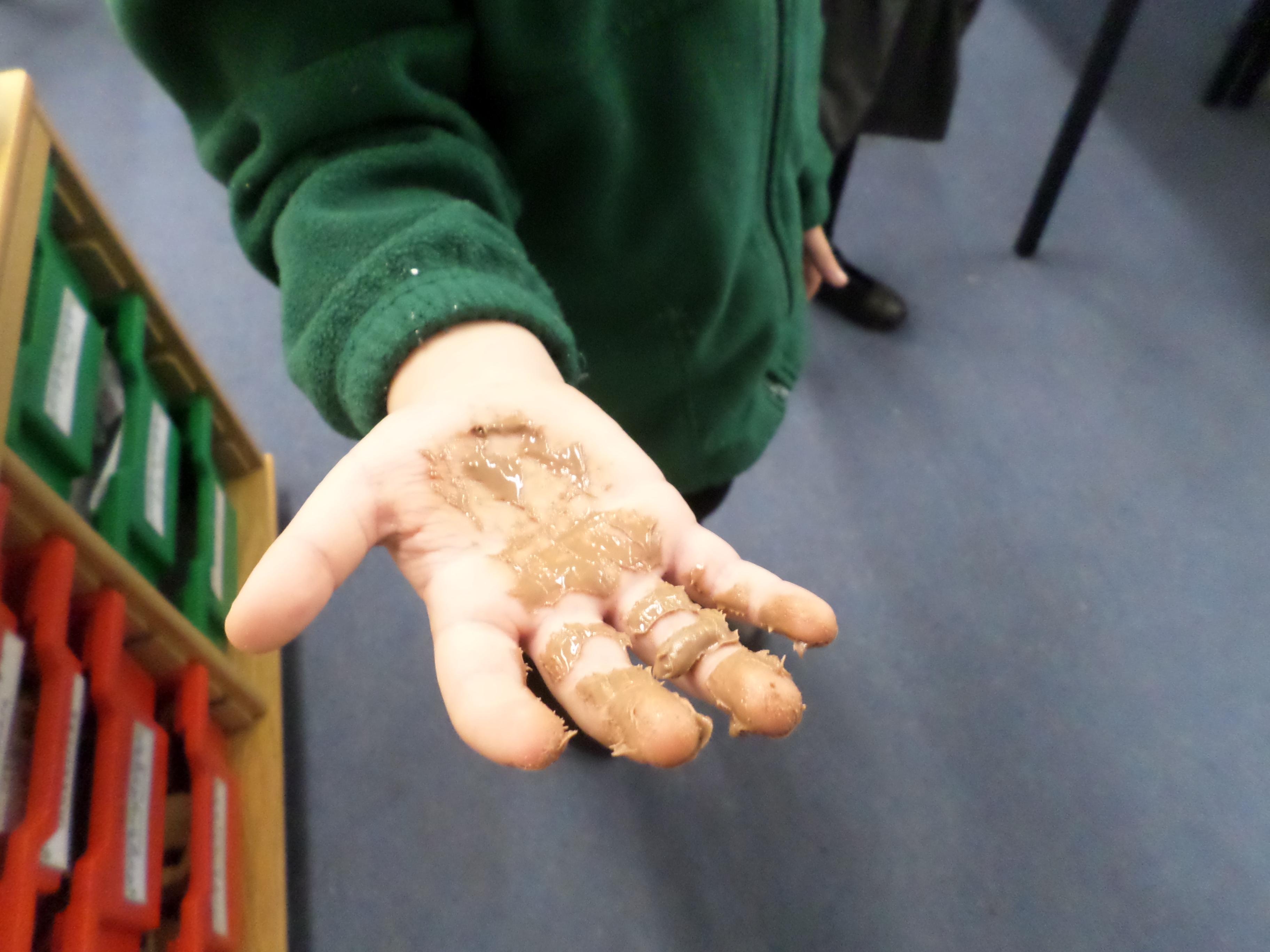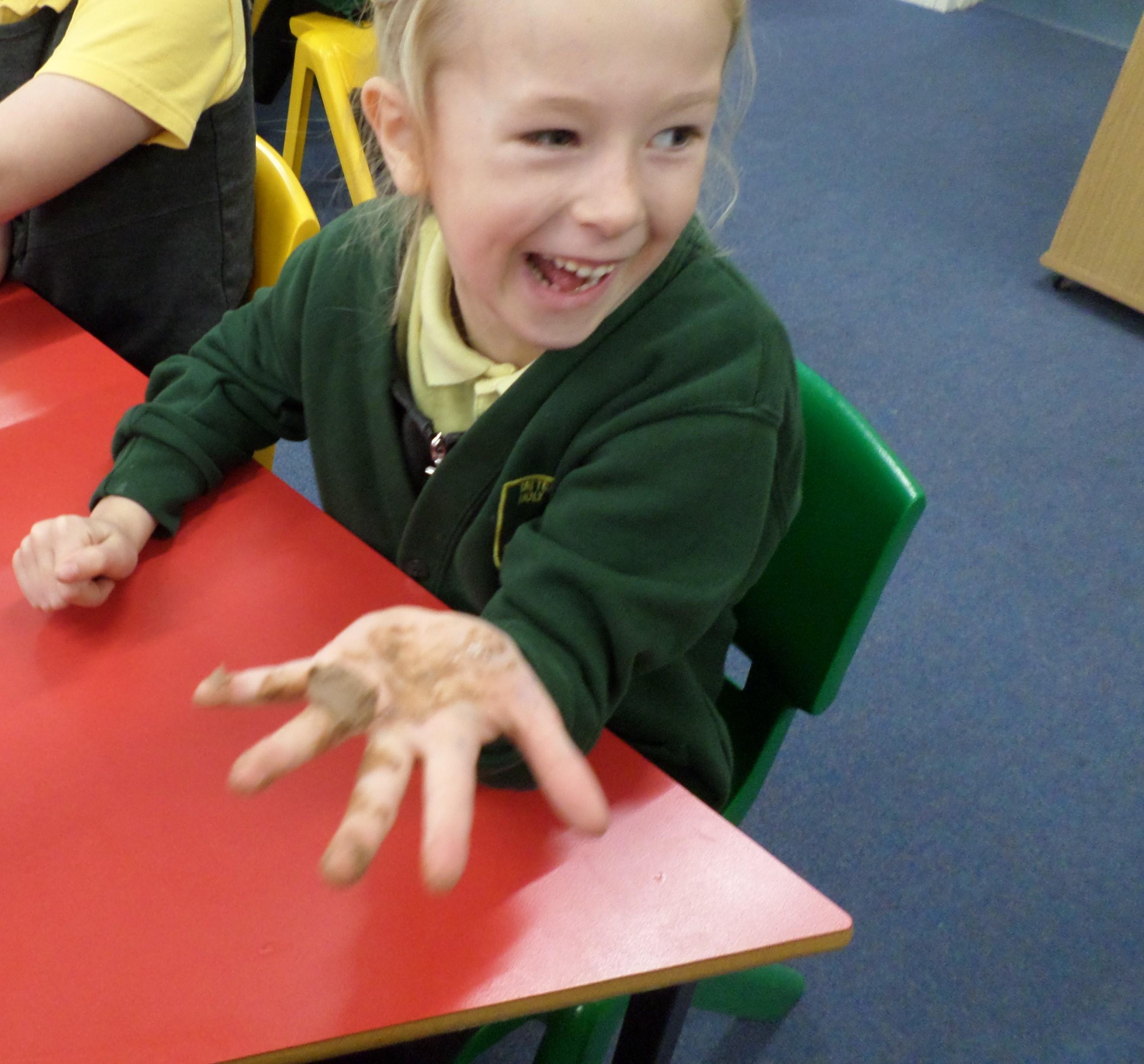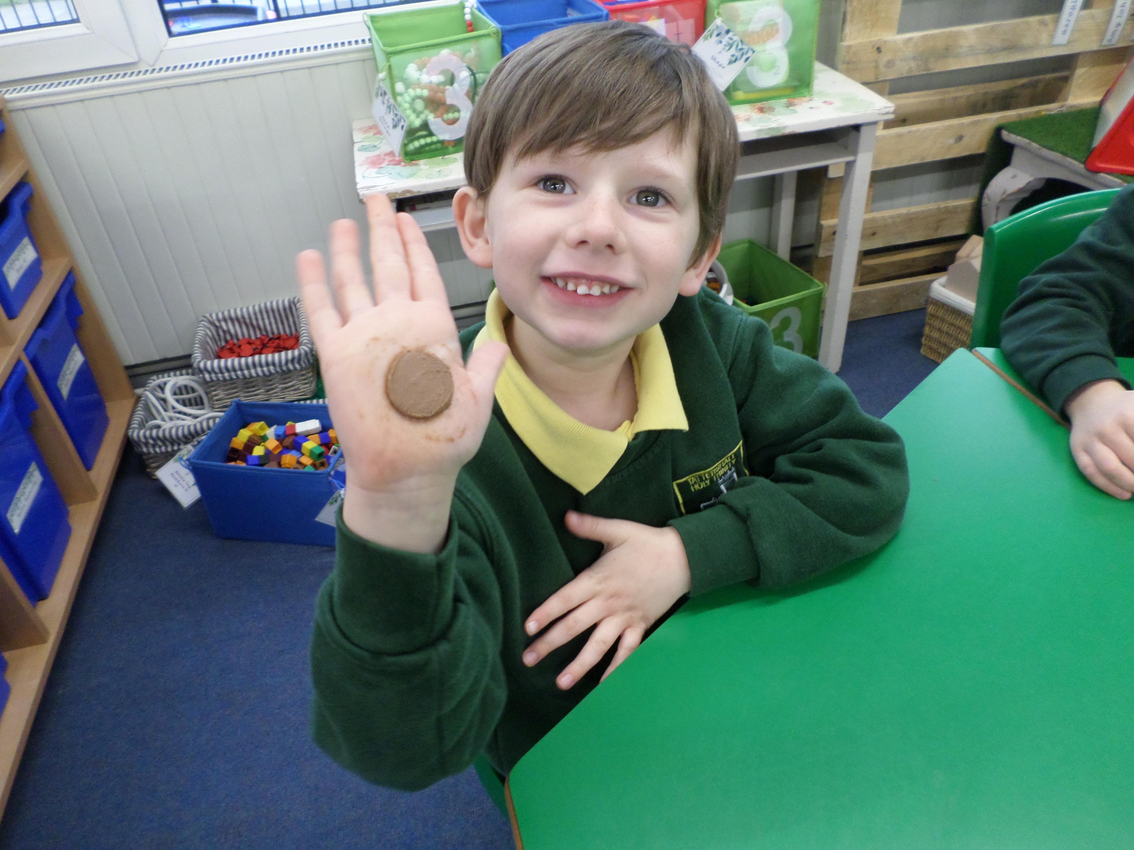 We discussed how a material can change when it is heated. They gave examples such as ice melts, snow melts, candles melt but cookie mixture becomes harder. Each child held a chocolate button in their hand tightly to help us experience what happened to Naughty Nora. We thought of different words to describe what happens when chocolate is heated and the children said that the chocolate had become: runny, soft, a liquid, sticky, squidgy, to name but a few.