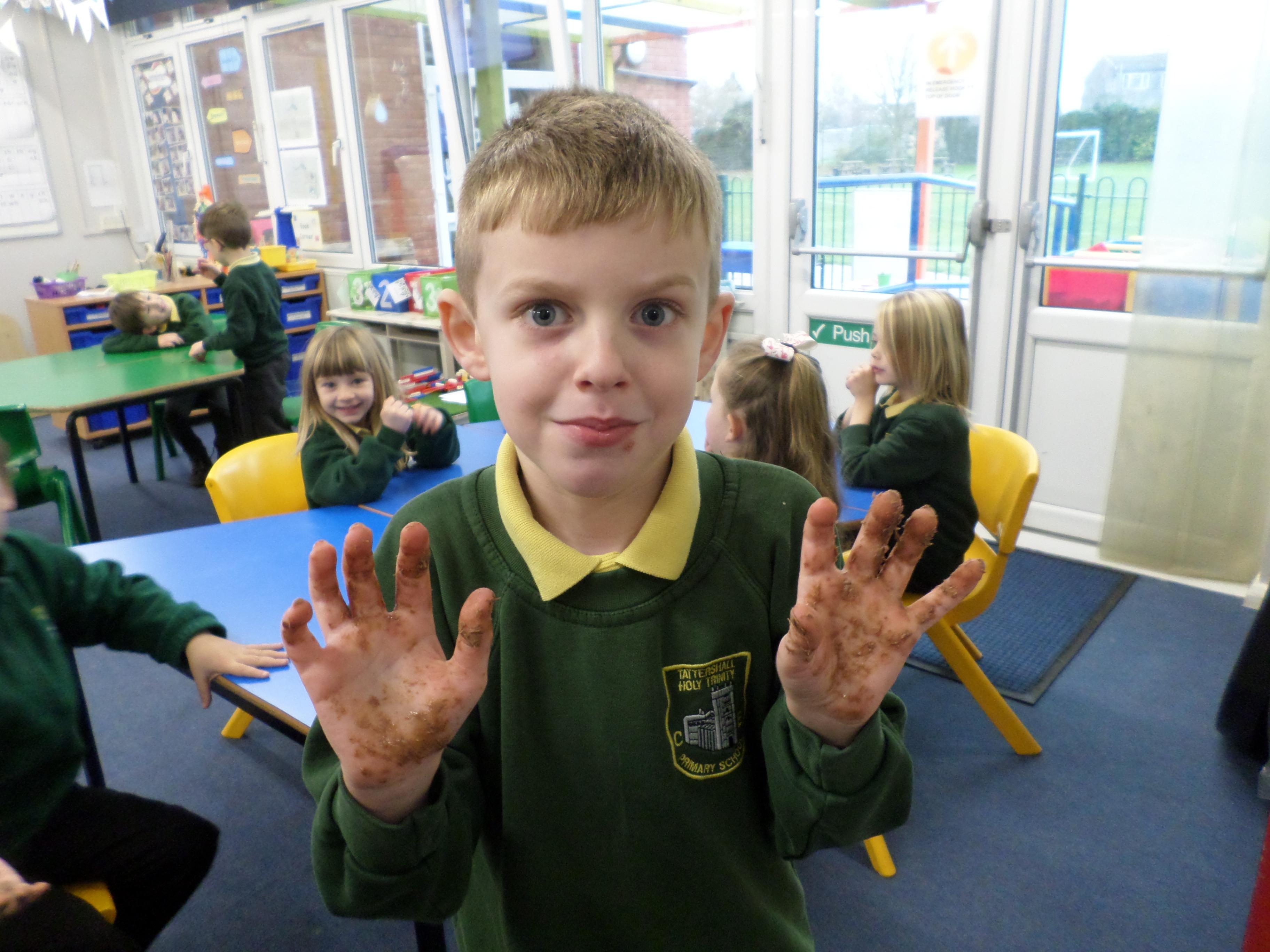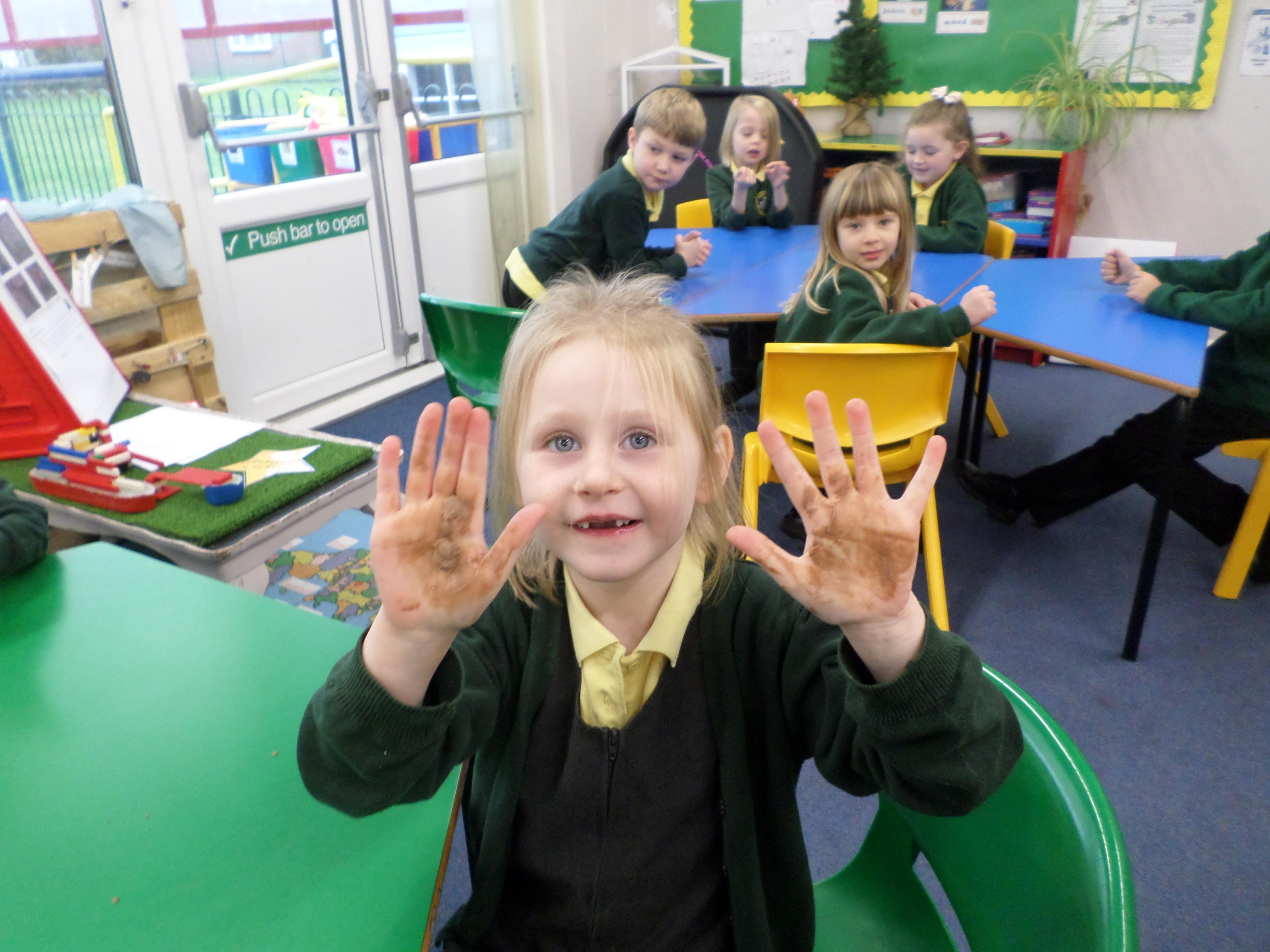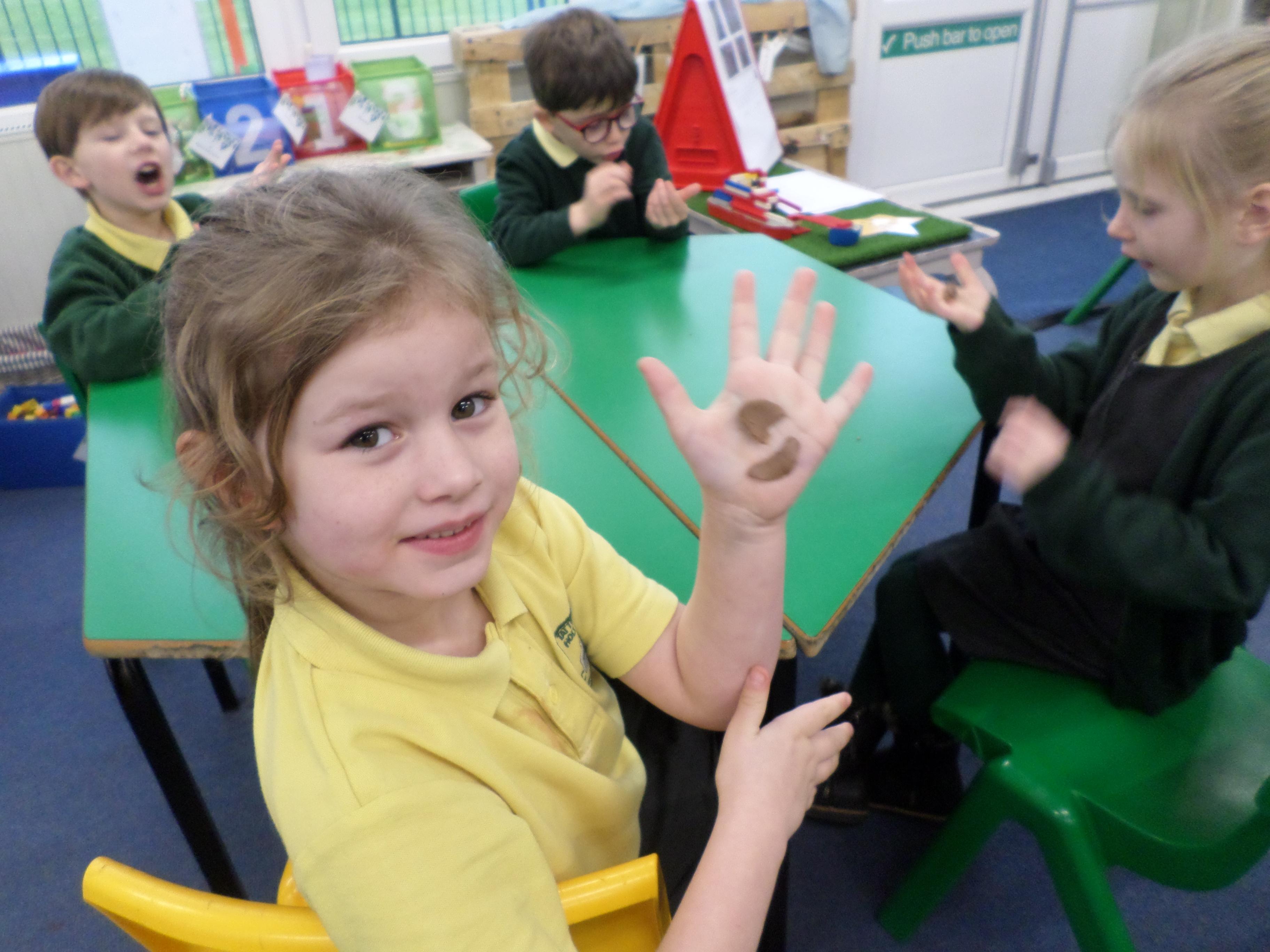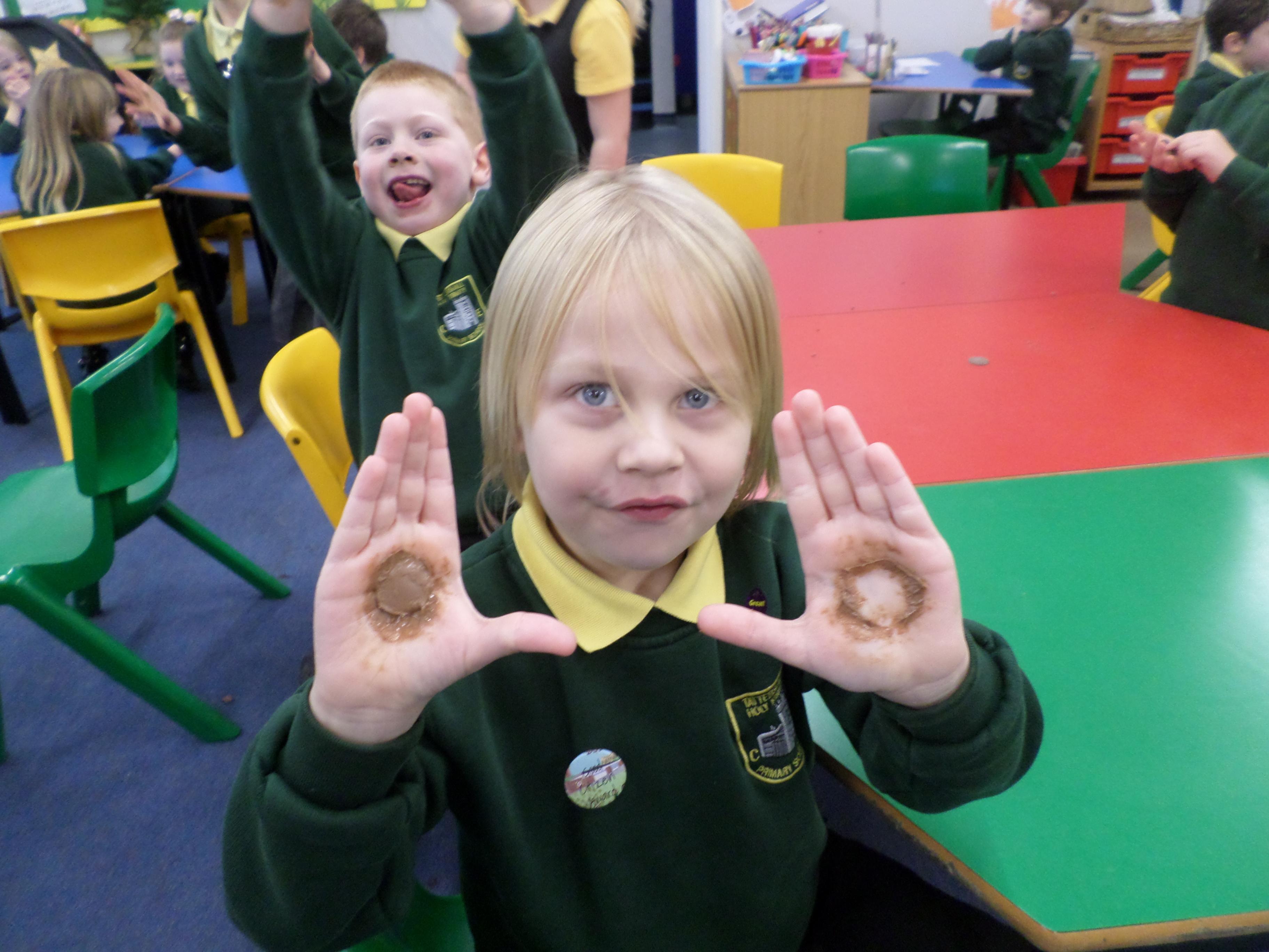 We discussed how a material can change when it is heated. They gave examples such as ice melts, snow melts, candles melt but cookie mixture becomes harder. Each child held a chocolate button in their hand tightly to help us experience what happened to Naughty Nora. We thought of different words to describe what happens when chocolate is heated and the children said that the chocolate had become: runny, soft, a liquid, sticky, squidgy, to name but a few.