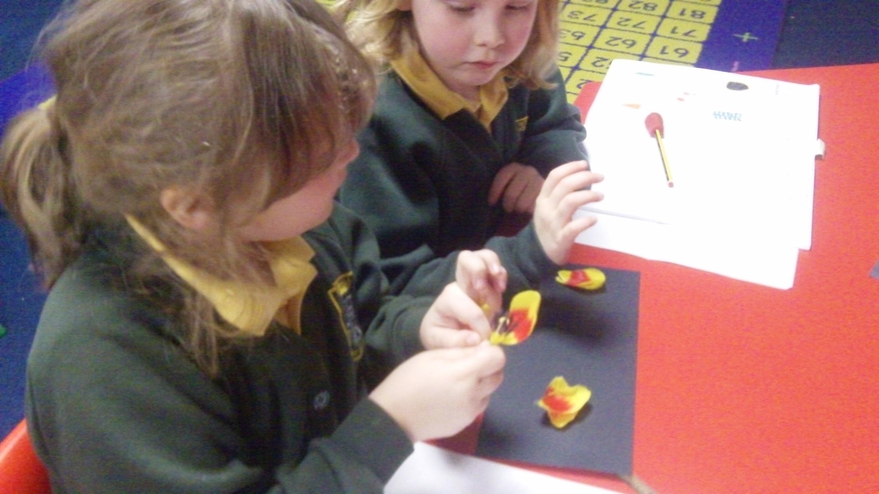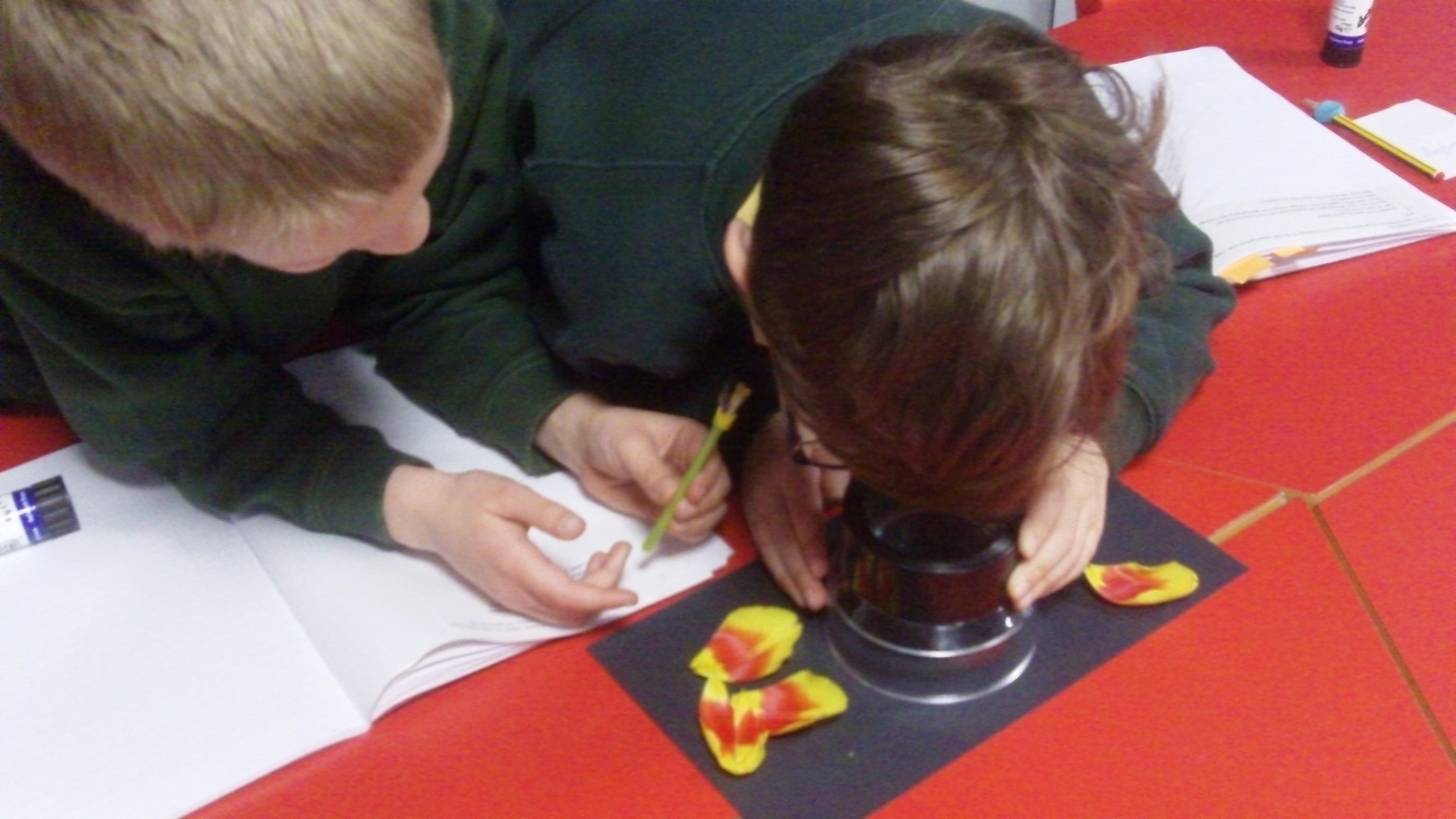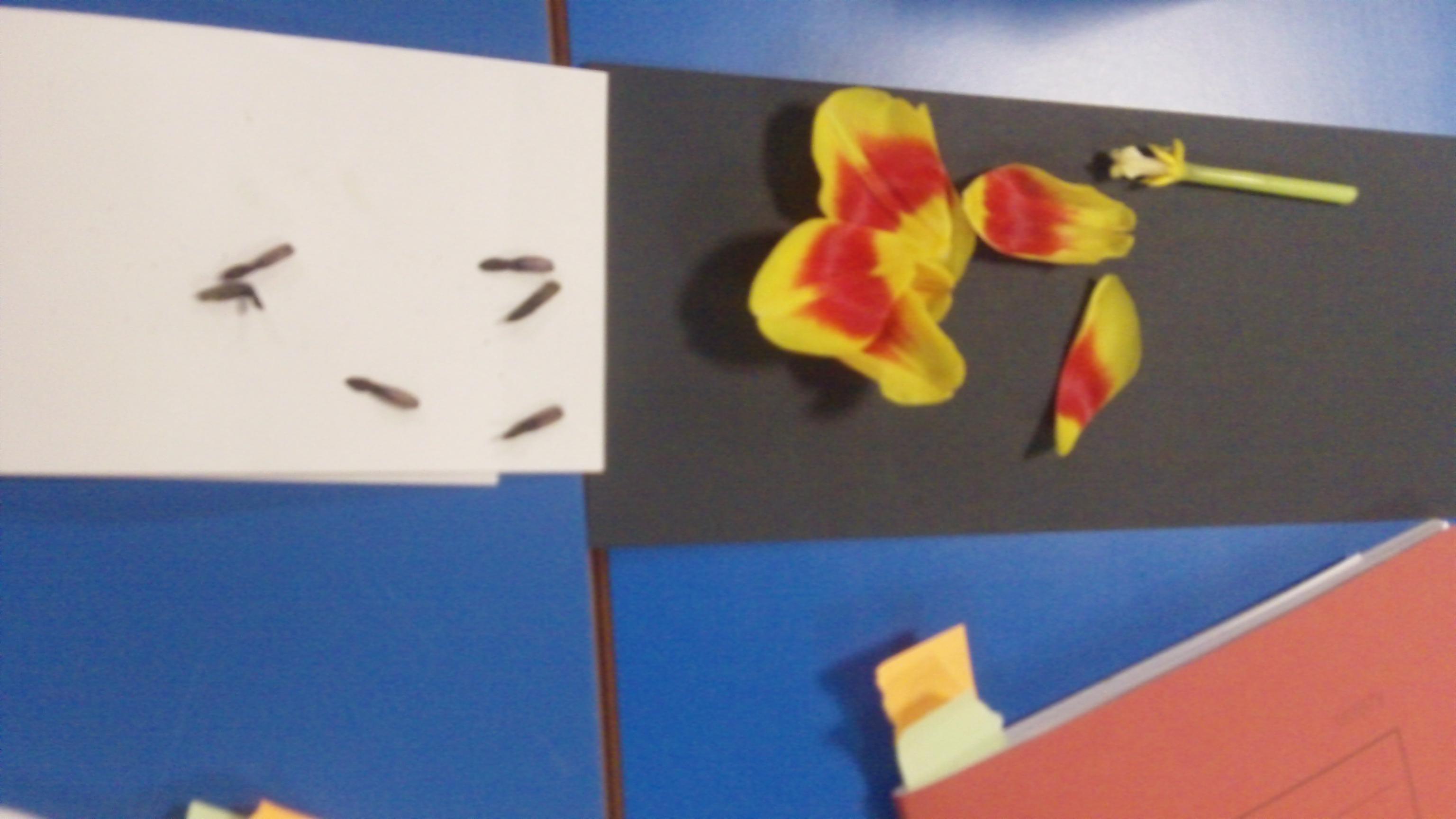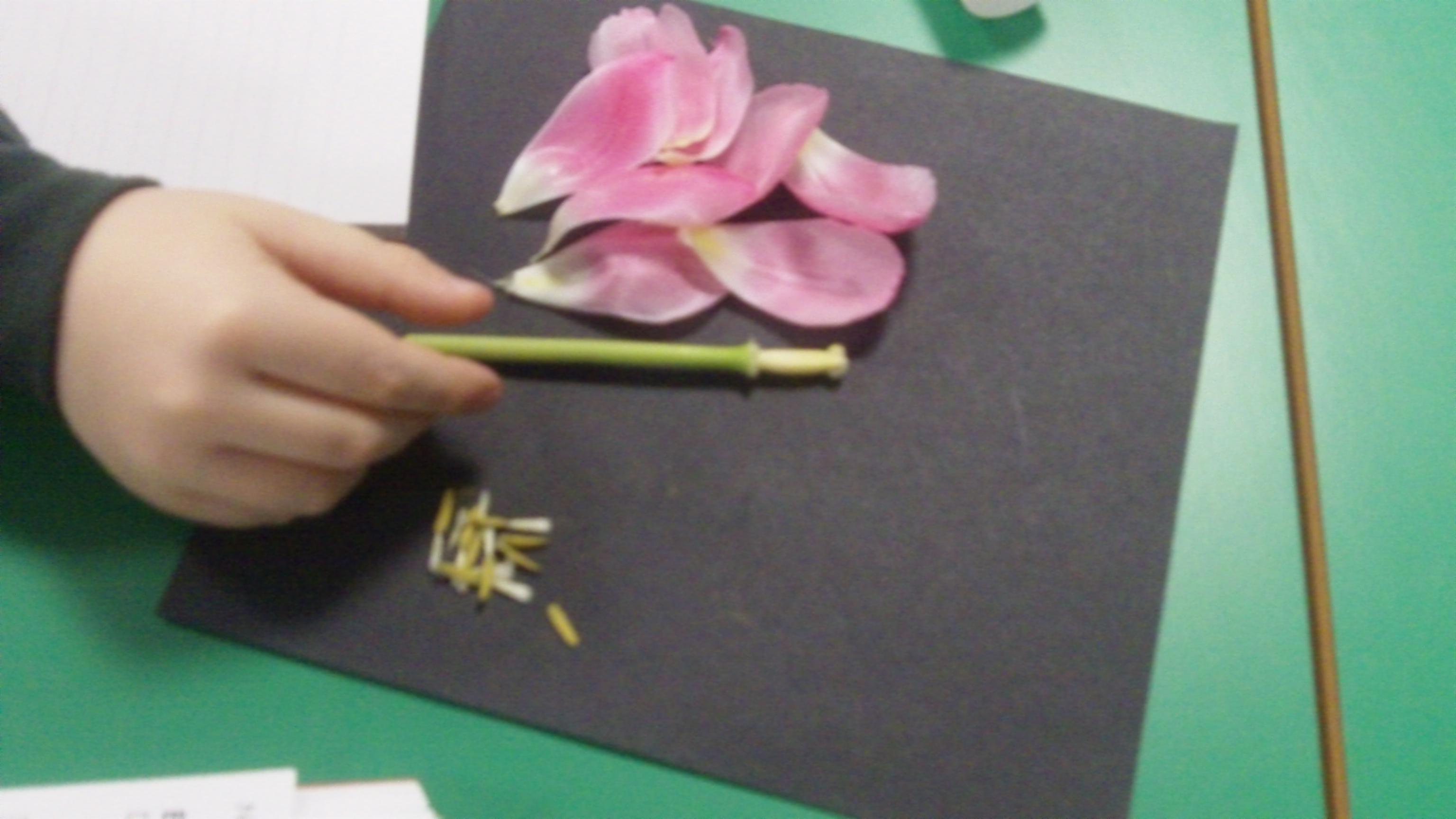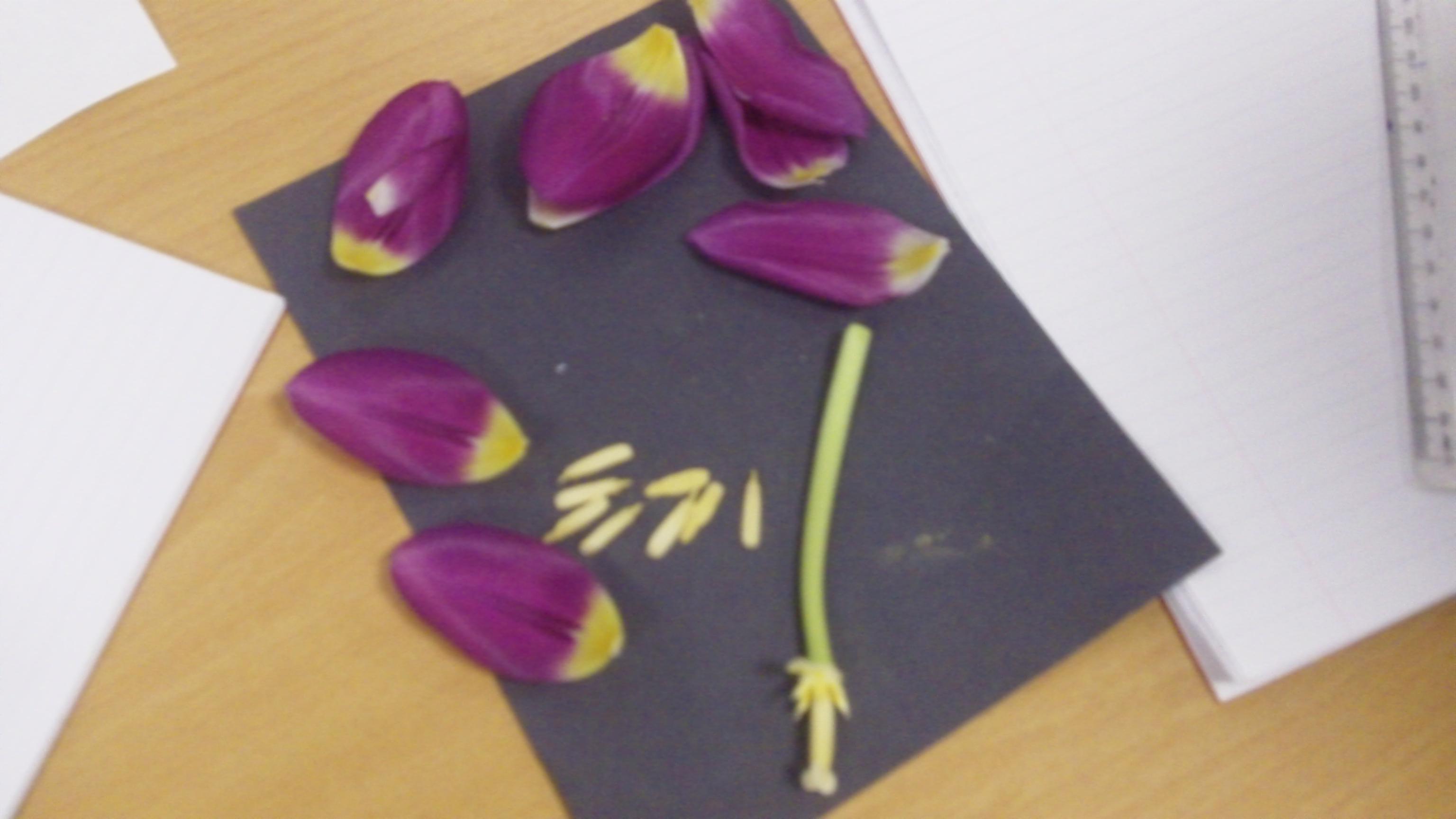Oak have been learning the different parts of a flower and how they help in reproducing more flowers.  We dissected some tulip flowers to identify the stigma, stamen and pollen.  We found that different coloured tulips had different coloured stigma and stamen and even the pollen was different too.