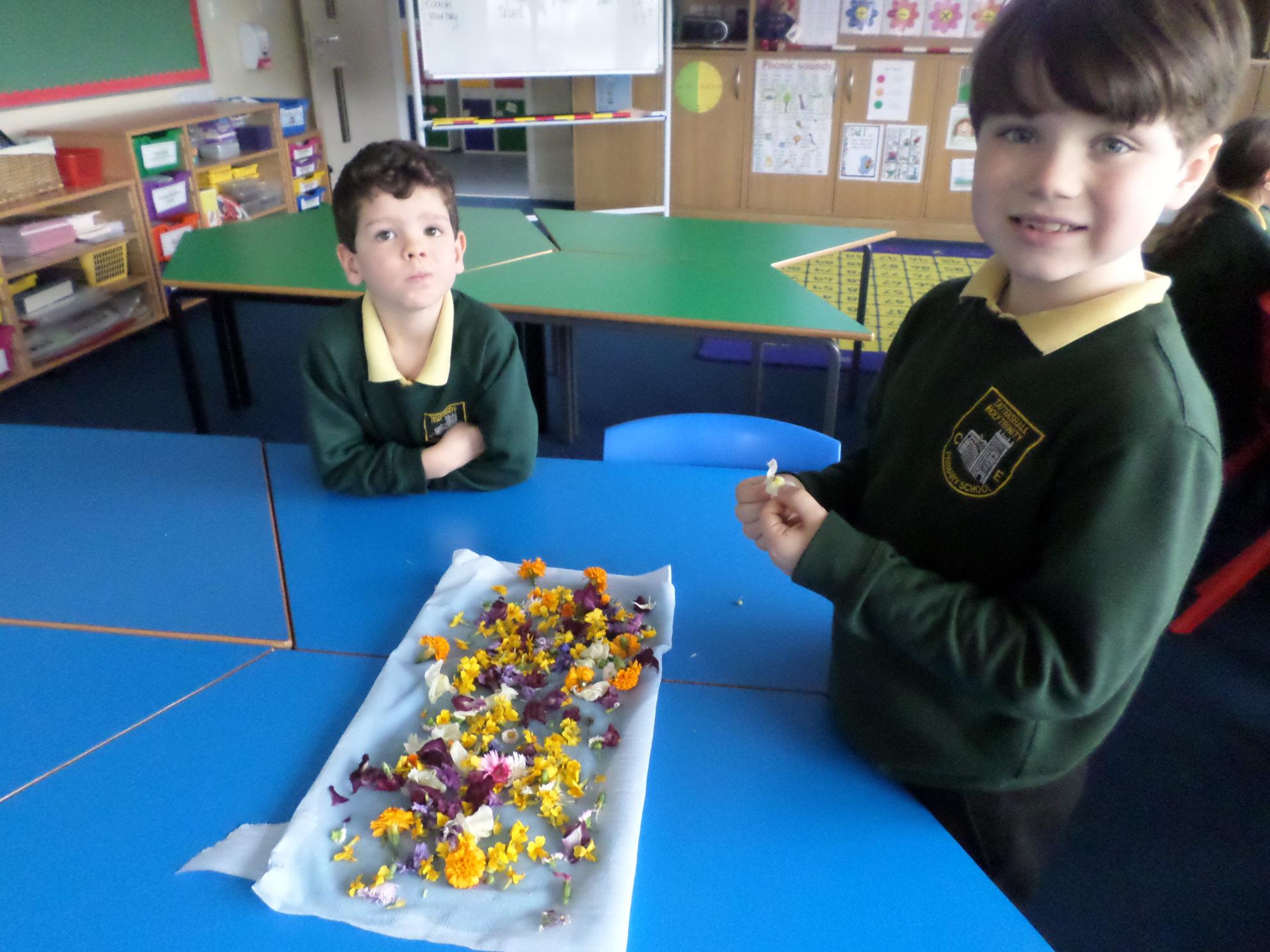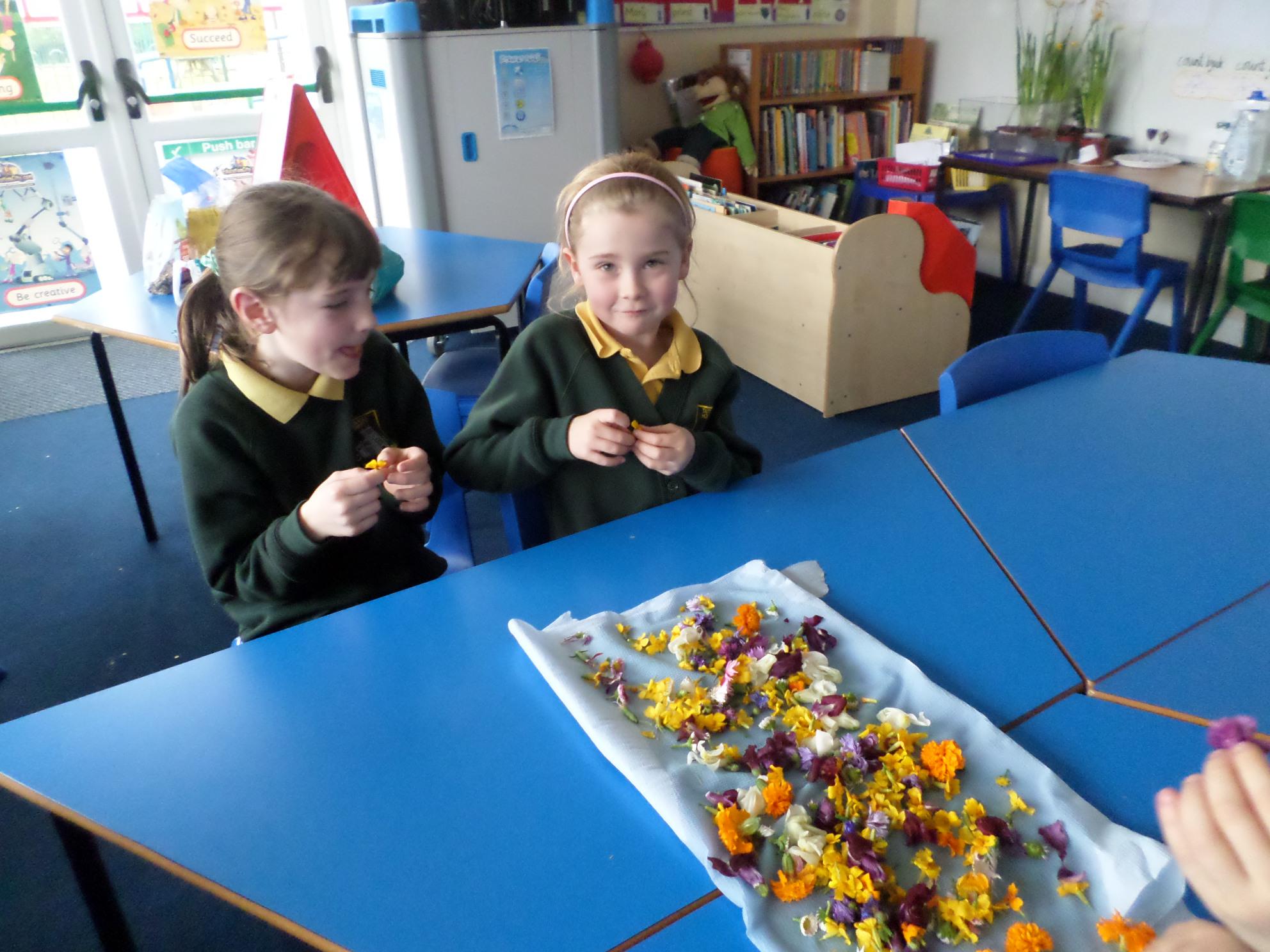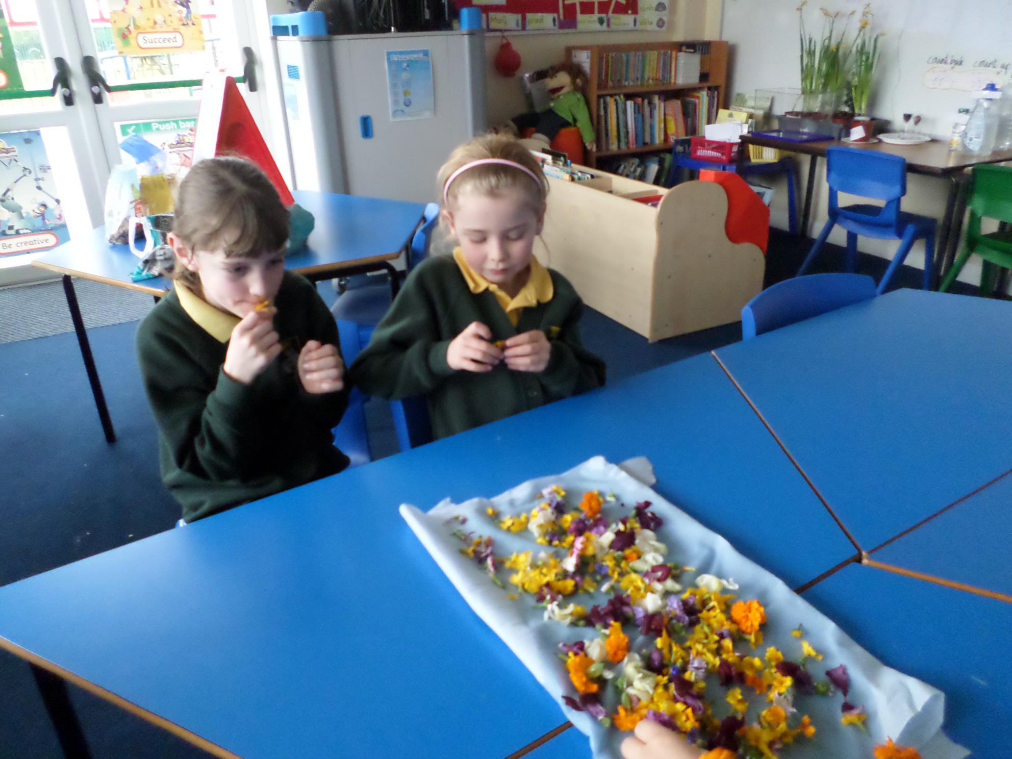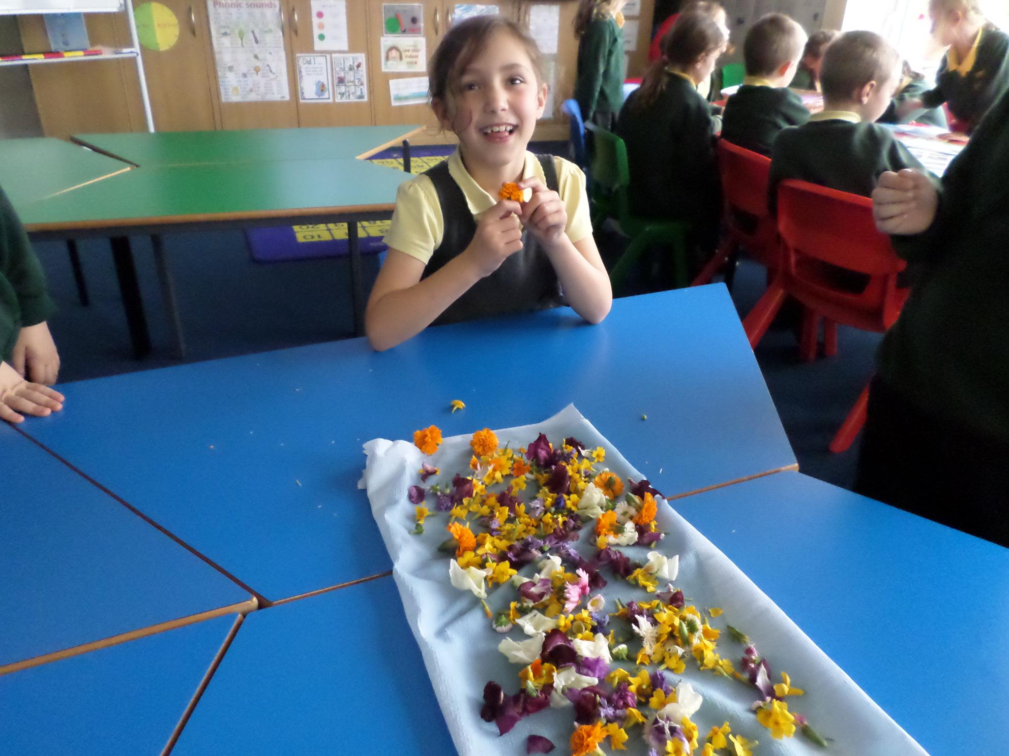 During our plant topic we have been learning about the different parts of the plant that we, as humans, eat.  We discussed that some flowers are edible and one of our parents kindly donated some farmed edible flowers for us to try.  We all know not to eat any flower and that these were specially produced for humans to eat.  They looked beautiful - almost too good to eat!