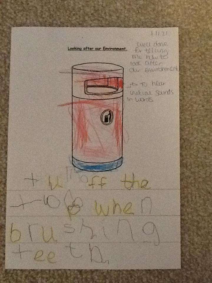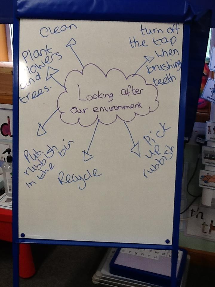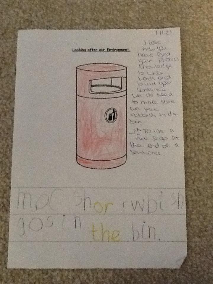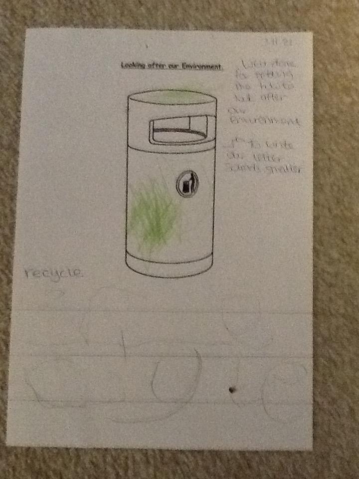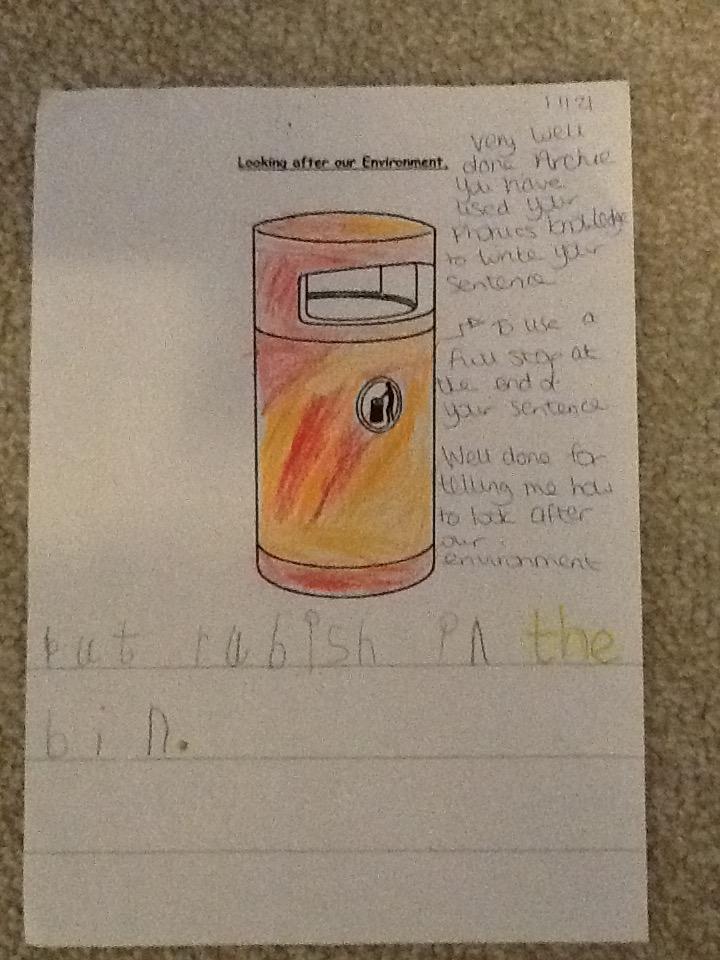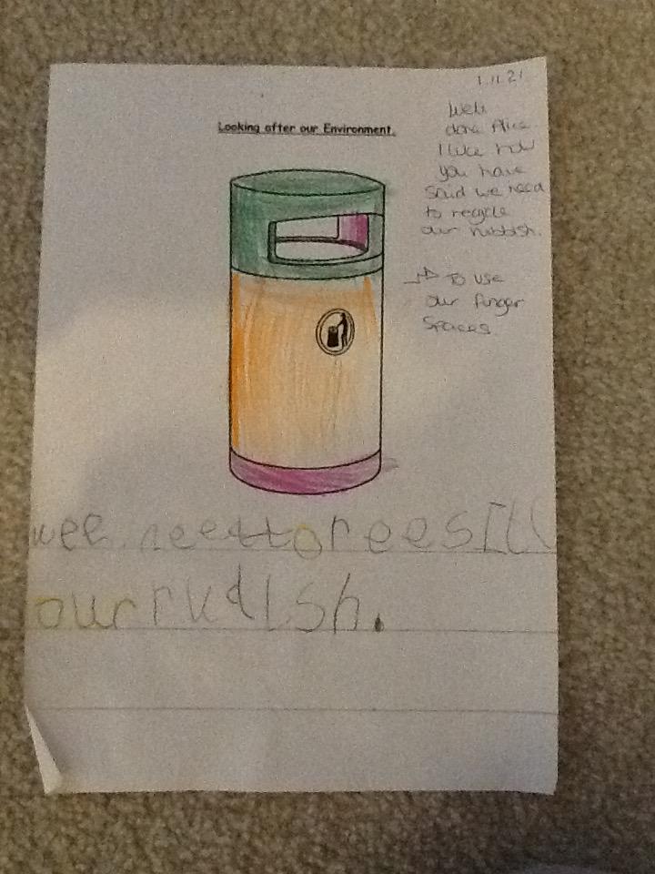 The children had to write a sentence to tell me how they can look after our environment.