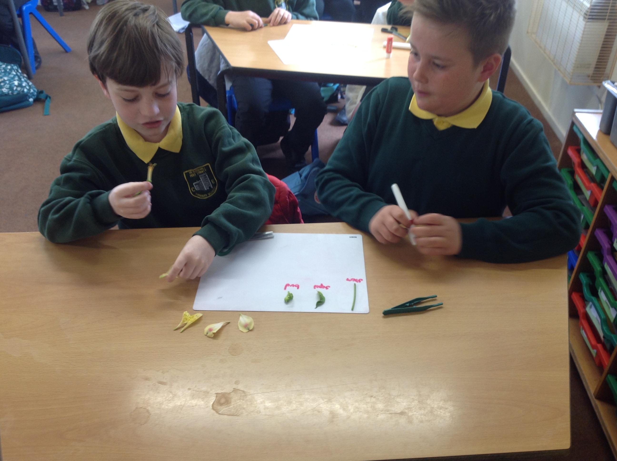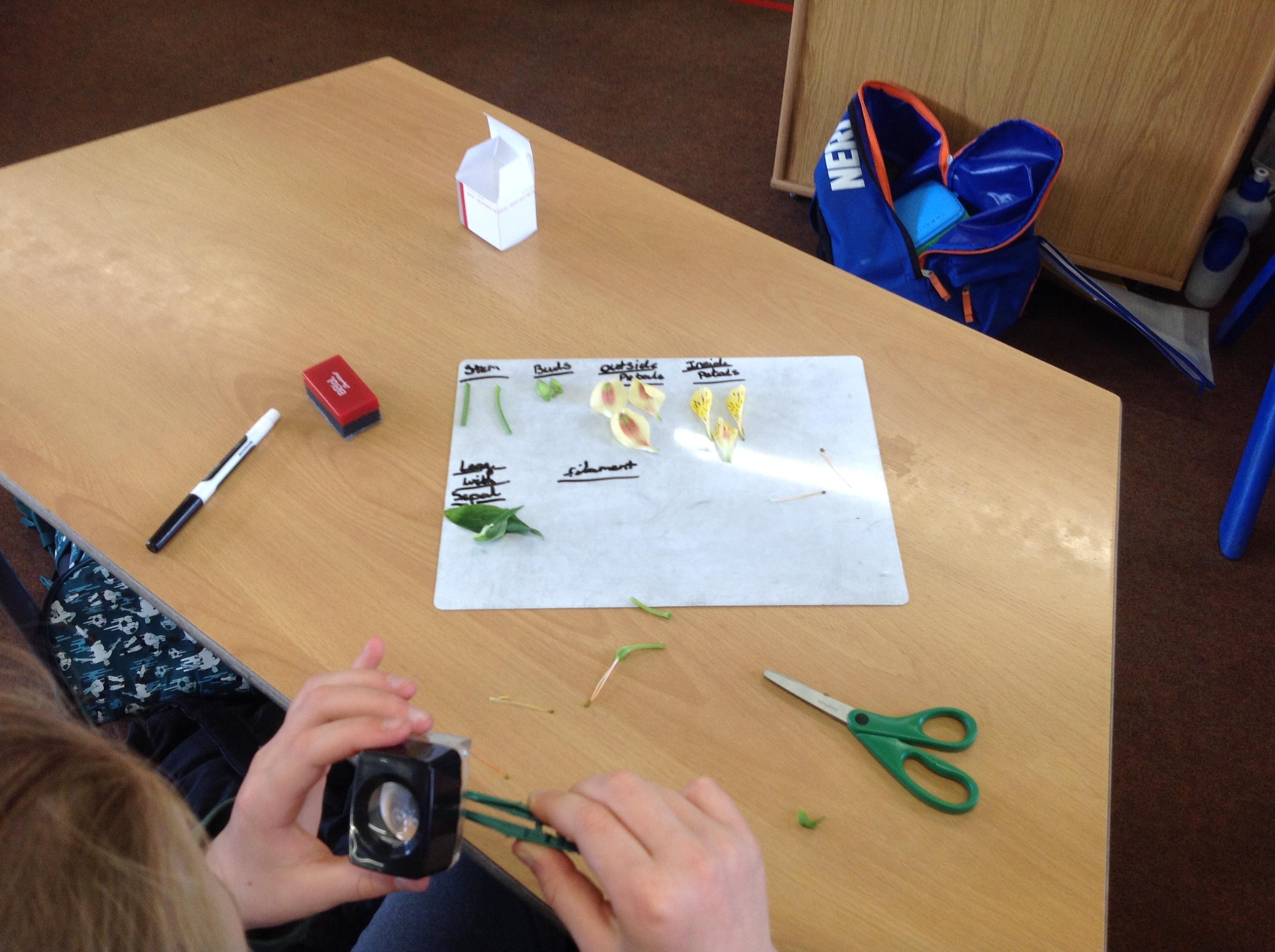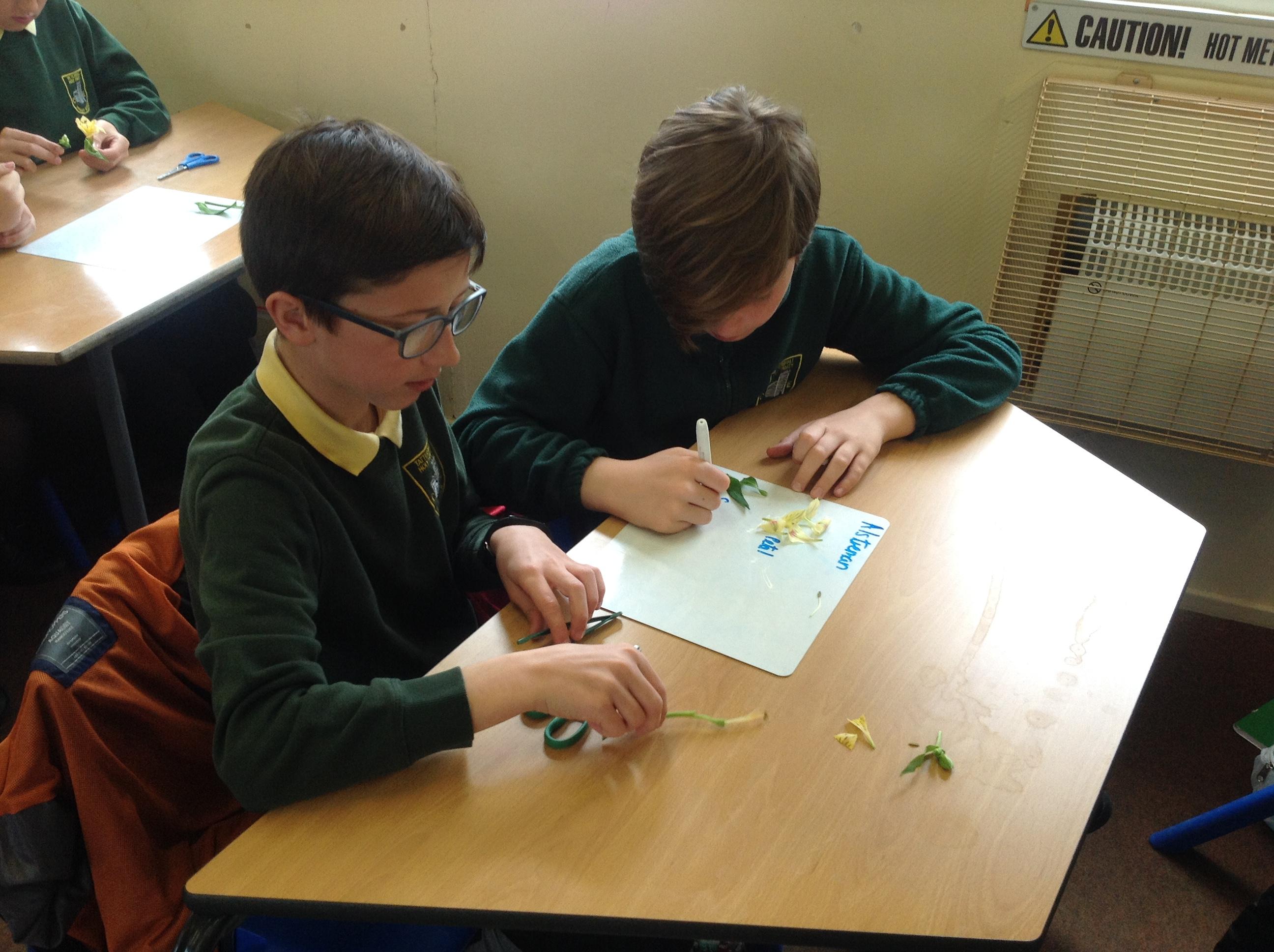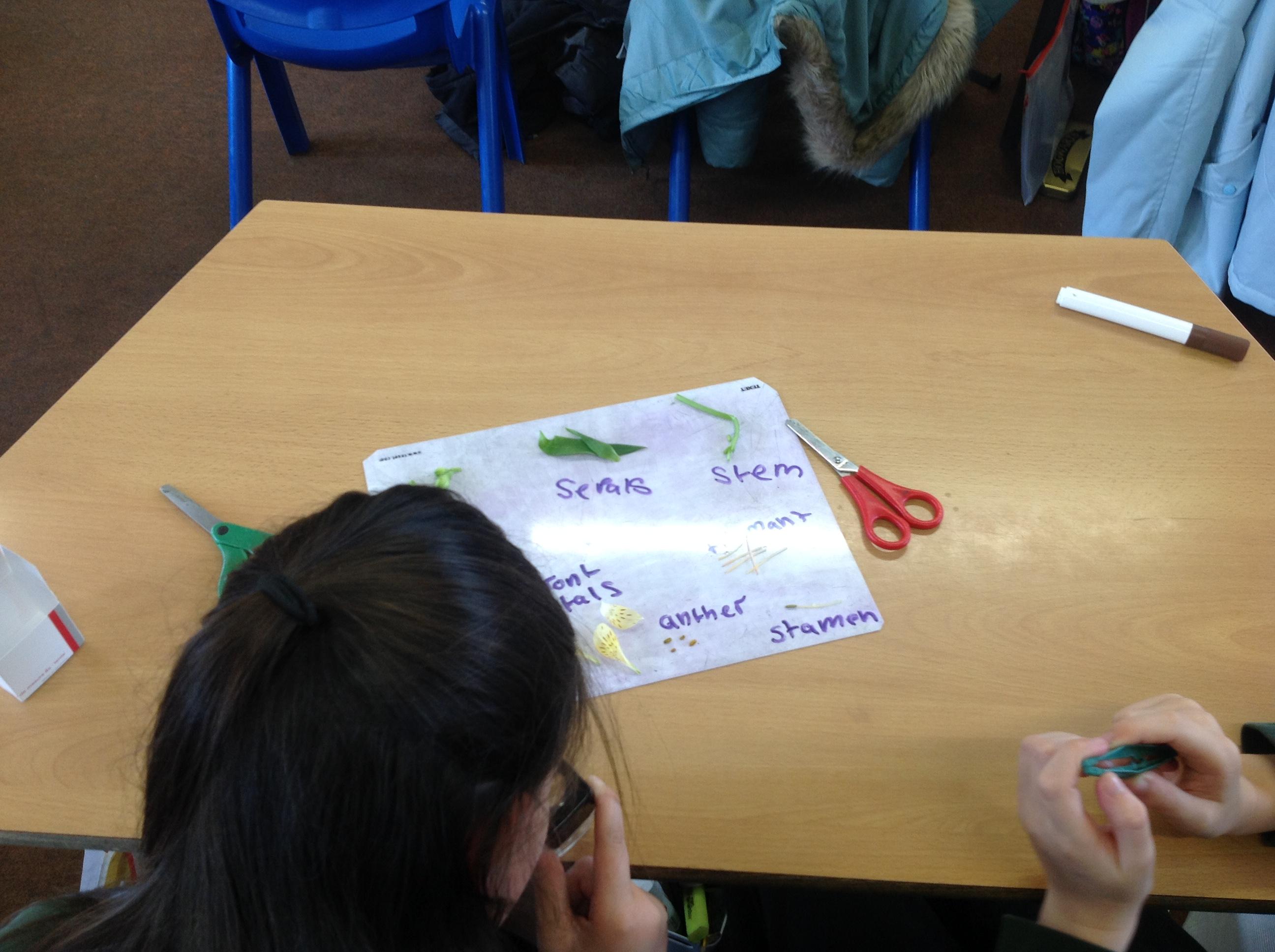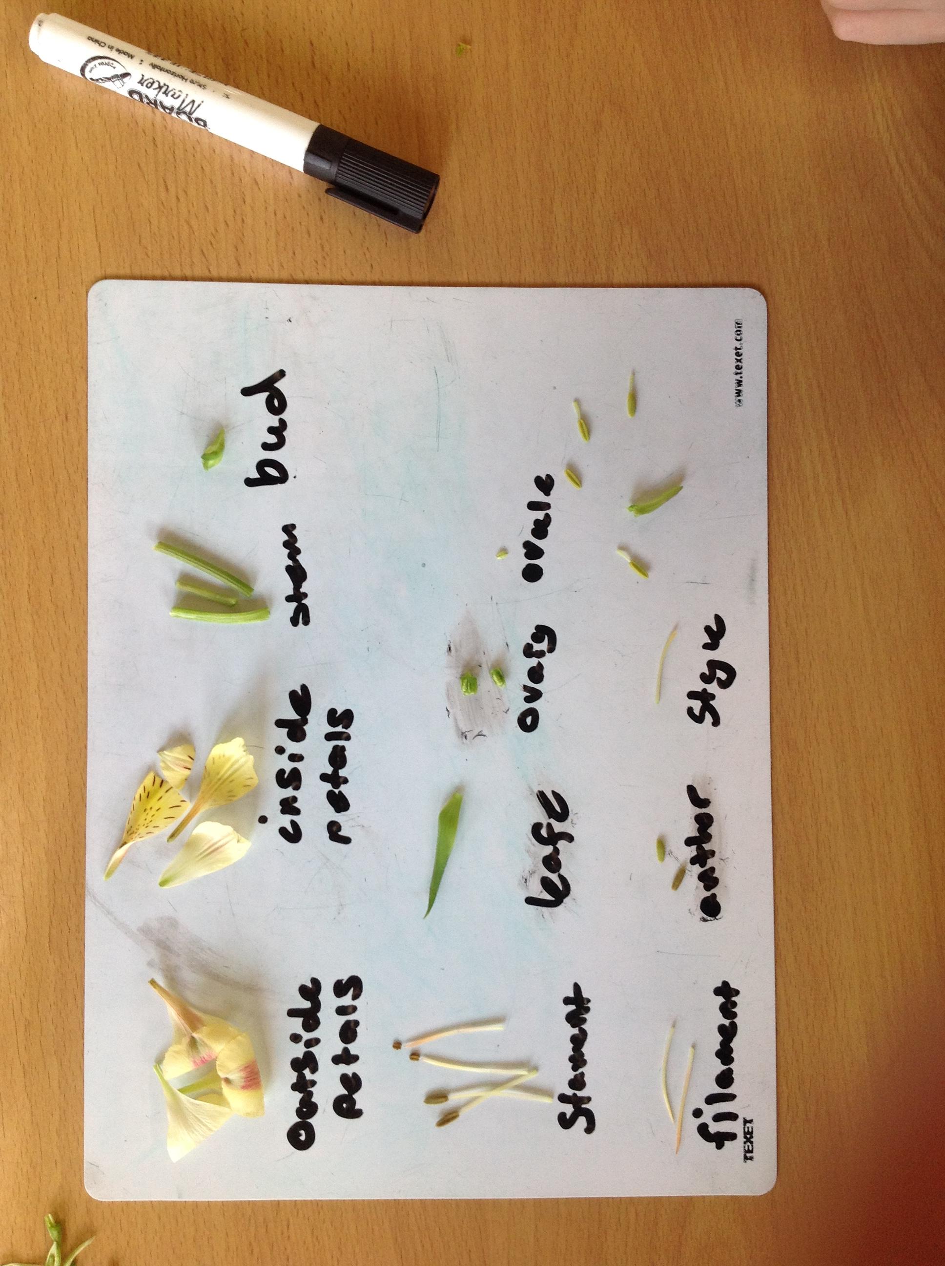 In science, we have been looking at ways in which plants reproduce, by dissecting flowers to learn about the male and female reproductive systems. We learned how pollen (the male part of a flower) gets transferred to the ovules (the female parts) in order to fertilize it and create new seeds.