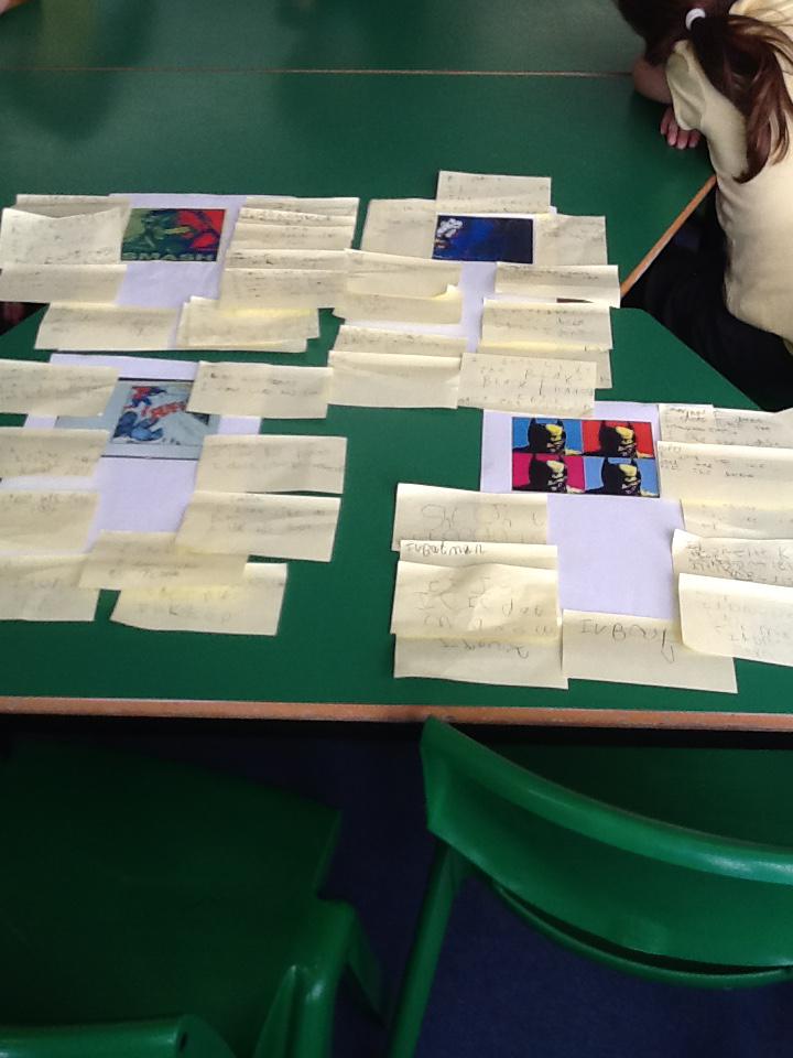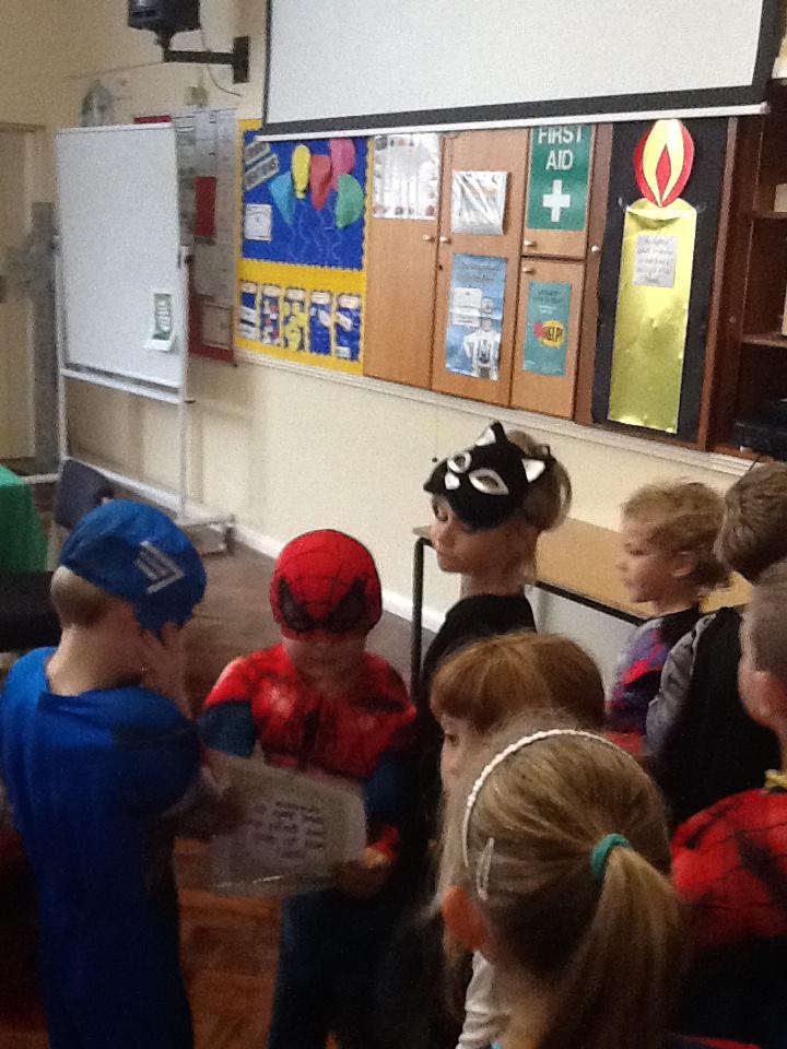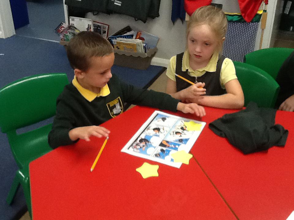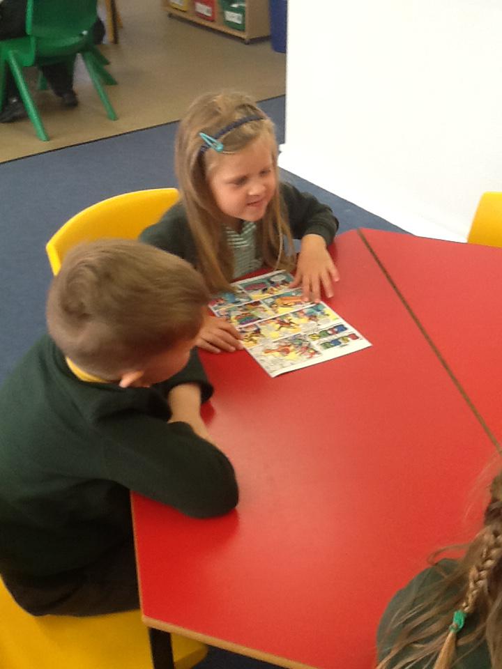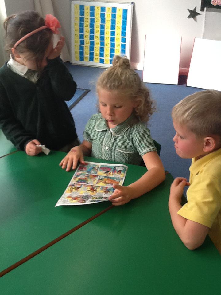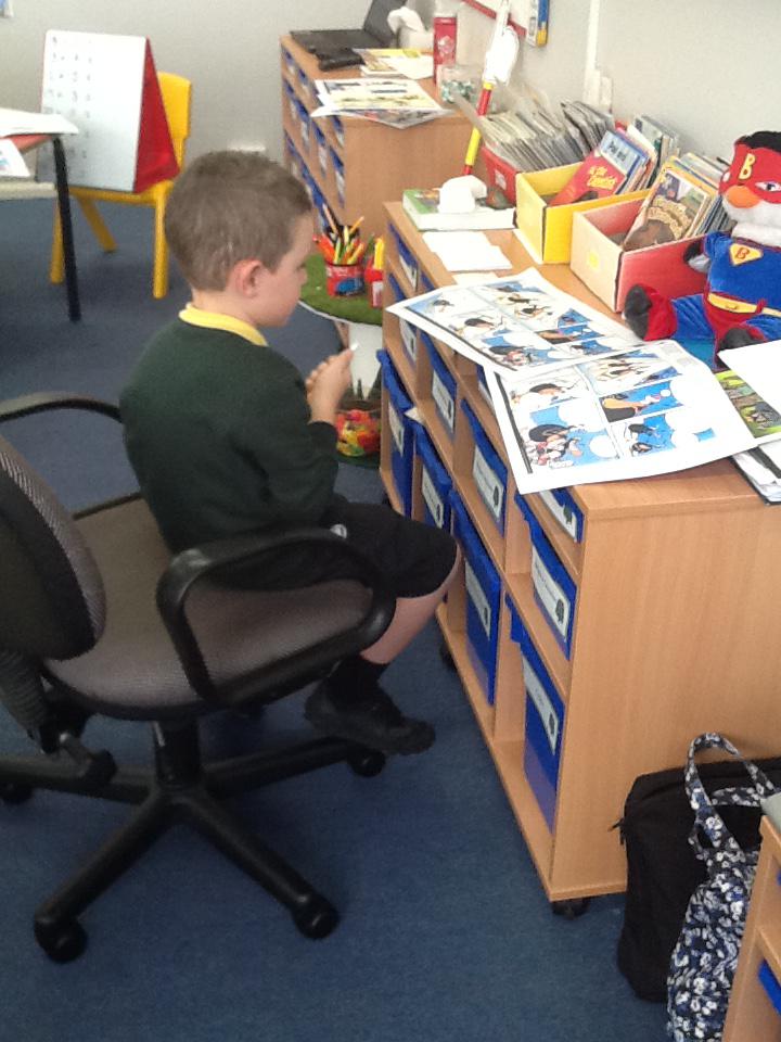 Continuing our work on superheroes this week we have been looking at comics. We began the week by looking at lots of different comics and reading them as at first they were tricky to understand. We then moved on to find the key features of comics and highlighted them on comic strips. We used our ICT skills to take photos of each other in our favourite superhero pose and added extra details and finally used a range of different drama techniques to explore different superhero feelings.