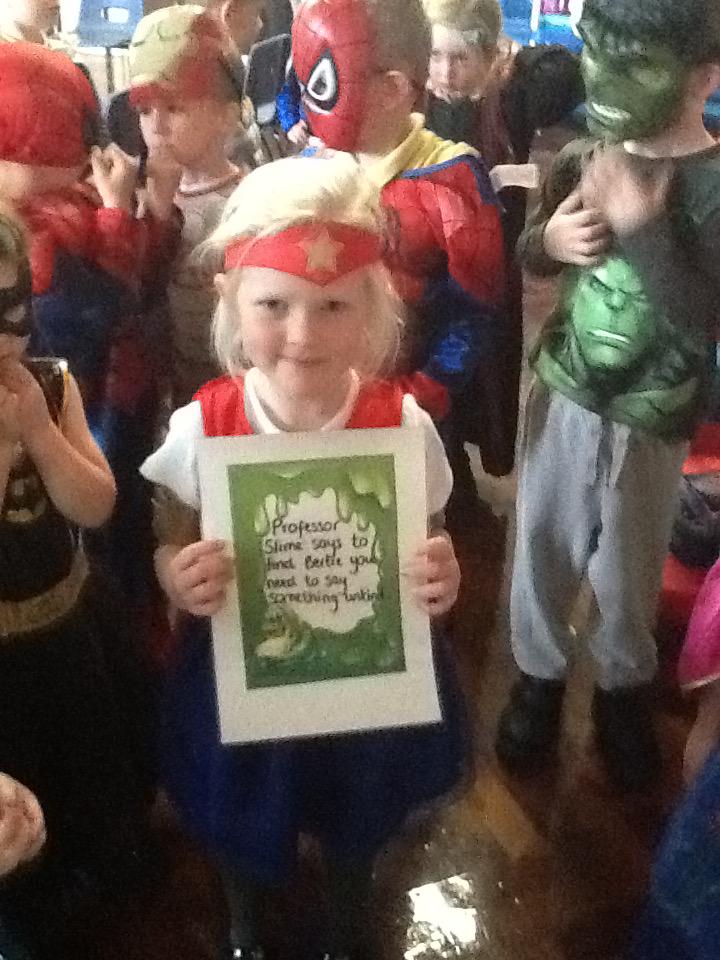 A very well done on another exciting week. This week we celebrated a great class effort with everyone receiving a Friday mention for using their superhero skills to find Bertie! We also all stood up for our fantastic shape maths display. Lexi was our writing star doing a super piece of writing helping Professor Slime to become a superhero too!