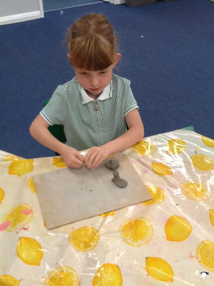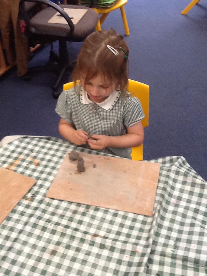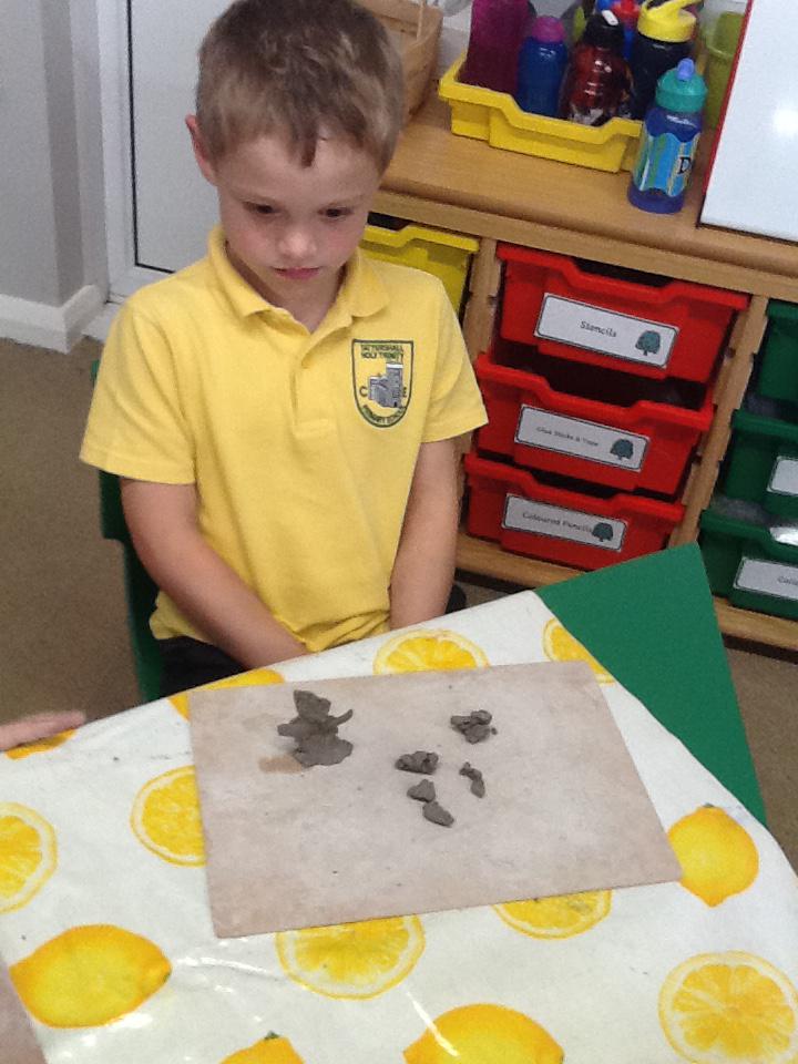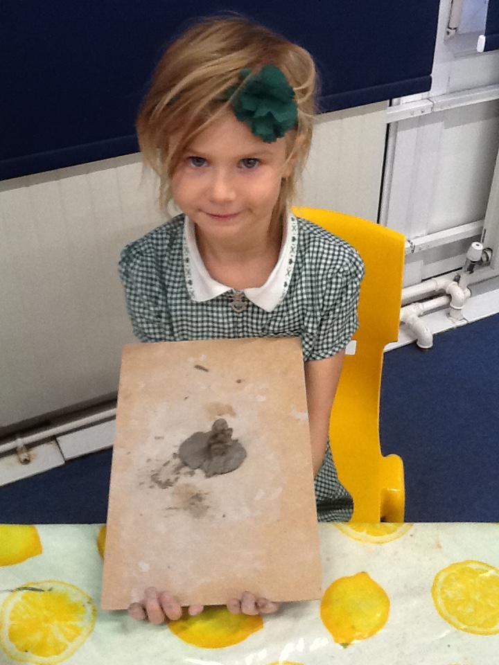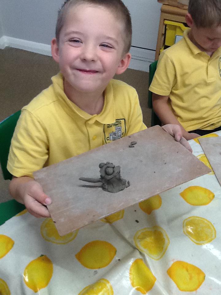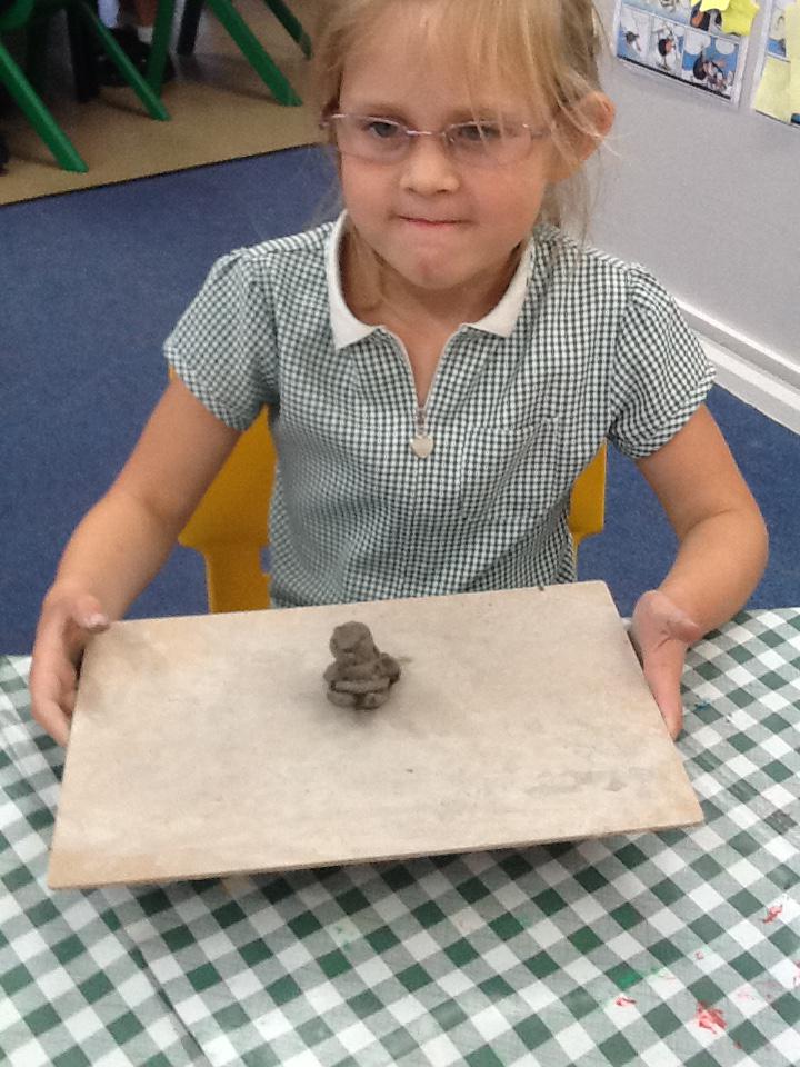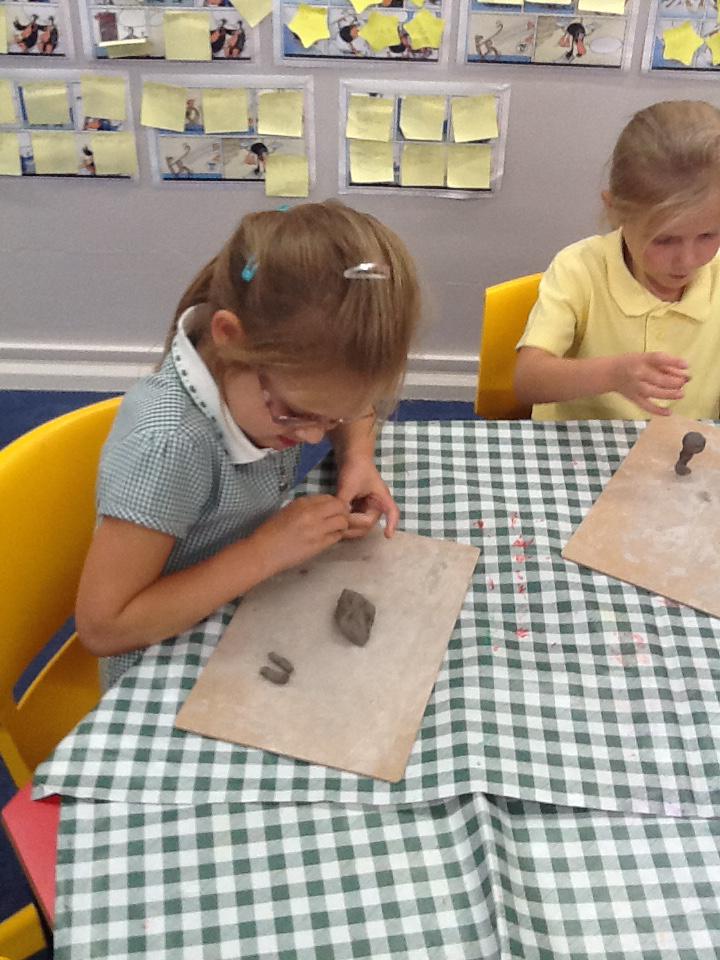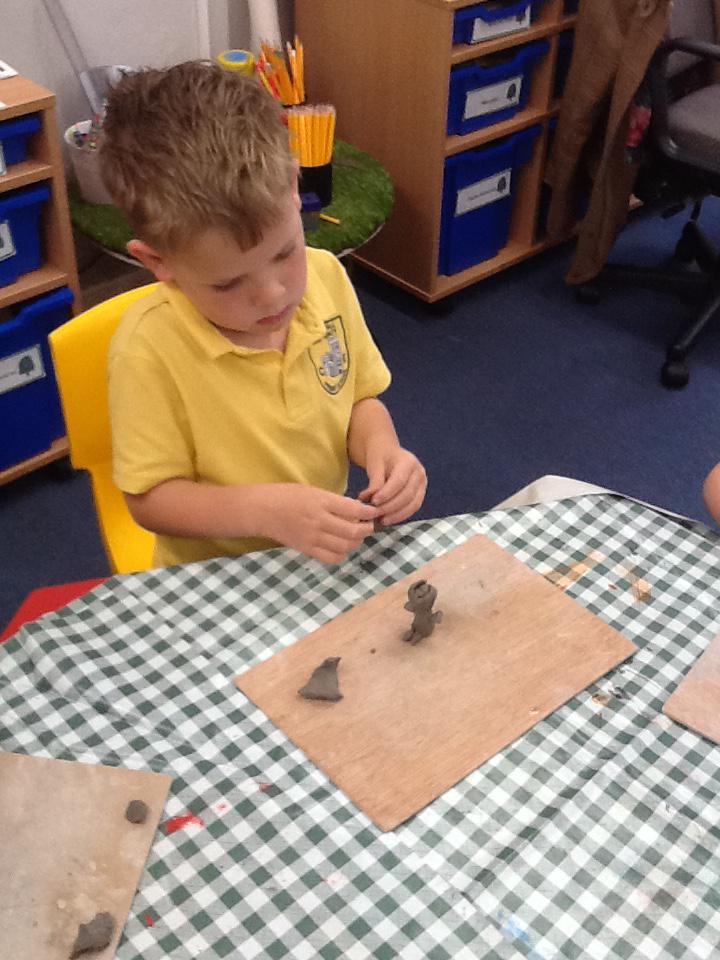 This week we have been using clay. We began by sketching our Bertie sculpture thinking about proportion. We then used our fingers to mould the clay into different shapes before putting them together for our final piece. It was great fun to use clay and our sculptures were fantastic!