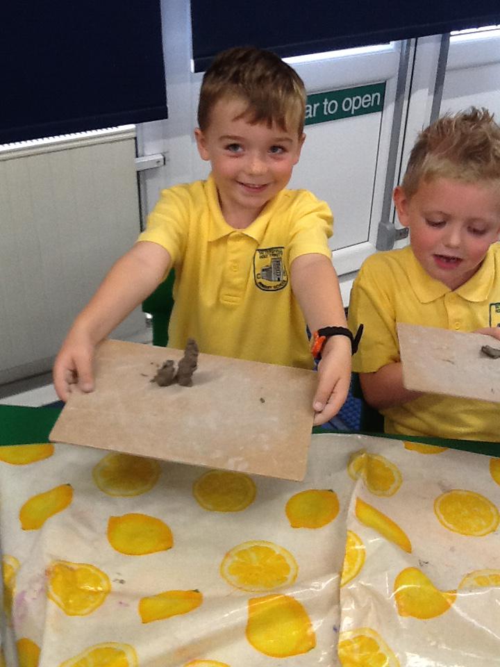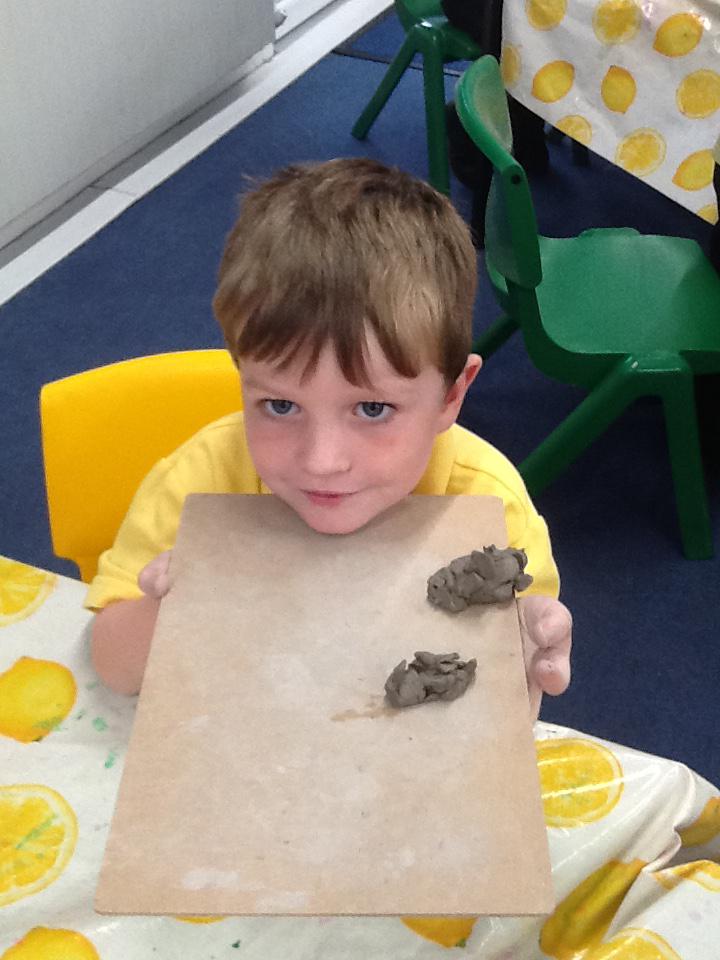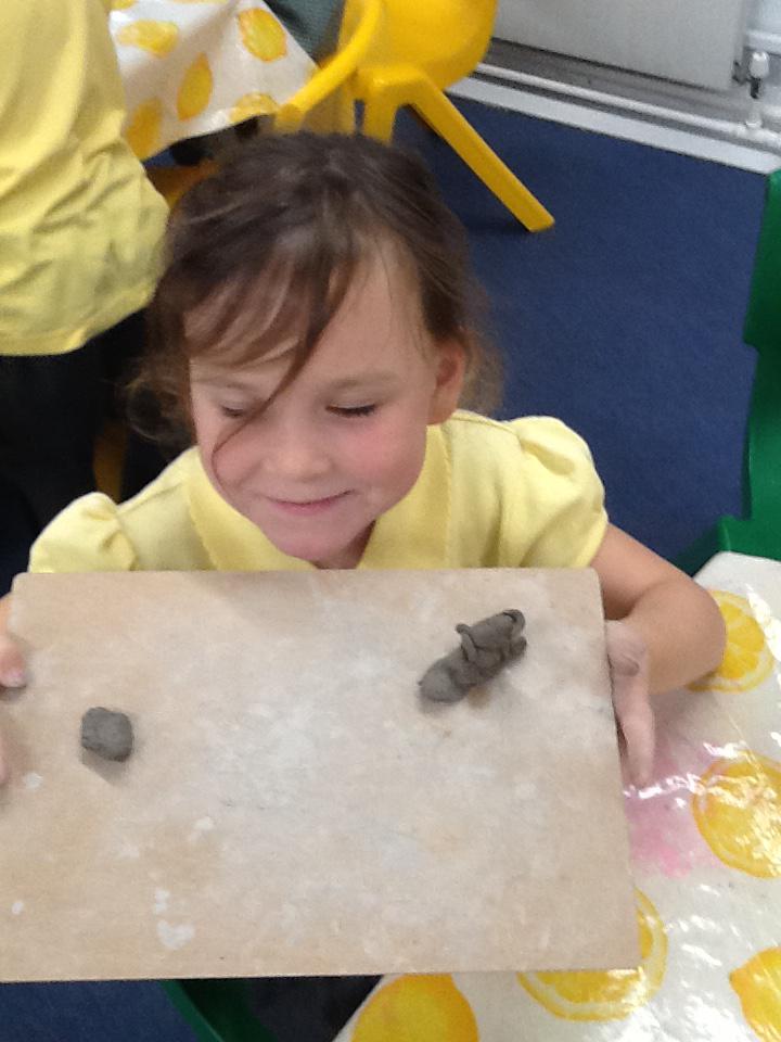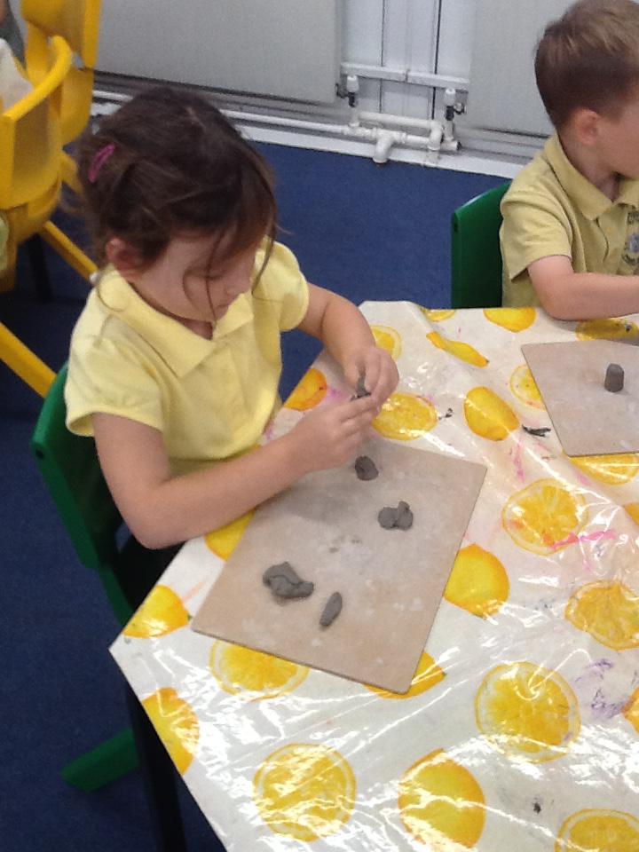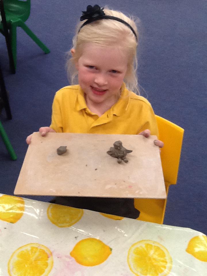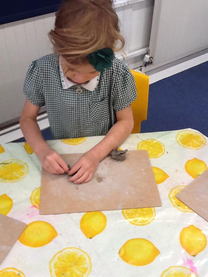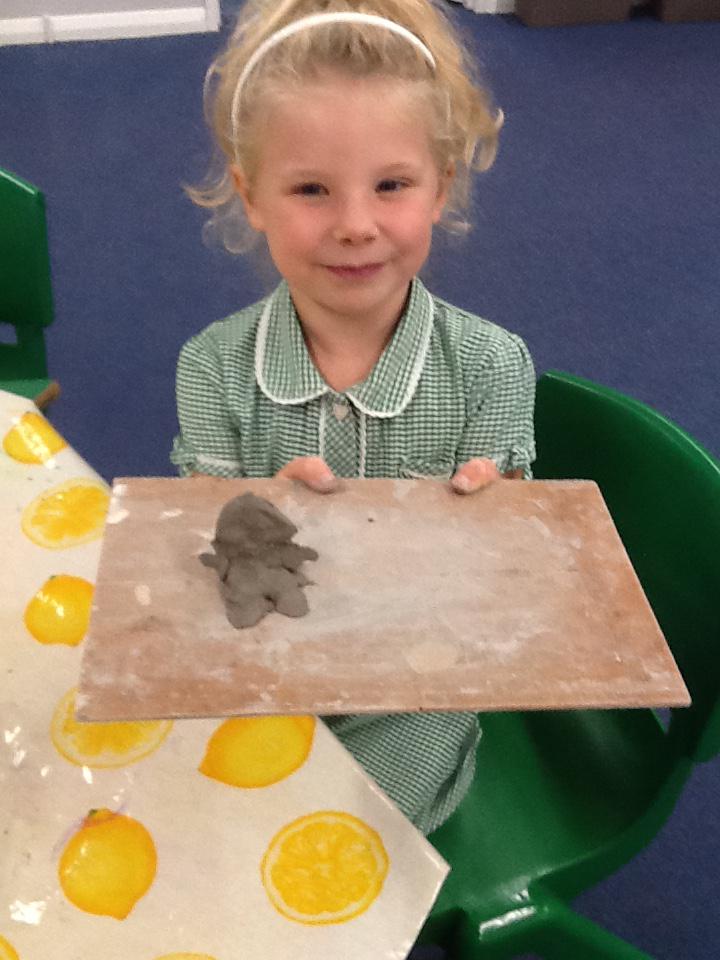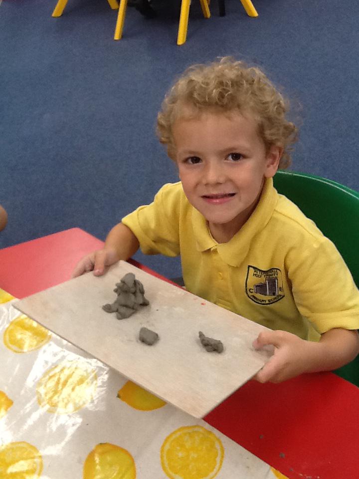 This week we have been using clay. We began by sketching our Bertie sculpture thinking about proportion. We then used our fingers to mould the clay into different shapes before putting them together for our final piece. It was great fun to use clay and our sculptures were fantastic!