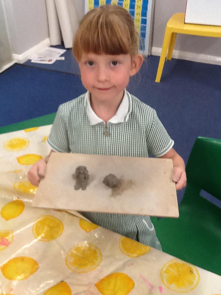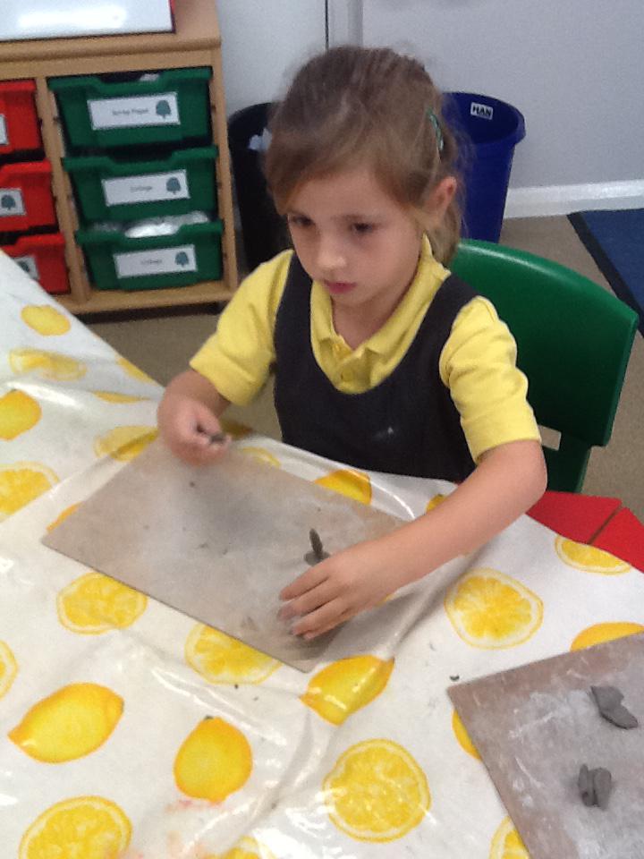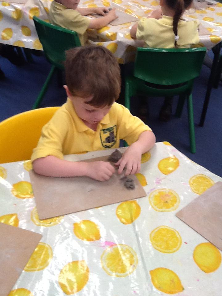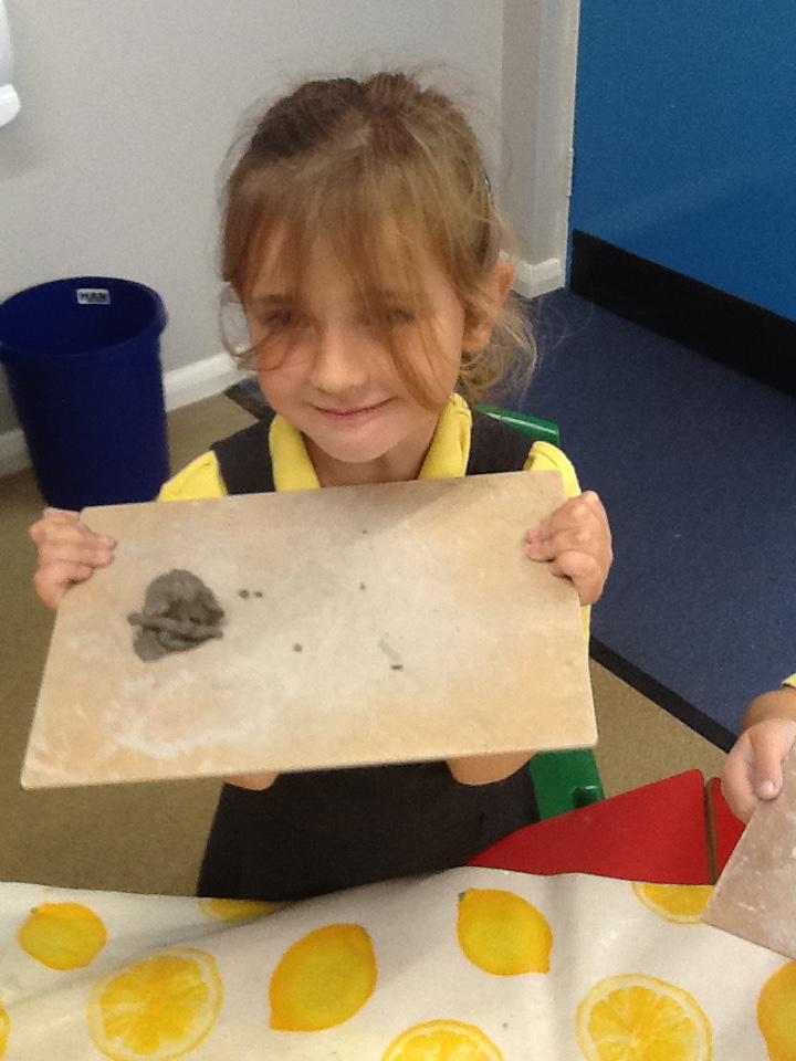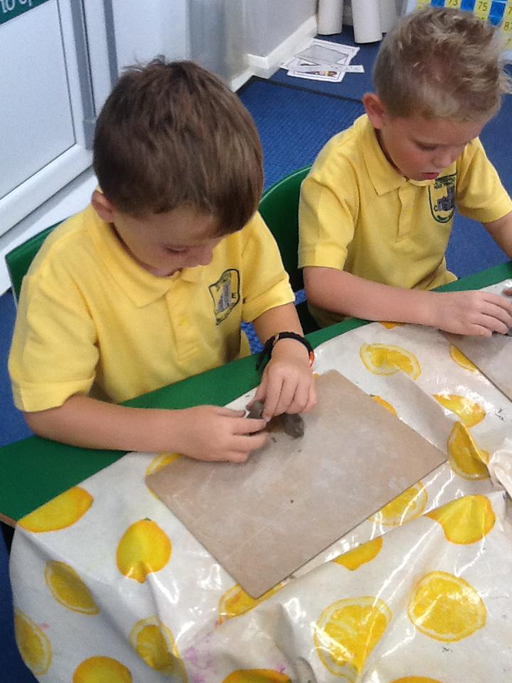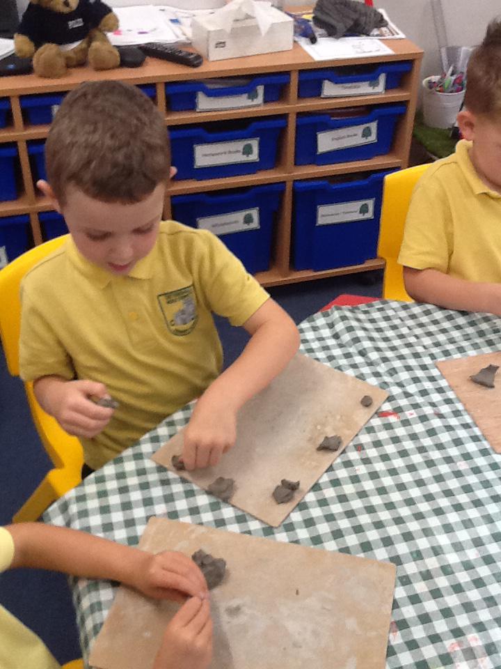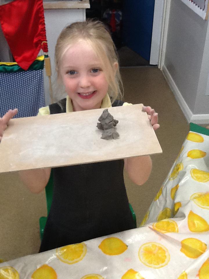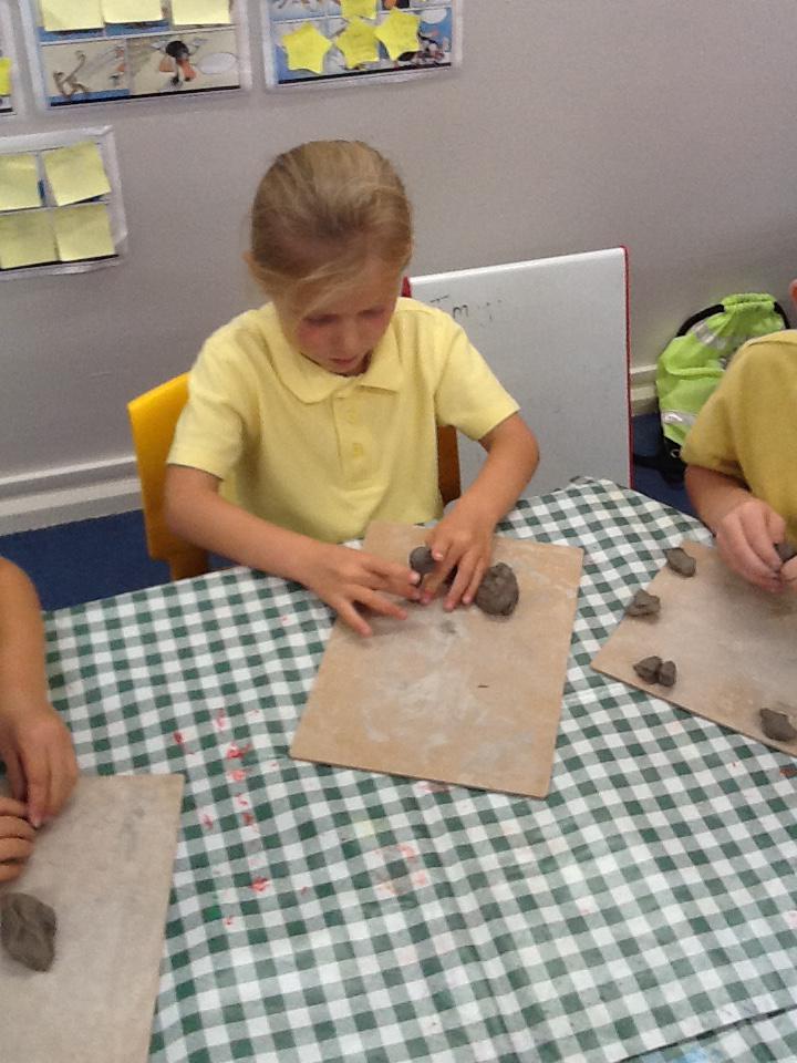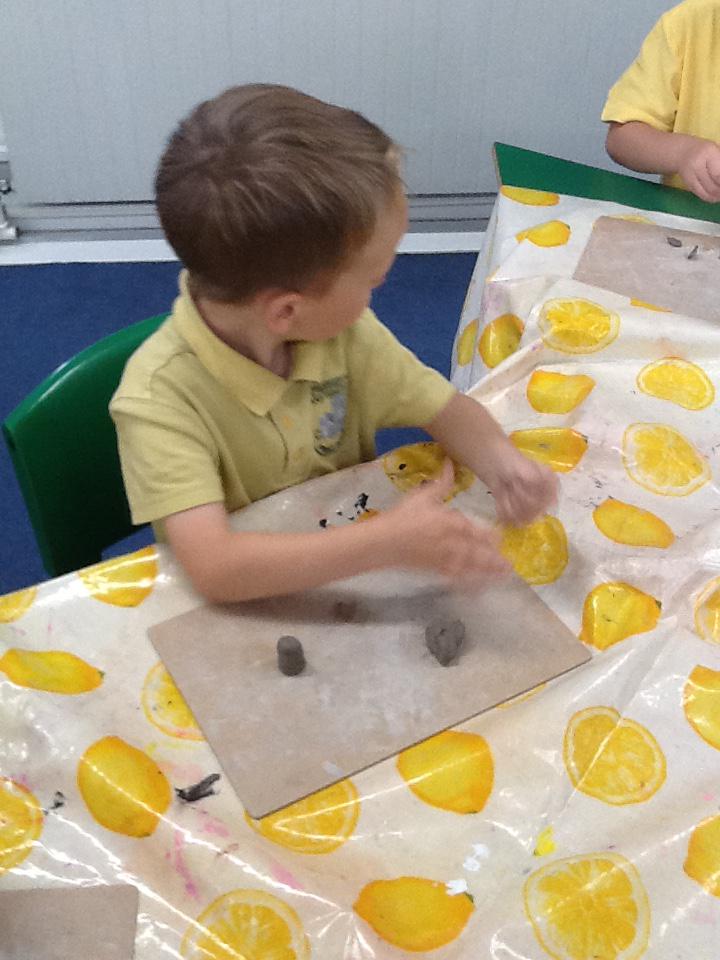 This week we have been using clay. We began by sketching our Bertie sculpture thinking about proportion. We then used our fingers to mould the clay into different shapes before putting them together for our final piece. It was great fun to use clay and our sculptures were fantastic!