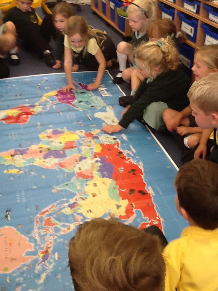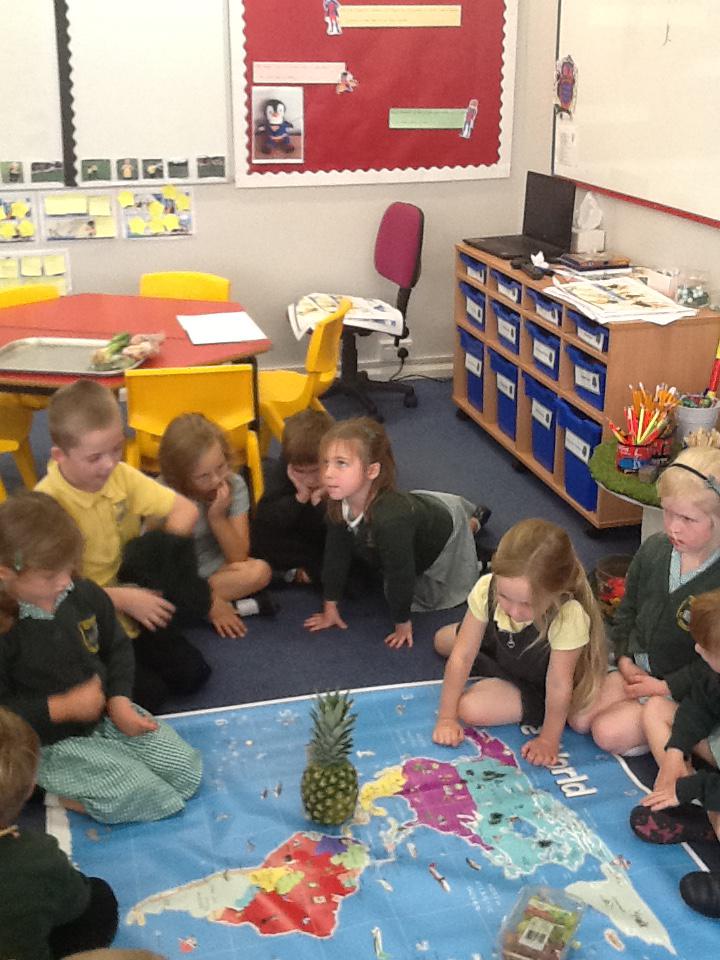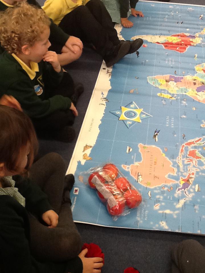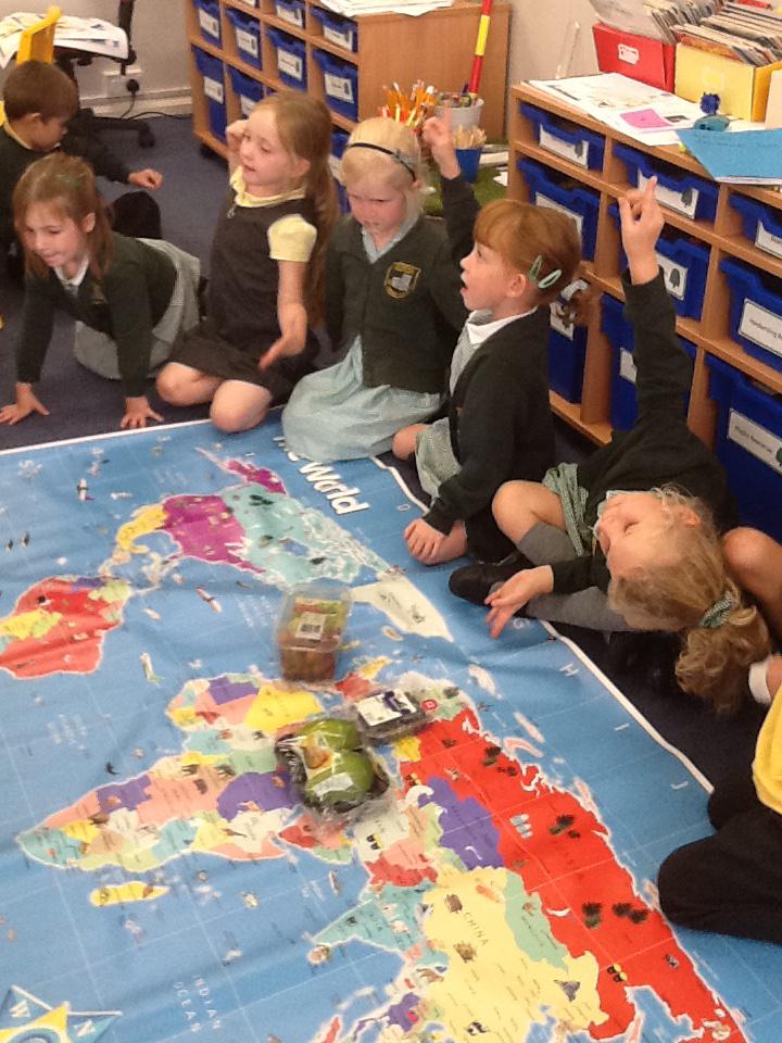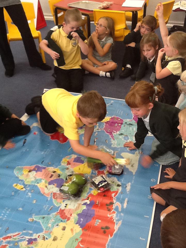 This term we are focusing on harvest time. Before our trip to Abbey Farm next week we decided to have a discussion on where our different favourite fruits and vegetables come from. We looked at a world map and identified the different places some of us had been and then tried to work out where different foods had come from and how they reach us here in the UK. It was really interesting to see where different things grow!