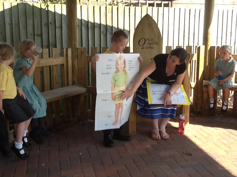 Continuing with our work on the human body this week we looked at our bones. We named different bones in our body and then looked at the organs some of them protected. We discussed what might happen if we break a bone and how x-rays can look under our skin. Because it was so warm we enjoyed a funny bones story out in the outdoor classroom.