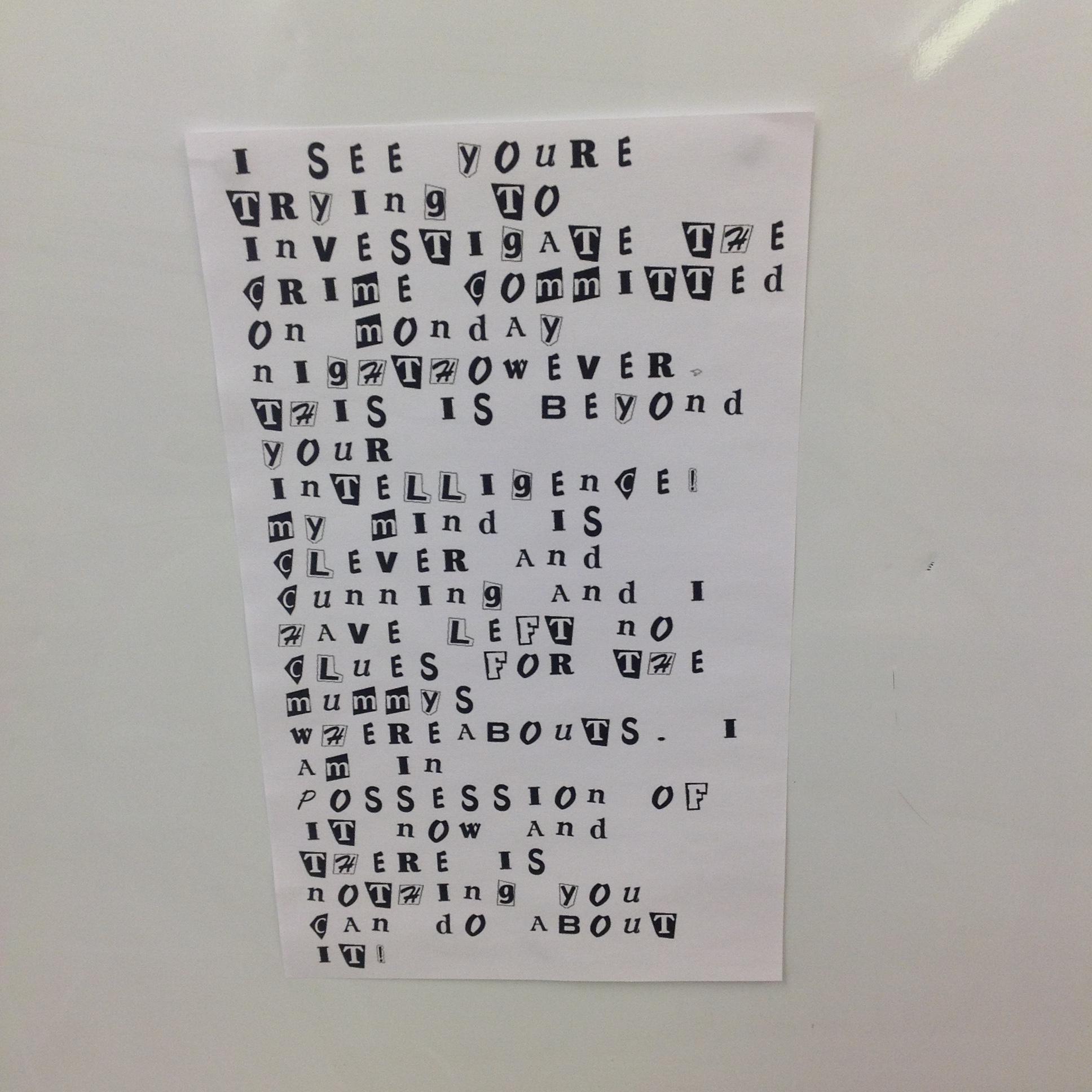 Sycamore discovered a ransom note from the burglar this morning! Perhaps this is another clue?
