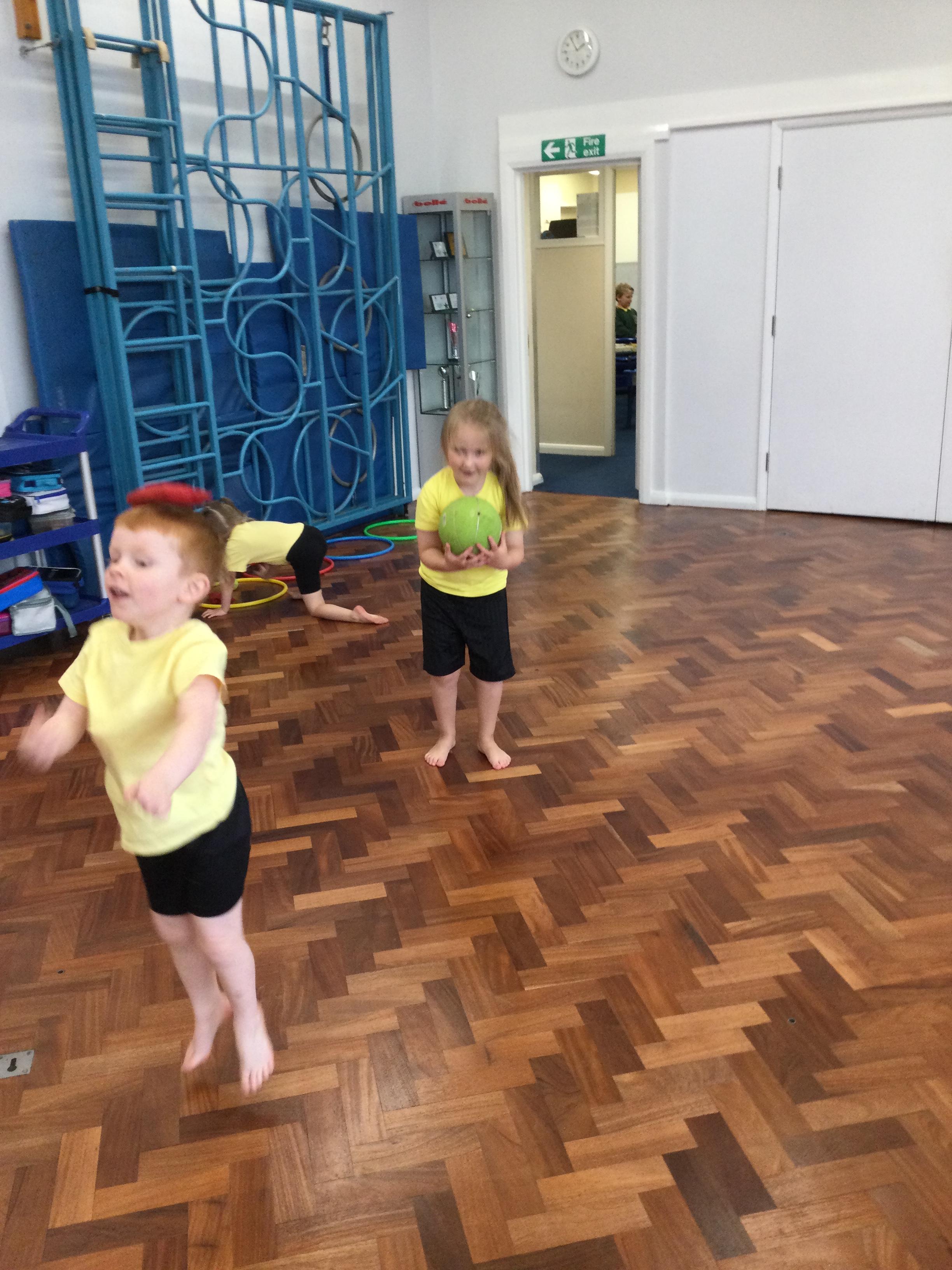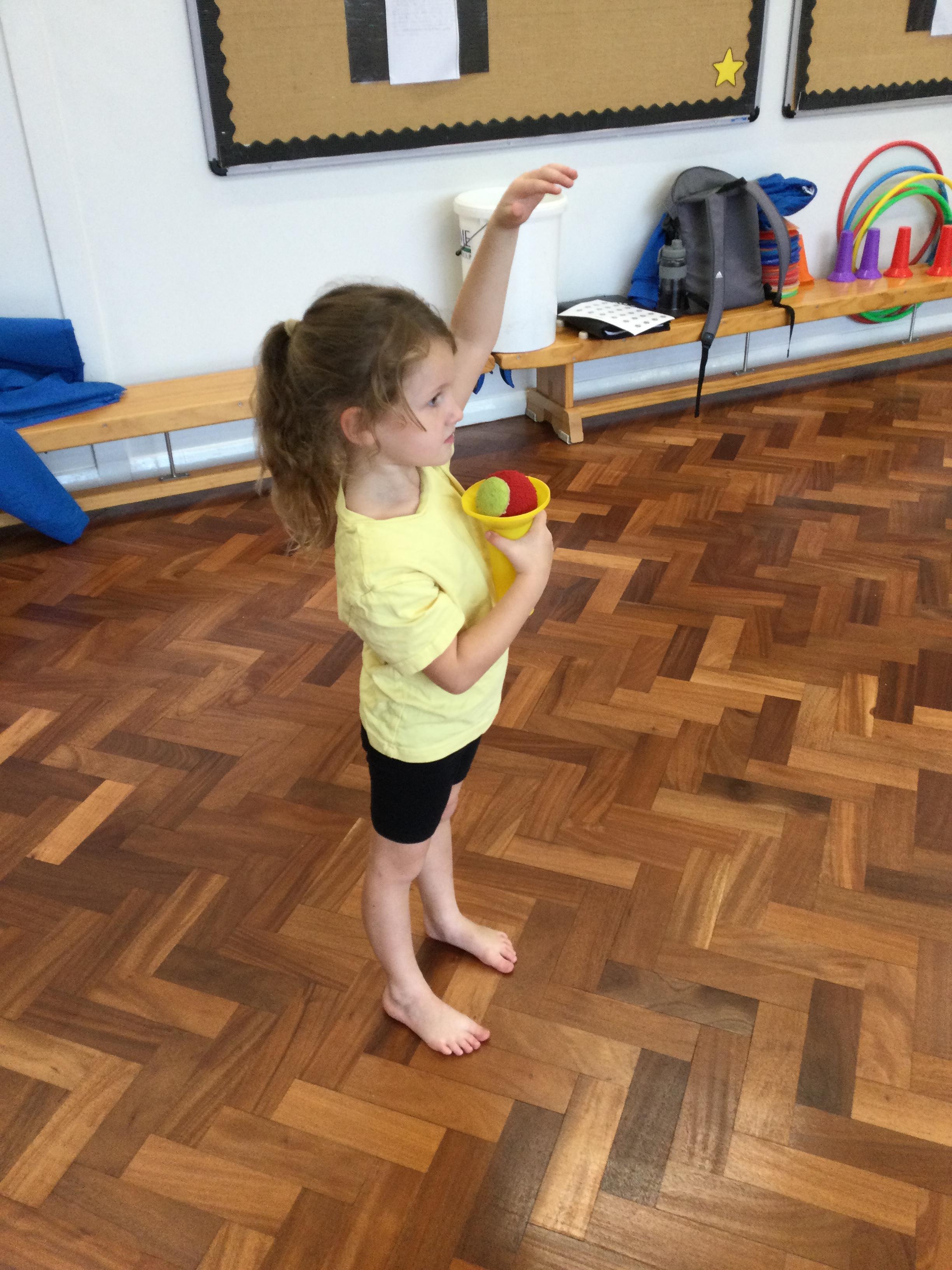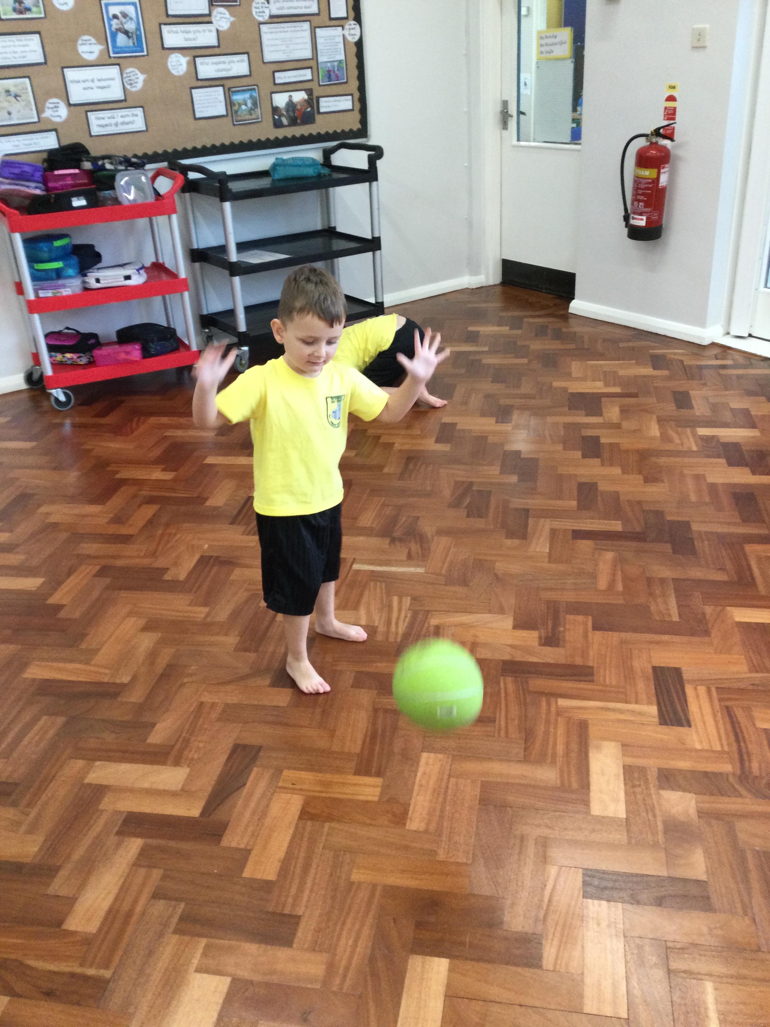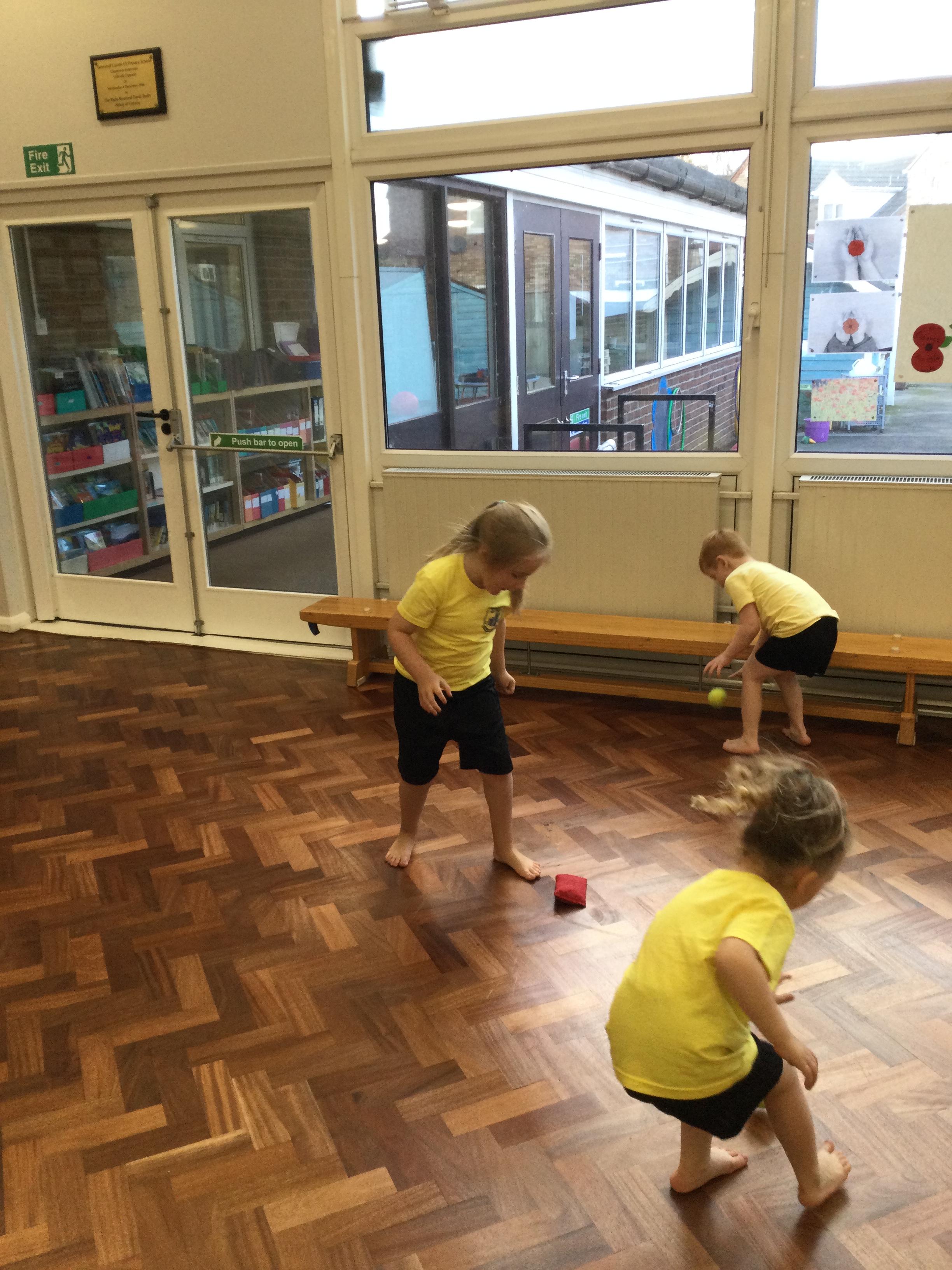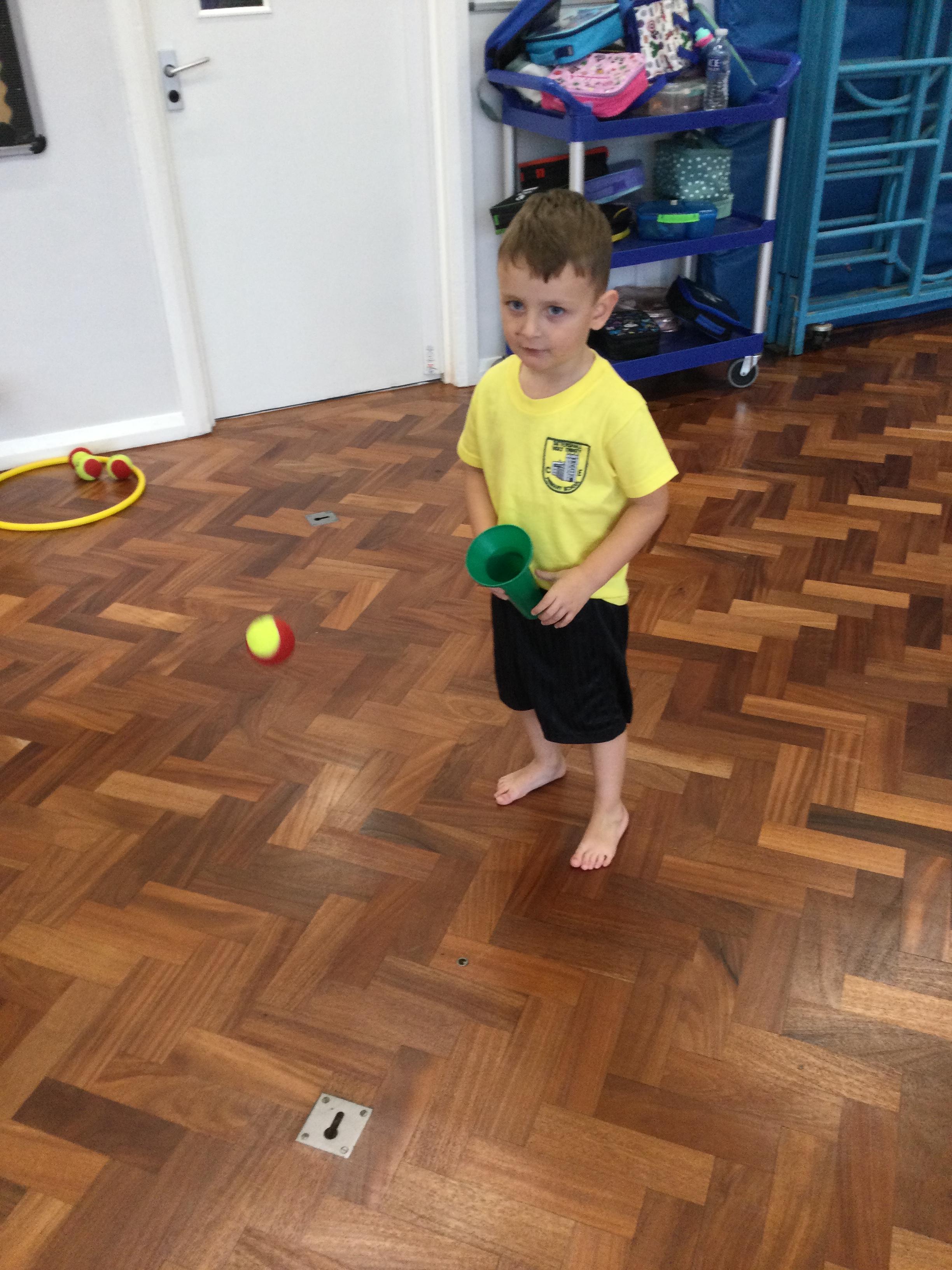Today the children experimented with different equipment. This included a big ball, small ball and a bean bag. The children had to come up with different things they could do with their equipment.