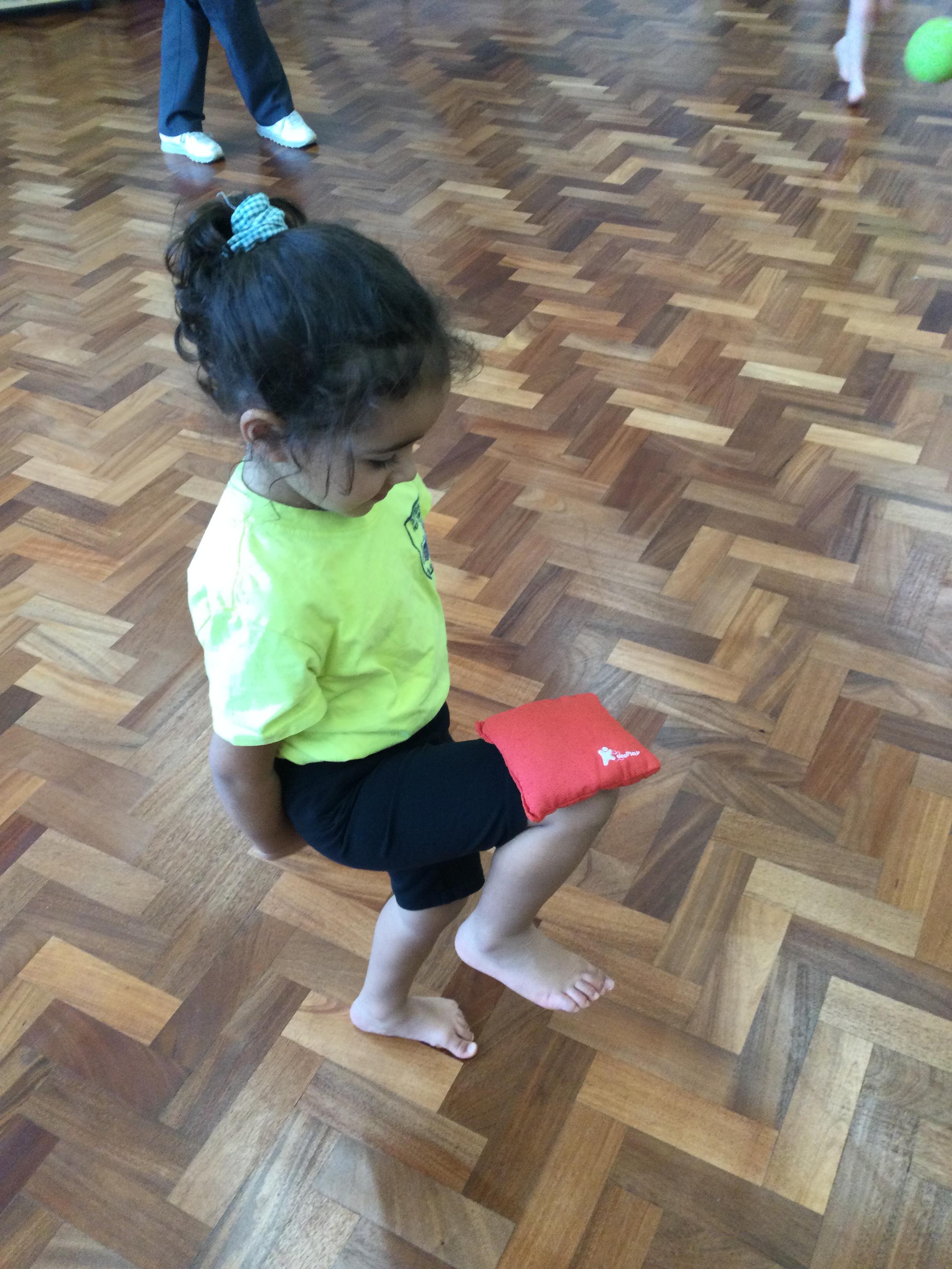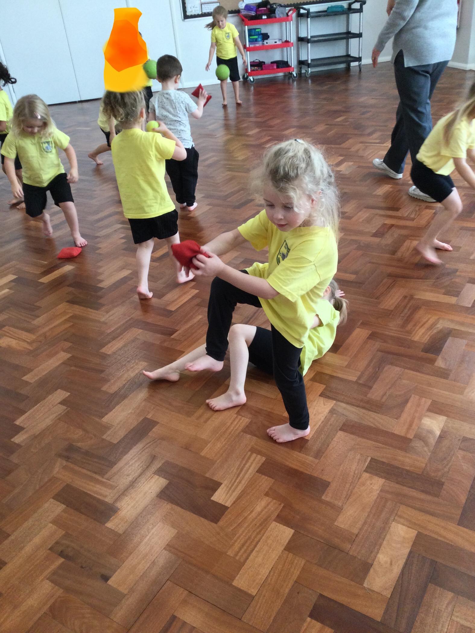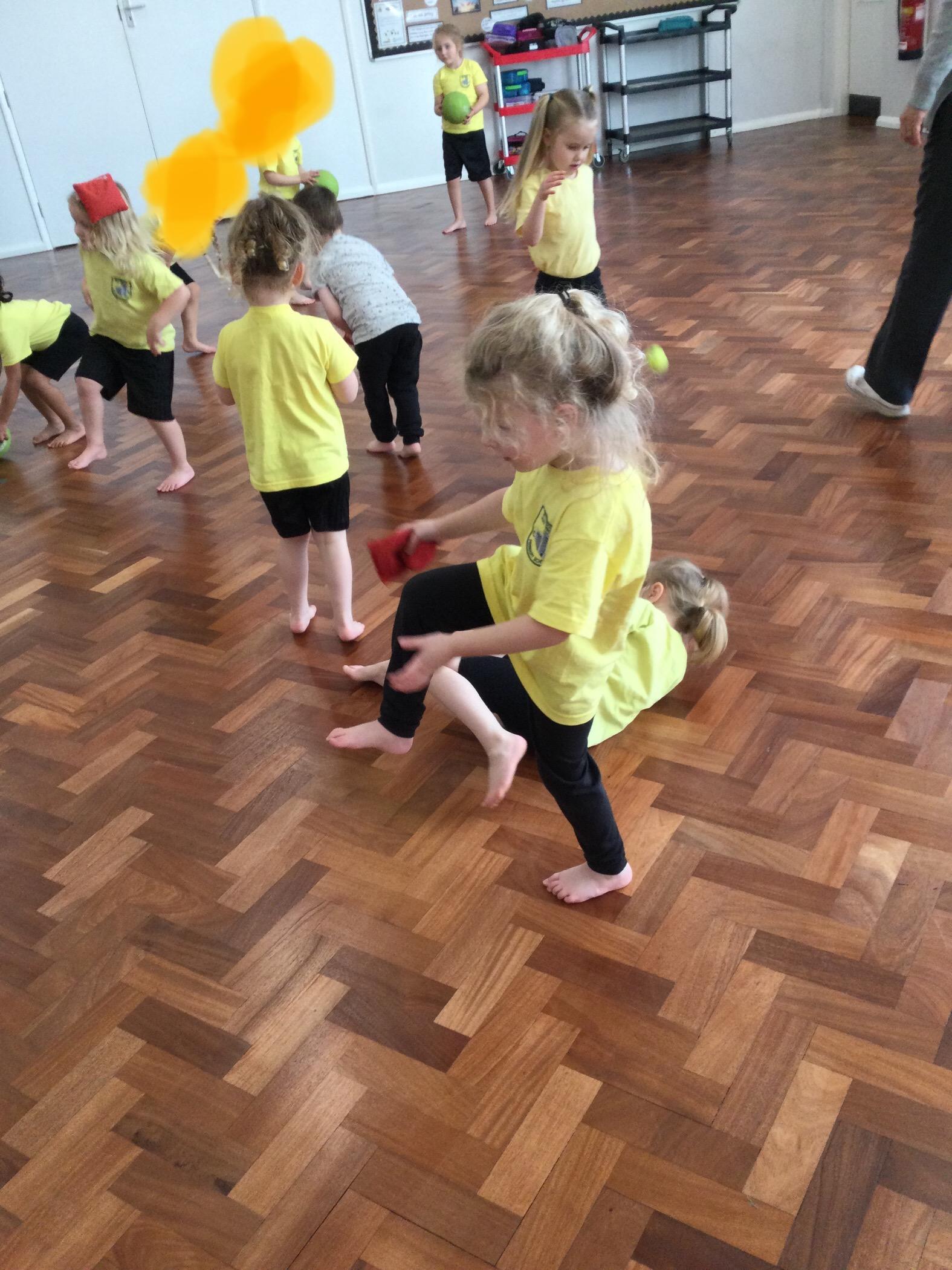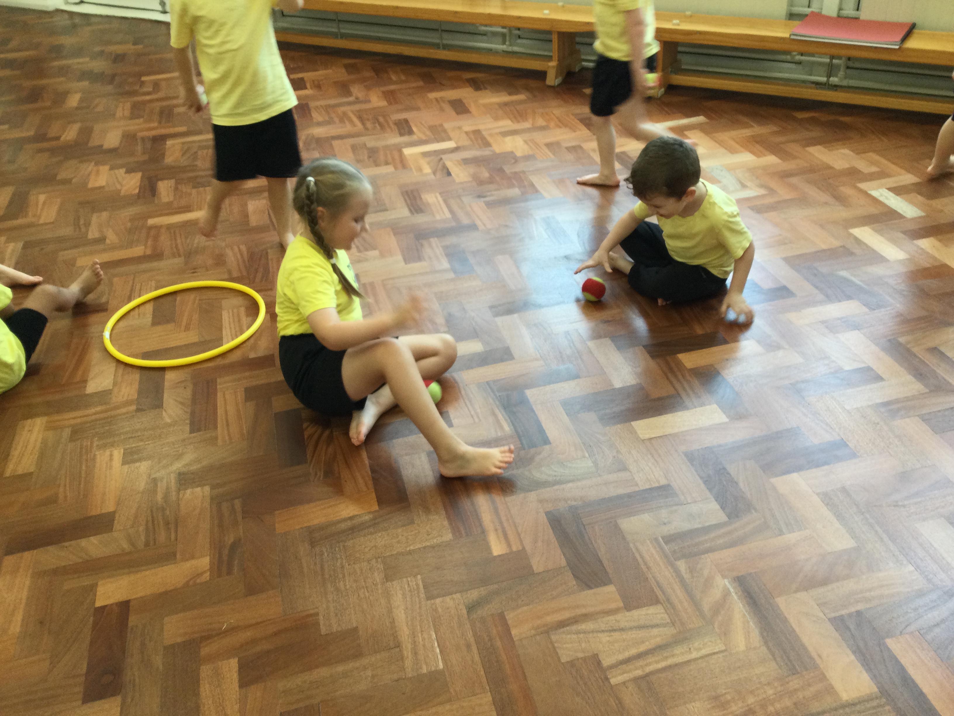 Today the children experimented with different equipment. This included a big ball, small ball and a bean bag. The children had to come up with different things they could do with their equipment.