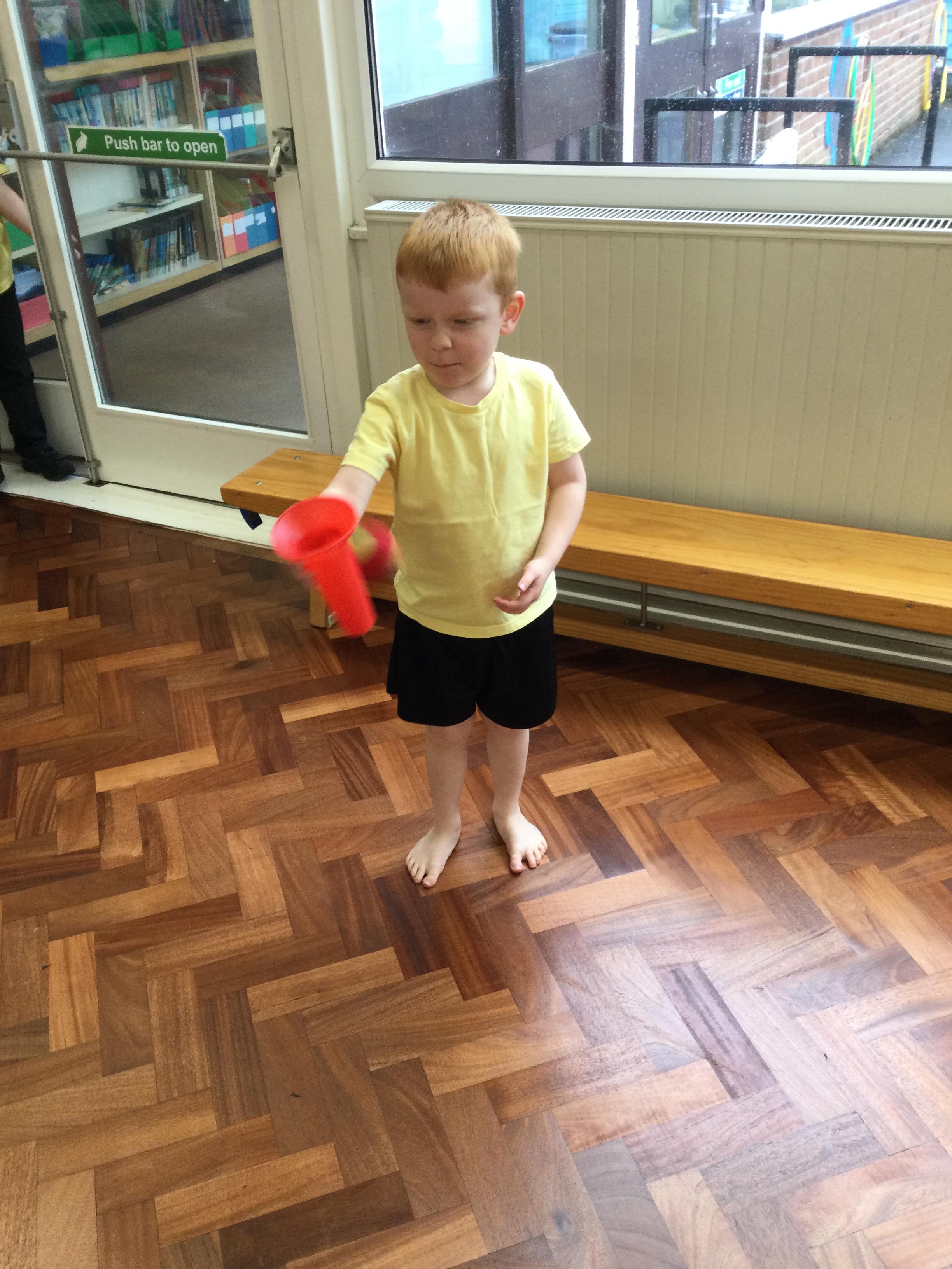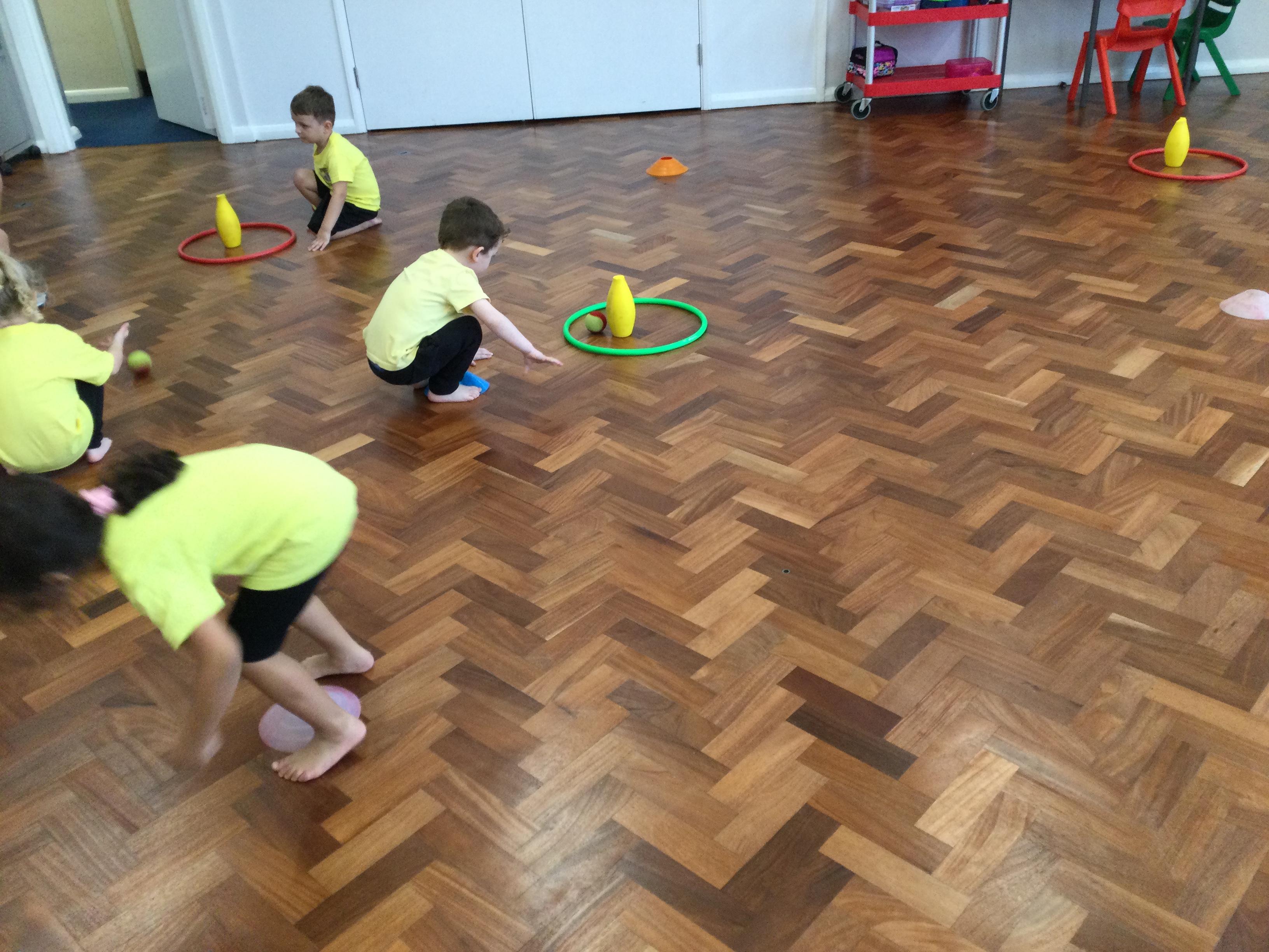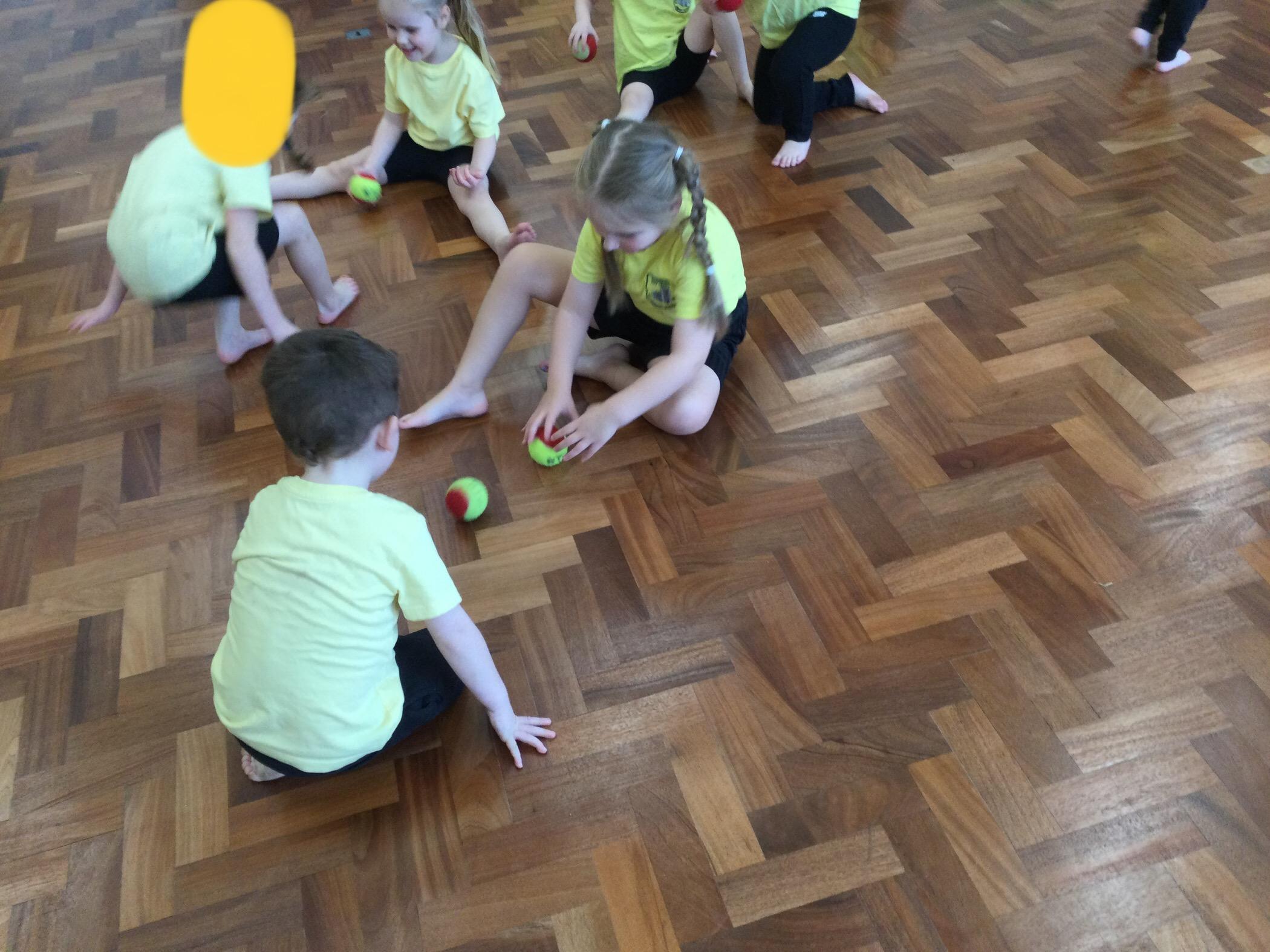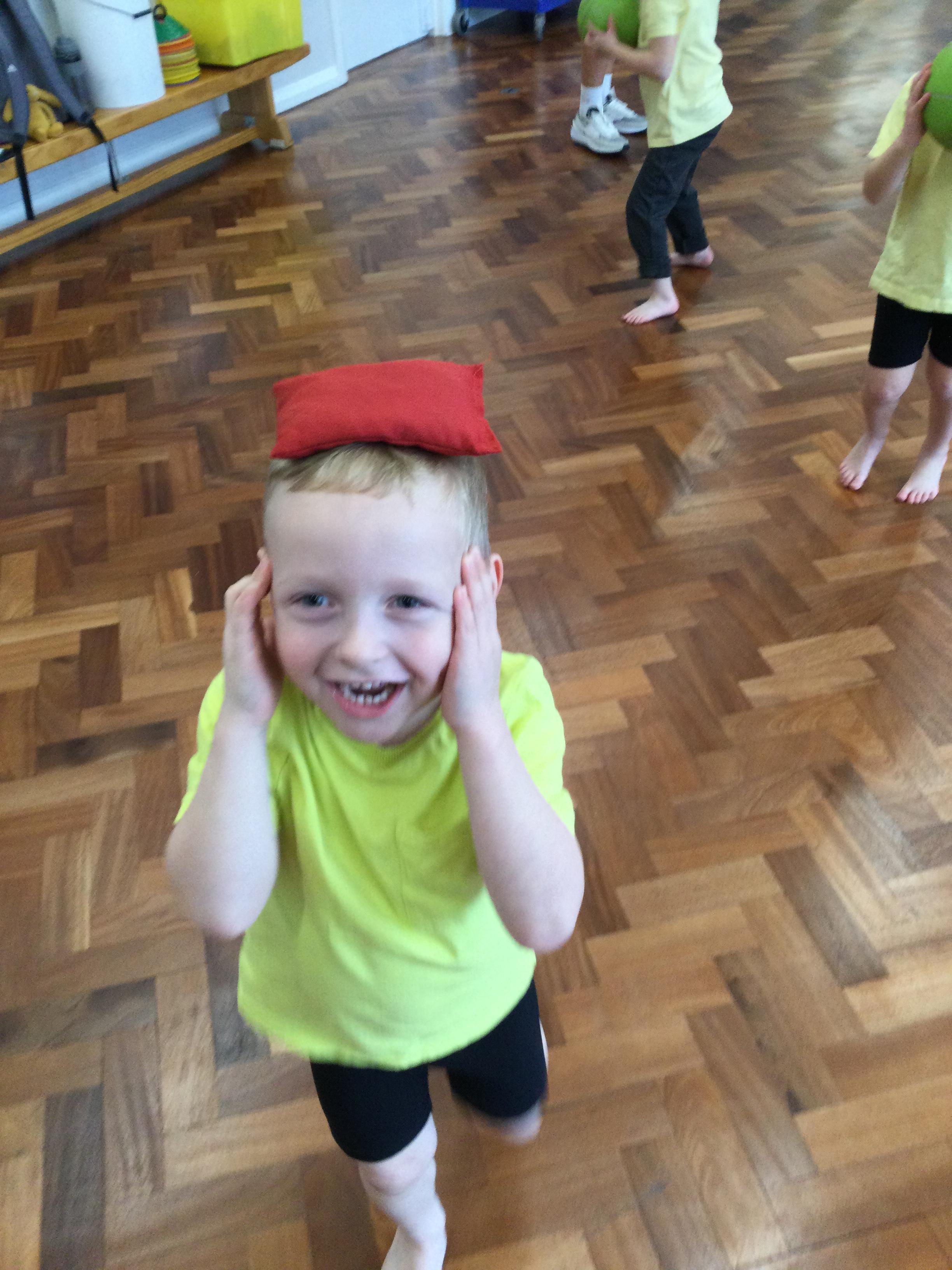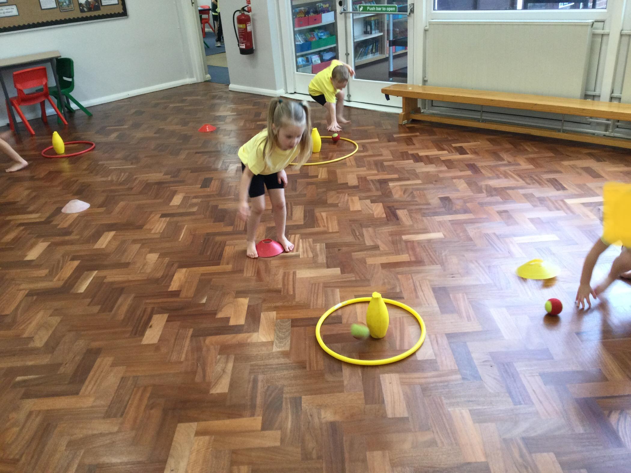 Today the children experimented with different equipment. This included a big ball, small ball and a bean bag. The children had to come up with different things they could do with their equipment.
