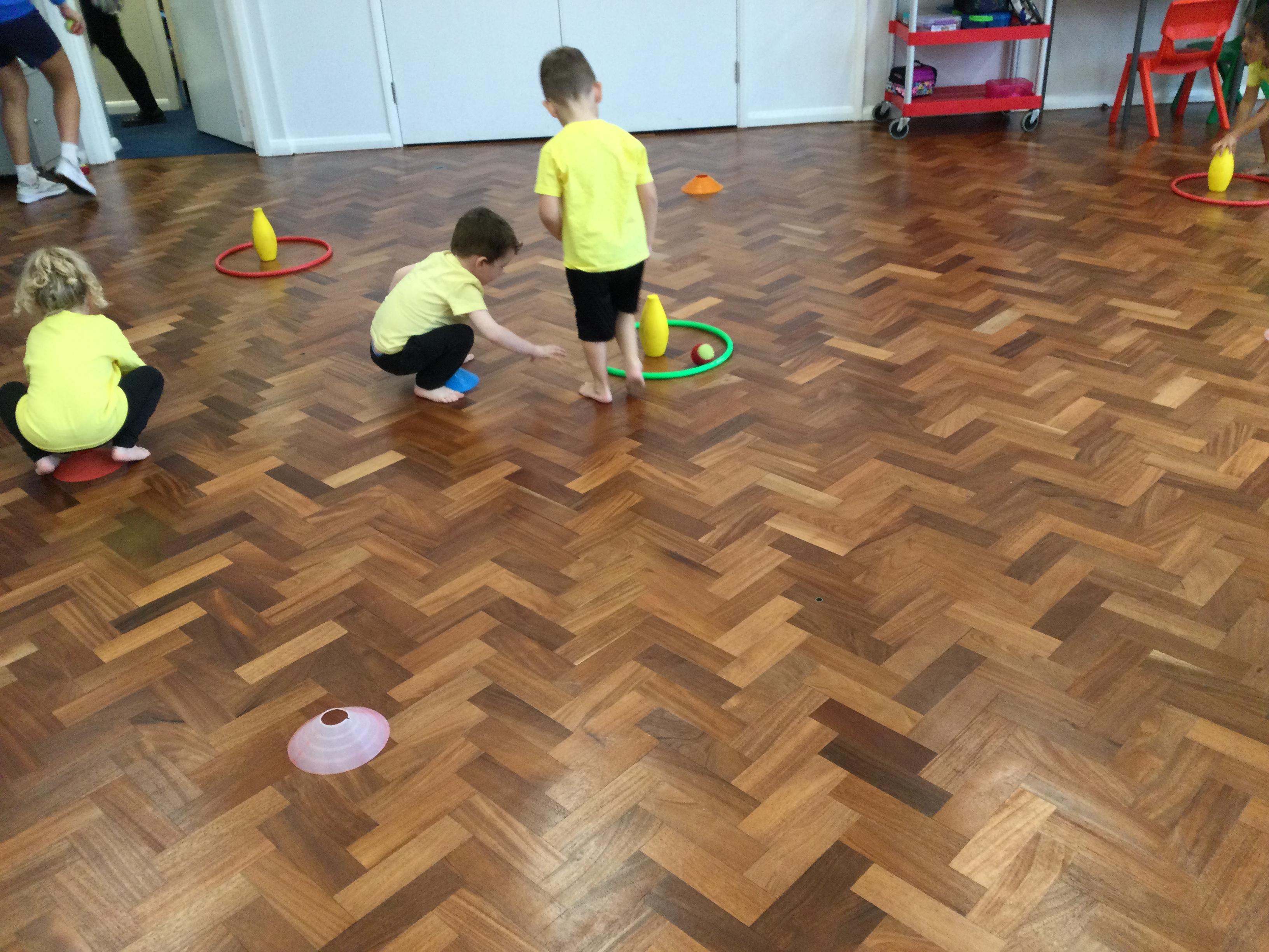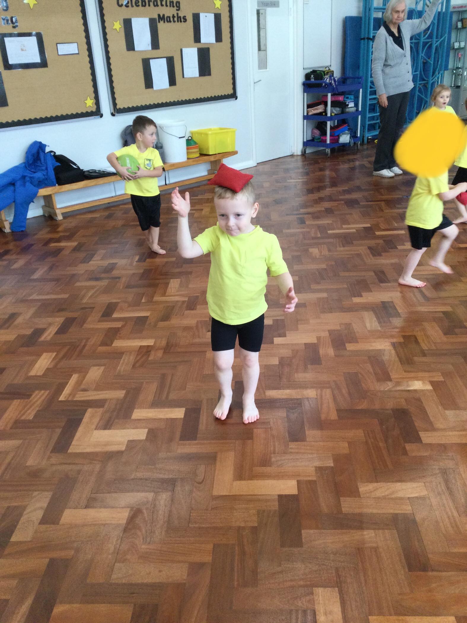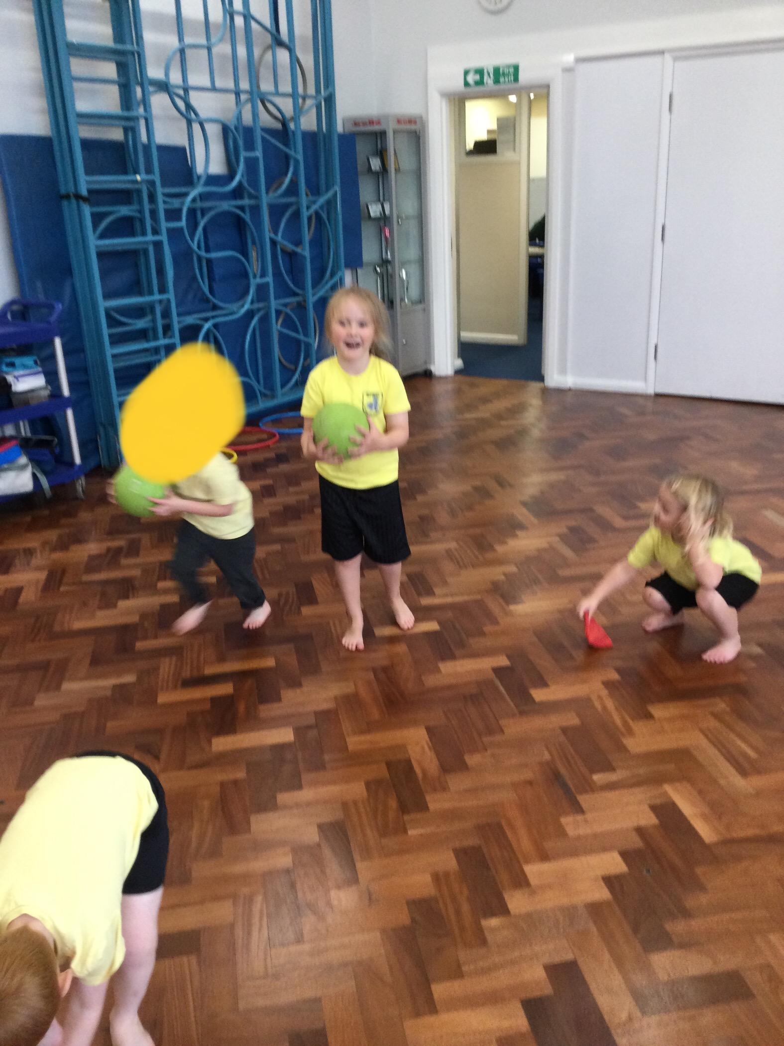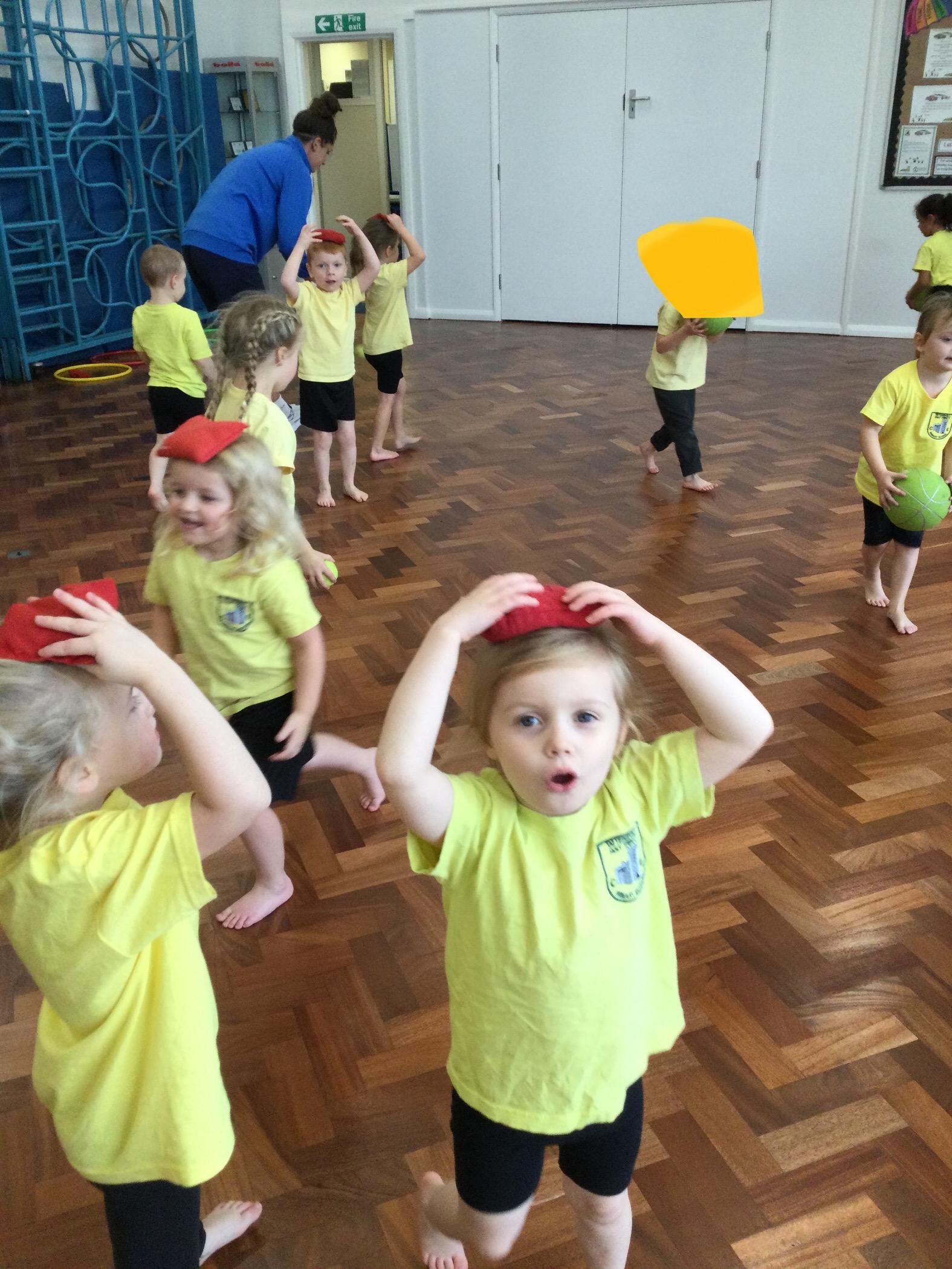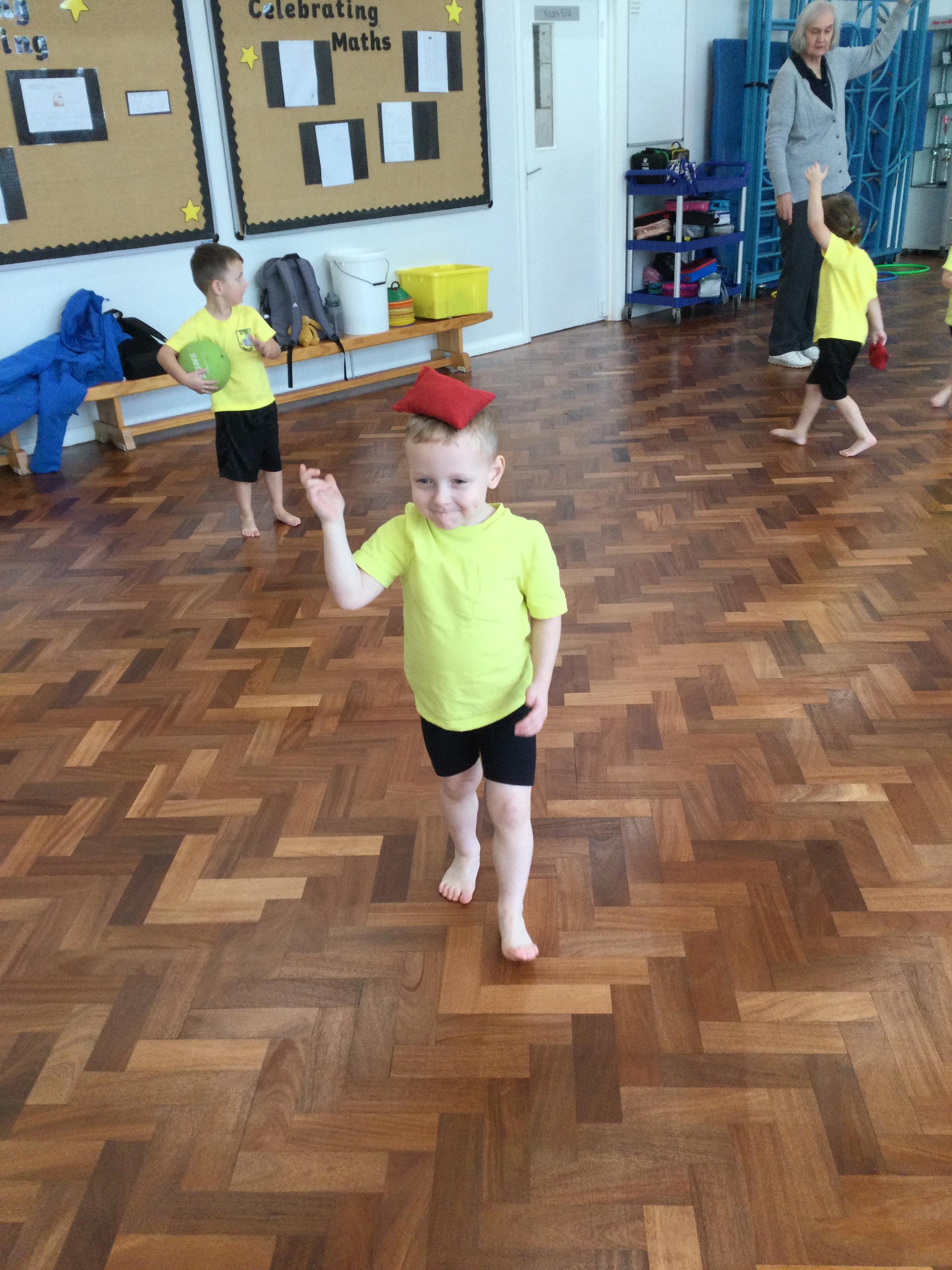 Today the children experimented with different equipment. This included a big ball, small ball and a bean bag. The children had to come up with different things they could do with their equipment.