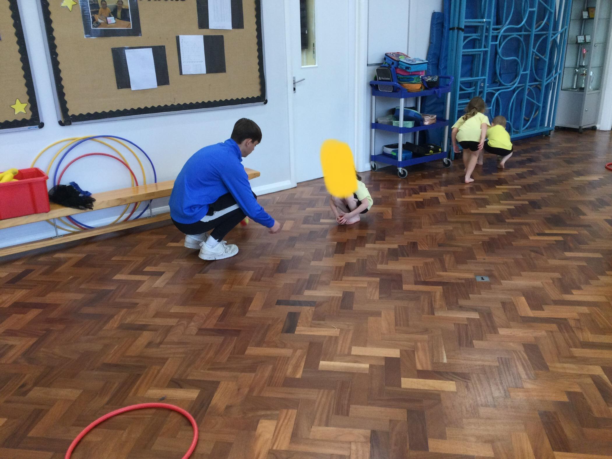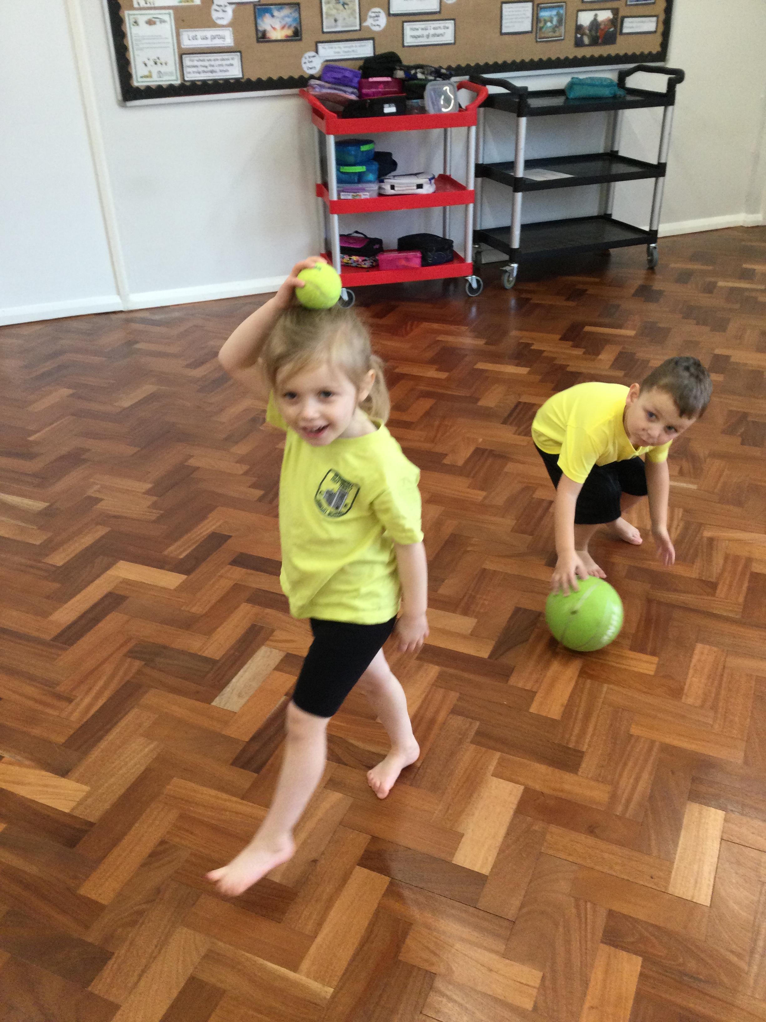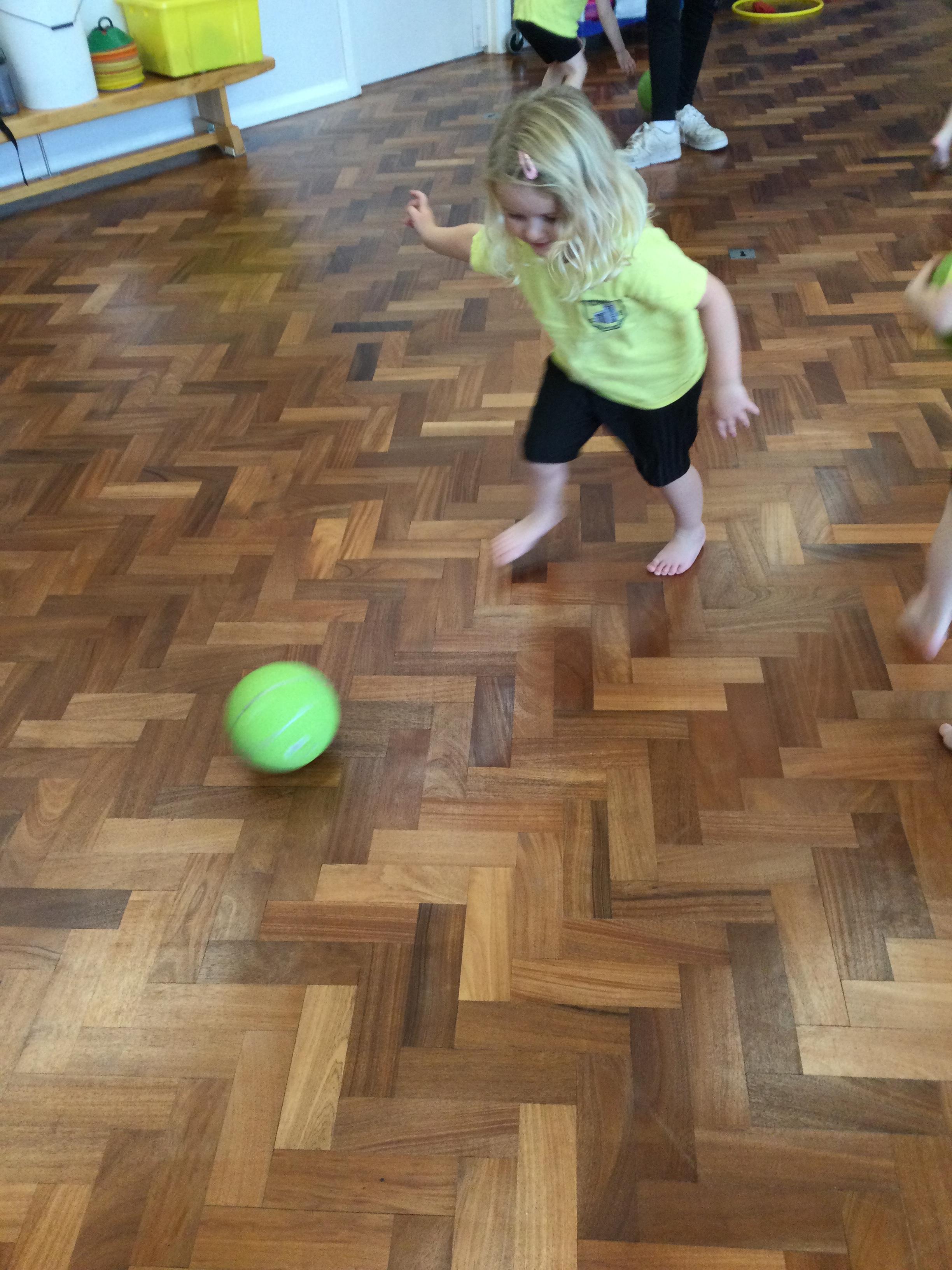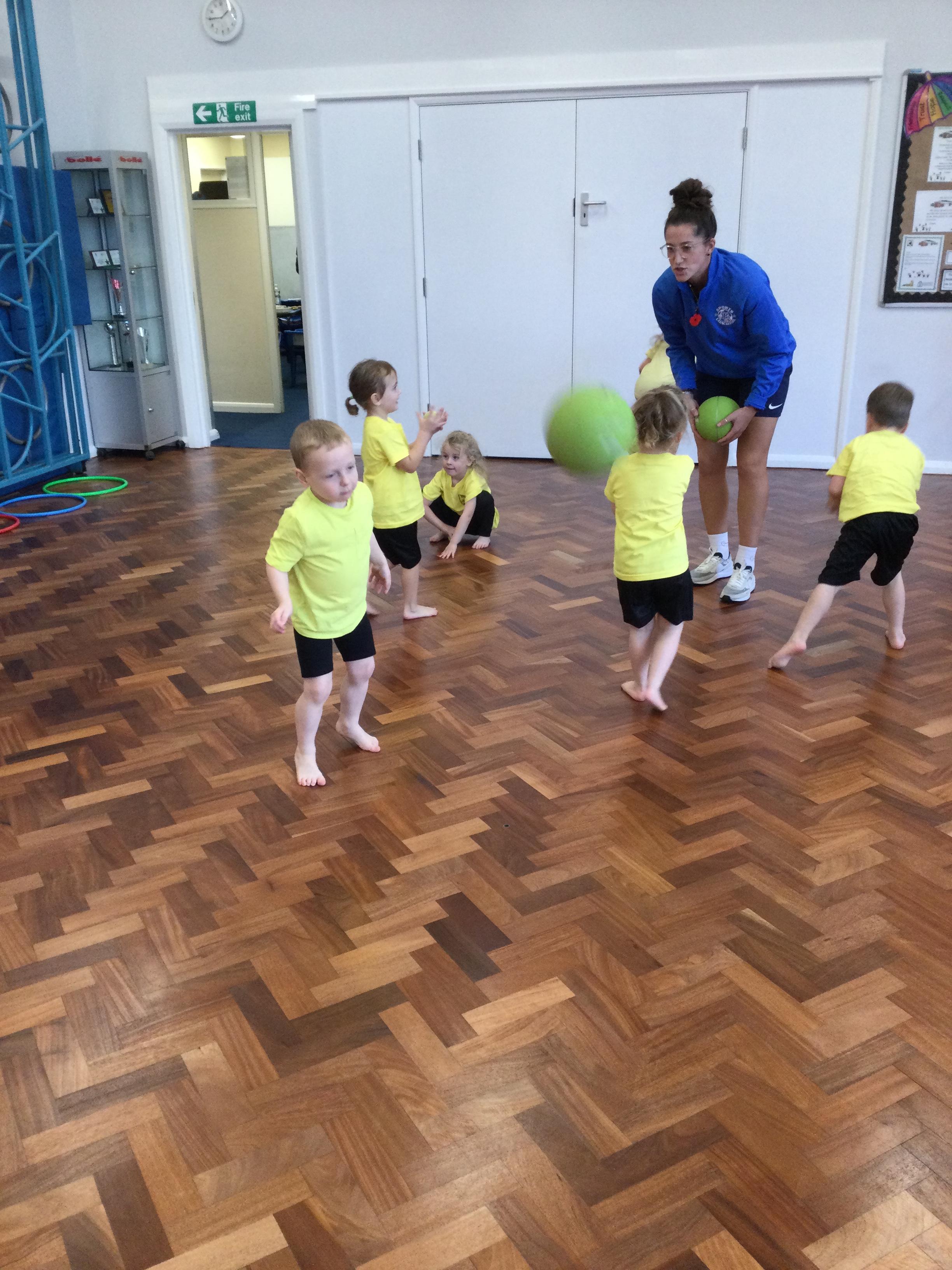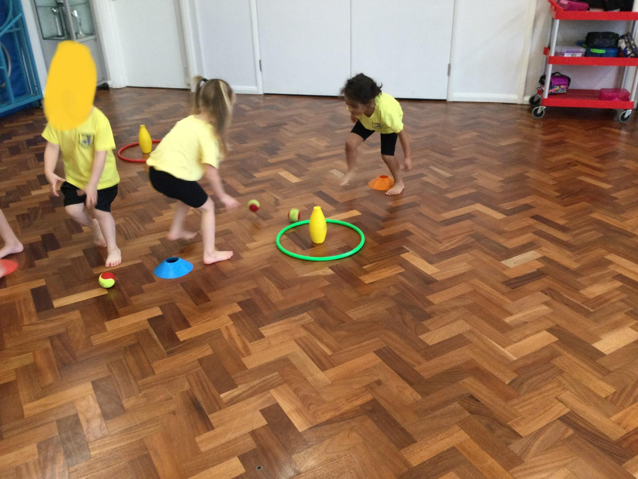 Today the children experimented with different equipment. This included a big ball, small ball and a bean bag. The children had to come up with different things they could do with their equipment.