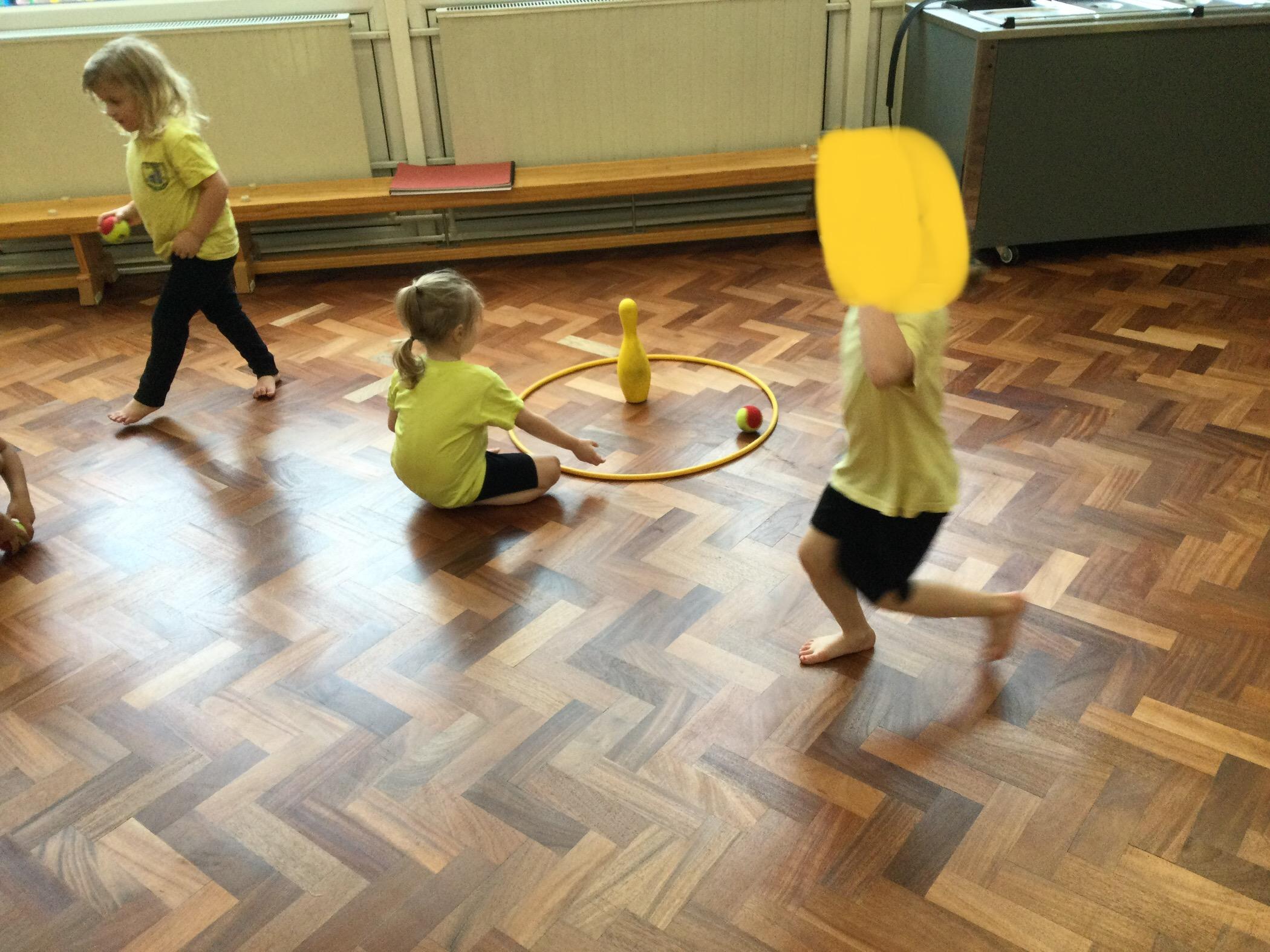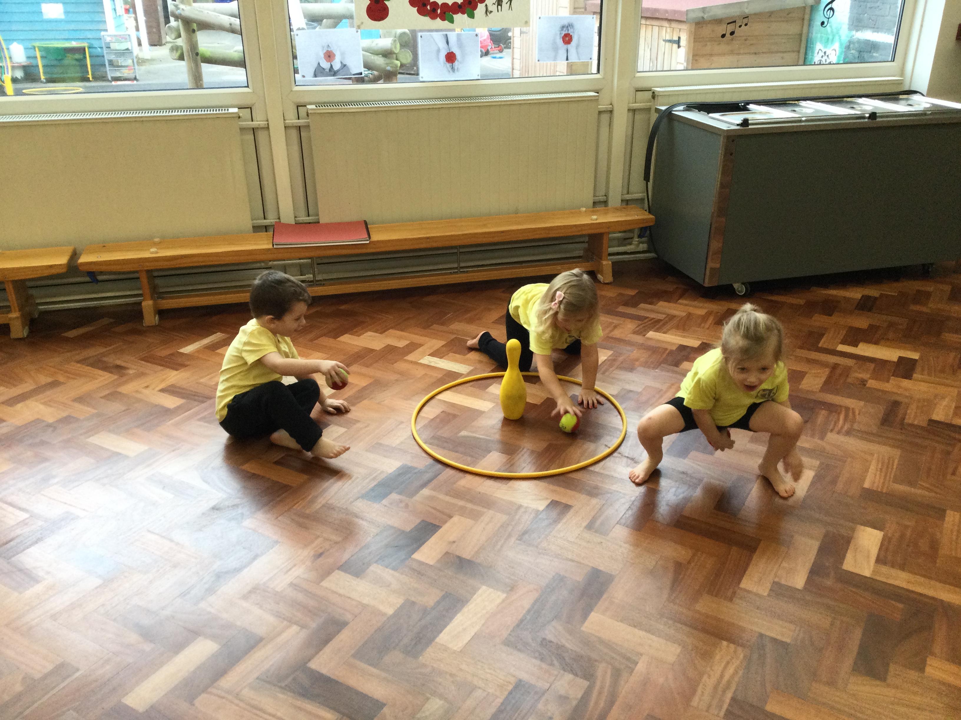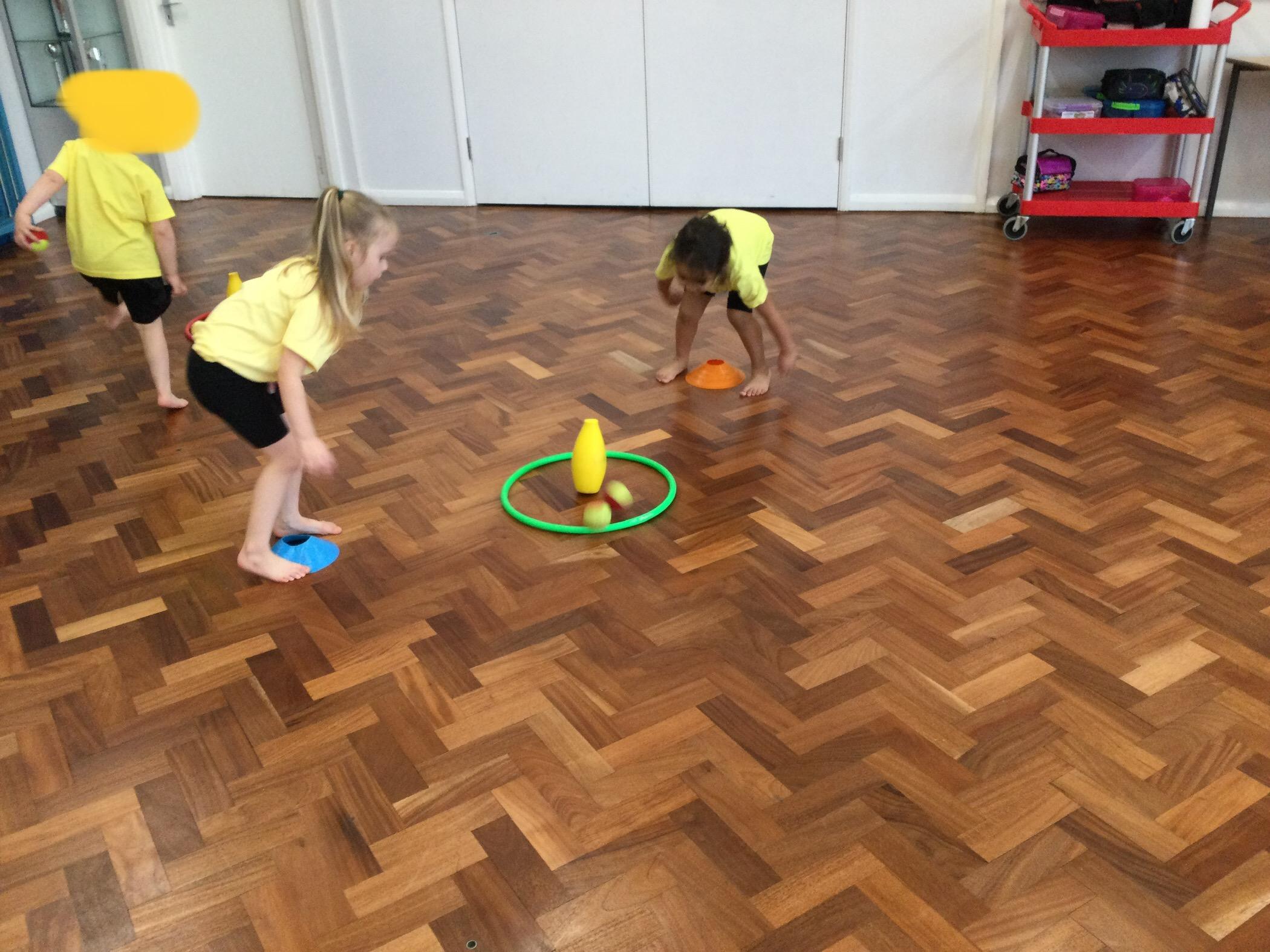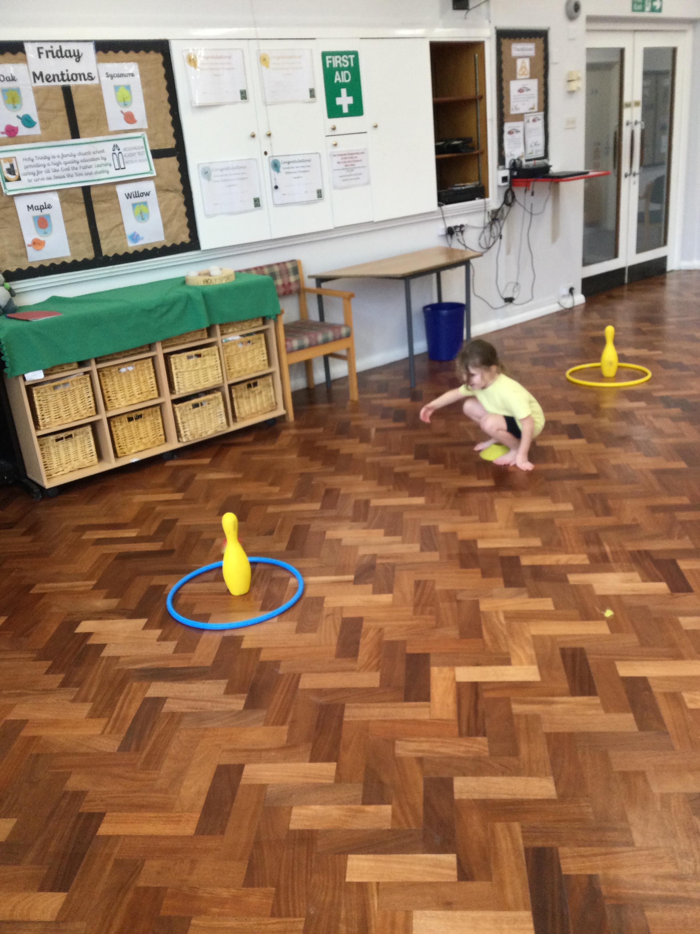 Today in PE the children warmed up by moving in different ways and running into a coloured hoop when shark was called out. They then moved on to rolling balls to each other, rolling it along the ground into a hoop, rolling it to hit a cone and then moving on to hitting a skittle and trying to knock it down.