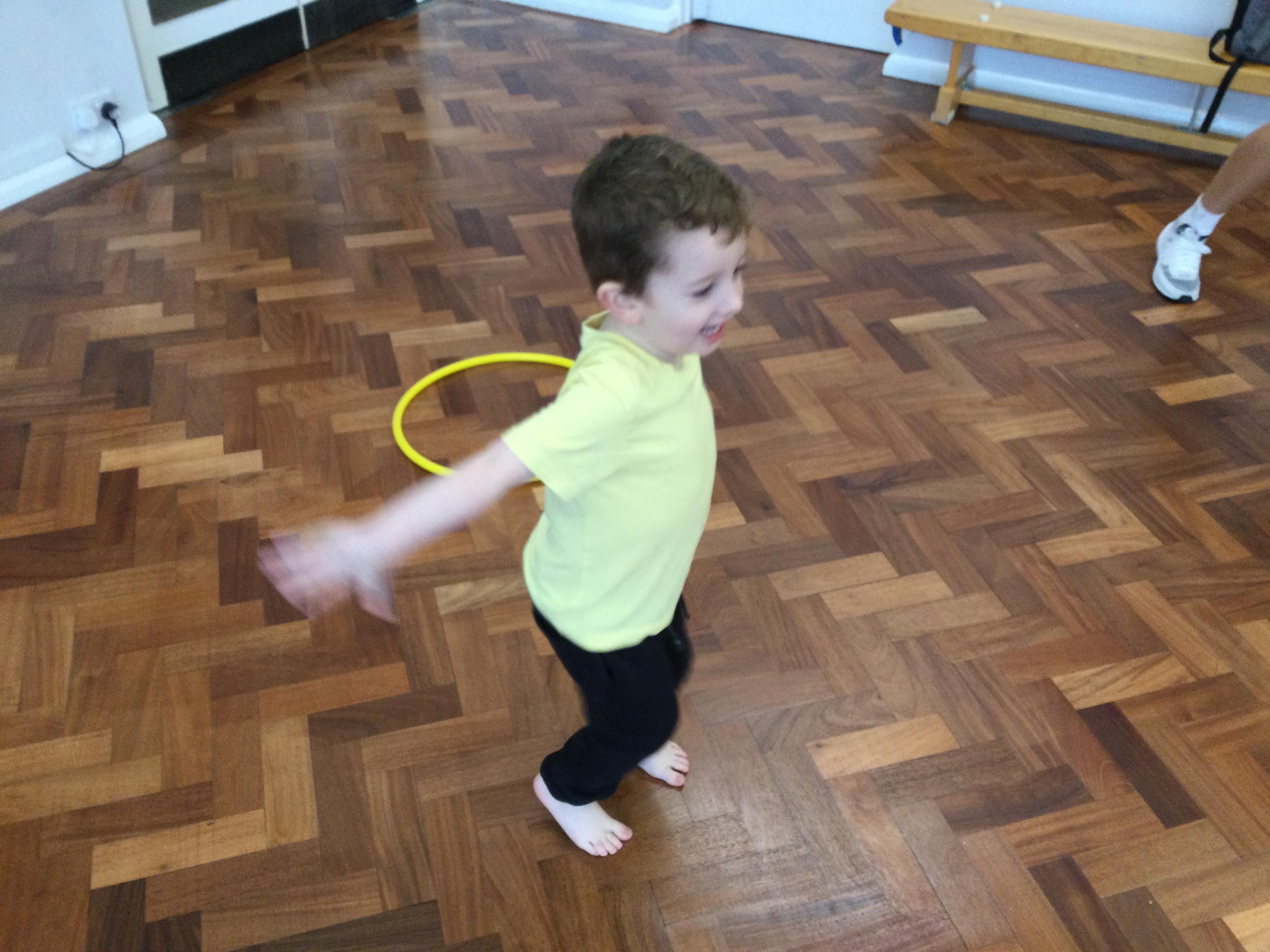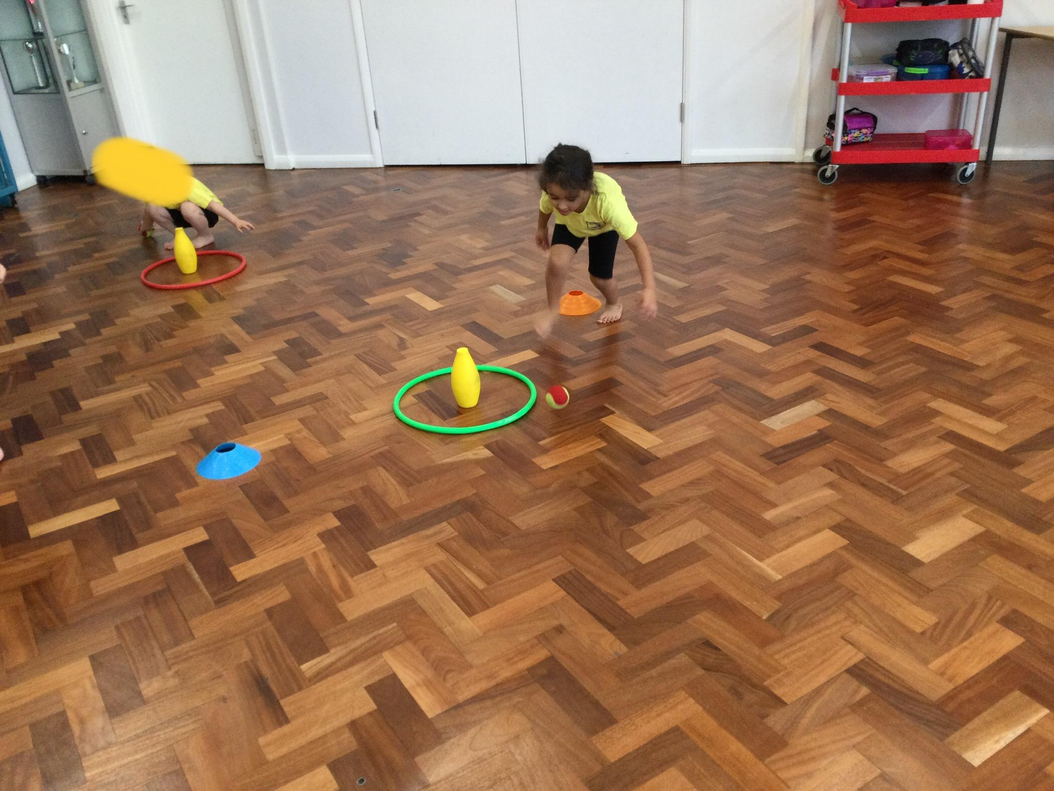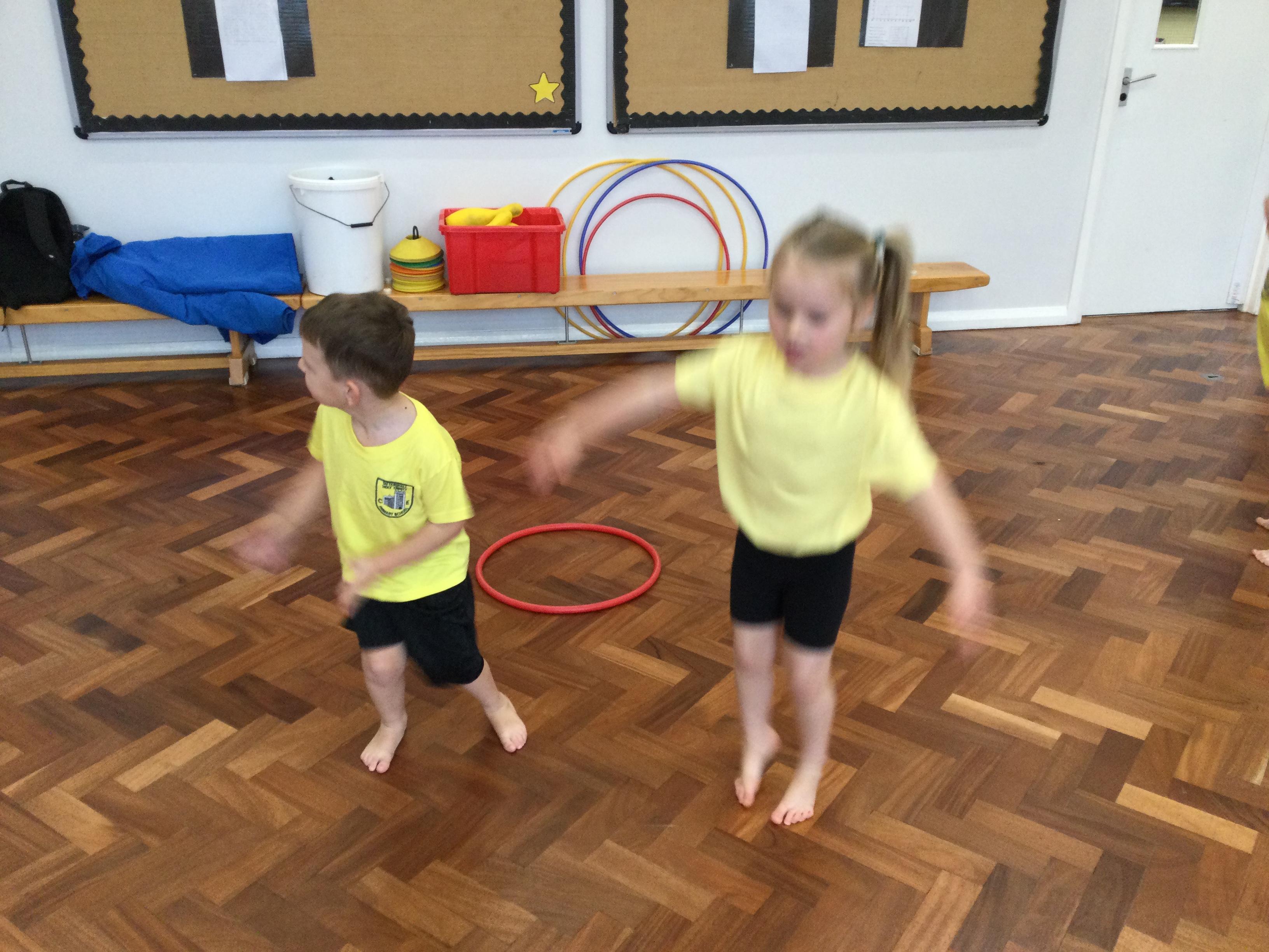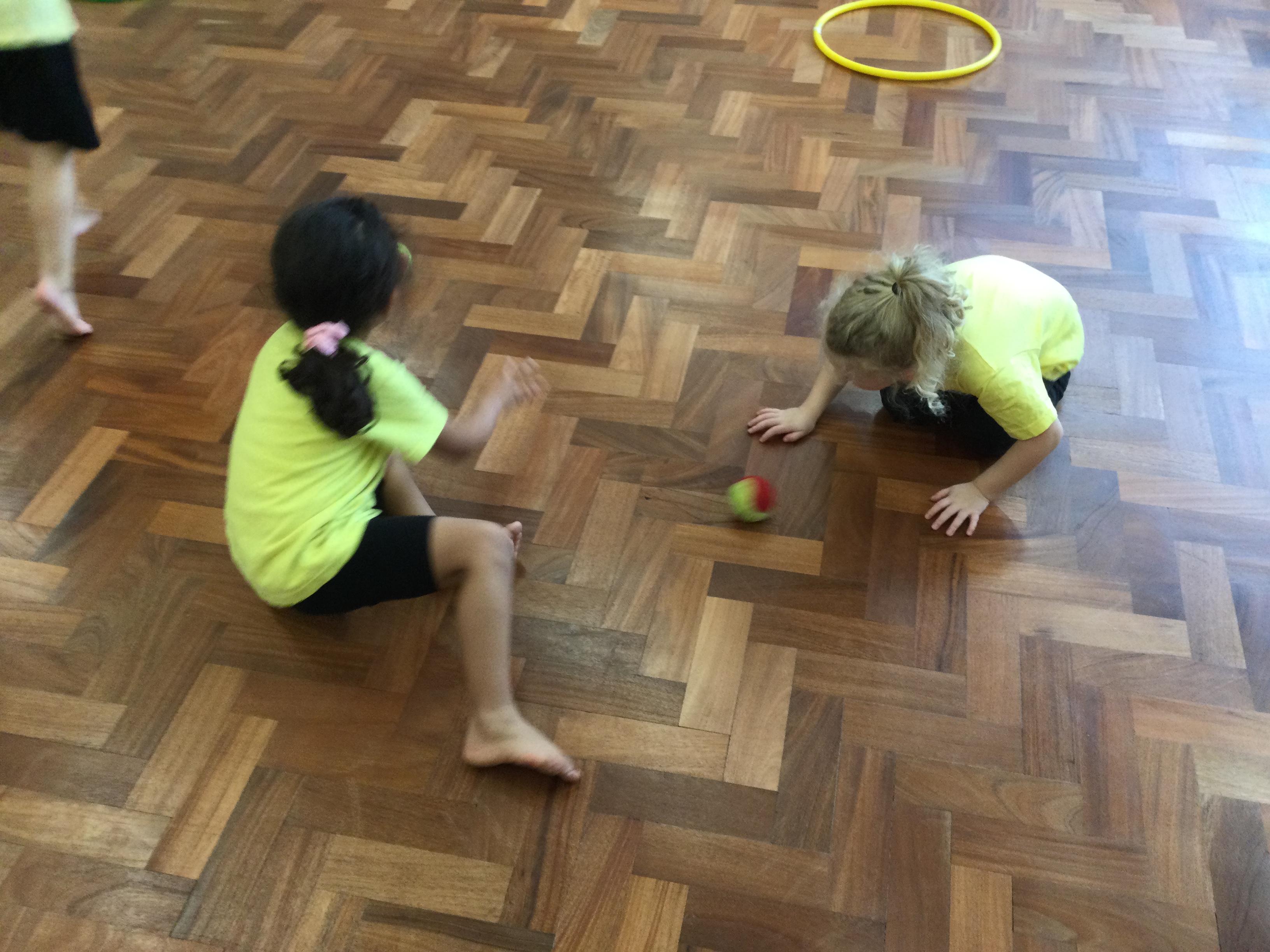 Today in PE the children warmed up by moving in different ways and running into a coloured hoop when shark was called out. They then moved on to rolling balls to each other, rolling it along the ground into a hoop, rolling it to hit a cone and then moving on to hitting a skittle and trying to knock it down.