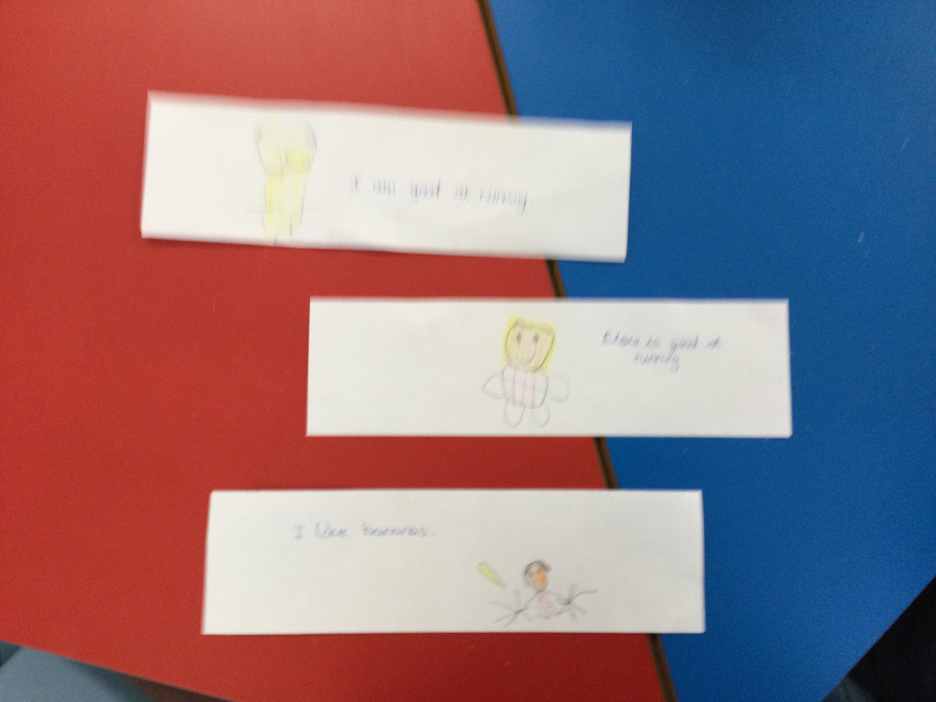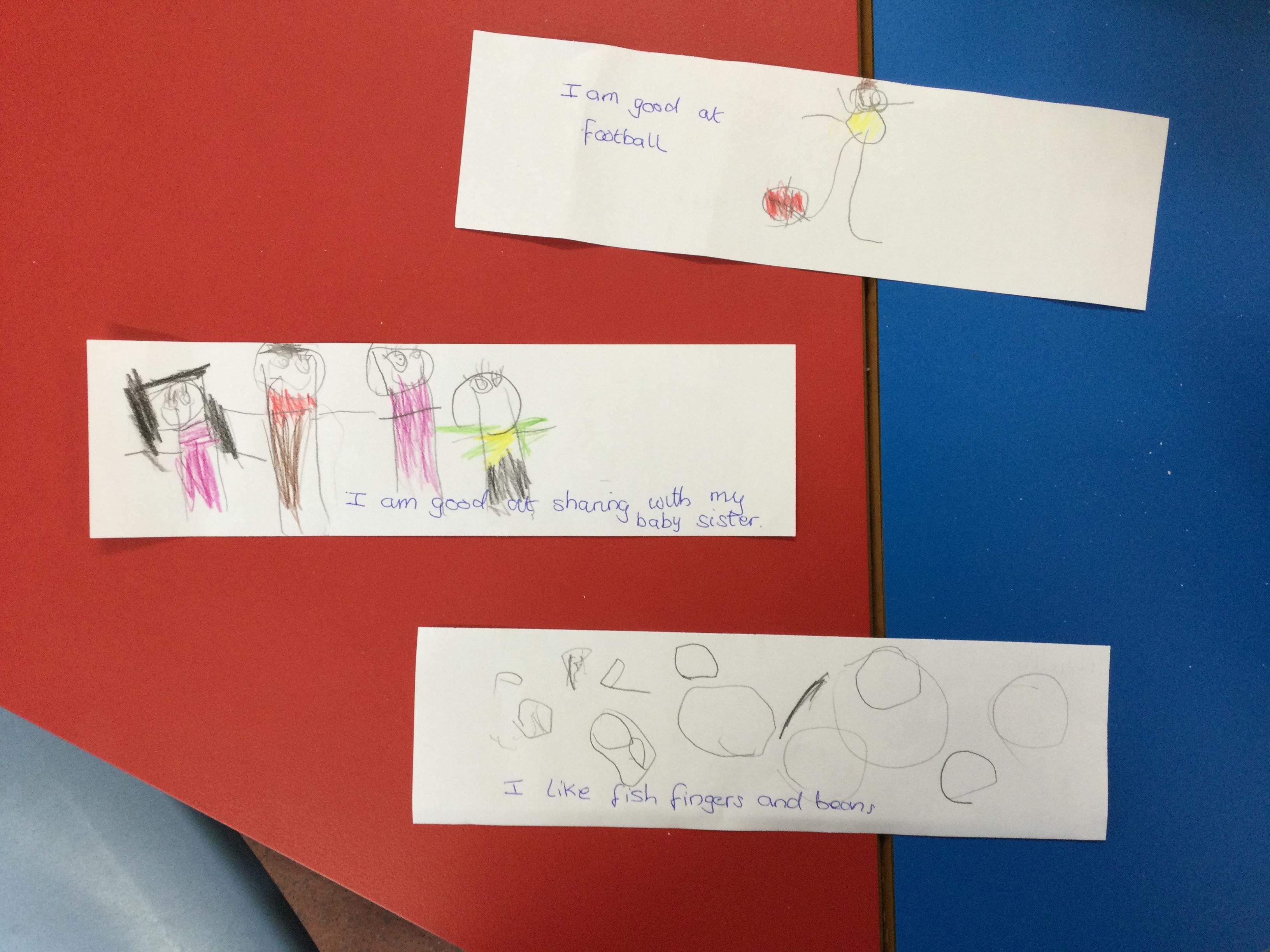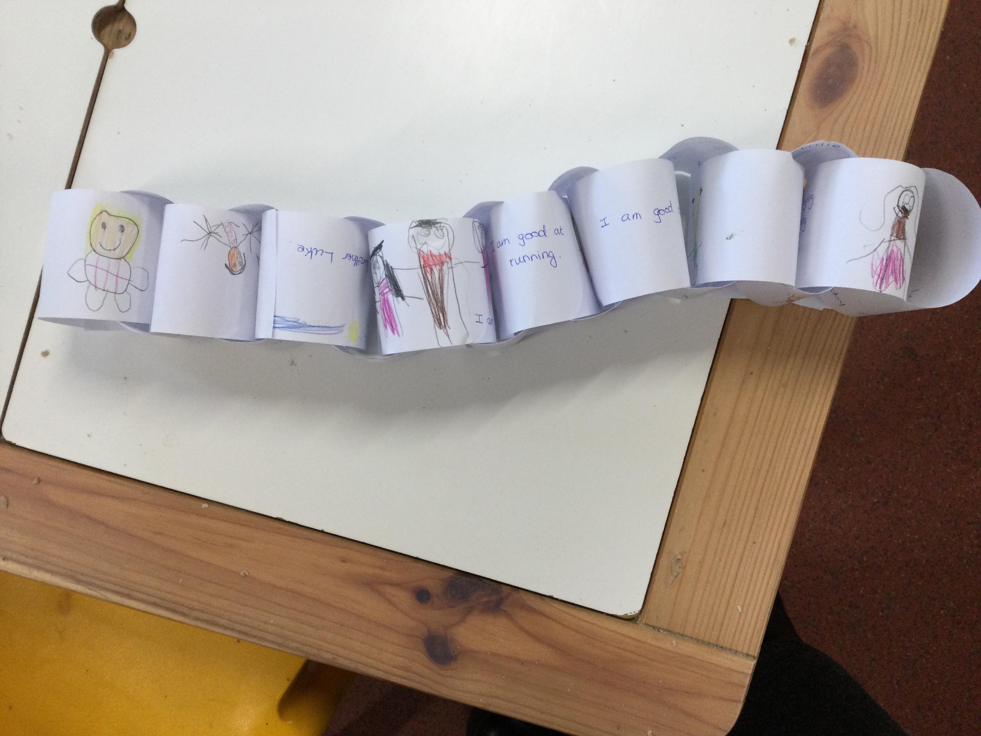 To start off our lesson the children got comfy and went to their special place, ensuring they listen to the chime and took deep breaths to ensure they were calm. Next we thought about what we are good at doing. To finish off the children drew pictures of what they are good at on a strip of paper which we turned into paper chain decoration for our display.