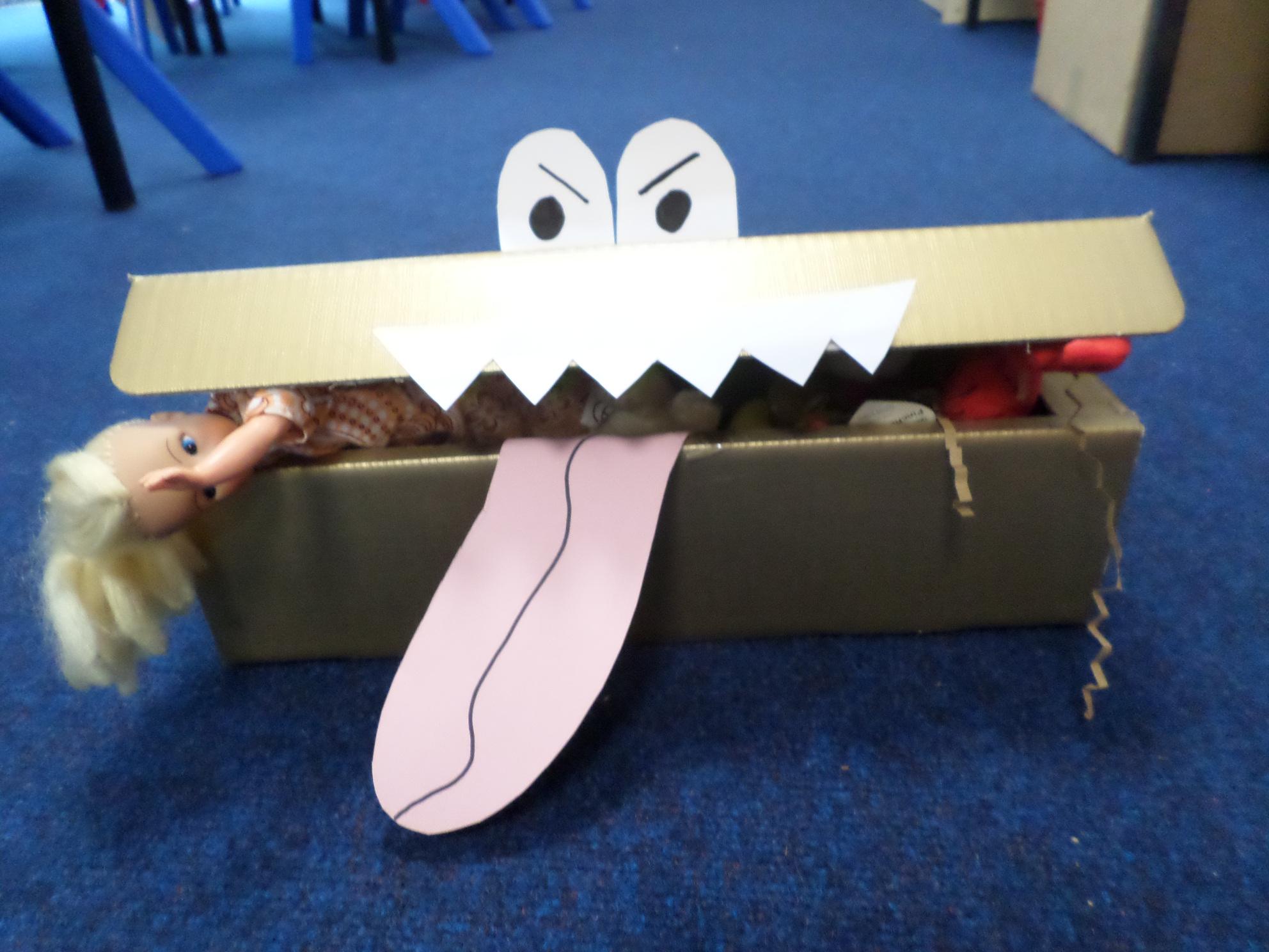 The next day the toys were gone again and there was a trail of Lego which led us to a naughty toy box that had eaten our toys!