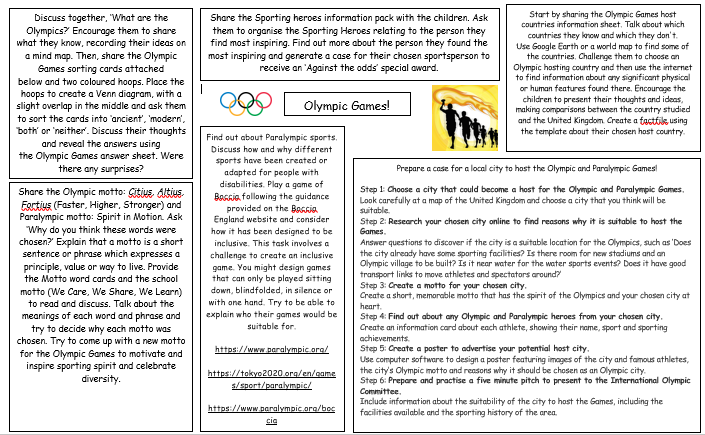 As Sports Day and the Olympics cannot take place this year, I would like to share some activities this week linked to staying active and learning more about the historical event of the Olympics!
