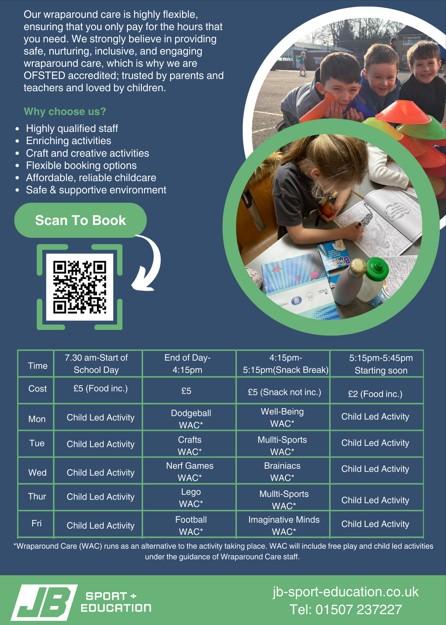 We are delighted to inform you that the much-anticipated wraparound care provision, provided by JB Sport and Education, will begin on Monday 24th February. This initiative is designed to support families by offering before and after school care, and we are excited to have this new option available to you.